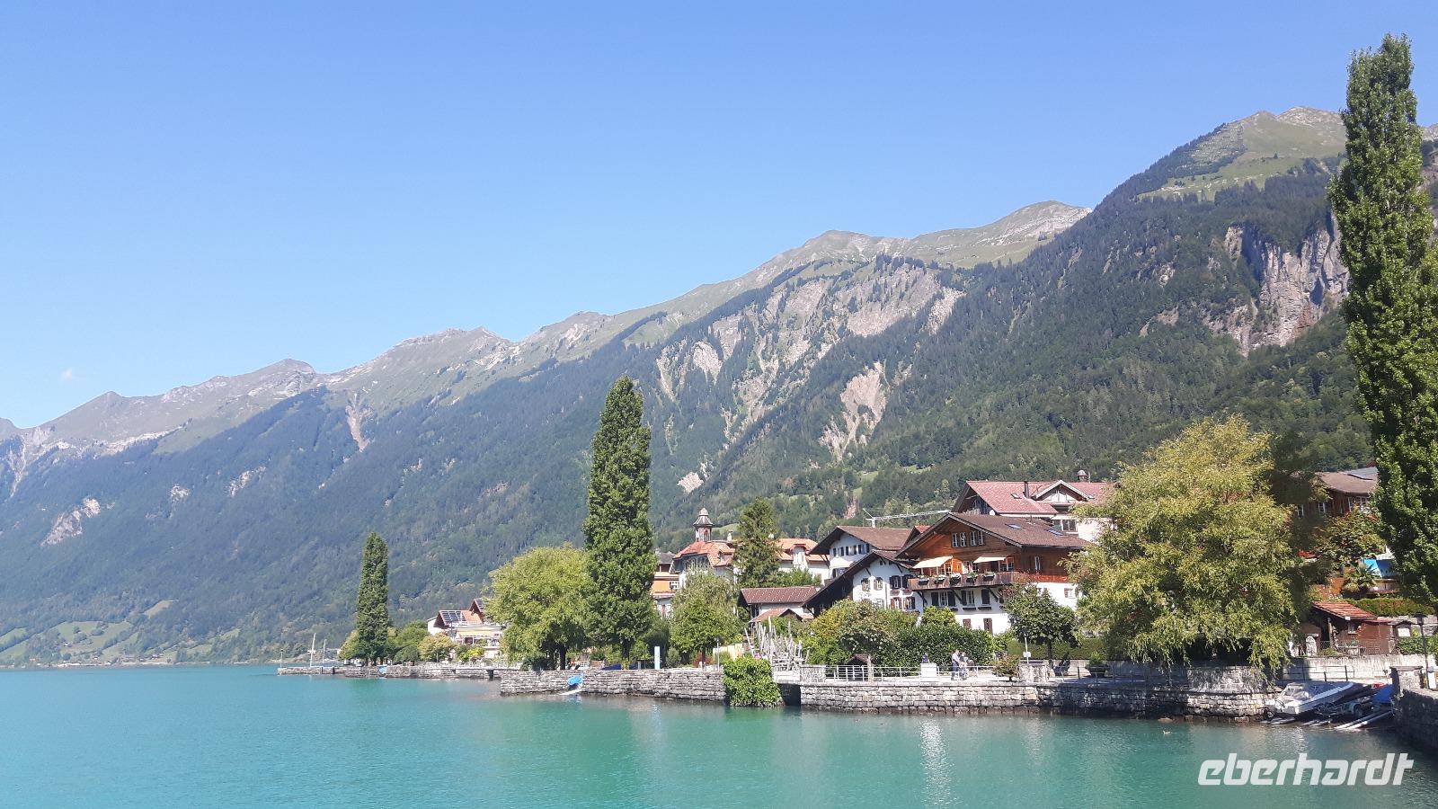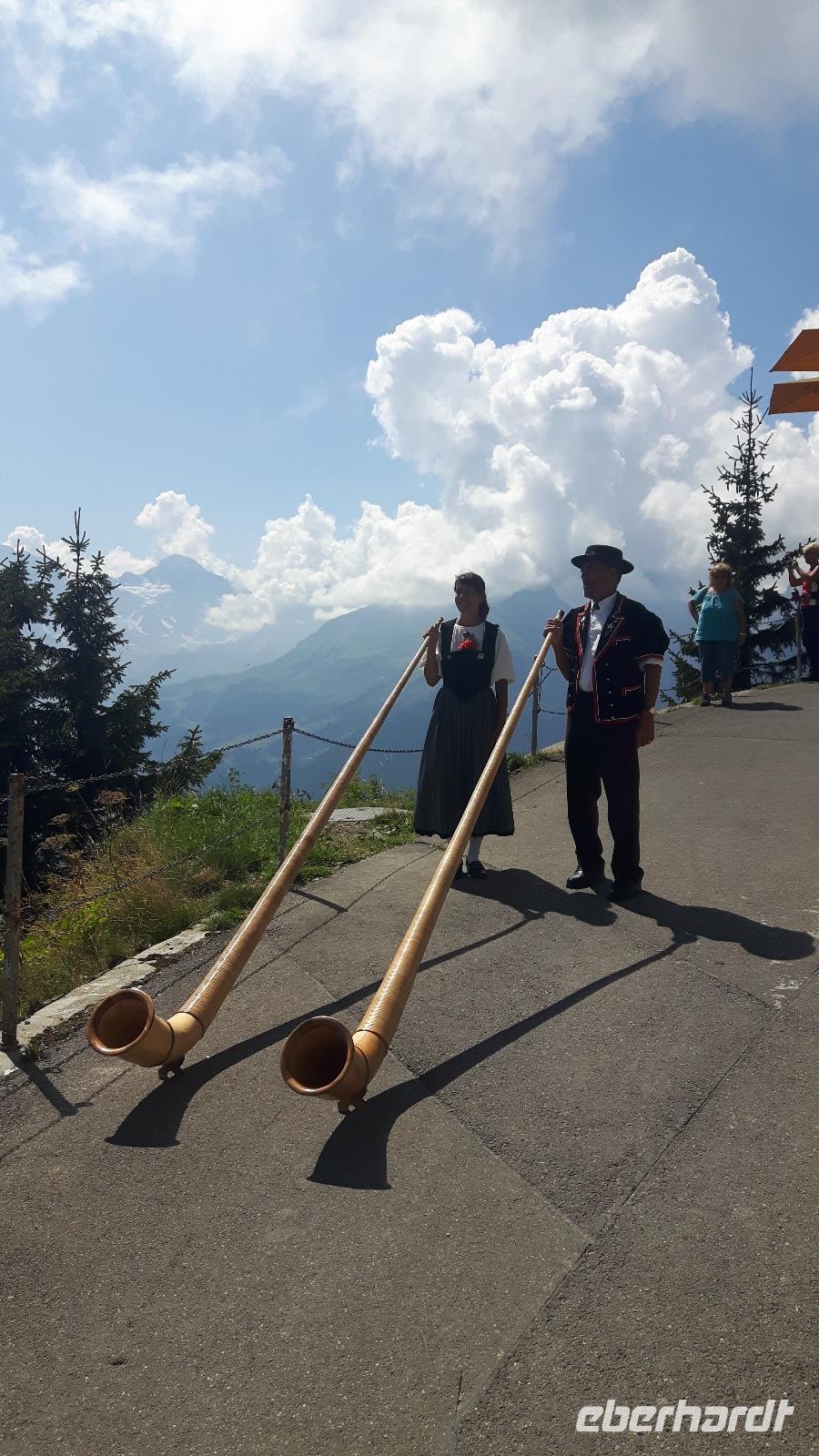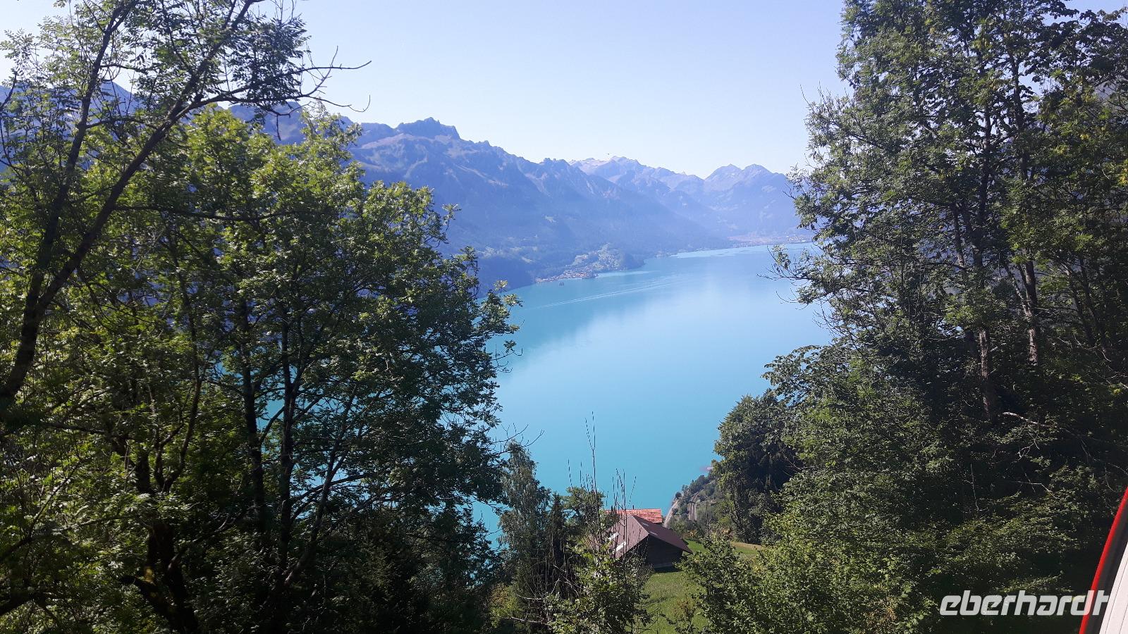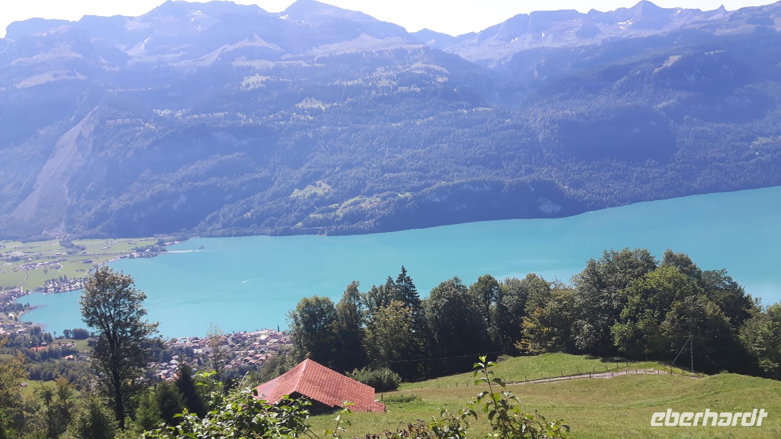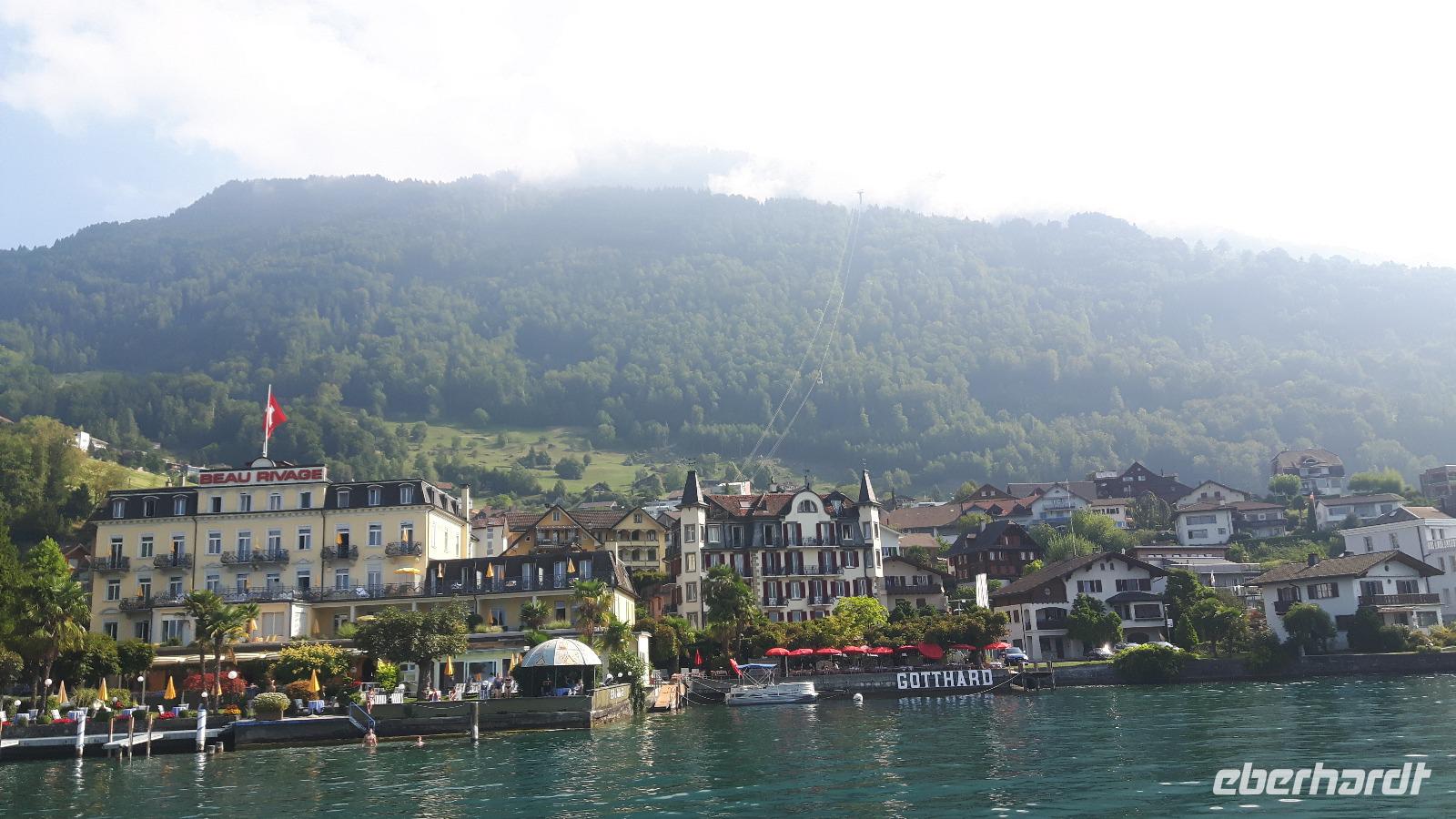 Die Sonne lachte und ein wiederum schöner Tag lag vor uns! Zunächst fuhren wir über den Brünigpass ins Haslital und weiter über die südlich des Brienzer Sees entlang führende Autobahn bis Wilderswil, dem Ausgangspunkt unserer Zahnradbahn-Fahrt auf die Schynige Platte. Wer die Schynige Platte mit der Zahnradbahn besucht, fühlt sich wie in der "Belle Epoque". Die Nostalgiebahn legt die reichlich sieben Kilometer lange Strecke in 50 Minuten zurück. Die Holzbänke in den Zugwagen und das Rollmaterial aus dem 19. Jahrhundert erinnern an längst vergangene Zeiten. Während der Fahrt und auf dem Berg faszinierten uns eine wunderschöne Sicht auf Eiger, Mönch und Jungfrau! Oben angekommen, hatten wir die Qual der Wahl, denn es gibt zahlreiche Wandermöglichkeiten - die meisten Gäste wanderten zum Aussichtspunkt "Daube", denn von hier aus beeindruckten das Rundum-Panorama auf die schöne Seenlandschaft von Brienzer- und Thunersee bzw. die Jungfrau-Region! Der Nachmittag stand ganz im Zeichen von Interlaken, dem touristischen Zentrum des Berner Oberlandes. Der Ort liegt auf einer Schwemmebene zwischen dem Thunersee und dem Brienzersee. Überragt von den drei mächtigen Bergen Eiger, Mönch und Jungfrau ist der Ferienort Ausgangspunkt für zahlreiche Aktivitäten. Bereits zu Beginn des 19. Jahrhunderts wurde Interlaken für seine eindrückliche Bergwelt berühmt und von bekannten Zeitgenossen bereist, darunter Johann Wolfgang von Goethe und Felix Mendelssohn Bartholdy. Der Erfolg als Tourismusort wurde durch den Ausbau der Berner Oberland Bahnen 1890 und der Jungfraubahn 1912 noch angekurbelt. Entlang der Norduferstraße des Brienzer Sees und über den Brünigpass gelangten wir am frühen Abend zum Hotel zurück.