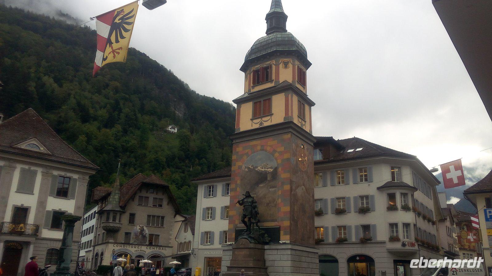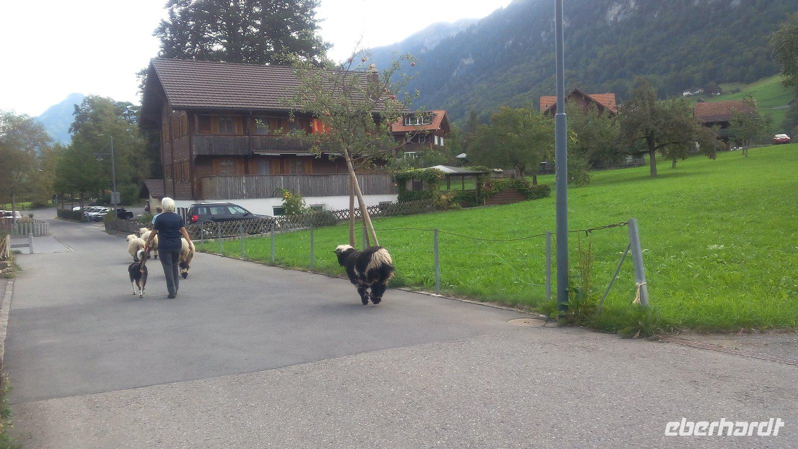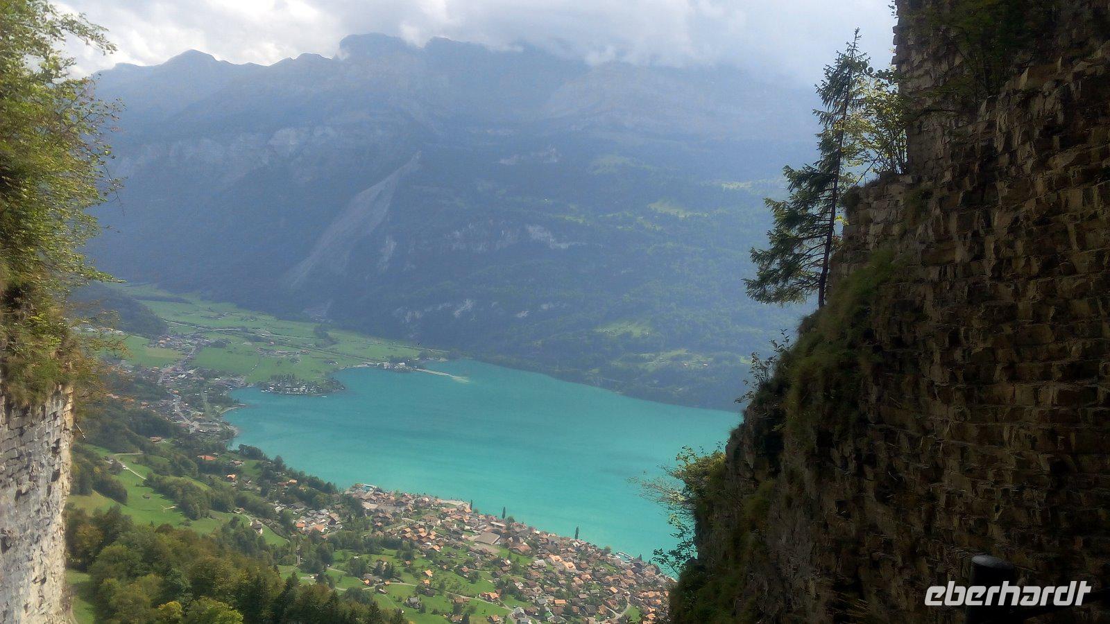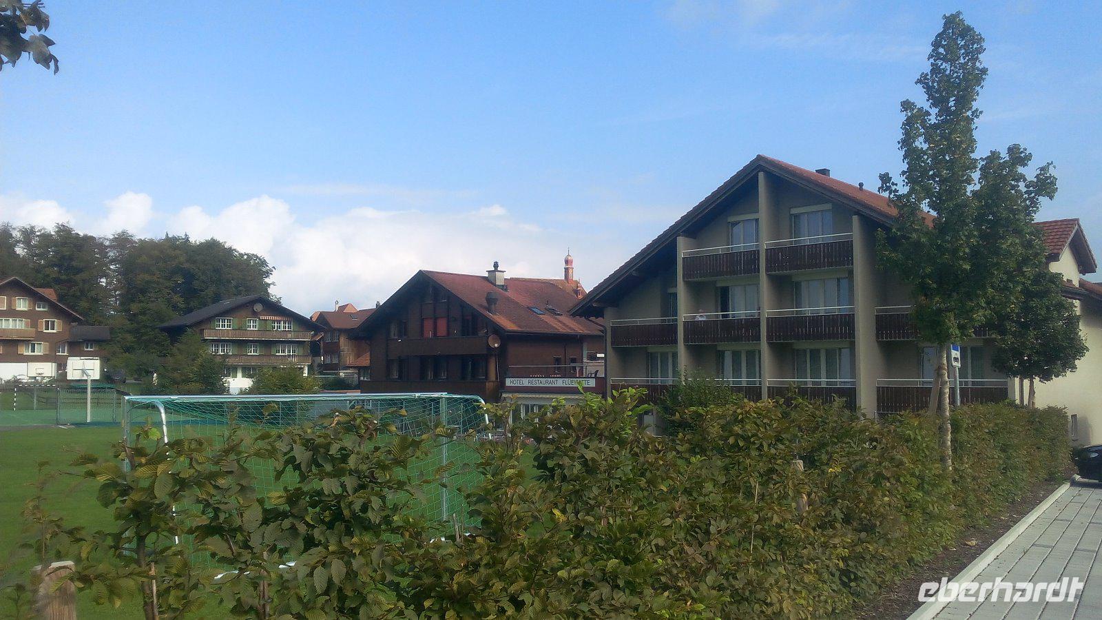 Eine Erklärung ist hier schon notwendig. An dieser Stelle noch einmal. Uns wird ein Teller mit Teigwaren, Kartoffeln, Rahm und Käse serviert. Das schmeckt schon so sehr gut. Auf den Tischen steht aber noch Apfelmus und der muss auch noch auf den Teller gegeben werden. Für viele etwas ungewohnt aber durchaus lecker. Und woher kommt dieser Name? Älpler, das sind die Bewohner der Alpen und die Magronen leiten sich von den italienischen Makkaroni ab. Dieses Mittagessen wird uns in guter Erinnerung bleiben. Nach dem Essen haben wir Zeit zum Wandern. Nach rund 1,5 Stunden müssen wir uns wieder vom Berg verabschieden und genießen noch einmal die Fahrt mit der Dampfbahn. In Brienz wieder angekommen, wartet Holger auf uns. Wir fahren noch ein Stück durch den Ort und planen einen Aufenthalt am Ufer des Sees. Von hieraus haben wir die Möglichkeit die Brunngasse zu besuchen. Diese Gasse ist weit über die Landesgrenze bekannt, da diese einmal als die "schönste Gasse Europas" ausgezeichnet wurde. Sie hebt sich mit ihren Häusern aus dem 18. Jahrhundert hervor und die Bewohner schmücken in dieser Gasse besonders schön.