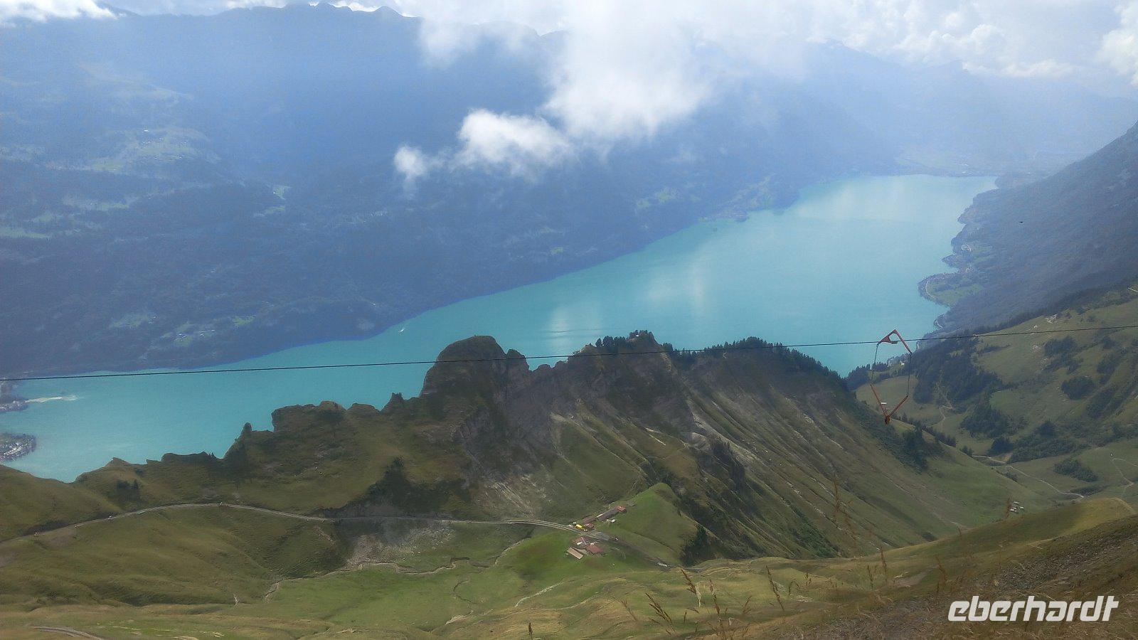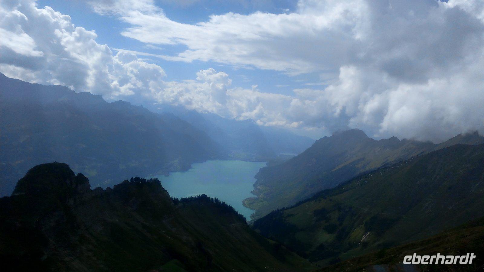 Die Wettervorhersage verkündet für die nächsten Tage immer wieder Gewitter. Hoffentlich hält es heute aus, für unsere Fahrt mit der Brienzer-Rothornbahn. Dazu fahren wir mit dem Bus über den Brünigpass in das Aare -Tal mit Blick auf den Brienzer See. Brienz ist der Hauptort und Zentrum der Schweizer Holzschnitzkunst. Auch die Schweizer Geigenbauschule befindet sich hier. Wir parken am Bahnhof und der Schiffsanlegestelle von Brienz. Die Dampfbahn steht schon bereit. Wir fahren mit dieser beeindruckenden Bahn 7,6 km bis zur Endstation auf dem Rothorn. Dabei überwinden wir eine Höhendifferenz von 1678m. Wir erleben eine Stunde Bahnfahrt mit tollen Blicken auf den Brienzersee und in die Berner Alpen. Die Erfahrung mit BrienzerRothornBahn auf den Berg "zu klettern" bleibt ein tolles Erlebnis. Nachdem wir an der Bergstation erreicht haben, spazieren wir erst einmal zum Restaurant Rothorn-Kulm. Dank Eberhardt-Travel sind wir zu einem Mittagessen eingeladen. Servier werden