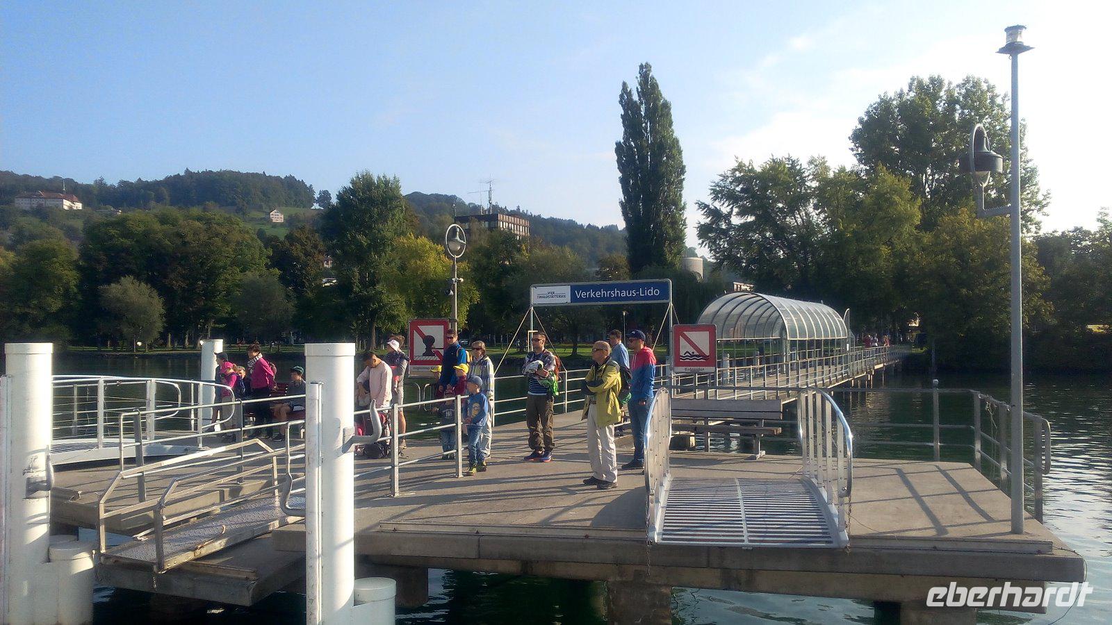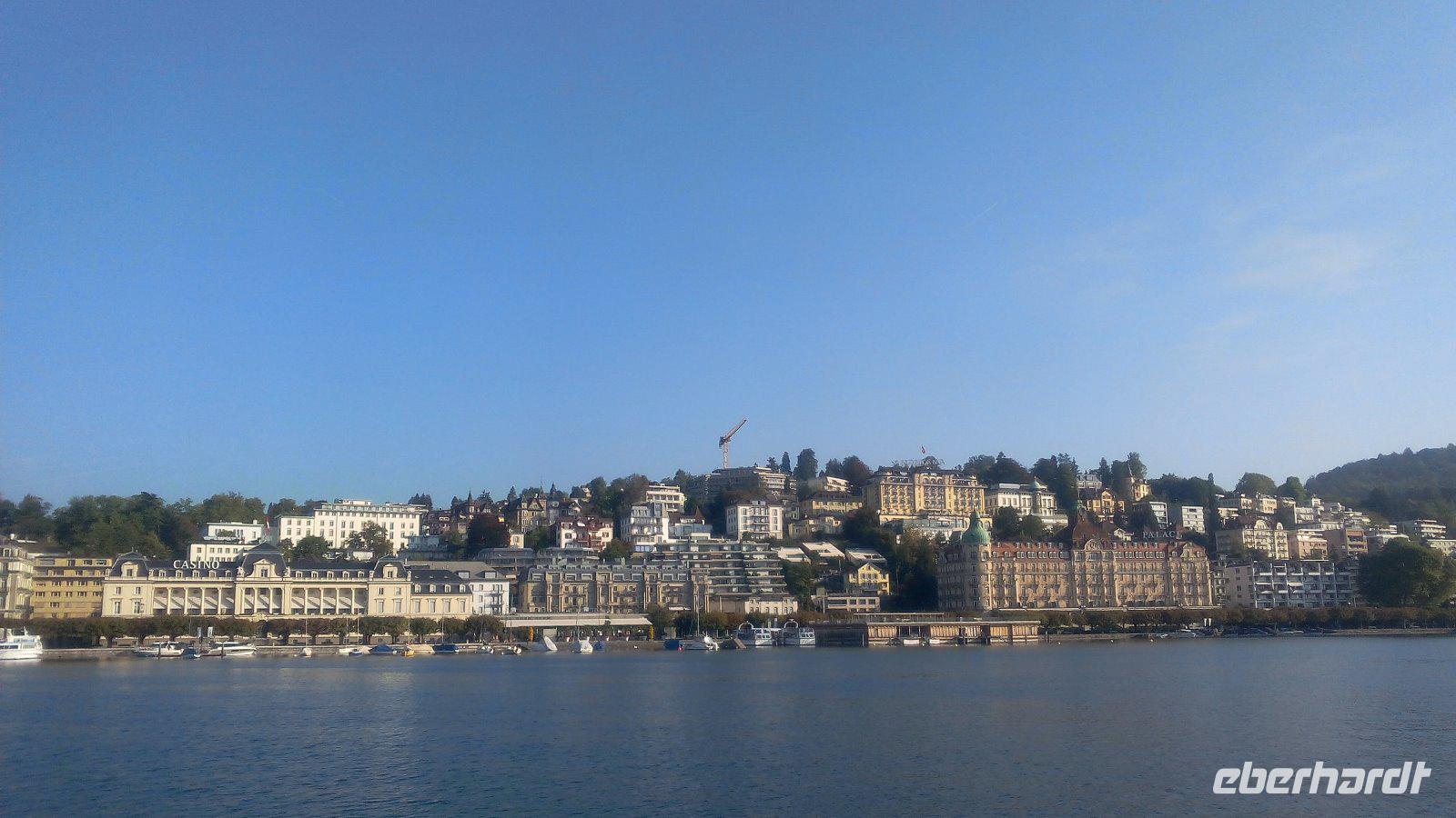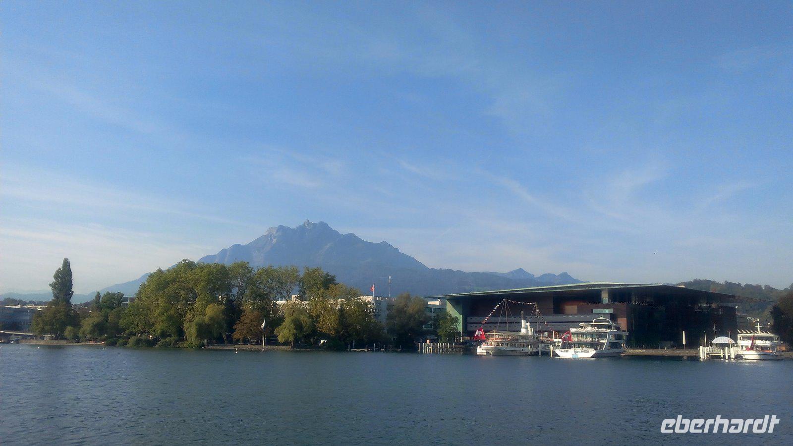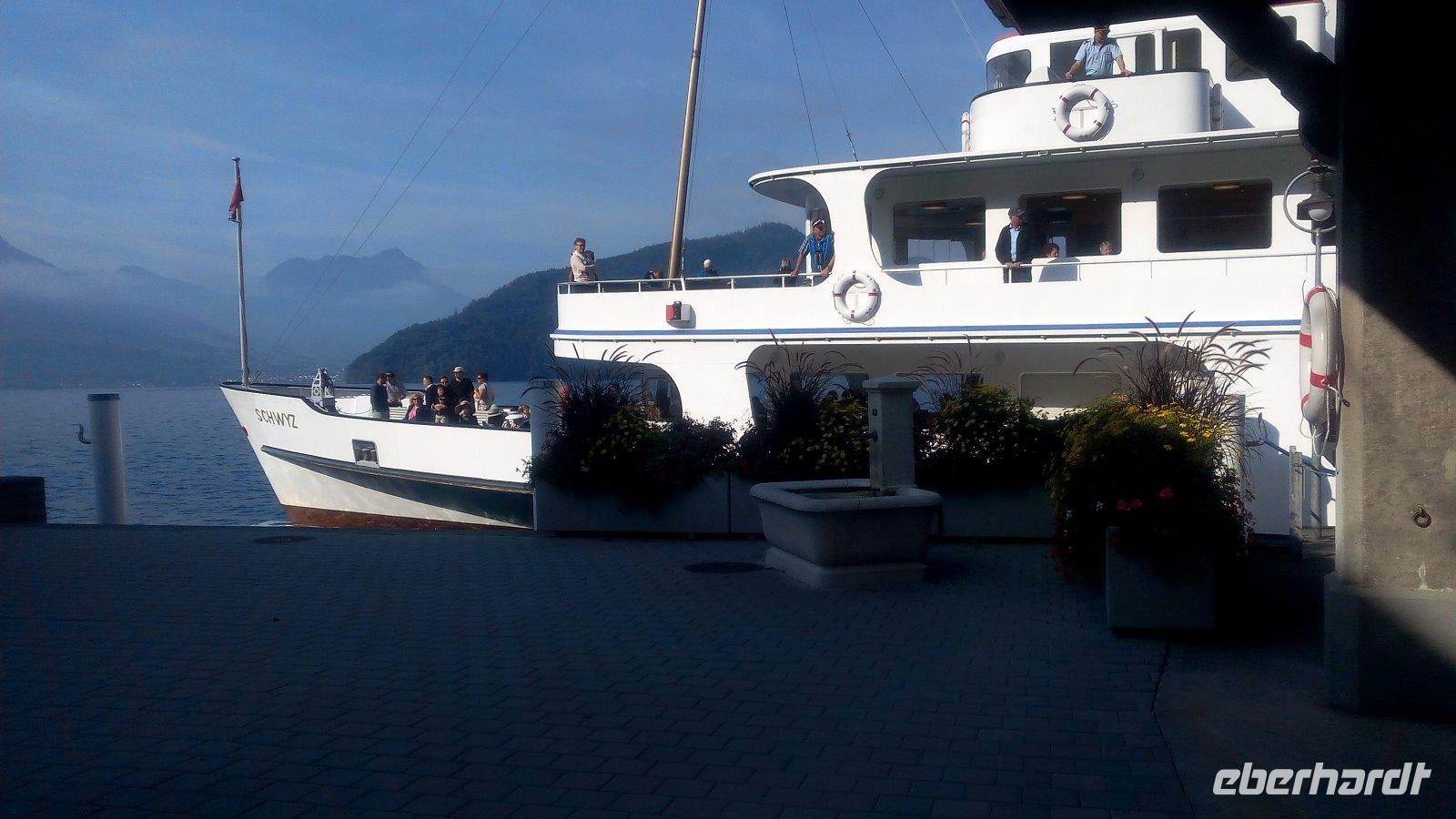 Wir haben einen schönen Blick auf die Pilatusbahn, die zum Hausberg von Luzern fährt, bevor wir in die Stadt fahren. Unser Bus parkt auf den Parkplatz Inseli hinter dem Kultur-und Kongress- Zentrum von Luzern. Wir spazieren zur Brücke 1 gegenüber dem Bahnhof, um mit dem MS „Schwyz" nach Vitznau zu schippern. Wir haben heute die Dampfschiffparade und können somit die Dampfschiffe nur beobachten.