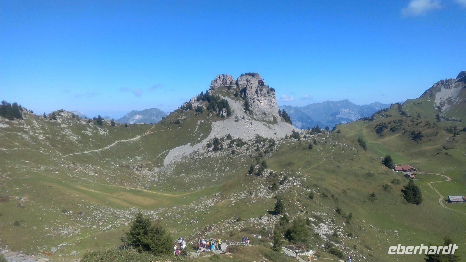 Heute fahren wir mit dem Nostalgiezug zur Schynige Platte. Zuerst geht es mit dem Bus nach Wilderswil. Hier steigen wir in die Zahnradbahn ein, die schon 1893 eröffnet wurde. 55 Minuten fahren wir zur 1987 m hoch gelegenen Schynige Platte. Während der Fahrt haben wir grandiose Blicke zum Brienzer- und Thunersee. Am Bahnhof angekommen spazieren wir gemeinsam Richtung Berghotel an dem uns schon Alphornbläser empfangen. Danach wandern einige von uns zur Daube oder zum Alpengarten. Dieser ist ein ganz besonderer Botanischer Garten. Als einer von ganz wenigen zeigt er die Pflanzen, die in oberhalb der Waldgrenze vorkommen. Insgesamt sind es rund 600 Arten, die wir aber aufgrund der Trockenheit nicht sehen.