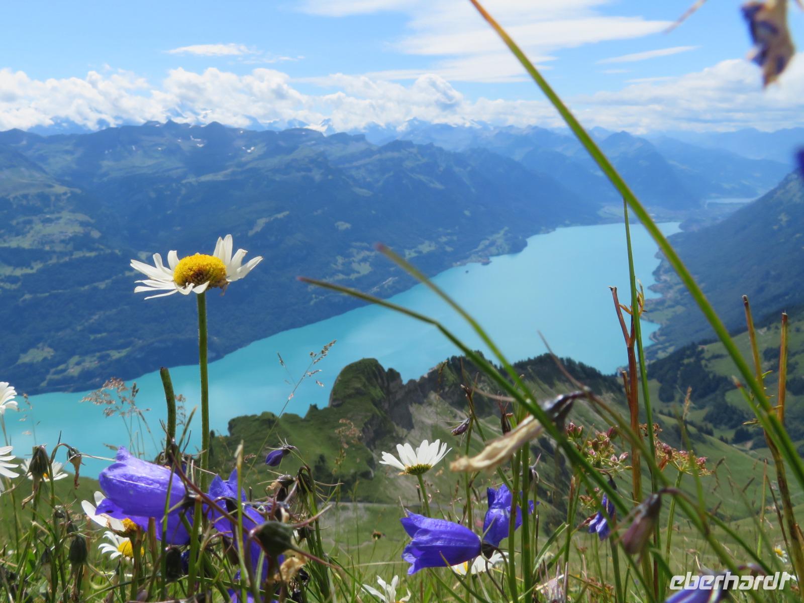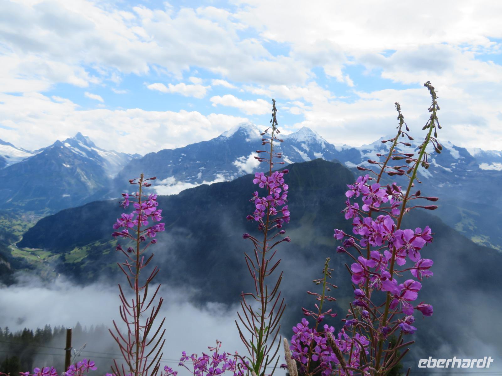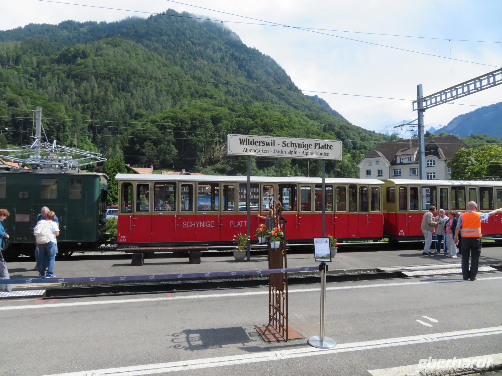 Am Morgen geht es wieder über den Brünig-Pass nach Wilderswil. Die nostalgische Zahnradbahn auf die Schynige Platte erwartet uns schon. Die Bahn wurde 1893 in Betrieb genommen. Im gemütlichen Tempo von nur 10 Kilometern pro Stunde schlängelt sich die Bahn auf ihren Schienen in unzähligen Windungen auf den 1.970 Meter hohen Berg. Dabei genießen wir immer wieder neue Blicke über den Brienzer- und den Thunersee und Interlaken mit dem Hausberg Hader Kulm. Auf dem Berg nutzen wir die verschiedenen Möglichkeiten. Wir spazieren durch den Alpenkarten mit über 700 Pflanzen aus dem Alpenraum. Wir bewundern die zum Teil noch in voller Blüte stehenden Pflanzen. Einige spazieren über den neuen Flower & Panorama Trail mit herrlichen Aussichten auf Eiger, mönch und Jungfrau. Eiger und Mönch zeigen sich kurz in ihrer vollen Pracht. Die Jungfrau versteckt ihre Spitze in den Wolken. Im Restaurant nehmen wir zum Teil einen kleinen Imbiss ein. Mit der Zahnradbahn geht es zurück nach Wilderswil. Der Bus fährt uns nun nach Interlaken. Der beliebte Ferienort mit vielen Gästen aus aller Welt befindet sich zwischen dem Thunersee und dem Brienzersee und ist das Tor zur Jungfrau-Region. Wir bummeln durch den Ort oder genießen das Panorama vom Cafe in der 18. Etage des Hotel Metropol. Entlang des Nordufers des Briezersees reisen wir weiter über den Brünig-Pass zum Hotel zurück.