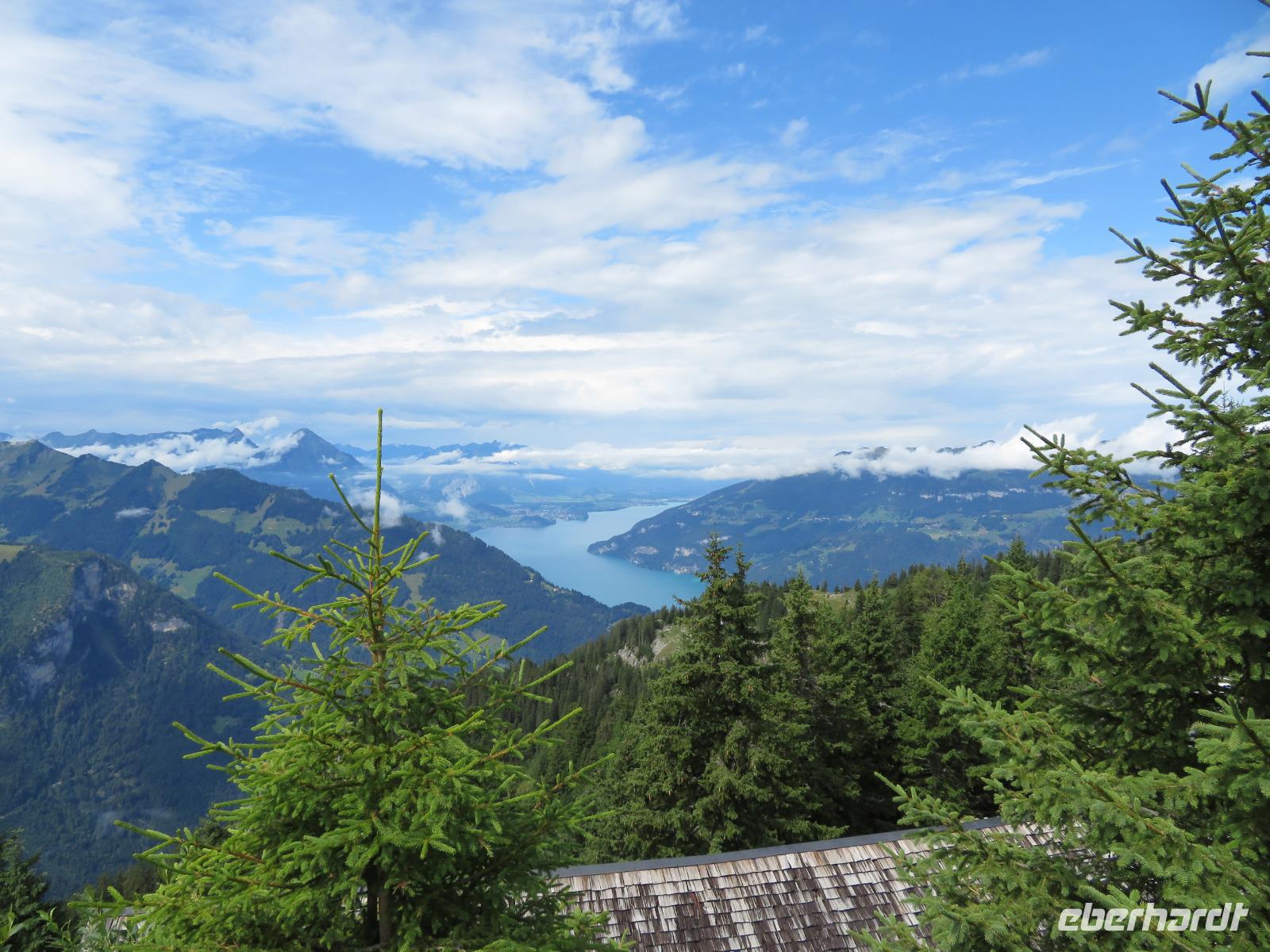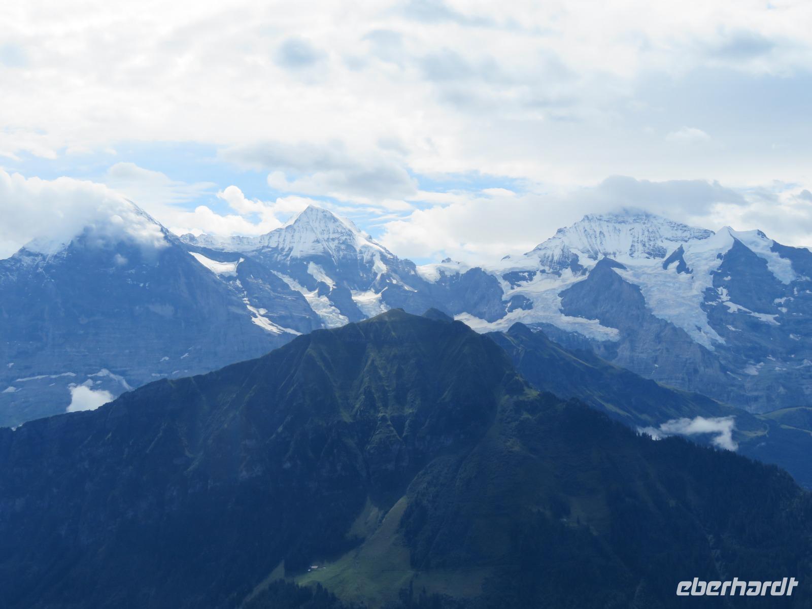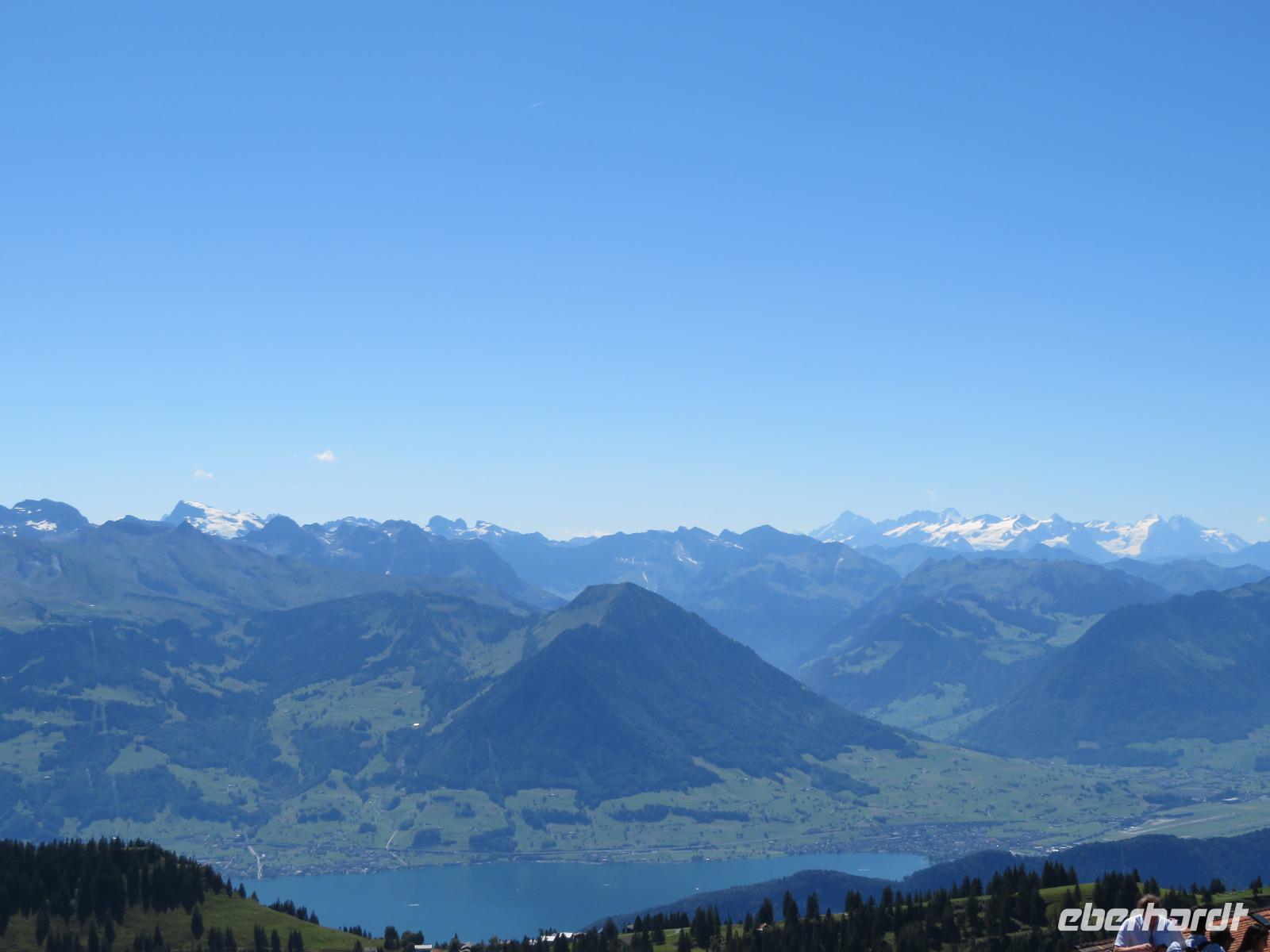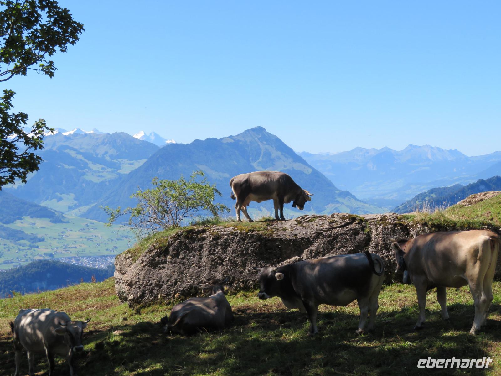 Am Morgen geht es wieder über den Brünig-Pass nach Wilderswil. Die nostalgische Zahnradbahn auf die Schynige Platte erwartet uns schon. Die Bahn wurde 1893 in Betrieb genommen. Im gemütlichen Tempo von nur 10 Kilometern pro Stunde schlängelt sich die Bahn auf ihren Schienen in unzähligen Windungen auf den 1.970 Meter hohen Berg. Dabei genießen wir immer wieder neue Blicke über den Brienzer- und den Thunersee und Interlaken mit dem Hausberg Hader Kulm. Auf dem Berg nutzen wir die verschiedenen Möglichkeiten. Wir spazieren durch den Alpenkarten mit über 700 Pflanzen aus dem Alpenraum. Wir bewundern die zum Teil noch in voller Blüte stehenden Pflanzen. Einige spazieren über den neuen Flower & Panorama Trail mit herrlichen Aussichten auf Eiger, mönch und Jungfrau. Eiger und Mönch zeigen sich kurz in ihrer vollen Pracht. Die Jungfrau versteckt ihre Spitze in den Wolken. Im Restaurant nehmen wir zum Teil einen kleinen Imbiss ein. Mit der Zahnradbahn geht es zurück nach Wilderswil. Der Bus fährt uns nun nach Interlaken. Der beliebte Ferienort mit vielen Gästen aus aller Welt befindet sich zwischen dem Thunersee und dem Brienzersee und ist das Tor zur Jungfrau-Region. Wir bummeln durch den Ort oder genießen das Panorama vom Cafe in der 18. Etage des Hotel Metropol. Entlang des Nordufers des Briezersees reisen wir weiter über den Brünig-Pass zum Hotel zurück.