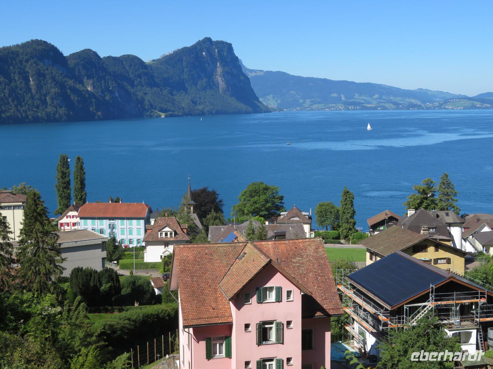 Am Morgen führt uns unsere Reise zunächst wieder nach Luzern. Hier besteigen wir das Dampfschiff „Schiller". Das Schiff ist Teil der Flotte der Schifffahrtsgesellschaft Vierwaldstättersee. Wir fahren über den See nach Vitznau. Dabei ziehen der Birkenstock und die Orte Hertenstein und Weggis an uns vorbei. In Vitznau wechseln wir das Verkehrsmittel - auf die 1871 erbaute Rigi-Bahn. Bereits bei von weitem sehen wir, wie die Dampflok Nummer 16 für die Fahrt auf die Rigi vorbereitet wird. Für uns sind Plätze im Dampfzug der Rigi-Bahn reserviert. In gemütlicher Fahrt schnauft und zischt die Bahn die steile Strecke den Berg hinauf. Von Vitznau geht die Fahrt auf die Rigi in 1.798 Metern Höhe. Unterwegs gibt es kurze Stopps, bei denen Dampfdruck aufgebaut und Wasser getankt wird. Während der Fahrt haben wir wundervolle Ausblicke über den Vierwaldstättersee. Auf dem Berg angekommen, erwartet uns eine traumhafte Sicht. Wir spazieren wir bis zum Gipfel. Uns liegen der Zuger See und den Vierwaldstättersee zu Füßen. Die imposante Bergekette vom Säntis über den Titlis bis zu den Giganten des Berner Oberlandes mit Eiger, Mönch, und Jungfrau, Schreckhorn und den anderen Drei- und Viertausendern zeigen sich uns ihrer ganzen Pracht. Wir sind begeistert! Wir können noch schöne Fotos von der Abfahrt des Dampfzuges bei seiner Abfahrt machen. Nachdem wir das Panorama ausgiebig genossen haben, bringt uns der Elektrozug wieder zurück nach Vitznau. Anschließend reisen wir nach Küssnacht. An der Hohlen Gasse legen wir einen kurzen Stopp ein. Im Info-Pavillon hören wir der Tells-Geschichte bevor, wir mit dem Bus nach Flüeli-Ranft zurückkehren.