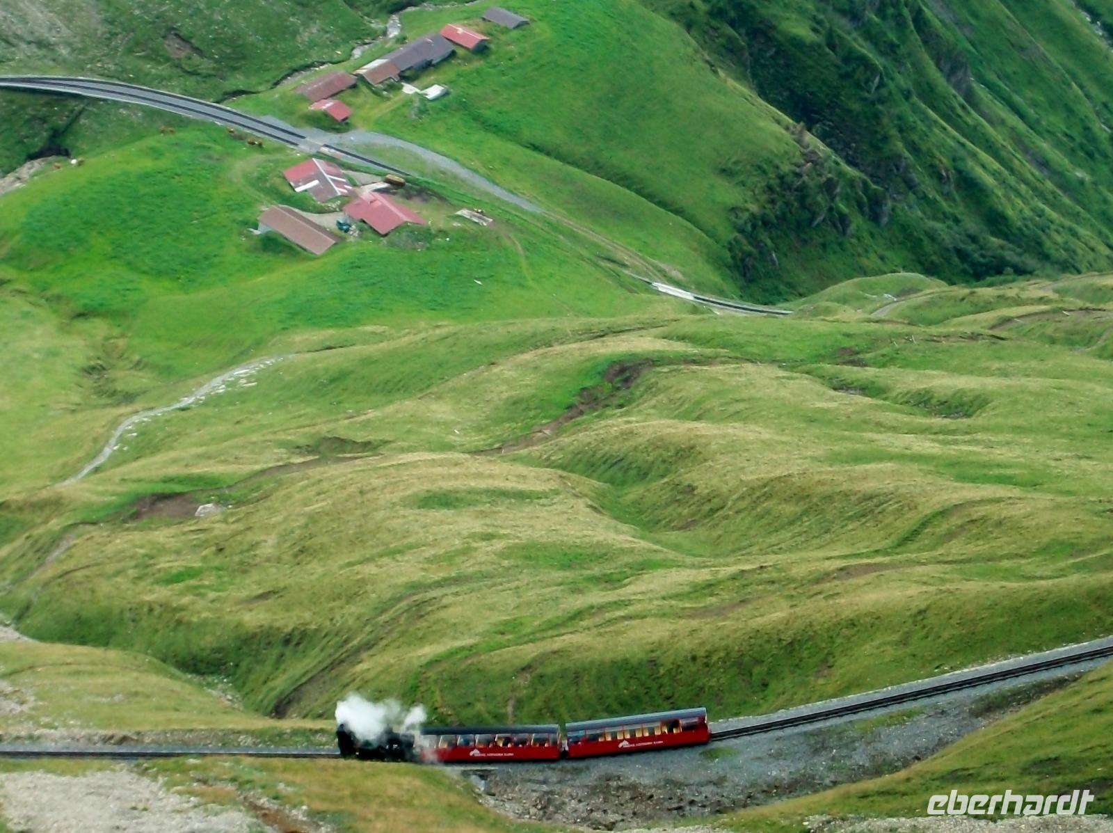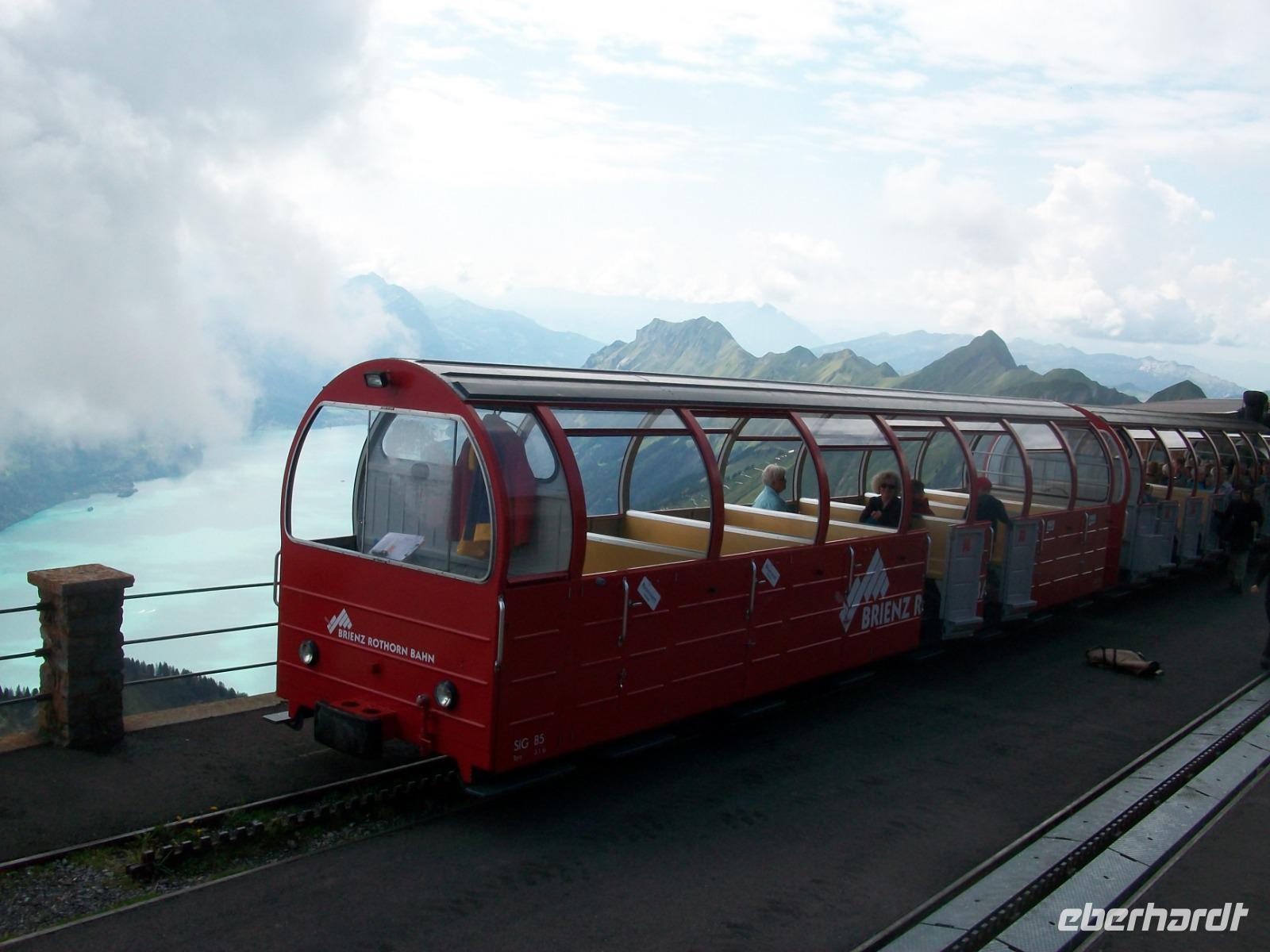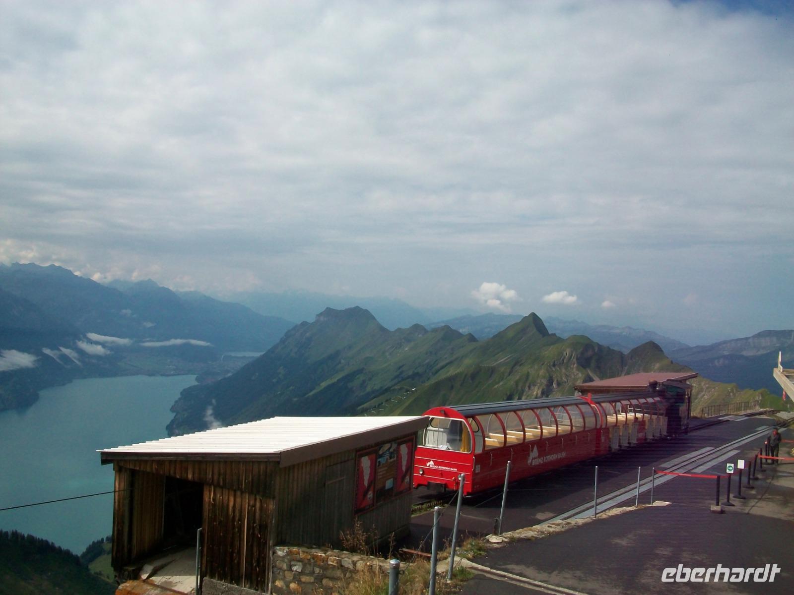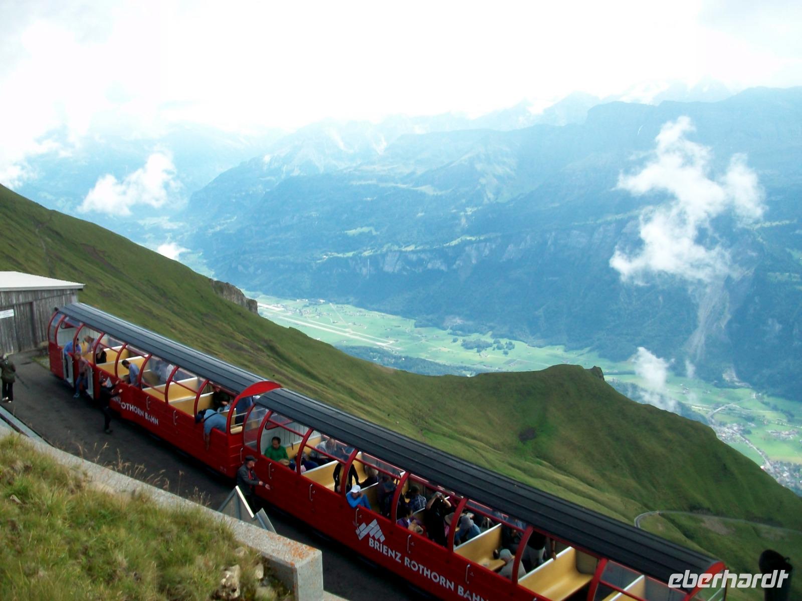 Danach genießen wir das nun wirklich überwältigende Panorama: Ganz unten, wie ein türkisener Edelstein, liegt der Brienzer See umgeben von schroffen Bergen an denen sich einige Wolken festgehangen haben. Wir genießen hier oben bei bestem Wetter eine wunderbare Zeit, man mag sich gar nicht davon losreisen, aber es muss sein. Bei der einstündigen Abfahrt bewundern wir noch einmal das einmalige Flair, gönnen uns etwas Freizeit im Ort Brienz und gelangen am späteren Nachmittag wieder zu unserem Hotel zurück, ein schöner Tag geht langsam zu Ende.Die Furka - Dampfbahn