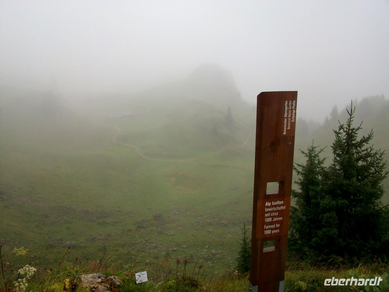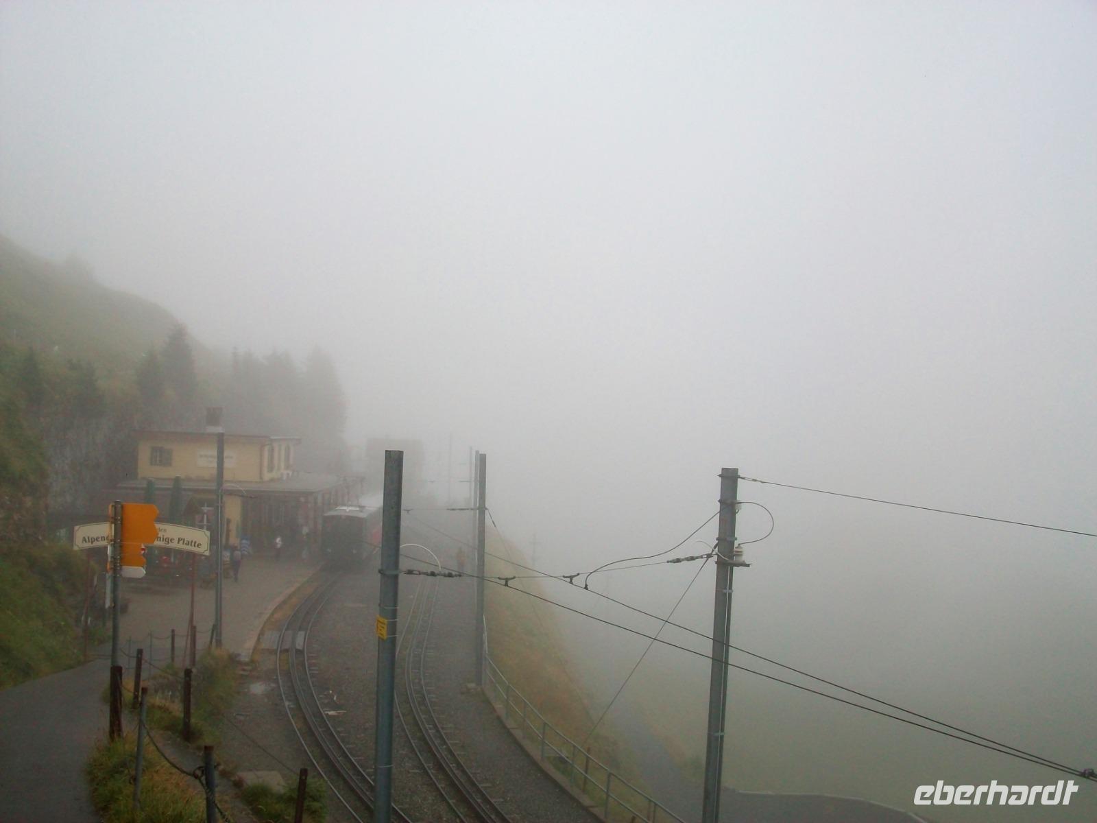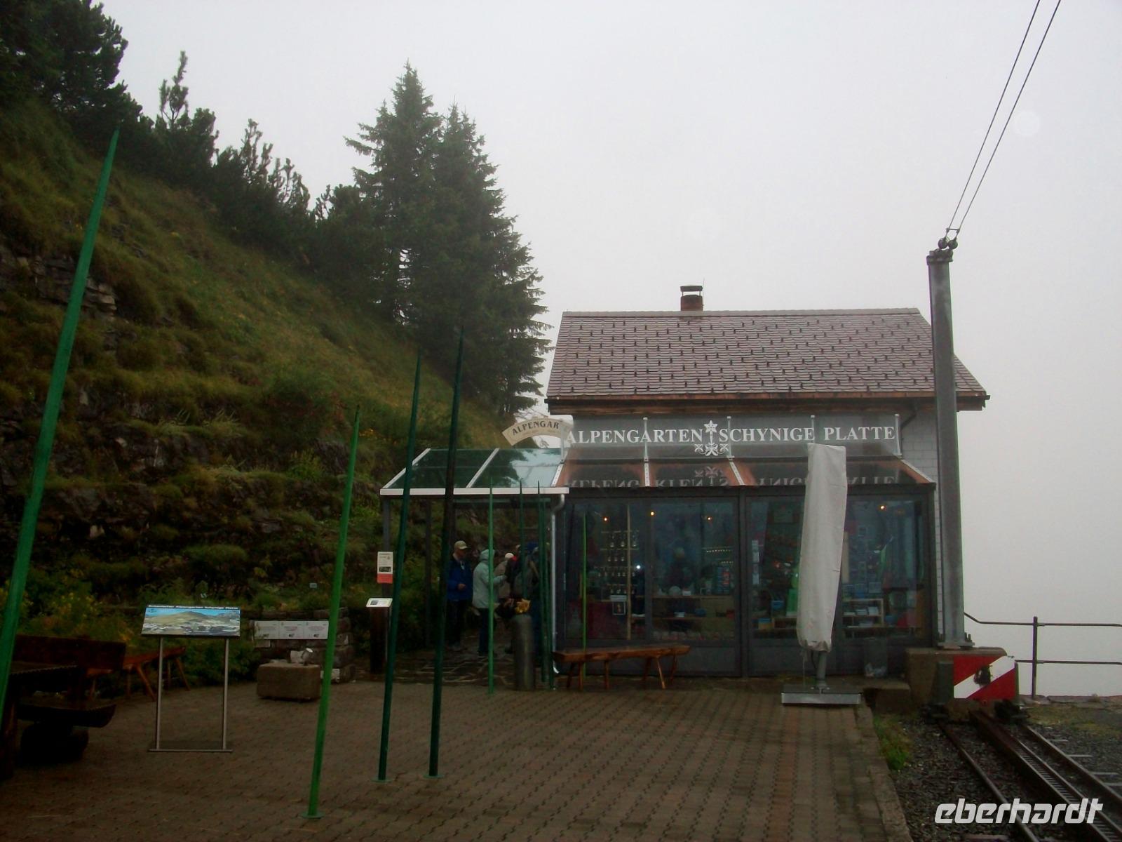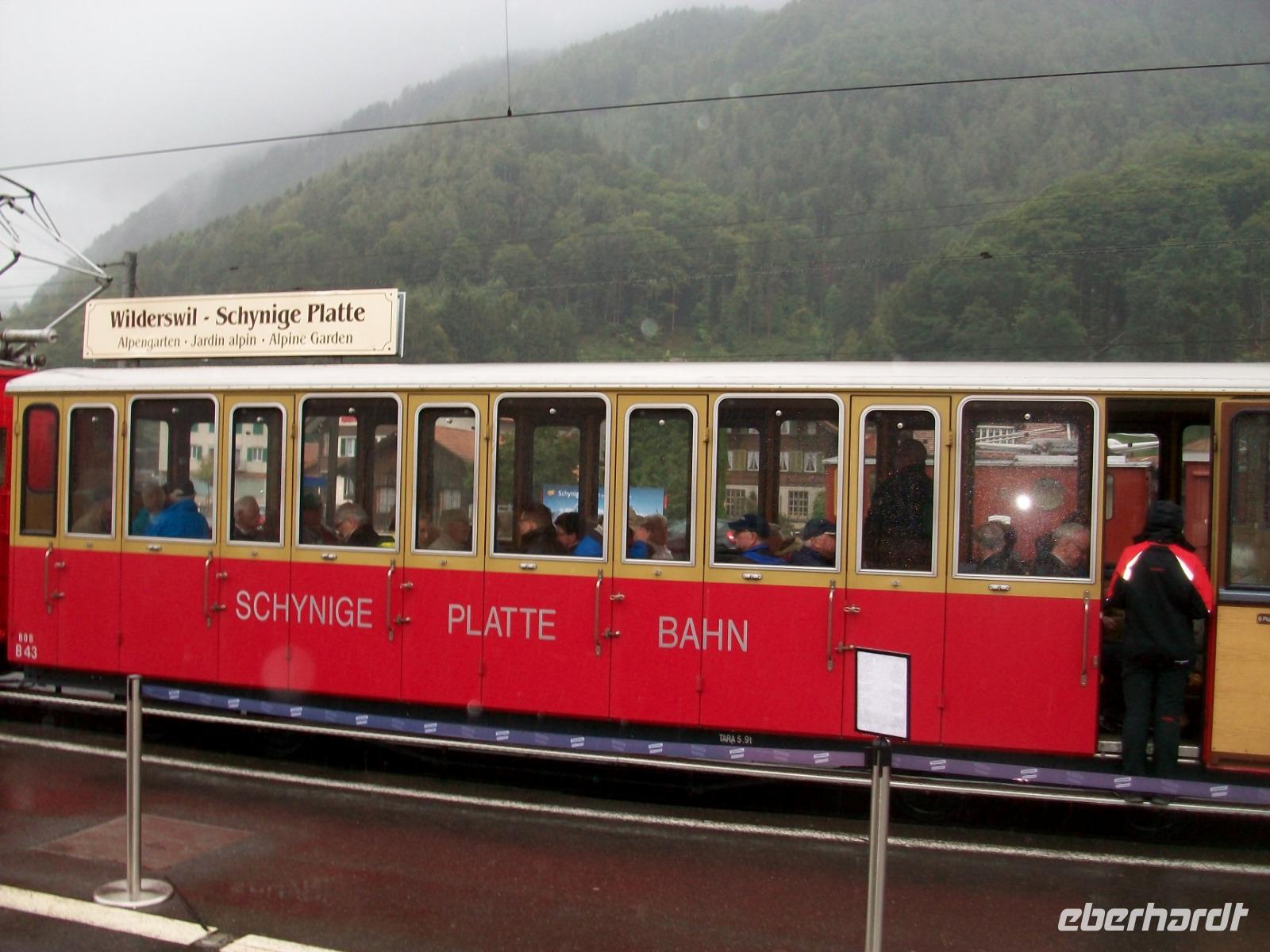 Dann, heute mit Elekrokraft, starten wir um erneut einen bekannten Schweizer Gipfel zu erklimmen. Das wird heute leider ein trübes Unterfangen; kaum sind wir einige Höhenmeter angestiegen umhüllt uns eine Wolke die sich mit Konsequenz im Berg festgesetzt hat. In dieser Suppe gelangen wir hinauf zur Schynige Platte und können die Berge die von hier oben bei guter Sicht gesehen werden nur in unserer Phantasie erstehen lassen. Eiger, Mönch und Jungfrau im ewigen Schnee, diese grandiose Bergwelt bleibt uns heute leider verschlossen. Im niesligen Regen schauen wir aber dennoch im Alpengarten vorbei und können, sehr anschaulich mit zahlreichen Tafeln versehen, die einheimische Pflanzenwelt bewundern. Wenigstens das konnte uns Petrus nicht vermiesen!