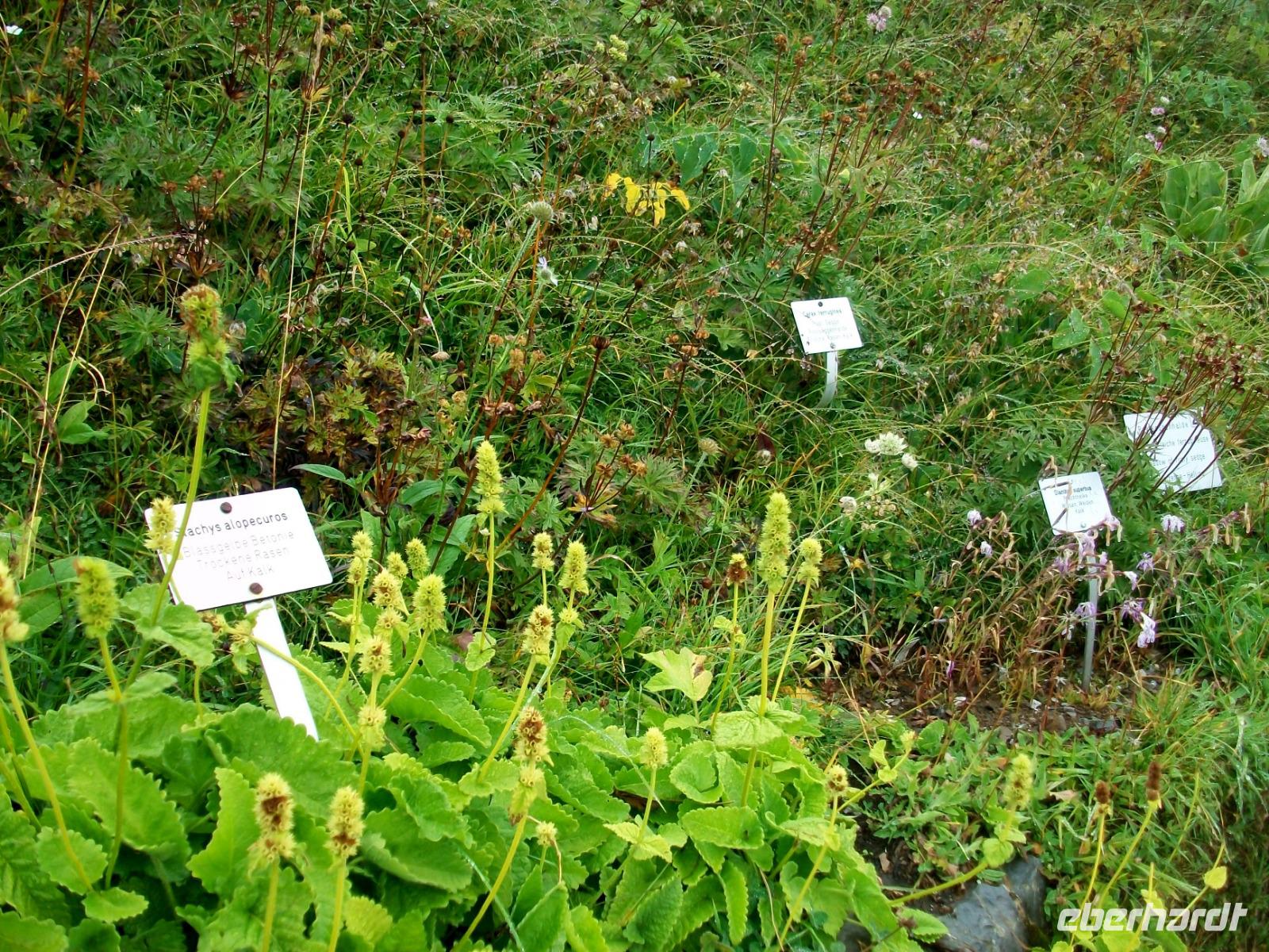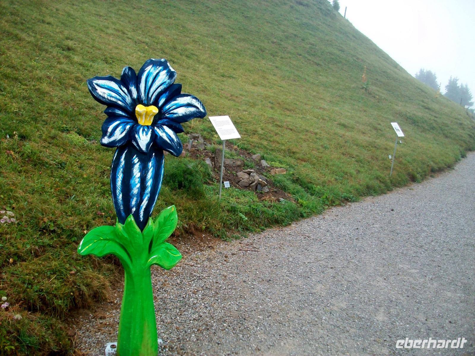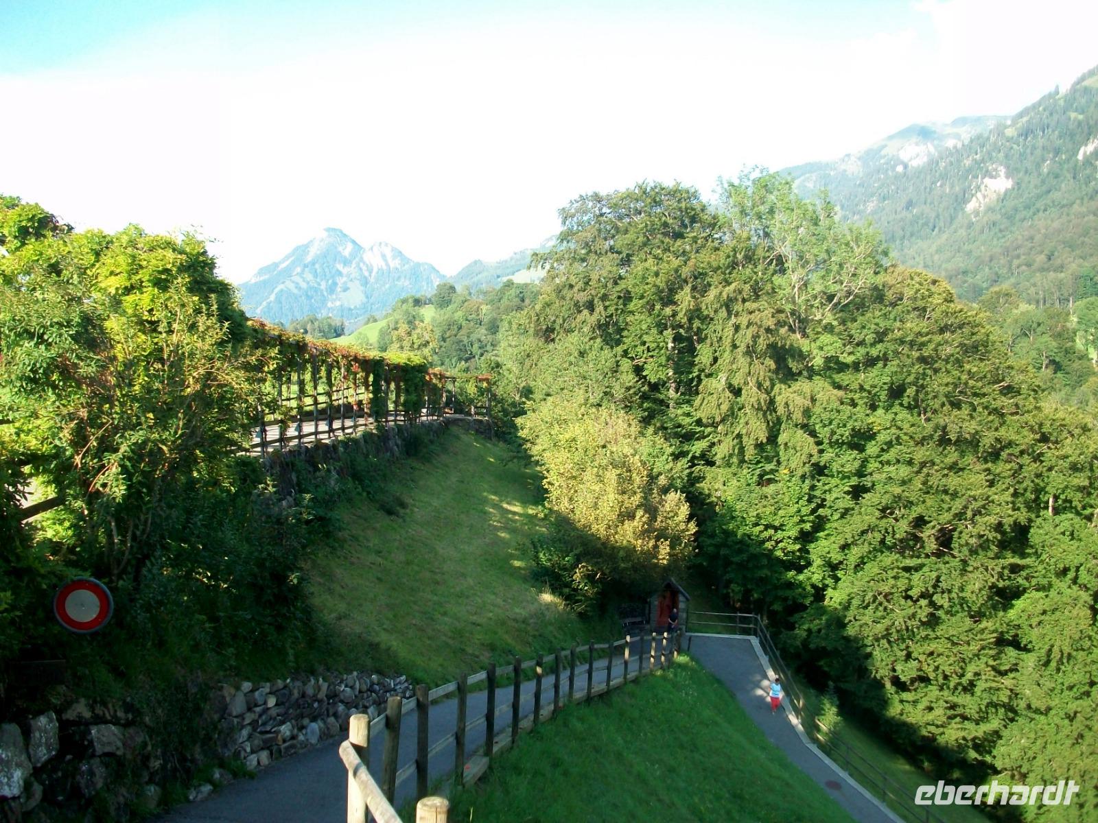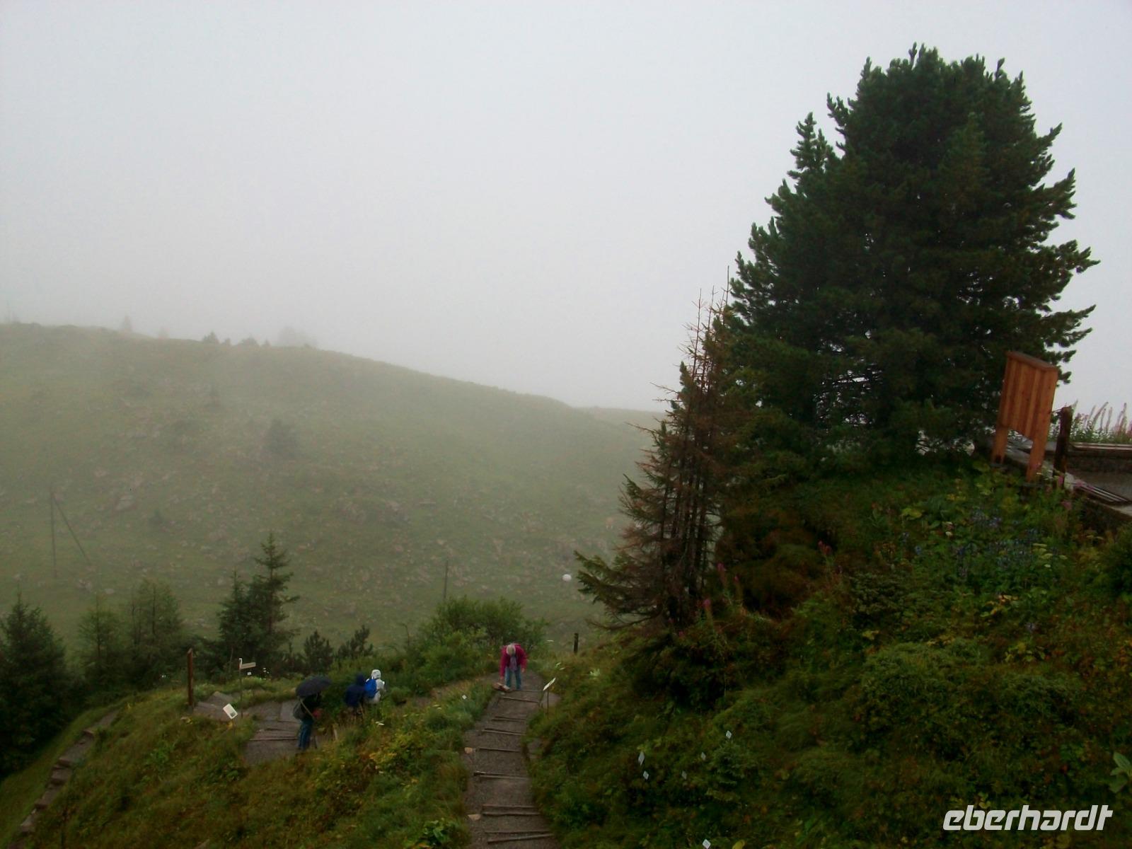Dann, heute mit Elekrokraft, starten wir um erneut einen bekannten Schweizer Gipfel zu erklimmen. Das wird heute leider ein trübes Unterfangen; kaum sind wir einige Höhenmeter angestiegen umhüllt uns eine Wolke die sich mit Konsequenz im Berg festgesetzt hat. In dieser Suppe gelangen wir hinauf zur Schynige Platte und können die Berge die von hier oben bei guter Sicht gesehen werden nur in unserer Phantasie erstehen lassen. Eiger, Mönch und Jungfrau im ewigen Schnee, diese grandiose Bergwelt bleibt uns heute leider verschlossen. Im niesligen Regen schauen wir aber dennoch im Alpengarten vorbei und können, sehr anschaulich mit zahlreichen Tafeln versehen, die einheimische Pflanzenwelt bewundern. Wenigstens das konnte uns Petrus nicht vermiesen!