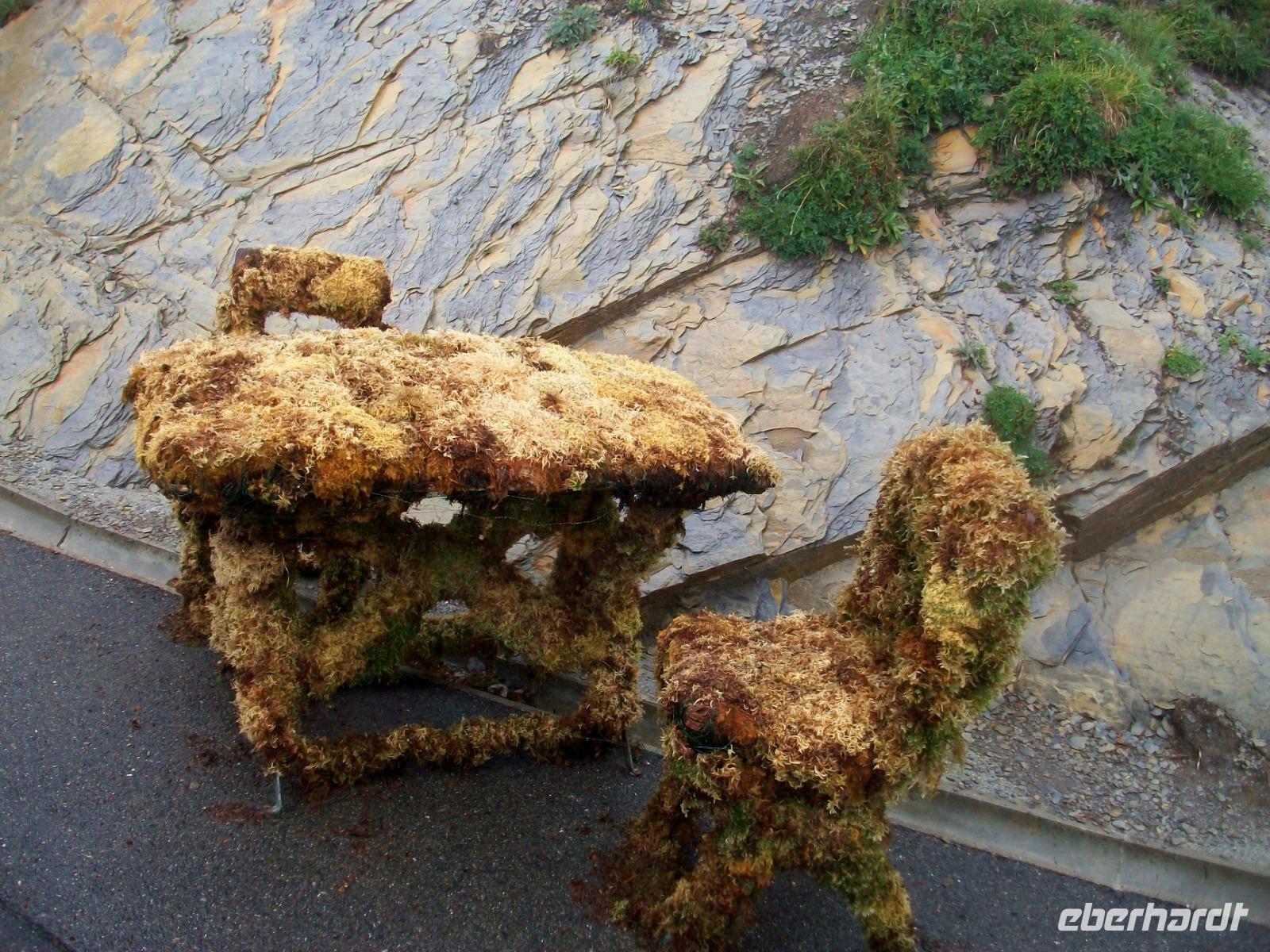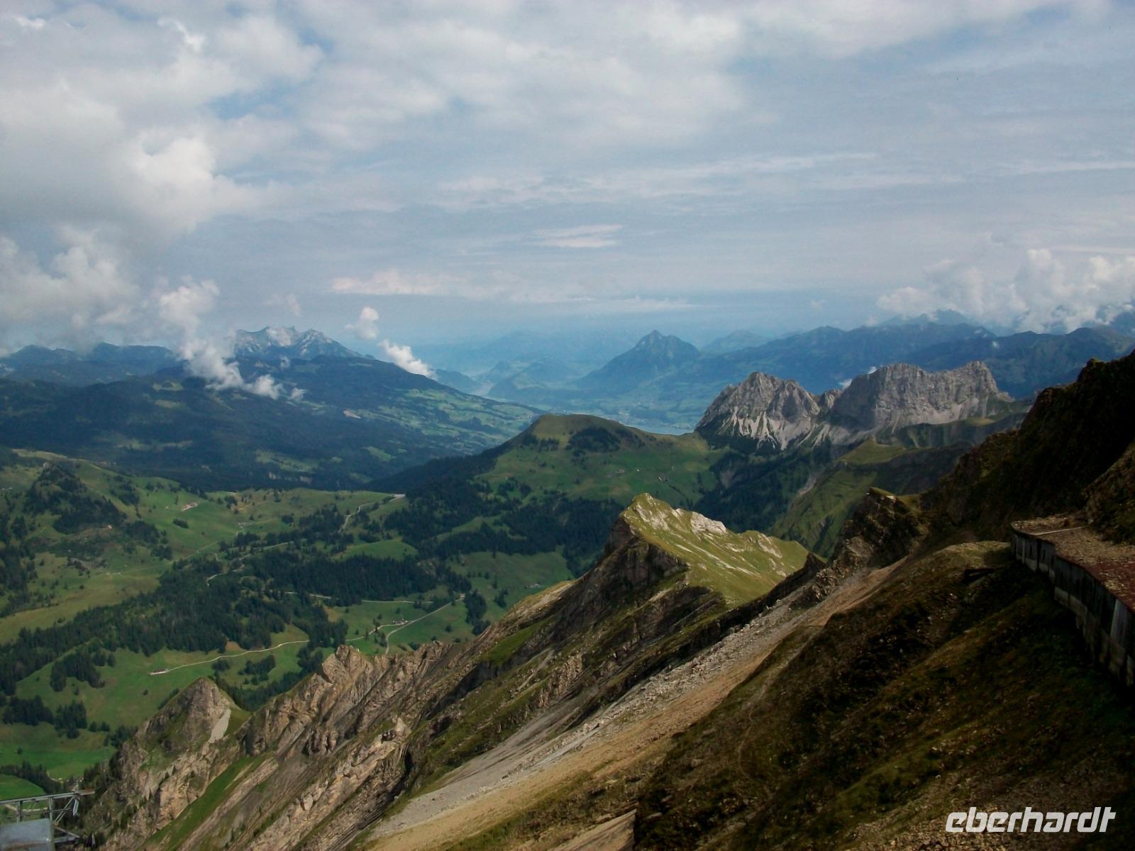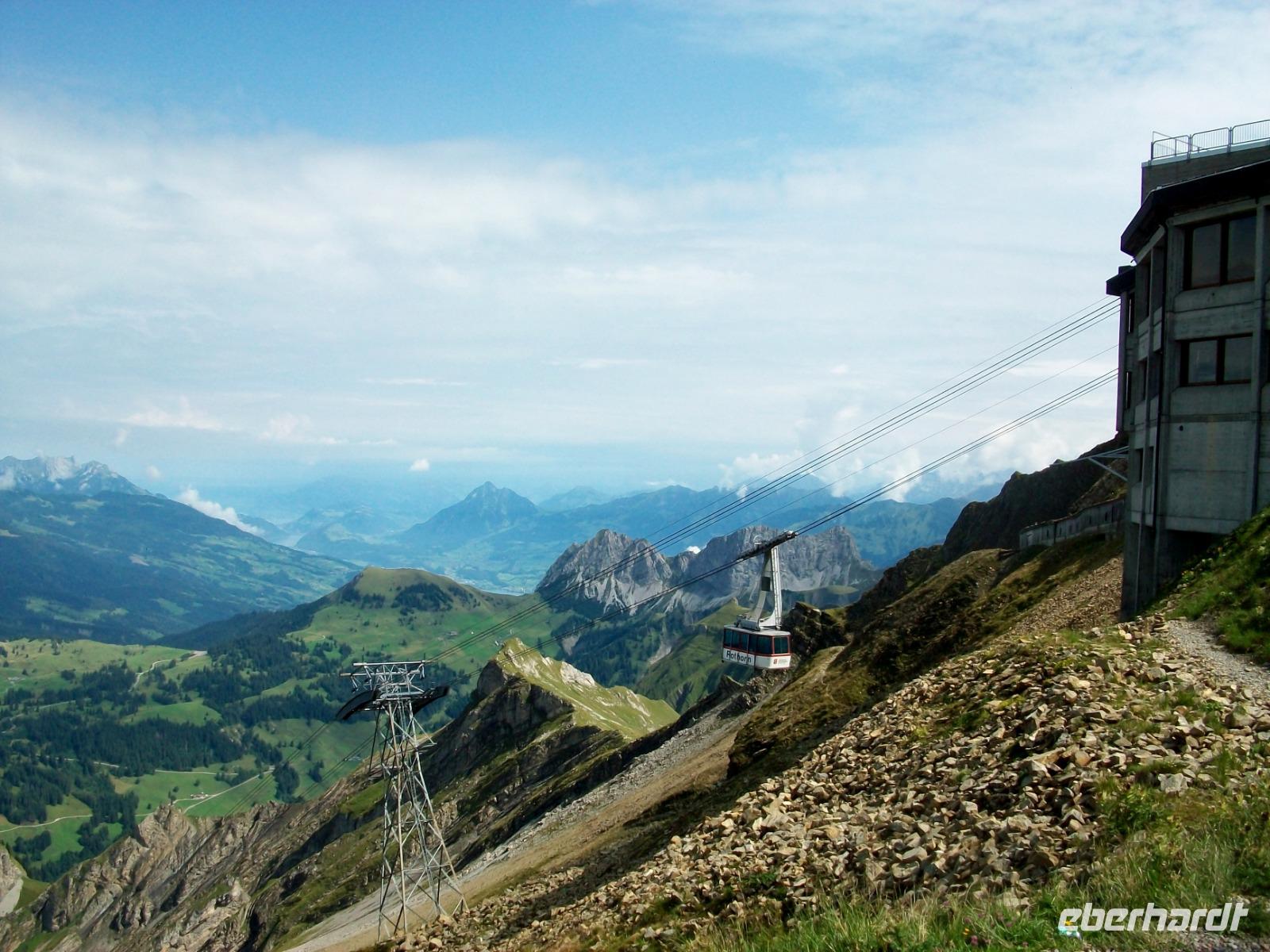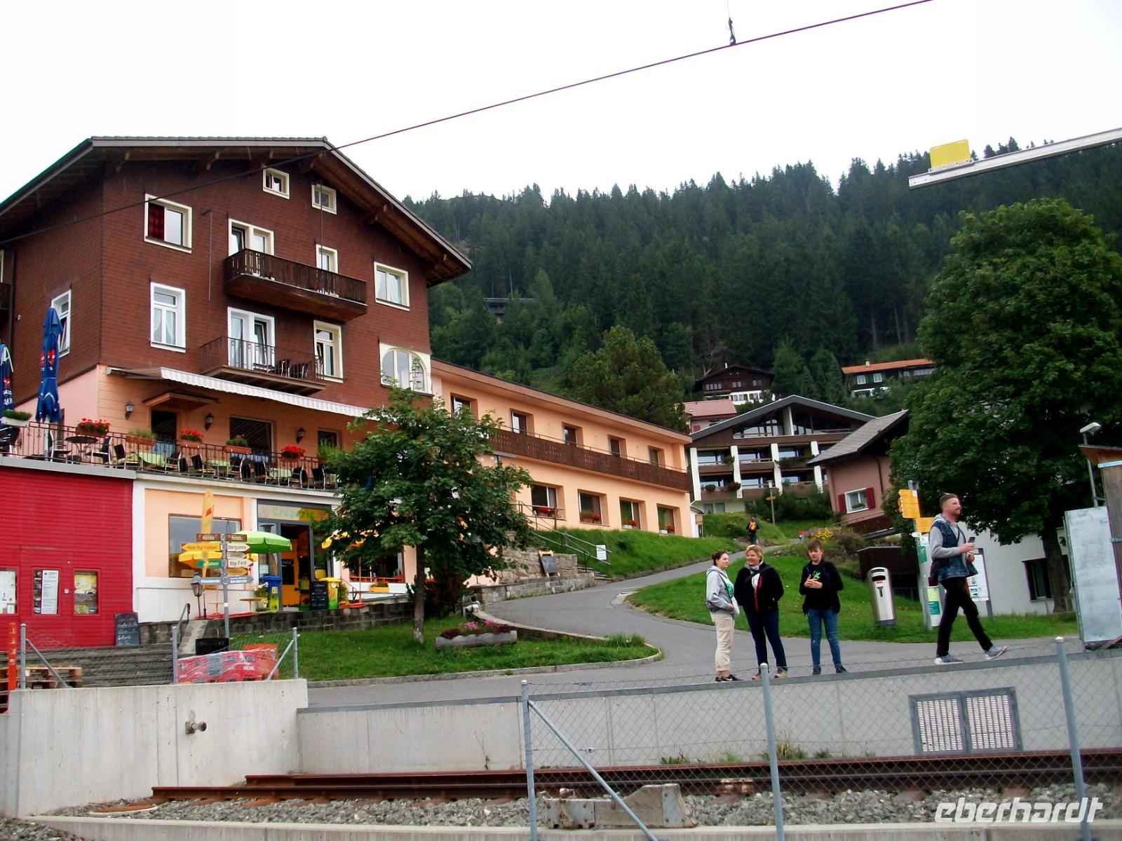 Dann, heute mit Elekrokraft, starten wir um erneut einen bekannten Schweizer Gipfel zu erklimmen. Das wird heute leider ein trübes Unterfangen; kaum sind wir einige Höhenmeter angestiegen umhüllt uns eine Wolke die sich mit Konsequenz im Berg festgesetzt hat. In dieser Suppe gelangen wir hinauf zur Schynige Platte und können die Berge die von hier oben bei guter Sicht gesehen werden nur in unserer Phantasie erstehen lassen. Eiger, Mönch und Jungfrau im ewigen Schnee, diese grandiose Bergwelt bleibt uns heute leider verschlossen. Im niesligen Regen schauen wir aber dennoch im Alpengarten vorbei und können, sehr anschaulich mit zahlreichen Tafeln versehen, die einheimische Pflanzenwelt bewundern. Wenigstens das konnte uns Petrus nicht vermiesen!