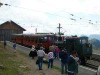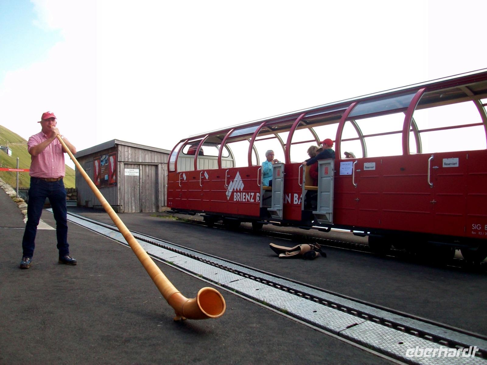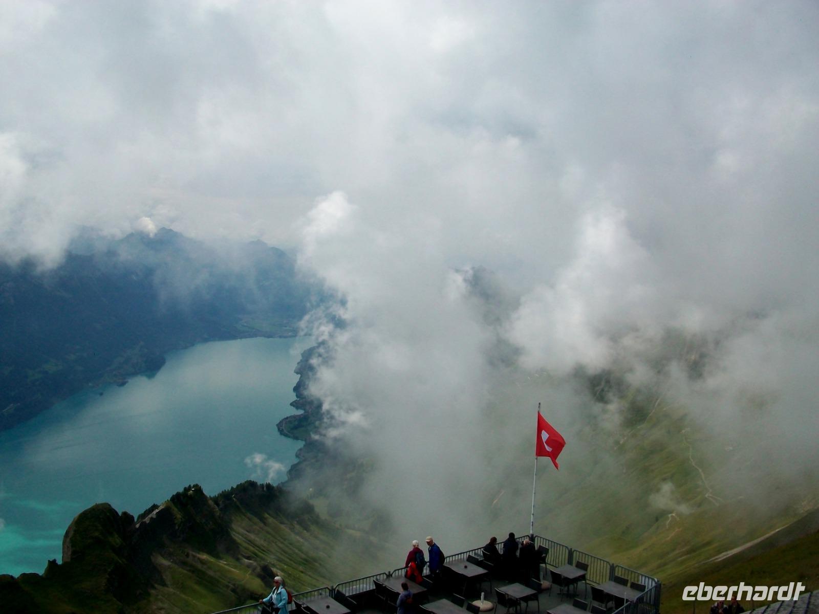 29.8.2019. Regenschwere Wolken hängen heute Morgen über den Bergen, die ganze Nacht hat es geregnet und auch jetzt, als wir zum Frühstück gehen, hält Petrus seine Schleusen geöffnet. Nach der ersten Stärkung des Tages starten wir gegen neun, es tröpfelt noch immer. Wir gelangen bergab und entlang des Sarner Sees verläuft unser Weg aufwärts in Richtung Brünigpass. Nach einer Serpentinenstraße sehen wir den Lungernsee, dicke Wolken haben sich auch hier festgehangen. Nach dem Pass gelangen wir schließlich ins Berner Oberland und bald an den Brienzer See. Auch wenn nun schon erste Wolkenlücken zu sehen sind, die Schirme klappen auf. Schon von weitem sehen wir den Dampf der Zahnradlok die uns nun nach oben bringen wird. Als wir es uns in den Wagen bequem gemacht haben geht die Fahrt bald los. Leicht ruckelnd nehmen wir den Aufstieg in Angriff und bei jedem Meter den wir an Höhe gewinnen zeigen sich uns neue, phantastische Panoramen. Durch Wald und Feld verläuft zunächst die Fahrt; entlang uralter Bauernhäuser mit bunten Blumenschmuck wird der Blick immer wieder frei und geht hinunter zum See. Bald sind wir über der Baumgrenze, grüne Wiesen erfreuen unser Auge nun und nach einstündiger Fahrt haben wir unser Ziel, das Brienzer Rothorn erreicht. Jetzt sind auch die Regenwolken verschwunden, doch bevor wir im Reich der Berge auf Entdeckung gehen, gönnen wir uns erst einmal ein leckeres Mittagessen zur Stärkung.