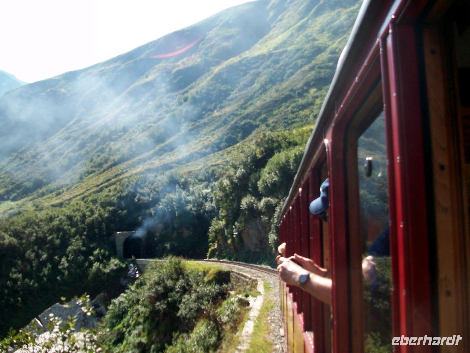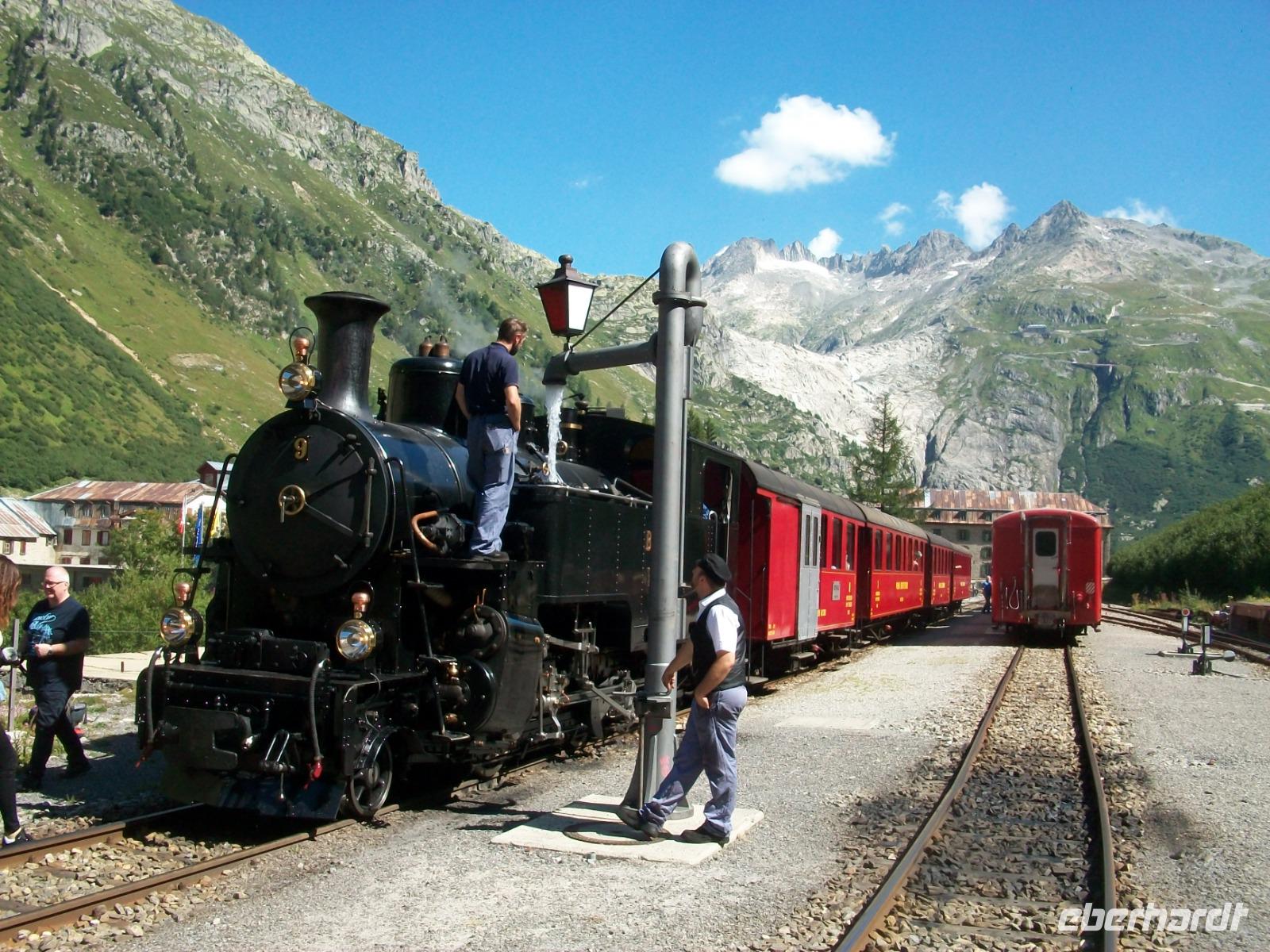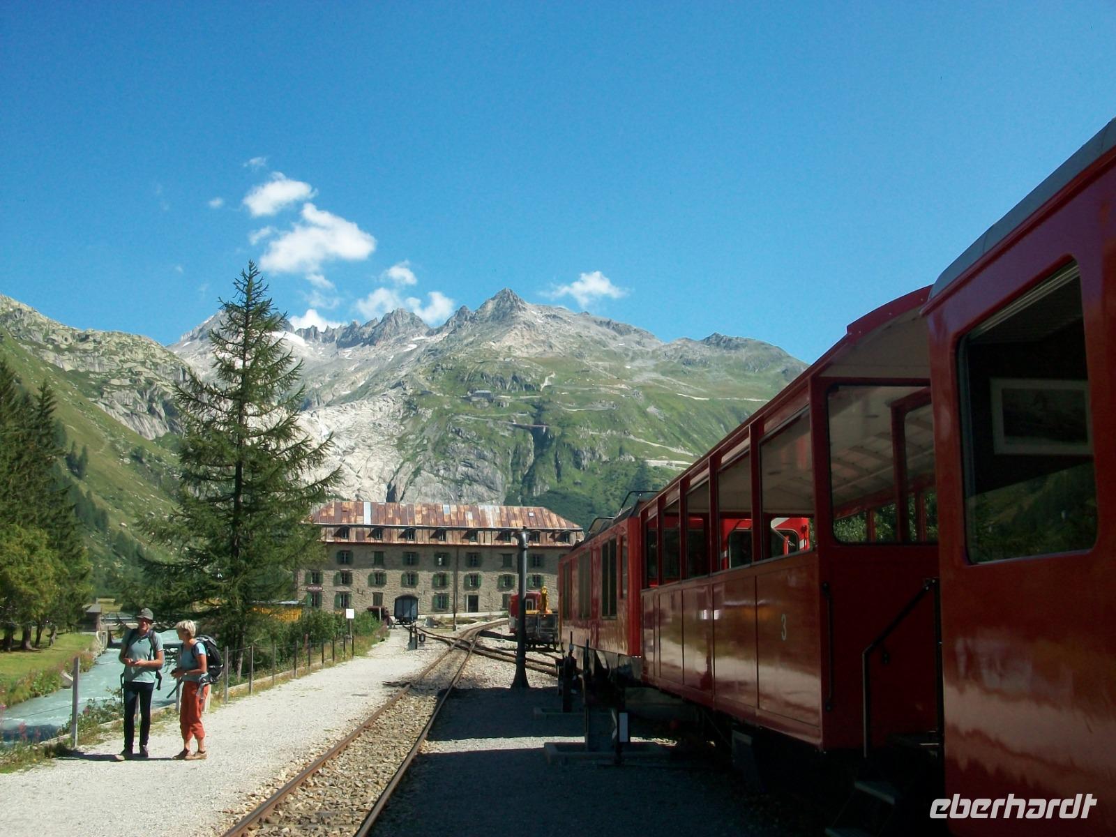 Dort ein etwas längerer Aufenthalt und danach durch den Scheiteltunnel wieder hinunter nach Gletsch. Auf der rechten Seite stürzt sich die junge Rhone hinab zu Tal, wir erahnen den Gletscher den es hier vor Jahren noch gab und nähern uns bald dem Ort Oberwald an, hier endet nun die wirklich eindrucksvolle Fahrt mit der Furka - Dampfbahn.