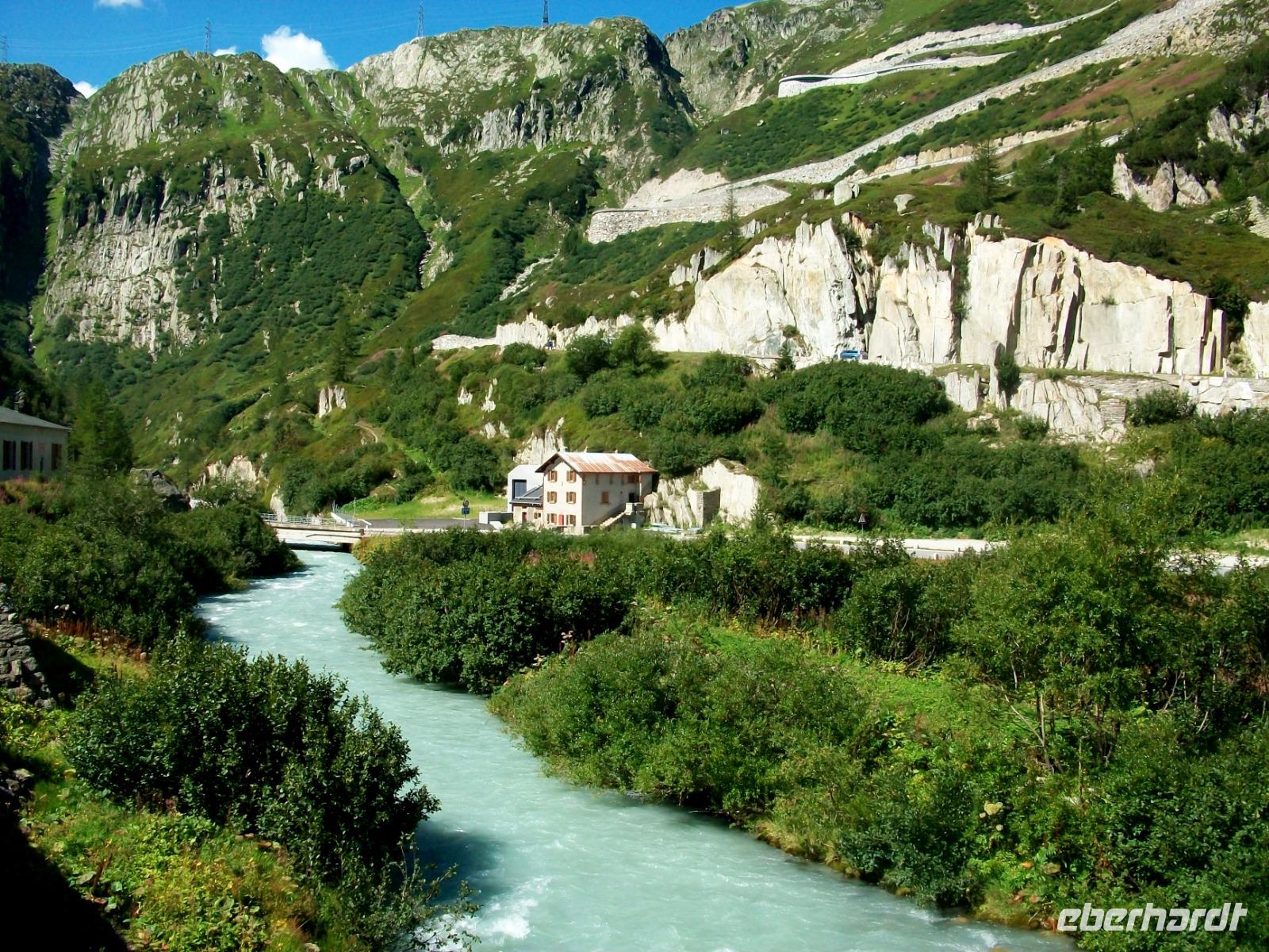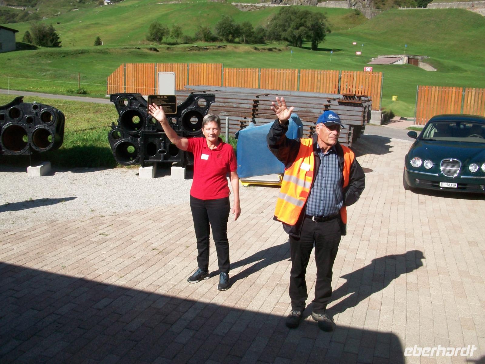 Die Schiffsreise endet in Flüelen; wir gelangen zum Bahnhof, hier erwartet uns schon der gut klimatisierte Panoramawagen des Zuges mit dem wir die alte Gotthard - Strecke erklimmen werden. Diese Tour wird nun auch eine Reise in die Bahngeschichte; wir steigen langsam aber stetig an und beim Ort Wassen passieren wir mehrere Kehrtunnels, wie sie im Berg verlaufen lässt sich an der Kirche beobachten die uns gleich in drei verschiedenen Perspektiven erscheint. Wunderbar sind die Erklärungen der Zugführerin und als wir in den alten Tunnel einfahren, sehen wir an einer Stelle Projektionen an den Wänden die uns den schwierigen Bau dieser Verbindung zeigt, einfach phantastisch!