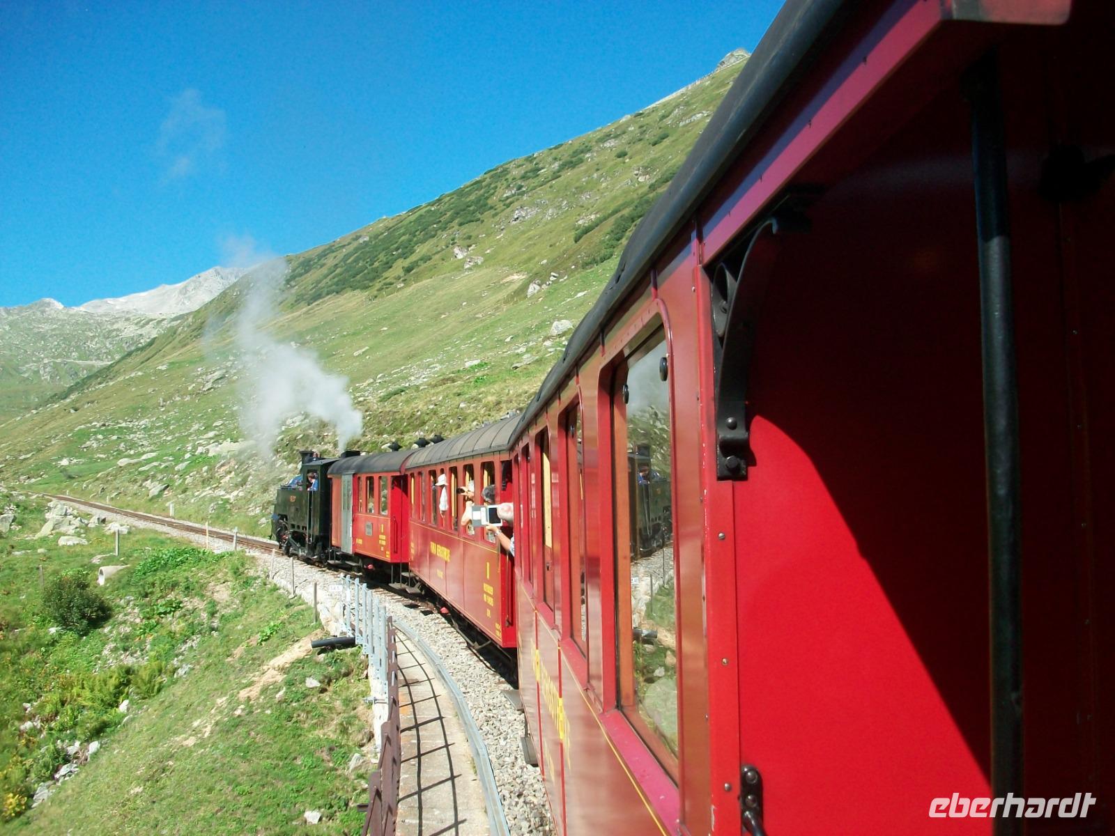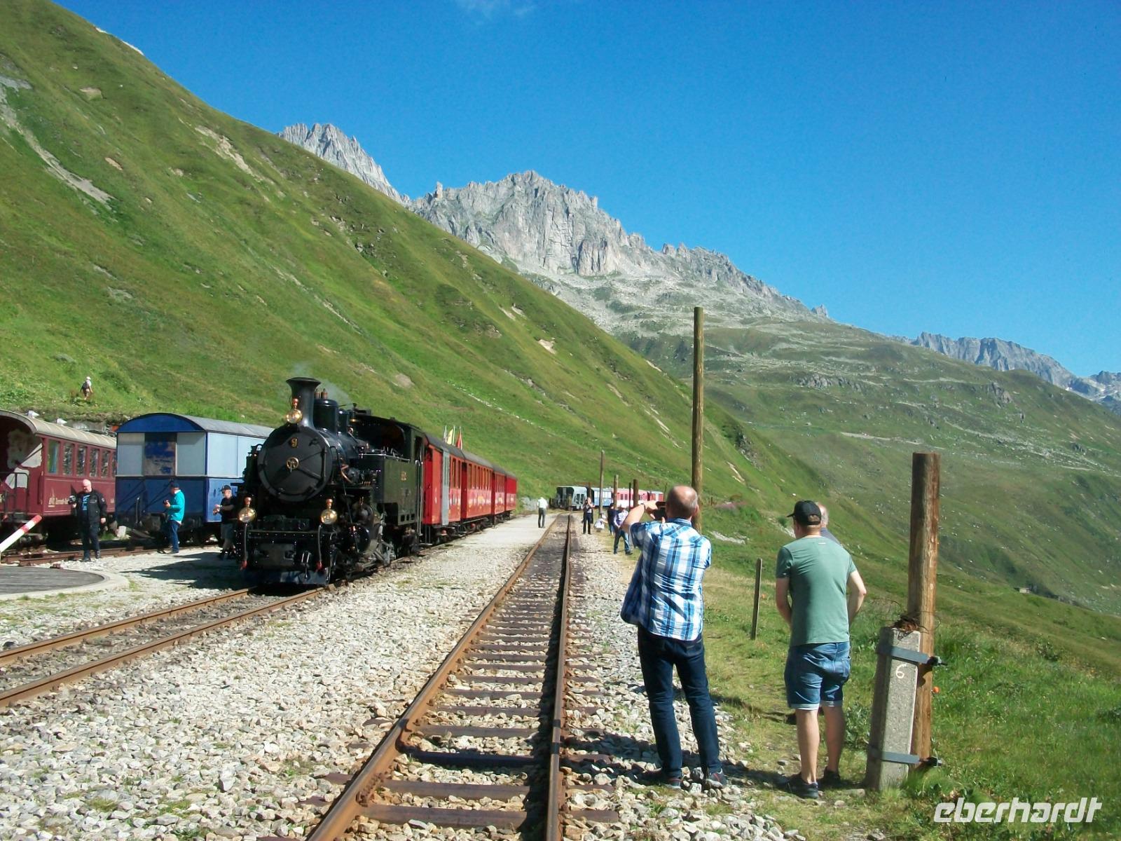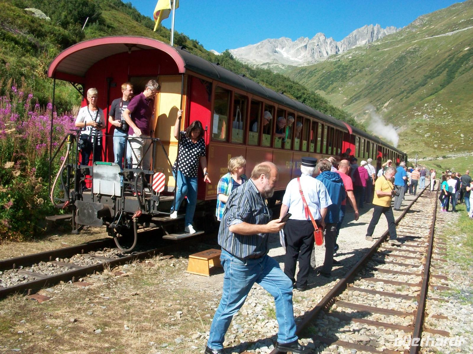 30.8.2019. Heute müssen wir etwas früher aus den Federn; mein Blick geht aus dem Fenster direkt zum Stanserhorn hinter dem sich die Sonne langsam aufmacht aufzugehen. Kein Wölkchen trübt heute den Himmel und so starten wir voller Optimismus und sehen einem weiteren schönen Tag voller Erwartung entgegen. Unser Weg führt uns zunächst hinunter zum Vierwaldstätter See, an ihm entlang gelangen wir in den Kanton Uri. Hier rücken nun bald die Berge ganz eng an die Straße heran, durch die schroffe Schöllenenschlucht und vorbei an der Teufelsbrücke, langen wir oben im Urserental an und im Ort Realp endet vorerst die Fahrt mit dem Bus. Vor uns der Bahnhof und mit Dampf der dem Schornstein der Lok entsteigt werden wir auch hier begrüßt. Fleißige Hände haben diese Bergstrecke gerettet, diese Fahrt kommt nun einer Zeitreise gleich. Alles ist hier original: die roten Wagen aus alter Zeit, die Lok, ja selbst die Uniformen der Bahnmitarbeiter. Pünktlich starten wir und mithilfe der Zahnradtechnik geht es nun aufwärts. Wir sehen erneut die unberührte Natur der Schweiz, saftig grüne Wissen auf denen Kühe grasen, dazwischen nimmt der Wildbach seine Bahn und wir sind mittendrin! Es geht durch Tunnels und über abenteuerliche Brücken hinauf in Richtung Furkapass.