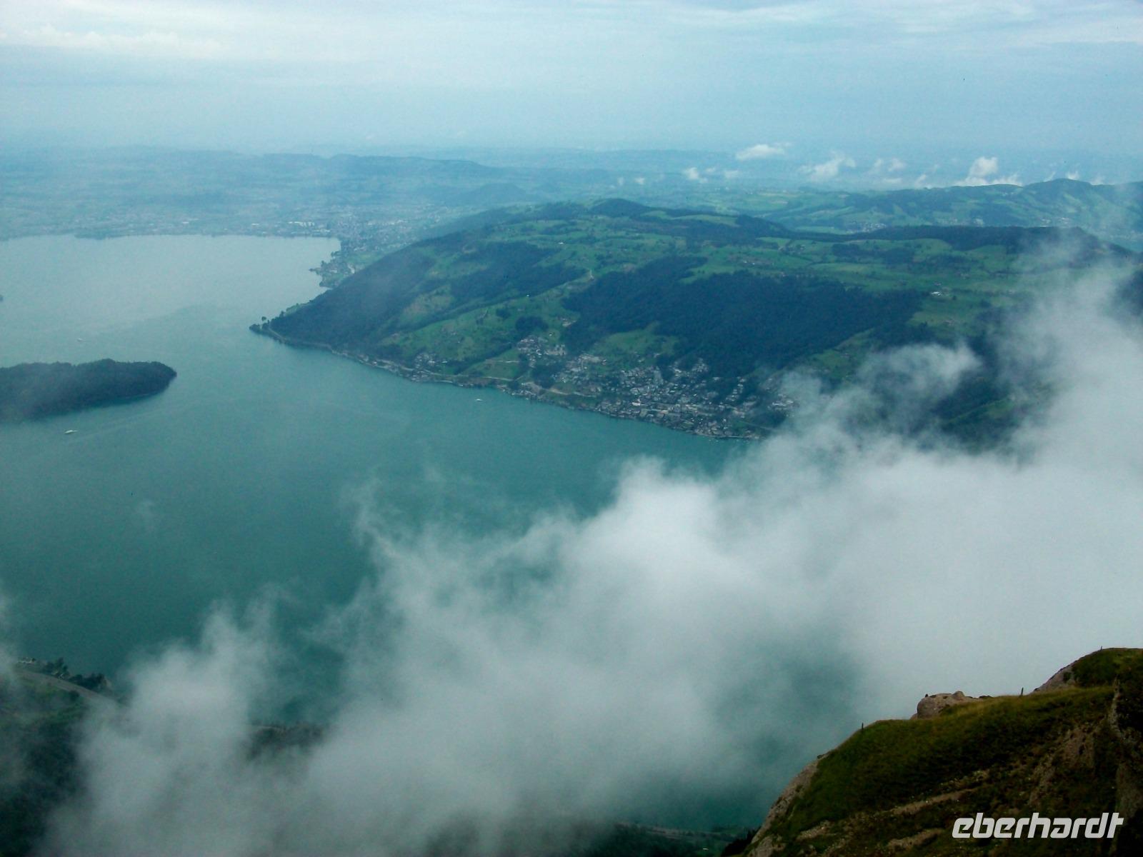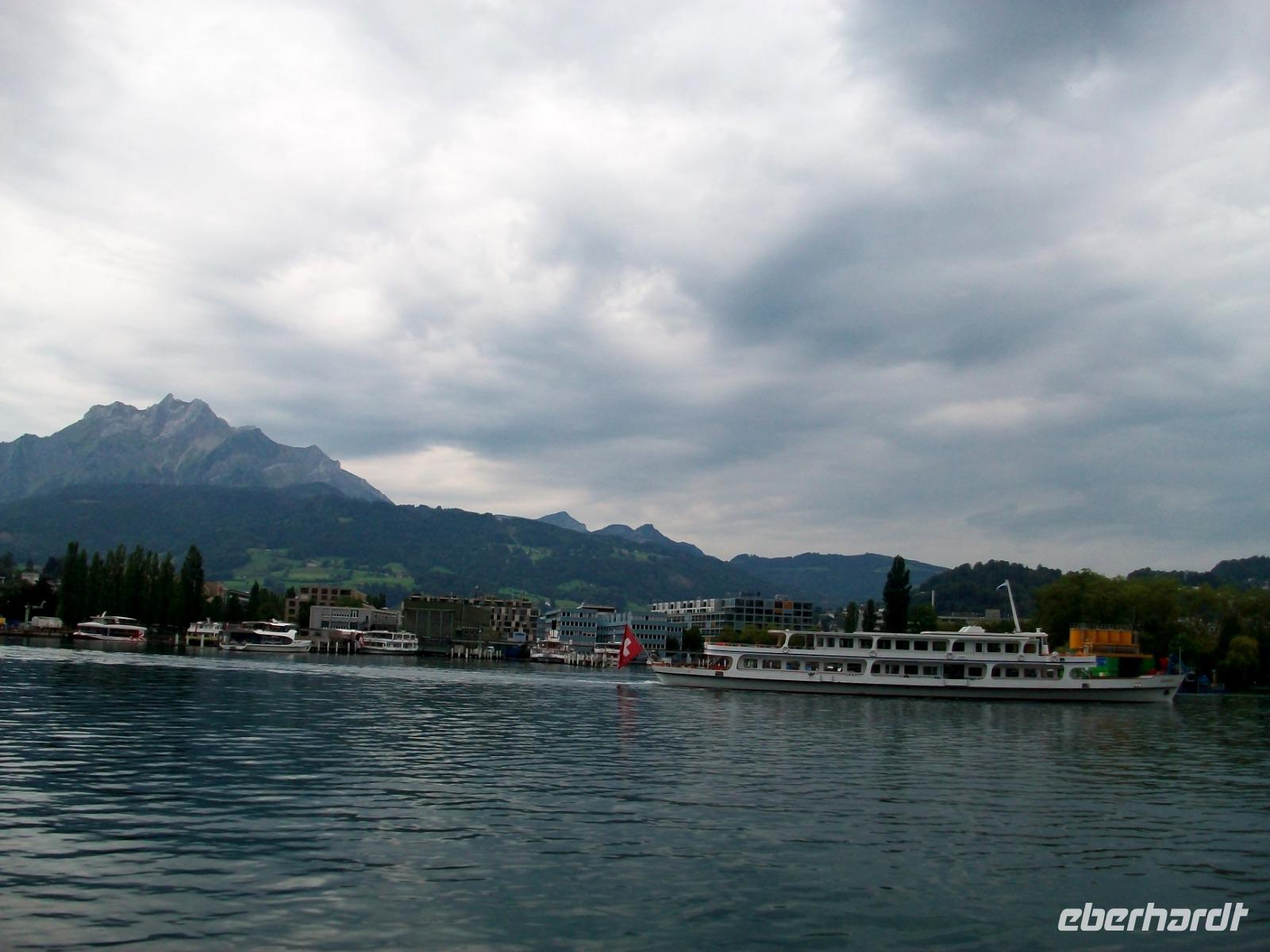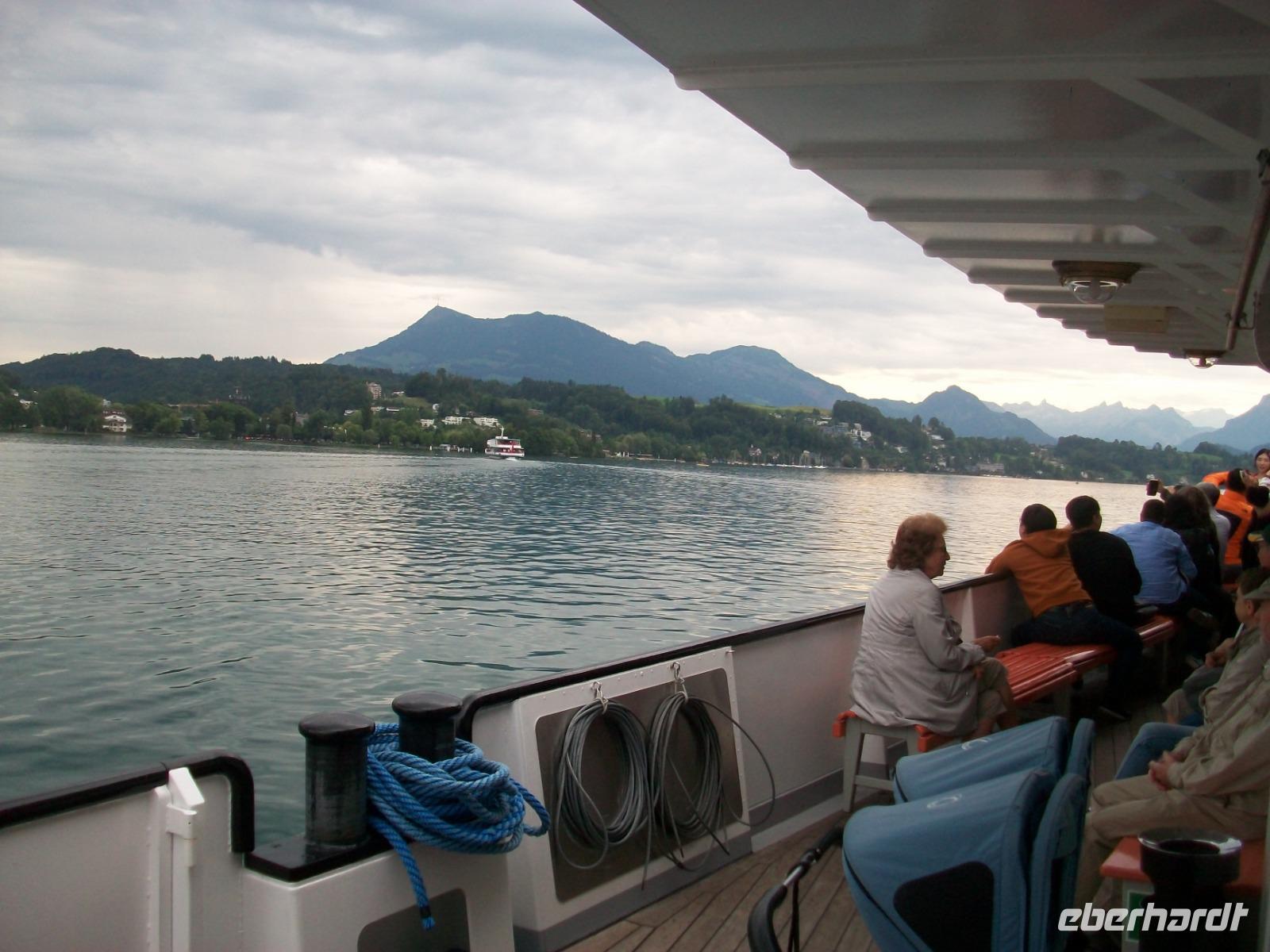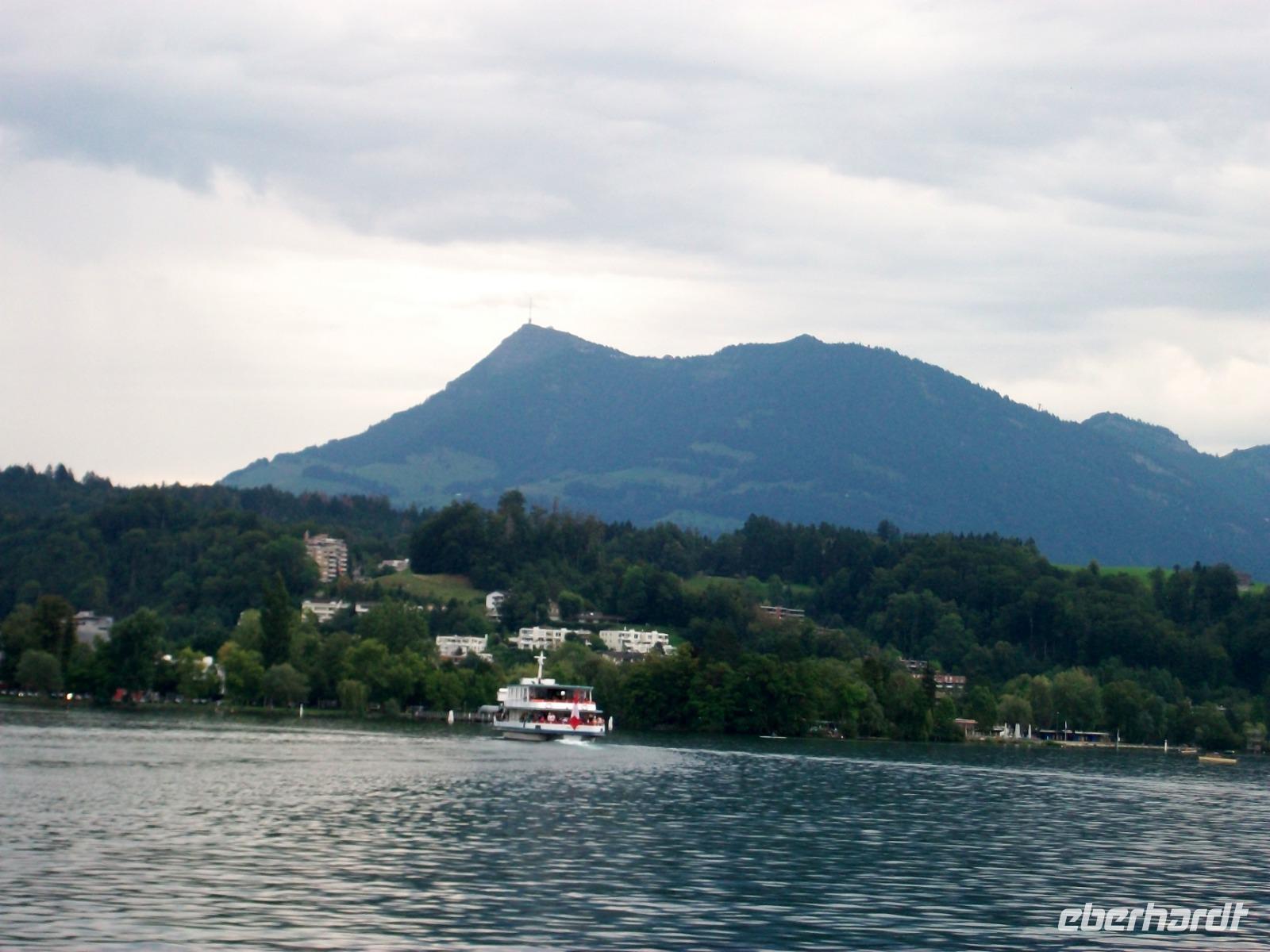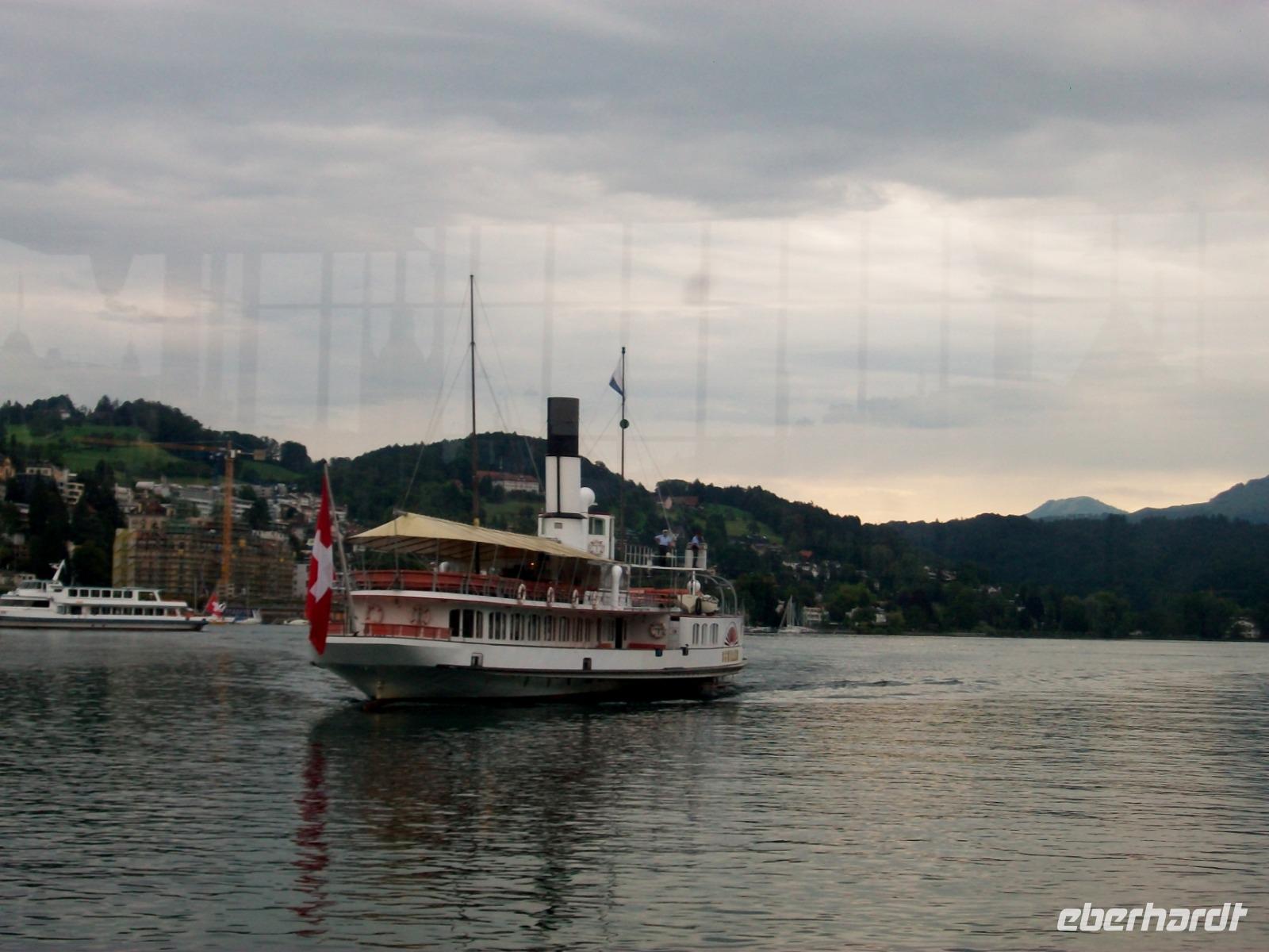 1.9.2019. Der Wetterbericht hat einen Wetterumschwung prognostiziert, mal schauen ob wir heute und morgen noch Glück haben. Der Morgen beginnt noch schön; auch wenn es einige Wolken gibt, der Start in Richtung Luzern verläuft vielversprechend. Wir gelangen am Sarner See entlang auch bald in diese schöne Stadt, hier gehen wir nun wieder zum Schiffsanleger NR. 1 und das rechtzeitige Kommen sichert uns auch heute gute Plätze. Der Himmel bleibt bewölkt als wir mit dem historischen Raddampfer „Schiller" starten, dennoch genießen wir erneut die schönen Impressionen auf dem Vierwaldstätter See. Heute endet die Fahrt nach einer Stunde im schönen Ort Vitznau, schon am Anleger können wir den Dampf der Rigi - Bahn schnuppern. Auch in dieser Bahn ist Platz für uns reserviert und bald geht es aufwärts, geschoben von einer Schweizer Lok und angetrieben von Sibirischer Steinkohle die richtig Dampf macht. Vorbei an schönen Häusern, grünen Wiesen und schroffen Abhängen gelangen wir, gut durchgerüttelt, hinauf zum Kulm. Trotz der Wolken, der Blick hinunter ist nahezu frei und hier oben zwischen Himmel und Erde genießen wir eine schöne Zeit. Dichter, Denker und gekrönte Häupter waren auf der Rigi und auch wir können die schöne Atmosphäre der verschiedenen Ausblicke in vollen Zügen genießen. Oben, gleich beim Funkturm, geht der Blick hinunter zum Zuger See, einmal umgedreht und wir sehen die Erhebungen die vom Vierwaldstätter See aufsteigen - einfach wunderbar. Dann steigen weiße Wolken Gespenstern gleich das Tal hinauf, verdecken kurz die Sicht um dann wie von Geisterhand wieder weggeblasen zu werden. In diesem Wechselspiel vergeht die Zeit wieder viel zu schnell; die Abfahrt zu Tal steht an und abwärts geht es wieder nach Vitznau.