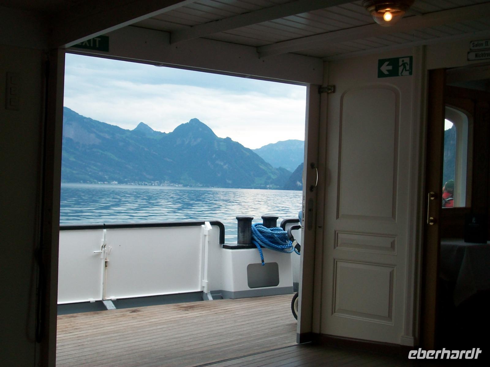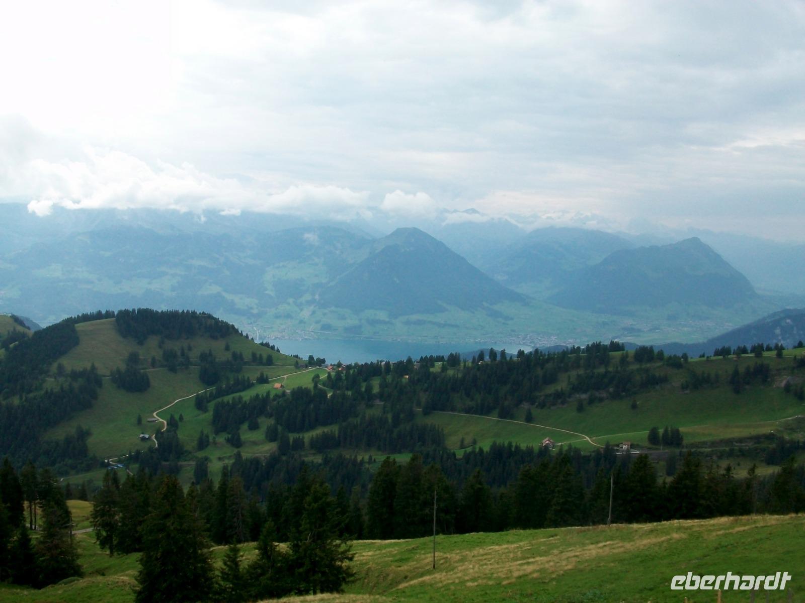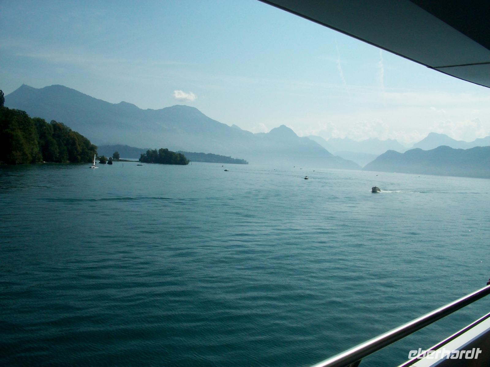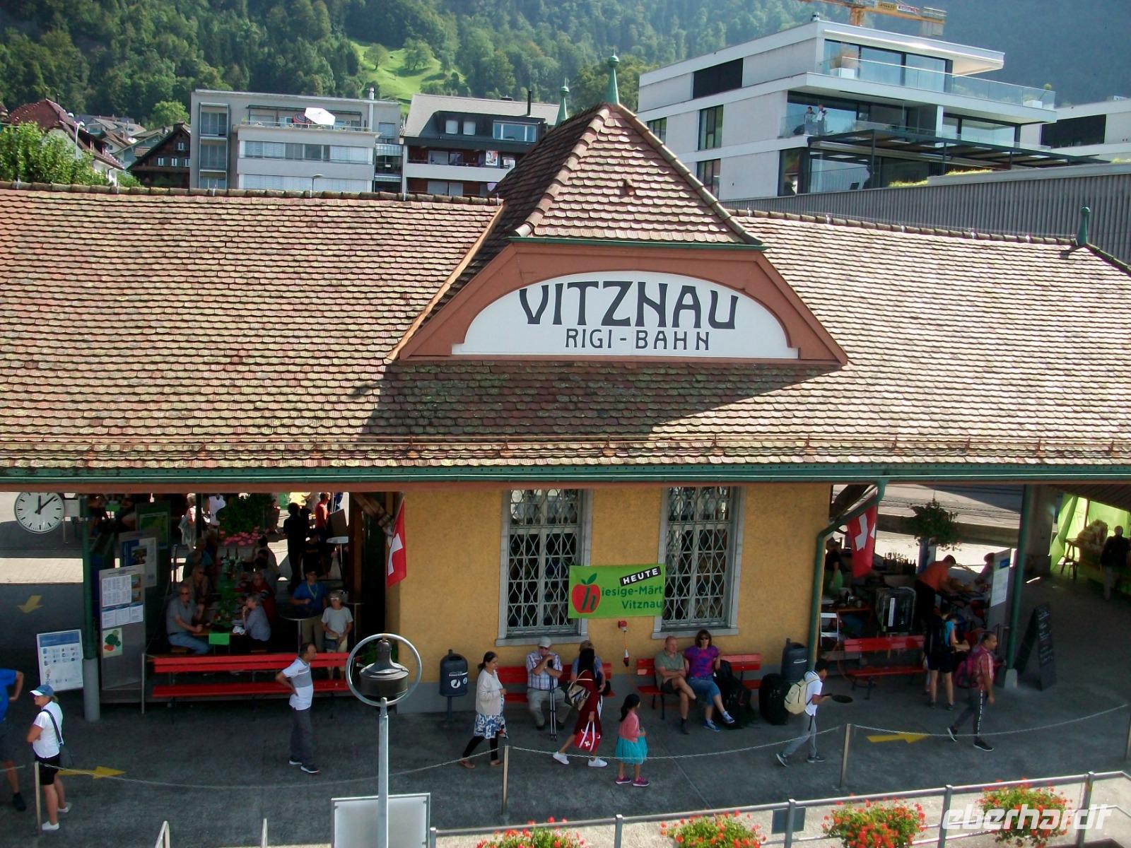 1.9.2019. Der Wetterbericht hat einen Wetterumschwung prognostiziert, mal schauen ob wir heute und morgen noch Glück haben. Der Morgen beginnt noch schön; auch wenn es einige Wolken gibt, der Start in Richtung Luzern verläuft vielversprechend. Wir gelangen am Sarner See entlang auch bald in diese schöne Stadt, hier gehen wir nun wieder zum Schiffsanleger NR. 1 und das rechtzeitige Kommen sichert uns auch heute gute Plätze. Der Himmel bleibt bewölkt als wir mit dem historischen Raddampfer „Schiller" starten, dennoch genießen wir erneut die schönen Impressionen auf dem Vierwaldstätter See. Heute endet die Fahrt nach einer Stunde im schönen Ort Vitznau, schon am Anleger können wir den Dampf der Rigi - Bahn schnuppern. Auch in dieser Bahn ist Platz für uns reserviert und bald geht es aufwärts, geschoben von einer Schweizer Lok und angetrieben von Sibirischer Steinkohle die richtig Dampf macht. Vorbei an schönen Häusern, grünen Wiesen und schroffen Abhängen gelangen wir, gut durchgerüttelt, hinauf zum Kulm. Trotz der Wolken, der Blick hinunter ist nahezu frei und hier oben zwischen Himmel und Erde genießen wir eine schöne Zeit. Dichter, Denker und gekrönte Häupter waren auf der Rigi und auch wir können die schöne Atmosphäre der verschiedenen Ausblicke in vollen Zügen genießen. Oben, gleich beim Funkturm, geht der Blick hinunter zum Zuger See, einmal umgedreht und wir sehen die Erhebungen die vom Vierwaldstätter See aufsteigen - einfach wunderbar. Dann steigen weiße Wolken Gespenstern gleich das Tal hinauf, verdecken kurz die Sicht um dann wie von Geisterhand wieder weggeblasen zu werden. In diesem Wechselspiel vergeht die Zeit wieder viel zu schnell; die Abfahrt zu Tal steht an und abwärts geht es wieder nach Vitznau.
