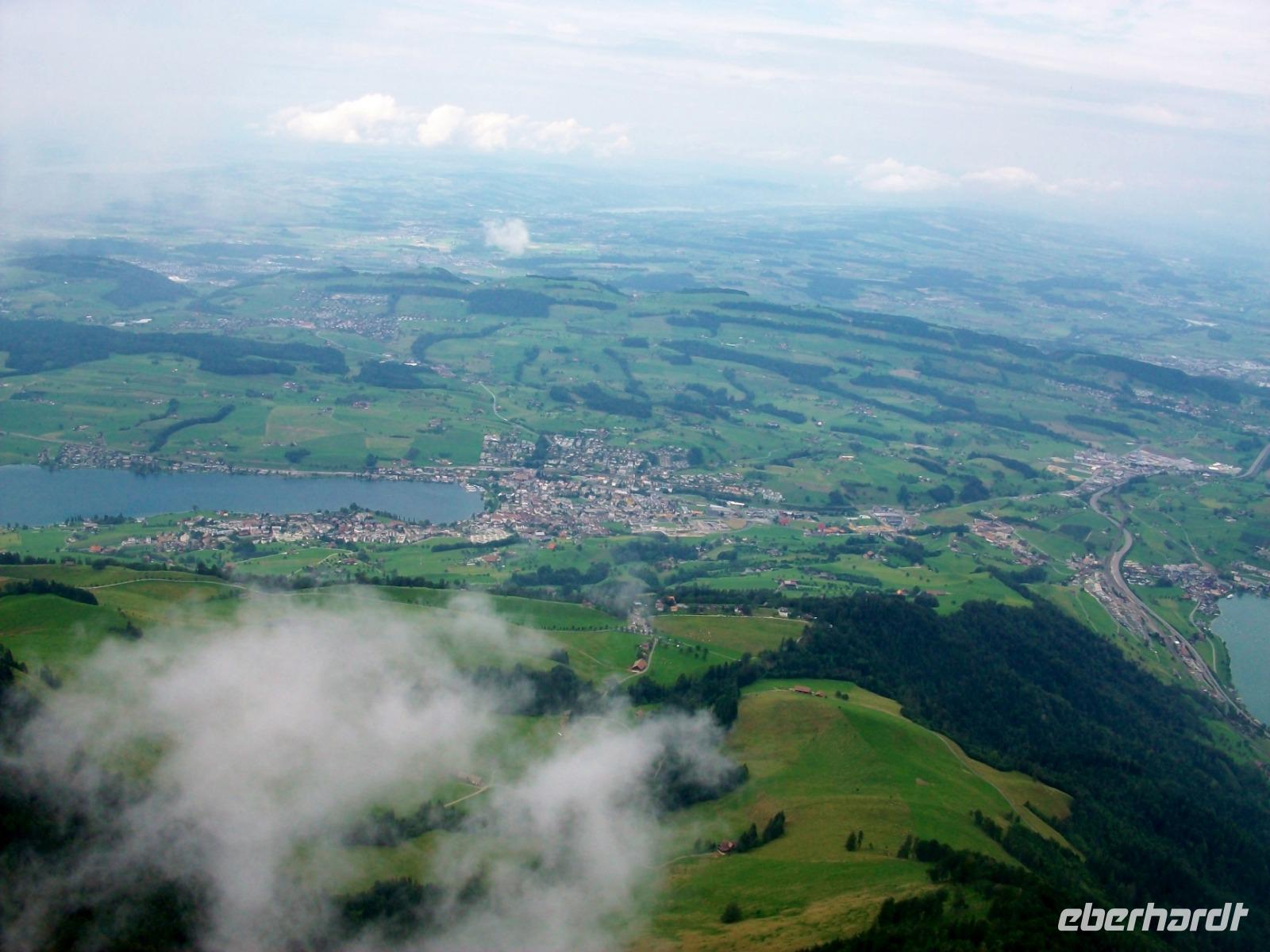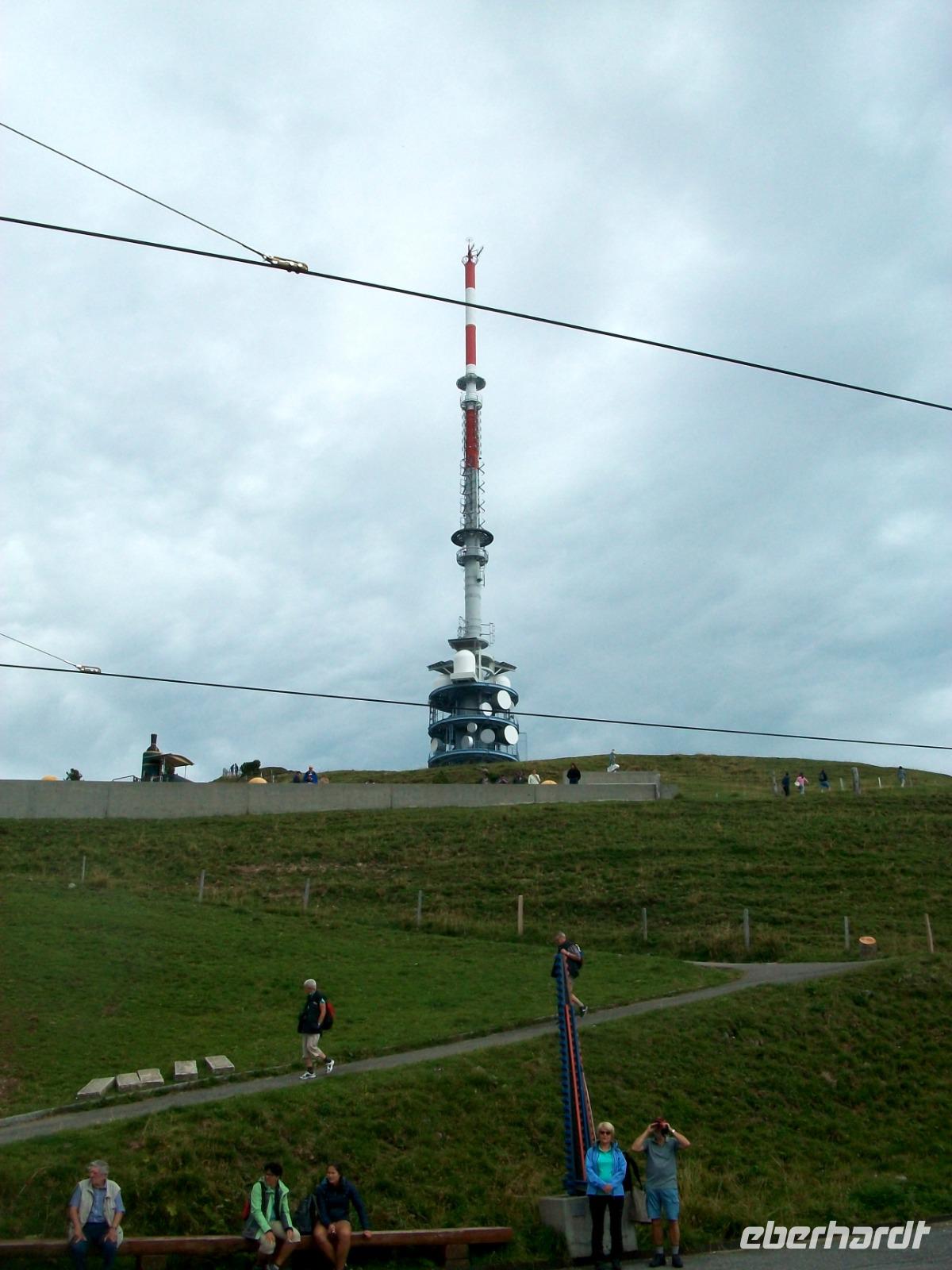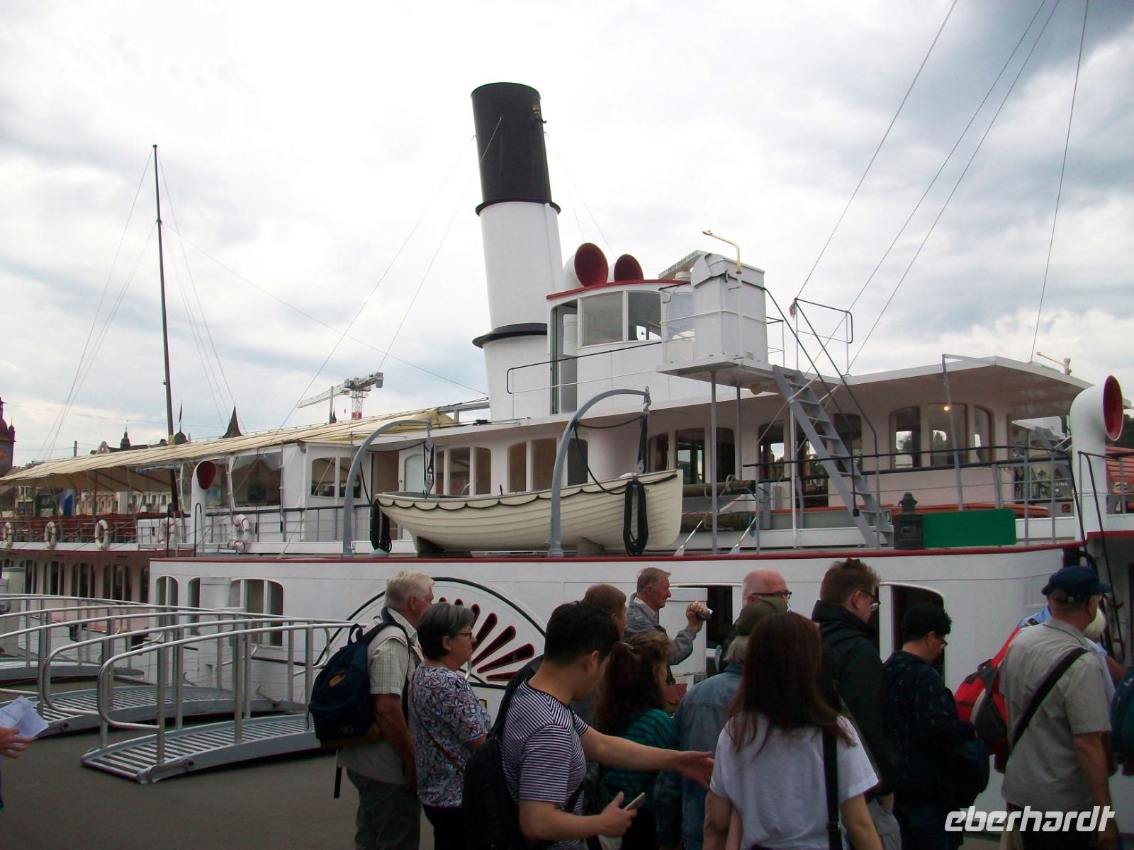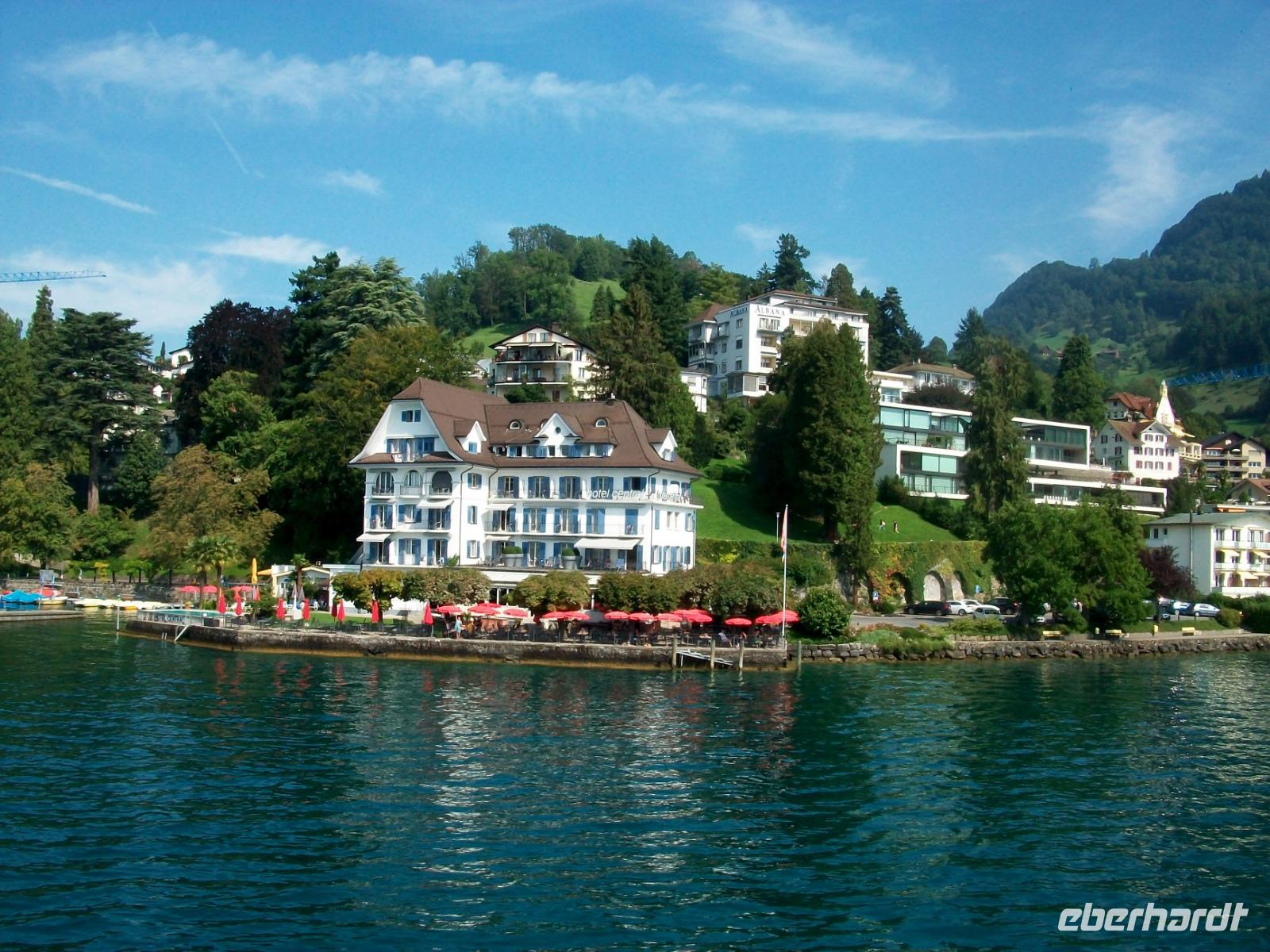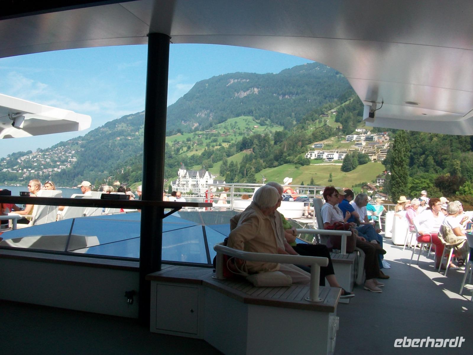 1.9.2019. Der Wetterbericht hat einen Wetterumschwung prognostiziert, mal schauen ob wir heute und morgen noch Glück haben. Der Morgen beginnt noch schön; auch wenn es einige Wolken gibt, der Start in Richtung Luzern verläuft vielversprechend. Wir gelangen am Sarner See entlang auch bald in diese schöne Stadt, hier gehen wir nun wieder zum Schiffsanleger NR. 1 und das rechtzeitige Kommen sichert uns auch heute gute Plätze. Der Himmel bleibt bewölkt als wir mit dem historischen Raddampfer „Schiller" starten, dennoch genießen wir erneut die schönen Impressionen auf dem Vierwaldstätter See. Heute endet die Fahrt nach einer Stunde im schönen Ort Vitznau, schon am Anleger können wir den Dampf der Rigi - Bahn schnuppern. Auch in dieser Bahn ist Platz für uns reserviert und bald geht es aufwärts, geschoben von einer Schweizer Lok und angetrieben von Sibirischer Steinkohle die richtig Dampf macht. Vorbei an schönen Häusern, grünen Wiesen und schroffen Abhängen gelangen wir, gut durchgerüttelt, hinauf zum Kulm. Trotz der Wolken, der Blick hinunter ist nahezu frei und hier oben zwischen Himmel und Erde genießen wir eine schöne Zeit. Dichter, Denker und gekrönte Häupter waren auf der Rigi und auch wir können die schöne Atmosphäre der verschiedenen Ausblicke in vollen Zügen genießen. Oben, gleich beim Funkturm, geht der Blick hinunter zum Zuger See, einmal umgedreht und wir sehen die Erhebungen die vom Vierwaldstätter See aufsteigen - einfach wunderbar. Dann steigen weiße Wolken Gespenstern gleich das Tal hinauf, verdecken kurz die Sicht um dann wie von Geisterhand wieder weggeblasen zu werden. In diesem Wechselspiel vergeht die Zeit wieder viel zu schnell; die Abfahrt zu Tal steht an und abwärts geht es wieder nach Vitznau.