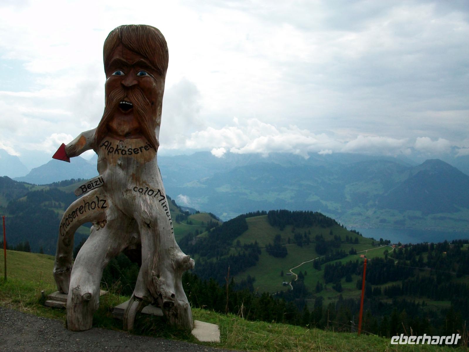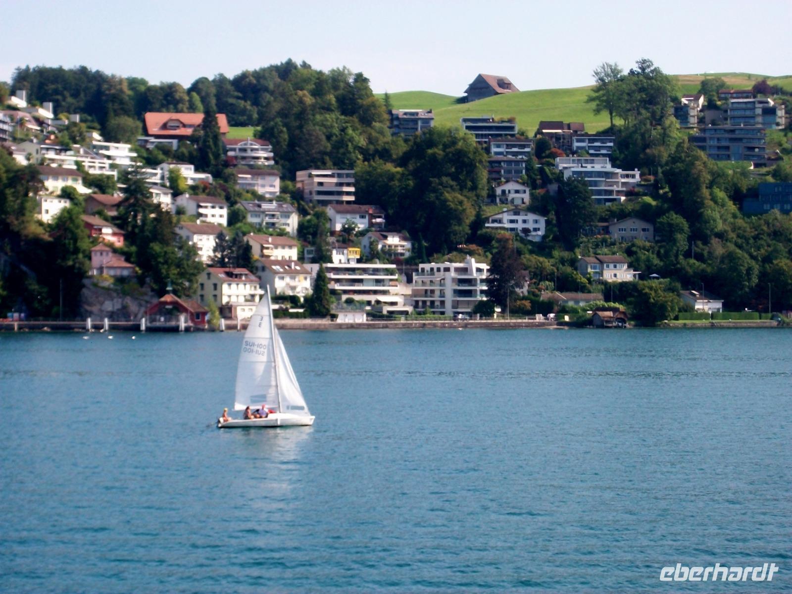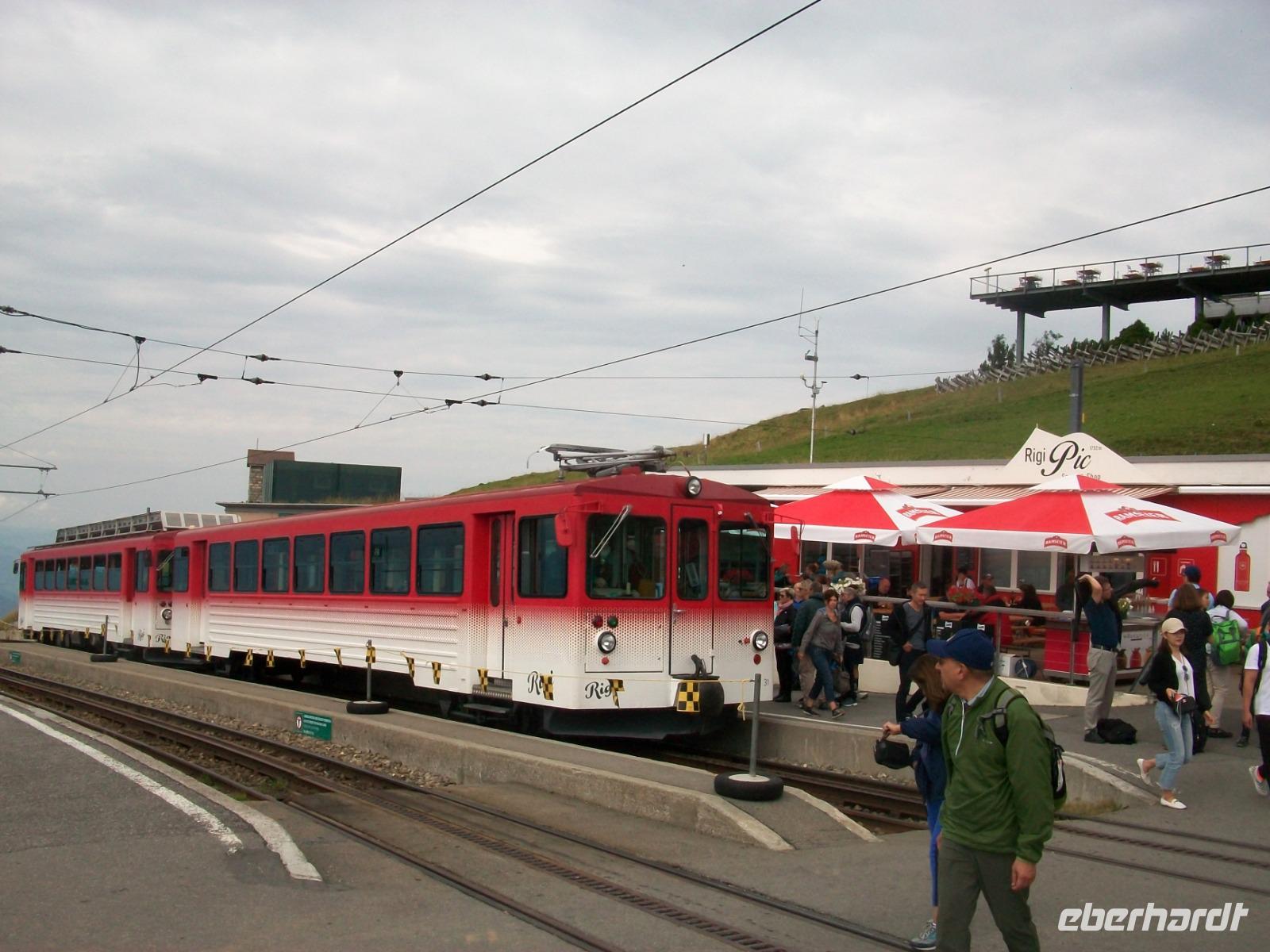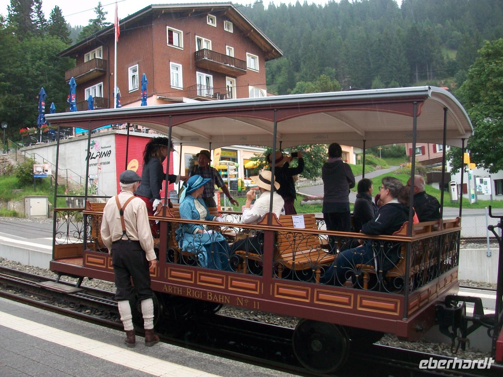 1.9.2019. Der Wetterbericht hat einen Wetterumschwung prognostiziert, mal schauen ob wir heute und morgen noch Glück haben. Der Morgen beginnt noch schön; auch wenn es einige Wolken gibt, der Start in Richtung Luzern verläuft vielversprechend. Wir gelangen am Sarner See entlang auch bald in diese schöne Stadt, hier gehen wir nun wieder zum Schiffsanleger NR. 1 und das rechtzeitige Kommen sichert uns auch heute gute Plätze. Der Himmel bleibt bewölkt als wir mit dem historischen Raddampfer „Schiller" starten, dennoch genießen wir erneut die schönen Impressionen auf dem Vierwaldstätter See. Heute endet die Fahrt nach einer Stunde im schönen Ort Vitznau, schon am Anleger können wir den Dampf der Rigi - Bahn schnuppern. Auch in dieser Bahn ist Platz für uns reserviert und bald geht es aufwärts, geschoben von einer Schweizer Lok und angetrieben von Sibirischer Steinkohle die richtig Dampf macht. Vorbei an schönen Häusern, grünen Wiesen und schroffen Abhängen gelangen wir, gut durchgerüttelt, hinauf zum Kulm. Trotz der Wolken, der Blick hinunter ist nahezu frei und hier oben zwischen Himmel und Erde genießen wir eine schöne Zeit. Dichter, Denker und gekrönte Häupter waren auf der Rigi und auch wir können die schöne Atmosphäre der verschiedenen Ausblicke in vollen Zügen genießen. Oben, gleich beim Funkturm, geht der Blick hinunter zum Zuger See, einmal umgedreht und wir sehen die Erhebungen die vom Vierwaldstätter See aufsteigen - einfach wunderbar. Dann steigen weiße Wolken Gespenstern gleich das Tal hinauf, verdecken kurz die Sicht um dann wie von Geisterhand wieder weggeblasen zu werden. In diesem Wechselspiel vergeht die Zeit wieder viel zu schnell; die Abfahrt zu Tal steht an und abwärts geht es wieder nach Vitznau.