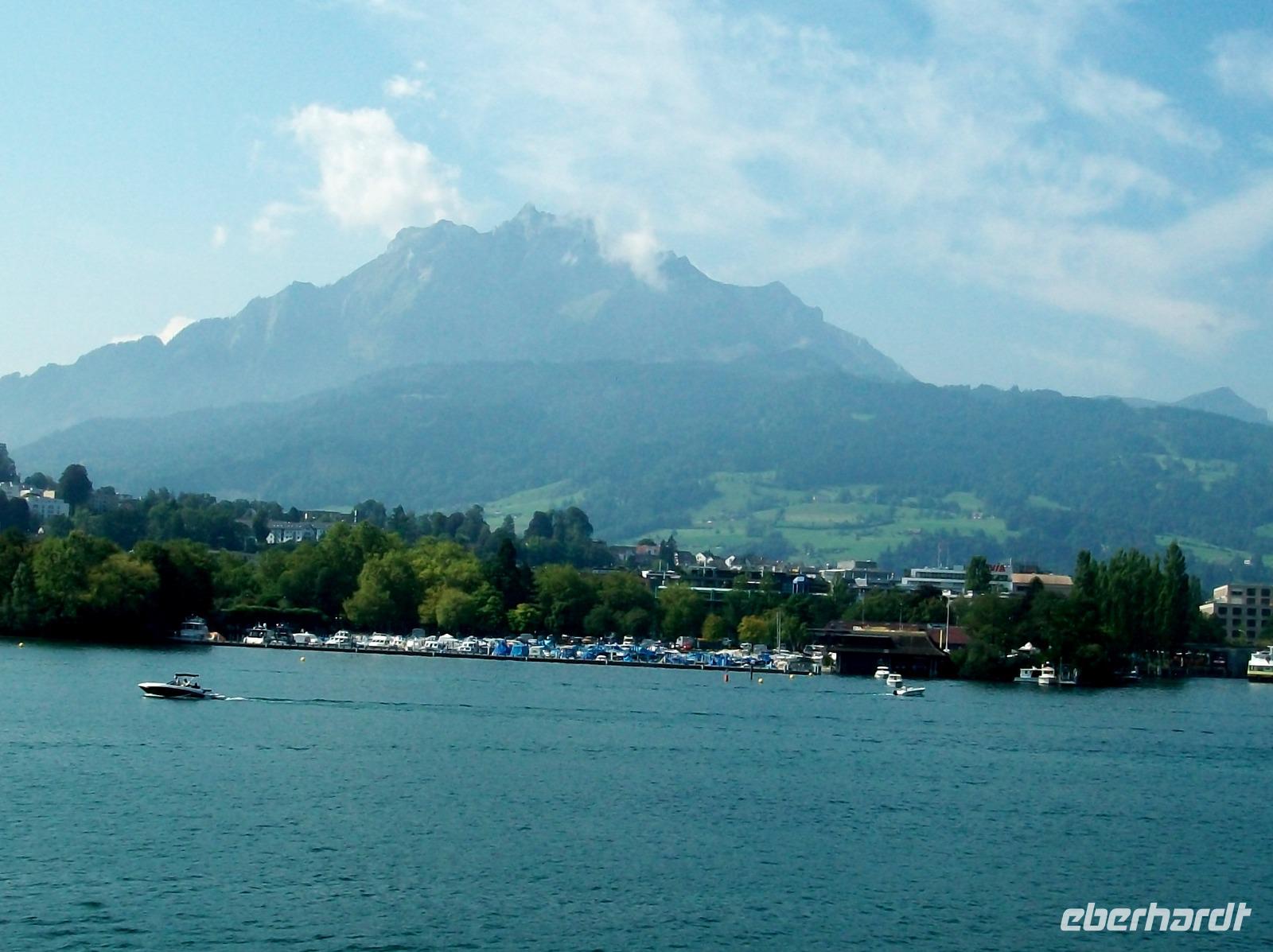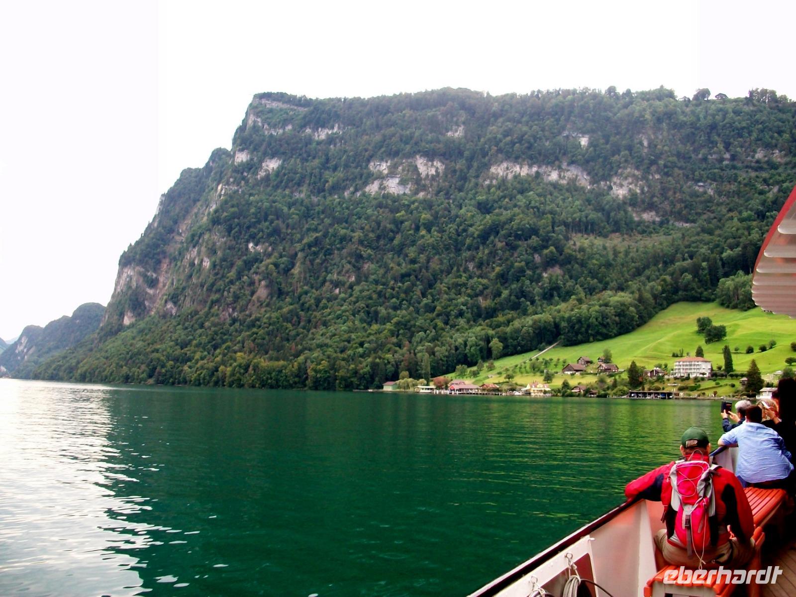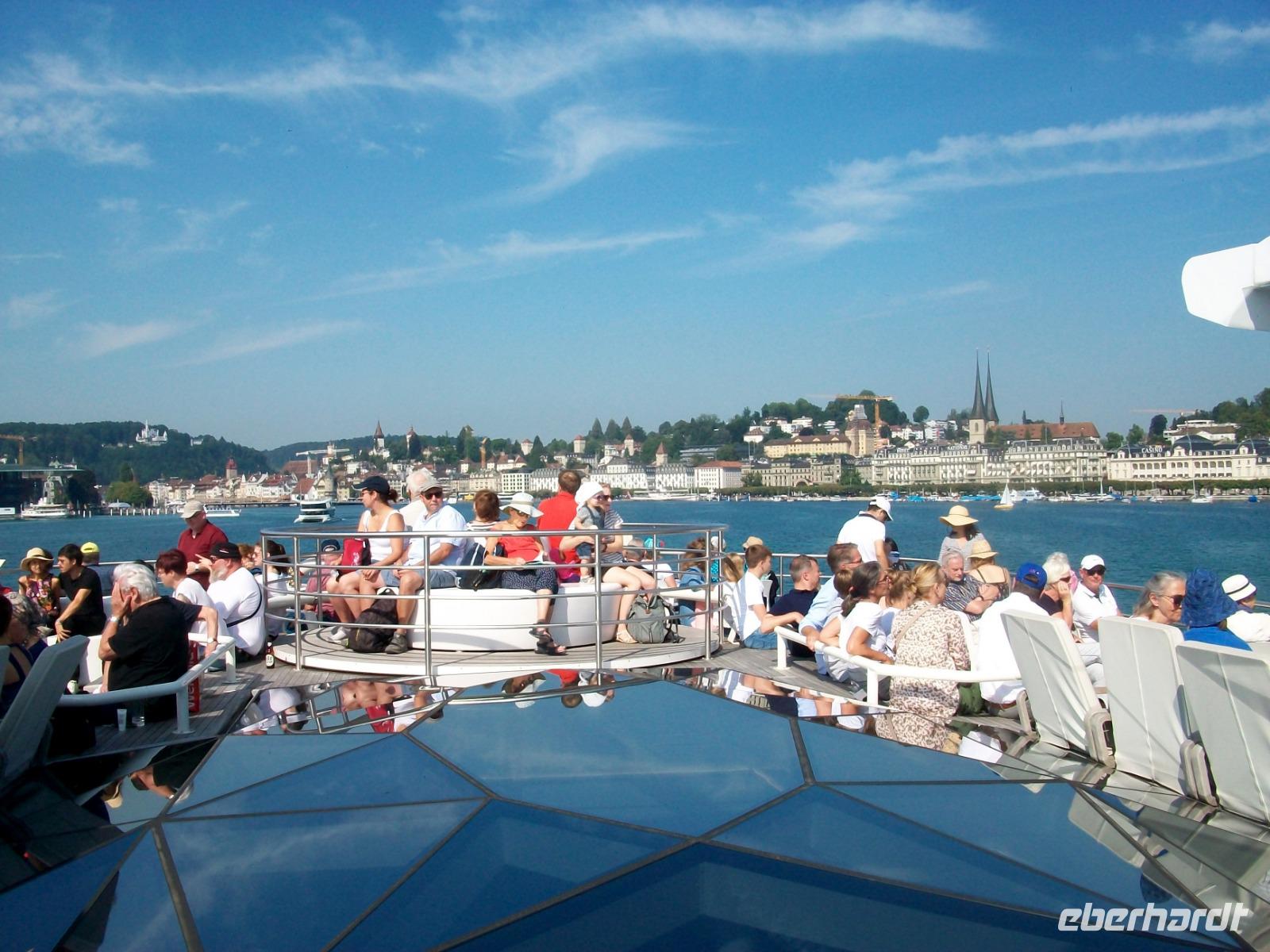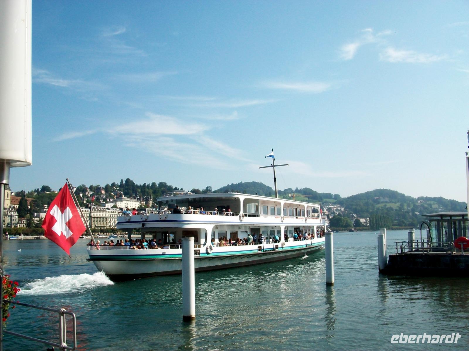 31.8.2019. Auch heute steht uns ein weiterer schöner Tag bevor an dem Petrus wieder sein bestes geben wird. Die Sonne lacht als wir unsere Tour aufnehmen um am schroffen Pilatus vorbei in Richtung Luzern zu fahren. Hier gönnen wir uns eine gute Stunde für diese reizvolle Stadt; ein Gang über die blumengeschmückte Kapellbrücke, eine Stippvisite in die pittoreske Altstadt - dann treffen wir uns am Anleger; hier können wir bald das Schiff betreten. Vom sonnendurchfluteten Oberdeck aus genießen wir in den nächsten Stunden wunderbare Panoramen; steil steigen vom Vierwaldstätter See die Berge an, die Orte an denen das Schiff anlegt können reizvoller nicht sein. Selbst die Geschichte kommt nicht zu kurz: Wir legen am Rütli an, hier wurde einst die Schweiz begründet.