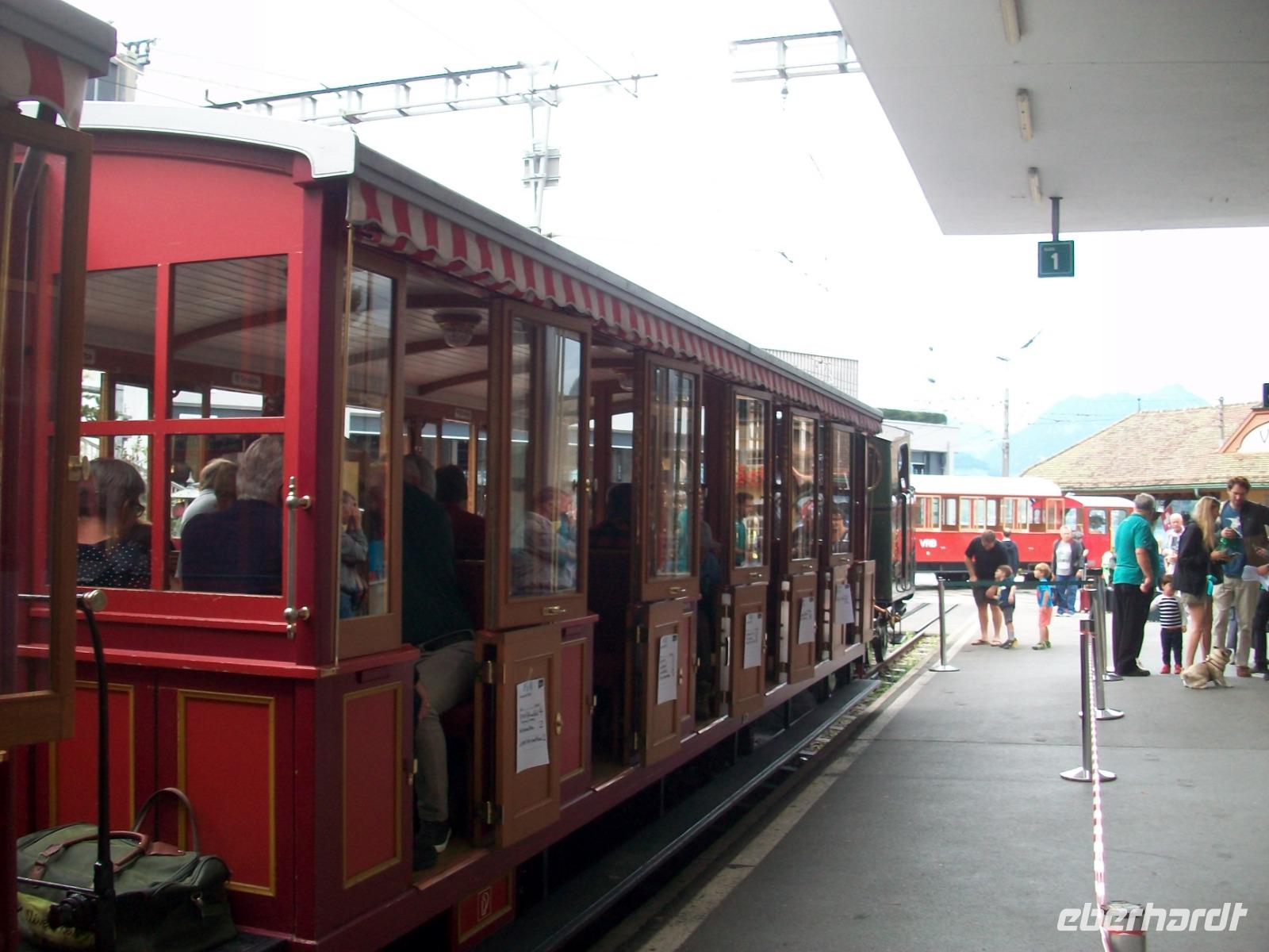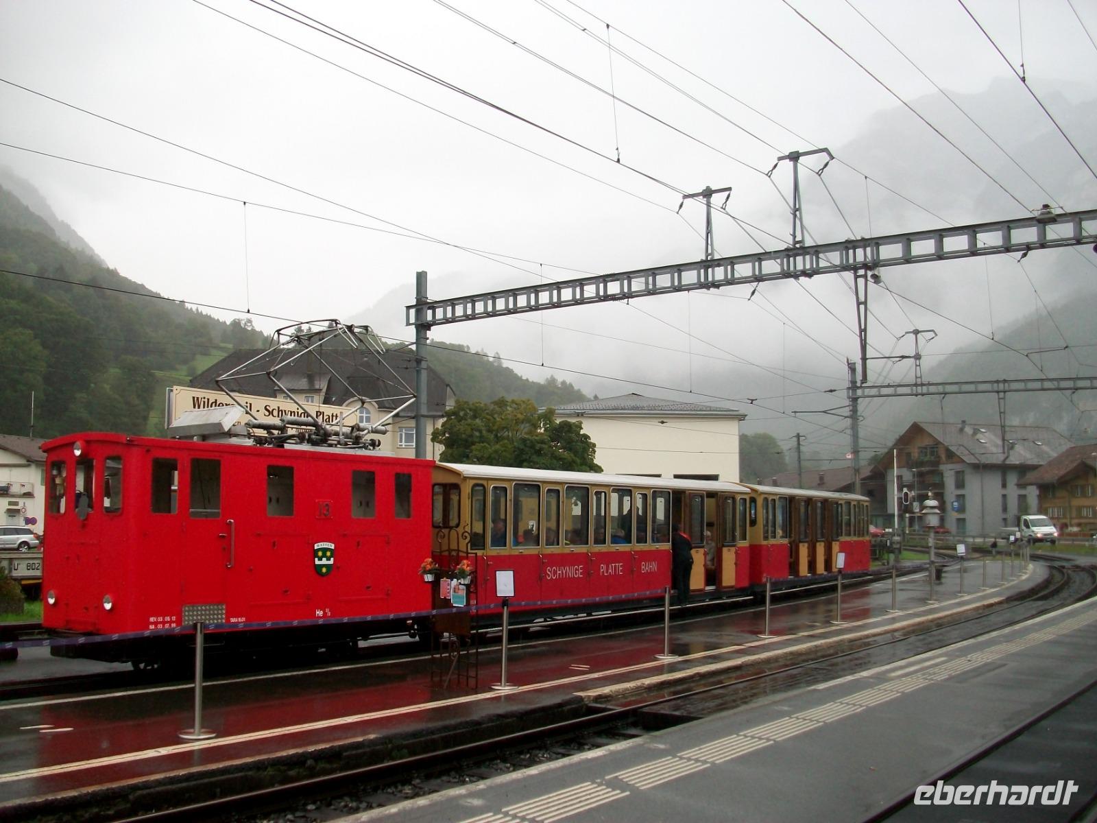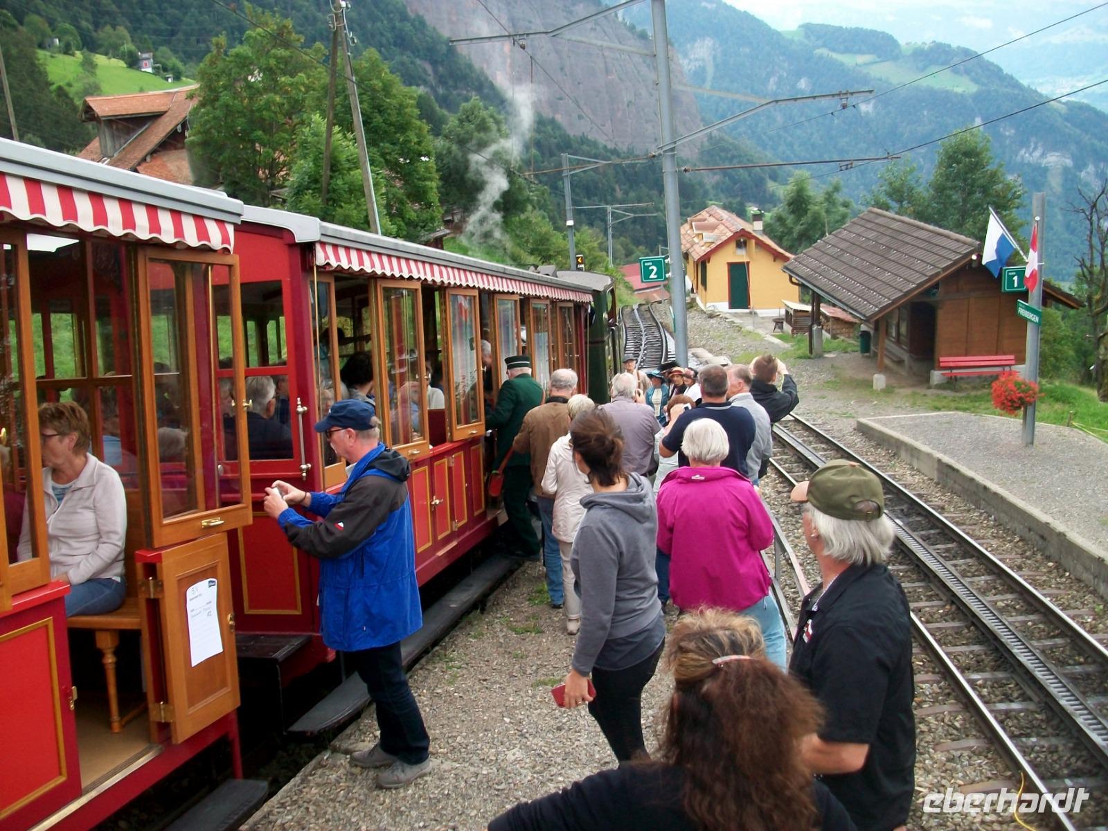 2.9.2019. Gestern Abend kam nun der schon angekündigte Wetterumschwung. Blitz und Donner brachten Regen und eine deutliche Abkühlung. Als wir uns heute auf den Weg machen, hängen dicke Wolken an den Bergen und die Straßen sind nass. Dennoch geht es noch einmal hinüber ins Berner Oberland; entlang des Brienzer Sees passieren wir Interlaken und langen im schönen Ort Widerswil an. Als wir am Bahnhof aussteigen müssen wir die Schirme aufspannen; hier überschreiten wir die Gleise um bald zur Zahnradbahn zu gelangen. Alles ist auch hier wie an den letzten Tagen perfekt für unsere Gruppe organisiert; historische Wagen in roter Farbe stehen bereit und wir nehmen auf den etwas harten Holzbänken Platz, alles eben ganz original.