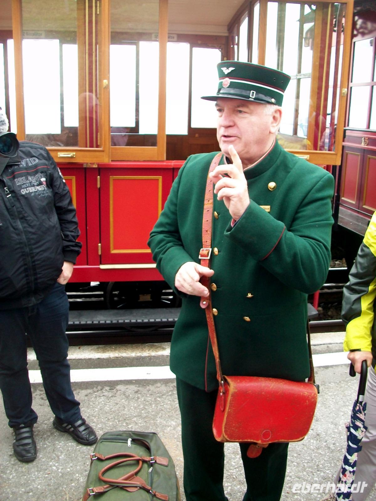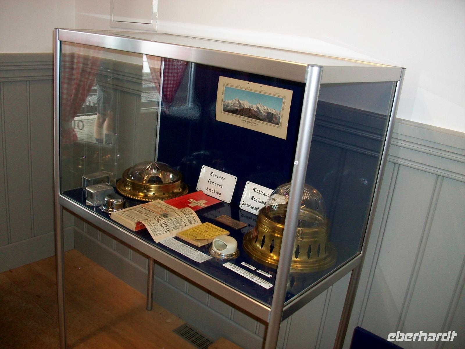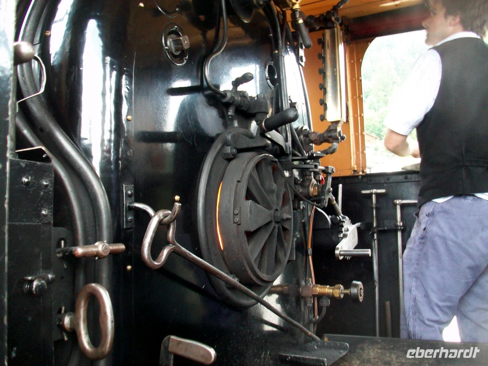 2.9.2019. Gestern Abend kam nun der schon angekündigte Wetterumschwung. Blitz und Donner brachten Regen und eine deutliche Abkühlung. Als wir uns heute auf den Weg machen, hängen dicke Wolken an den Bergen und die Straßen sind nass. Dennoch geht es noch einmal hinüber ins Berner Oberland; entlang des Brienzer Sees passieren wir Interlaken und langen im schönen Ort Widerswil an. Als wir am Bahnhof aussteigen müssen wir die Schirme aufspannen; hier überschreiten wir die Gleise um bald zur Zahnradbahn zu gelangen. Alles ist auch hier wie an den letzten Tagen perfekt für unsere Gruppe organisiert; historische Wagen in roter Farbe stehen bereit und wir nehmen auf den etwas harten Holzbänken Platz, alles eben ganz original.
