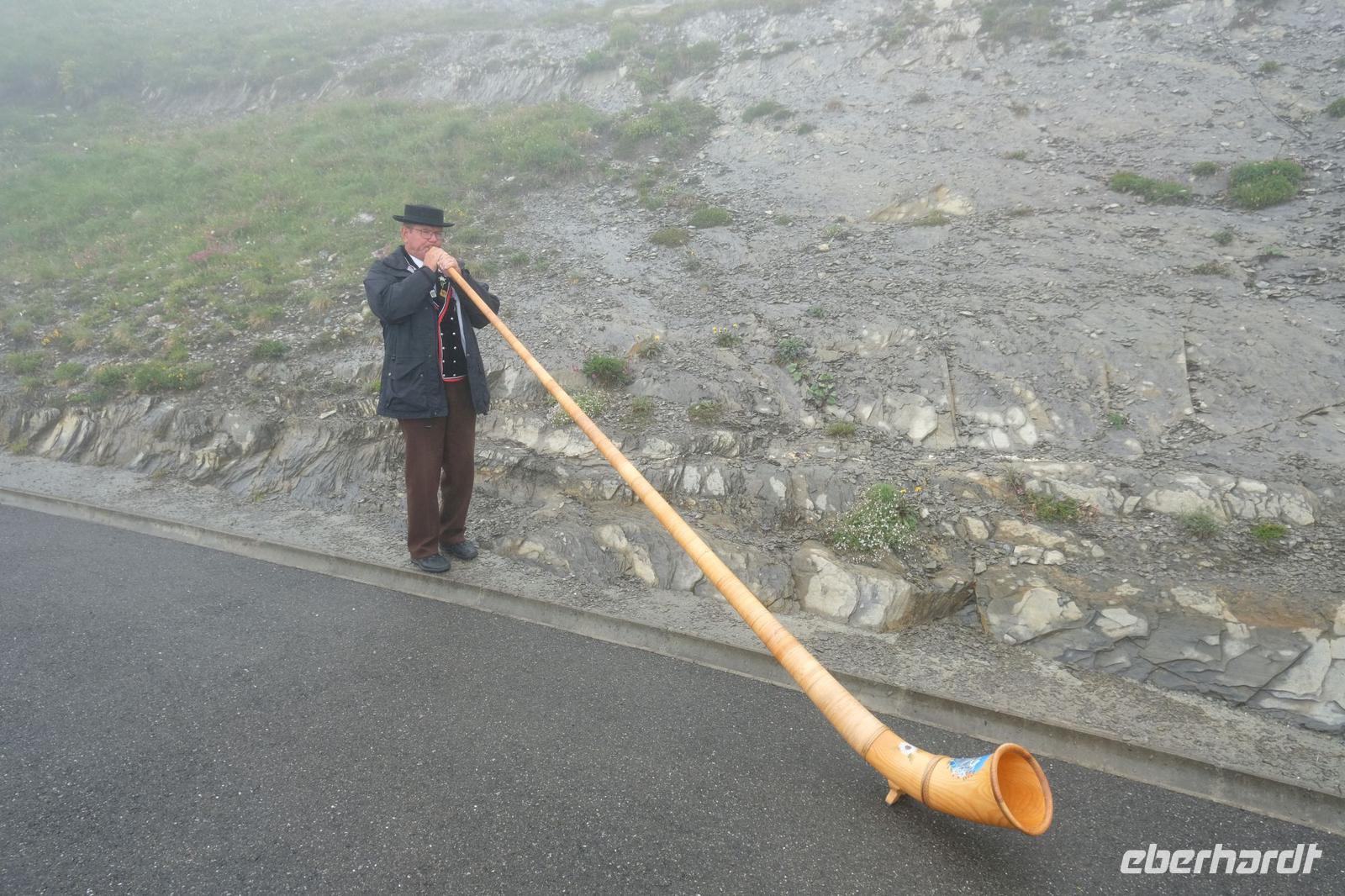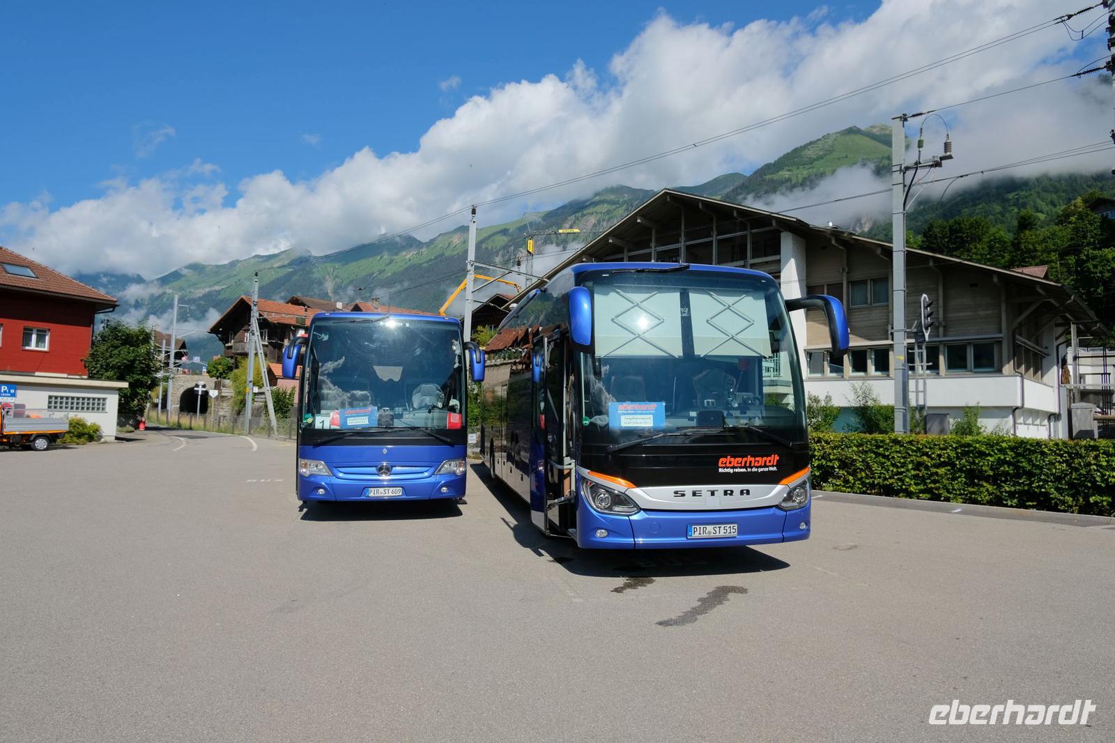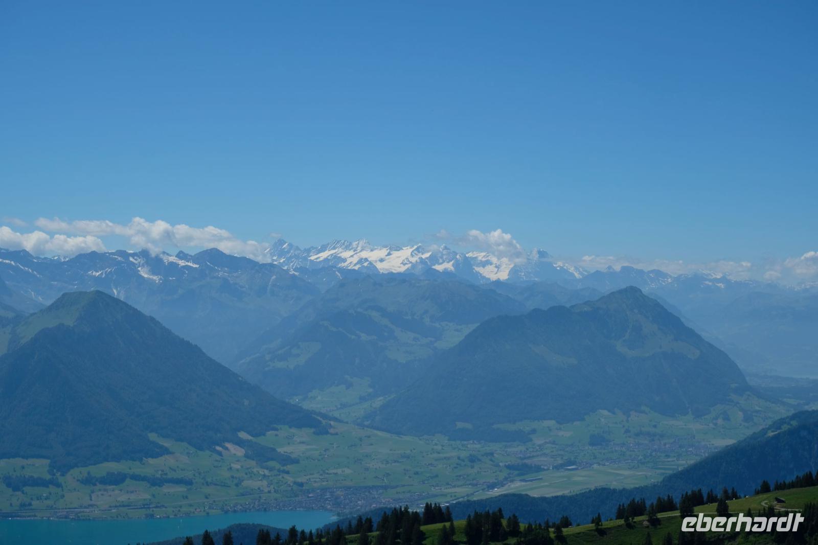 Unser heutiges Ziel war das Berner Oberland. Wir fuhren zunächst am Morgen nach Brienz, machten unterwegs einen Fotostopp am Lungener See. In Brienz wechselten wir das Beförderungsmittel und fuhren mit dem Zug auf das Brienzer Rothorn. Die Fahrt mit der berühmten Brienz-Rothorn-Bahn, auf das 2.350 Meter hohe Brienzer Rothorn, ist ein fantastisches Erlebnis. Die Zahnradbahn überwindet die 7,5 Kilometer lange Strecke in 55 Minuten über eine beeindruckende Fahrtstrecke. Unsere Fahrt führt über Brücken, Tunnel, Wälder sowie Wiesen. Auf über 2350 Metern Höhe erreichten wir die Gipfelstation. Auf dieser angekommen, führte unser Weg ins Bergrestaurant. Hier wartete eine kleine Überraschung von Eberhardt-Travel auf unsere Gäste. Wir probierten das typische Alpengericht Älplermagronen. Uns wurde ein Teller mit Teigwaren, Kartoffeln, Rahm, Käsesauce und gerösteten Zwiebeln und Apfelmus serviert. Das schmeckte schon sehr gut. Für viele etwas ungewohnt aber durchaus lecker. Und woher kommt dieser Name? Älpler, das sind die Bewohner der Alpen und die Magronen leiten sich von den italienischen Makkaroni ab. Eine Suppe und ein Dessert rundeten das köstliche Menü ab.