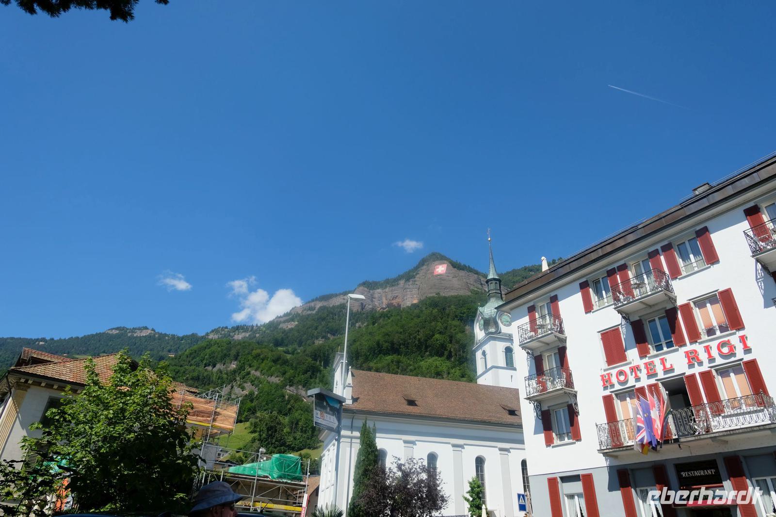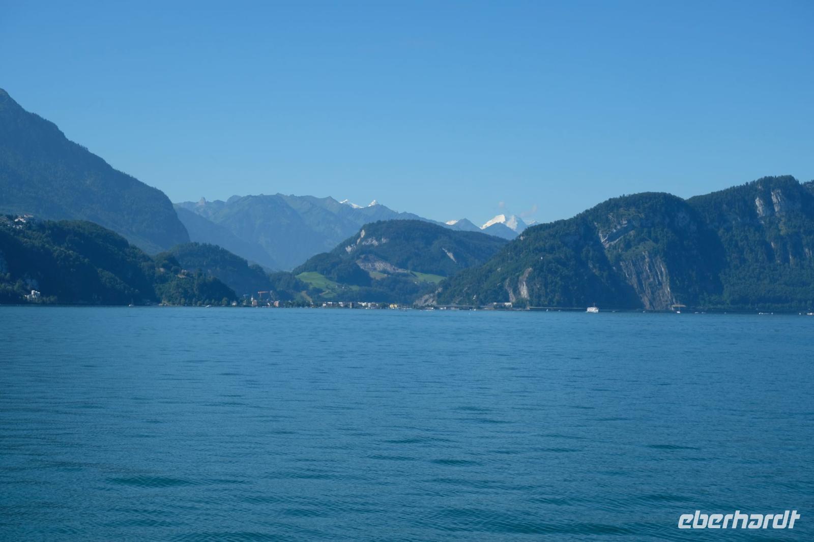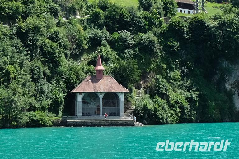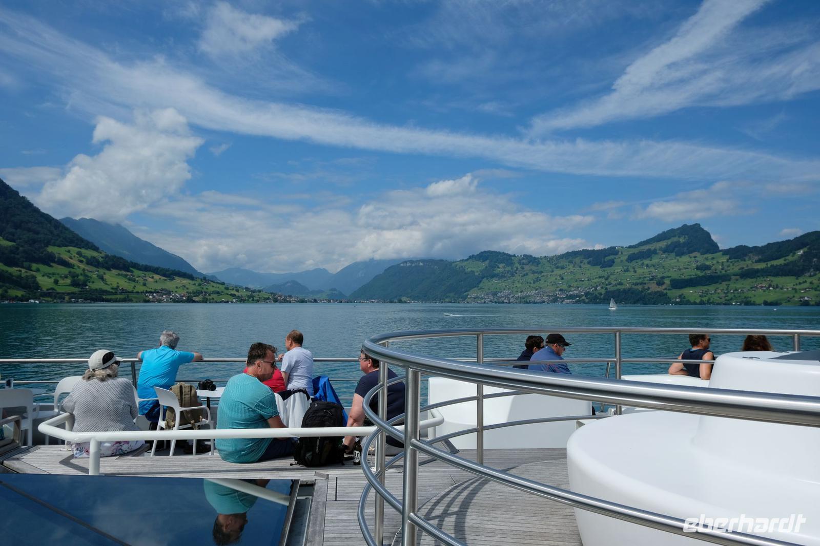 Zunächst fuhren wir wieder bei Sonnenschein nach Luzern. Von hier aus ging es mit dem nostalgischen Raddampfer „Uri" über den sonnenüberfluteten Vierwaldstätter See bis Vitznau. Vom Wasser aus bestaunten wir das Bergpanorama um uns. Gut zu sehen waren die Rigi, der Pilatus, das Stanserhorn sowie der Bürgenstock. In Vitznau stiegen wir um in die Vitznau-Rigi-Bahn und erklommen die Königin der Berge. Der historische Zug windet sich mit der Dampflok ganz gemächlich durch Wälder und Wiesen und bringt uns auf die Rigi in 1.800 m Höhe. Wir konnten eine fantastische Sicht auf die Zentralschweizer Seen und die Berge der Berner Alpen geniesen. Nach dem wir den Ausblick ausgiebig in uns aufgenommen hatten, fuhren wir mit dem elektrisierten Zug über Rigi-Staffelhöhe und Rigi-Kaltbad zurück nach Vitznau. Die Busrückfahrt erfolgte immer entlang des Seeufers bis nach Küssnacht. Hier begaben wir uns auf die Spuren von Wilhelm Tell und legten einen kleinen Zwischenstopp an der Hohlen Gasse ein. Weiter entlang des Sees hielten wir nochmals kurz an der Astrid-Kapelle und erreichten Luzern. Im Hotel wartete wieder ein schmackhaftes Abendessen auf uns.