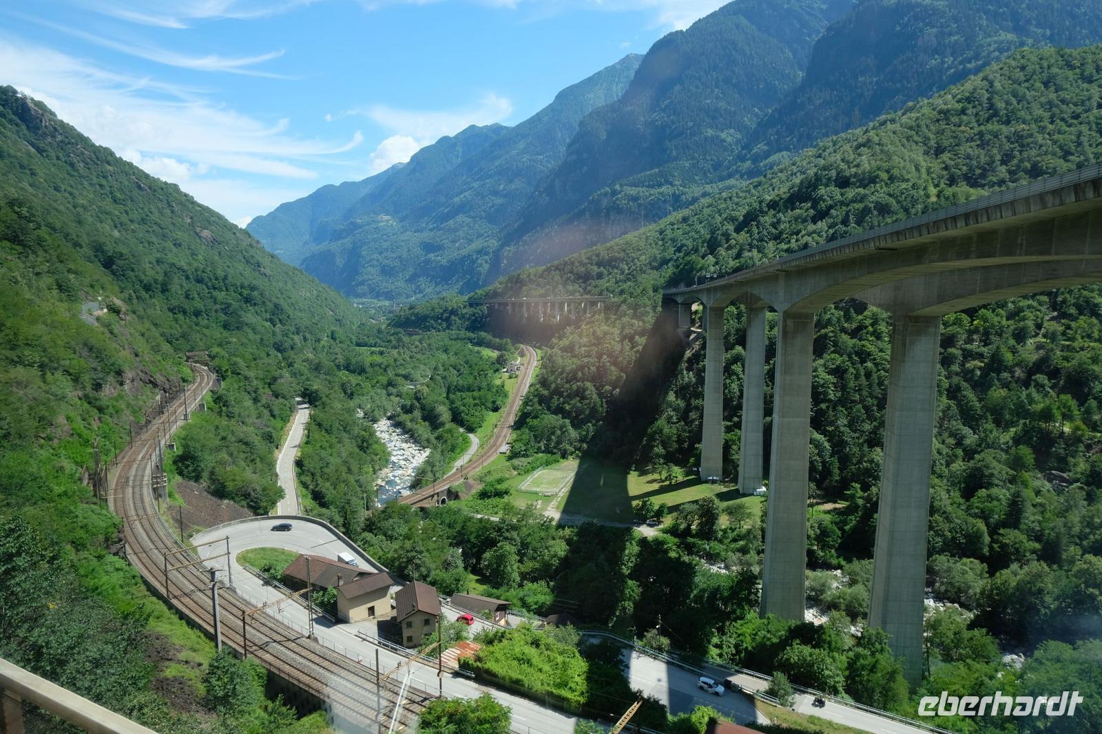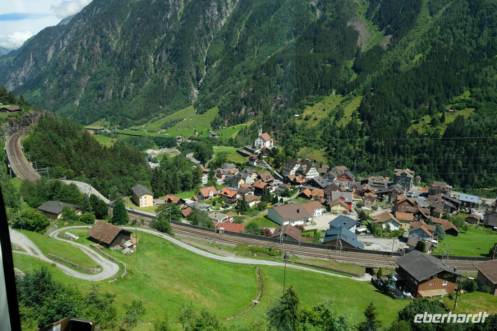 Und los ging es auf einer der schönsten Eisenbahnstrecken der Welt. Aus unserem exquisiten Panoramawagen bemerkten wir die Nordrampe der Gotthardbahnstrecke und dann die beeindruckenden Kehrtunnel auf der Strecke in den Kanton Tessin. Dabei sahen wir die auf einer Anhöhe thronende Kirche von Wassen dreimal. Nachdem wir dann in Bellinzona der Hauptstadt des Kantons Tessin angekommen waren, hatten wir nur einen kurzen Aufenthalt. Auf unserer Fahrt zurück fuhren wir mit der Bahn durch den längsten Eisenbahntunnel der Welt. Die Fahrt durch den 57 km langen Tunnel dauerte genau 18 min. Beeindruckend ist die Geschwindigkeit mit ca. 170 km/h. Damit waren wir schnell in Art Goldau zwischen Zuger- und Lauerzer See. Hier erwarteten uns bereits unsere Busfahrer und zurück ging es ins Hotel zum schmackhaften Abendessen.