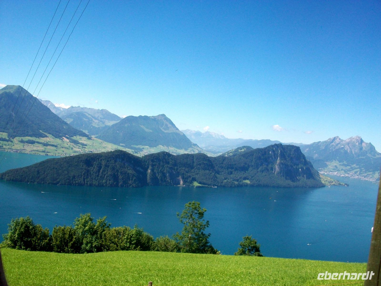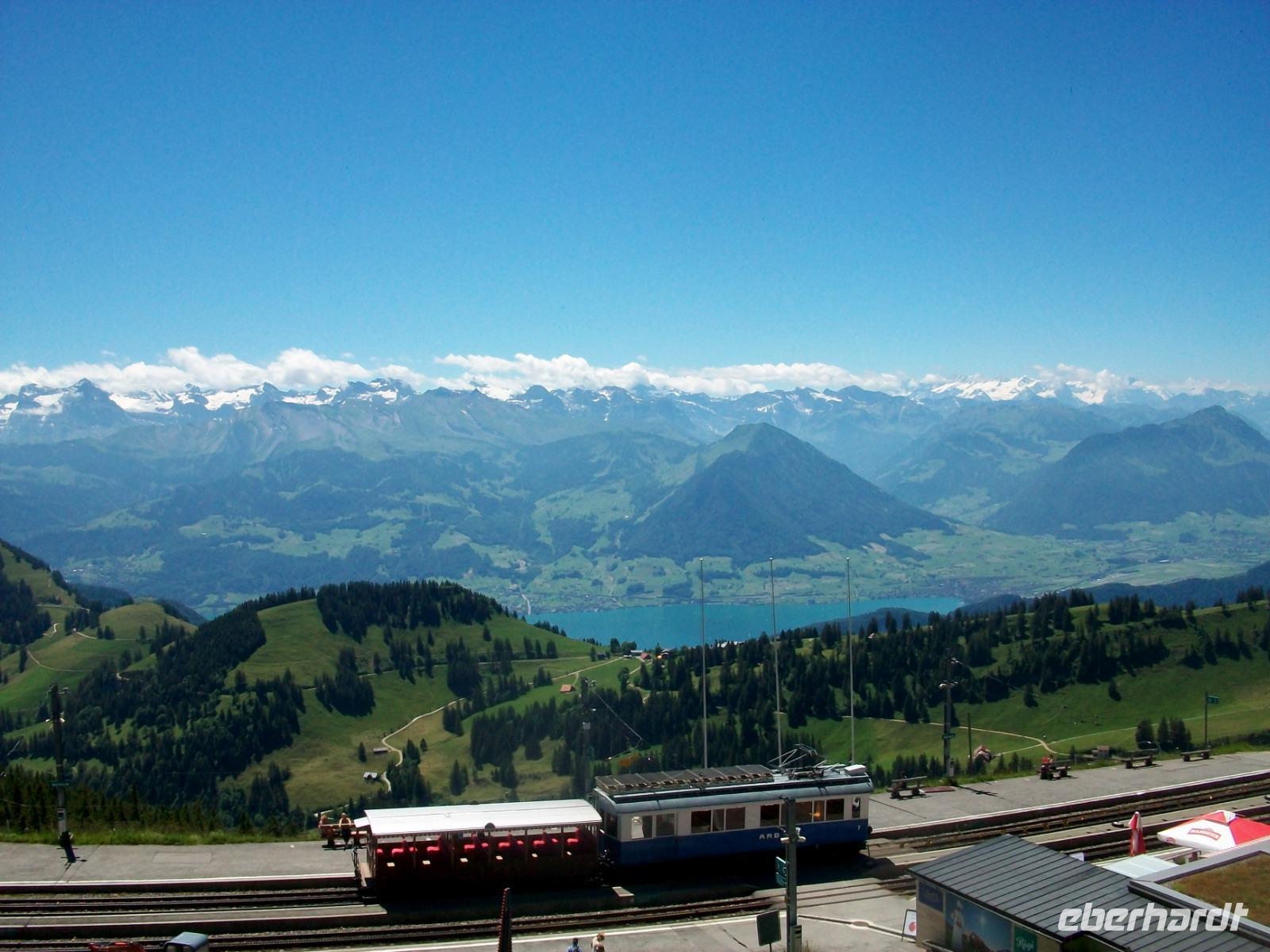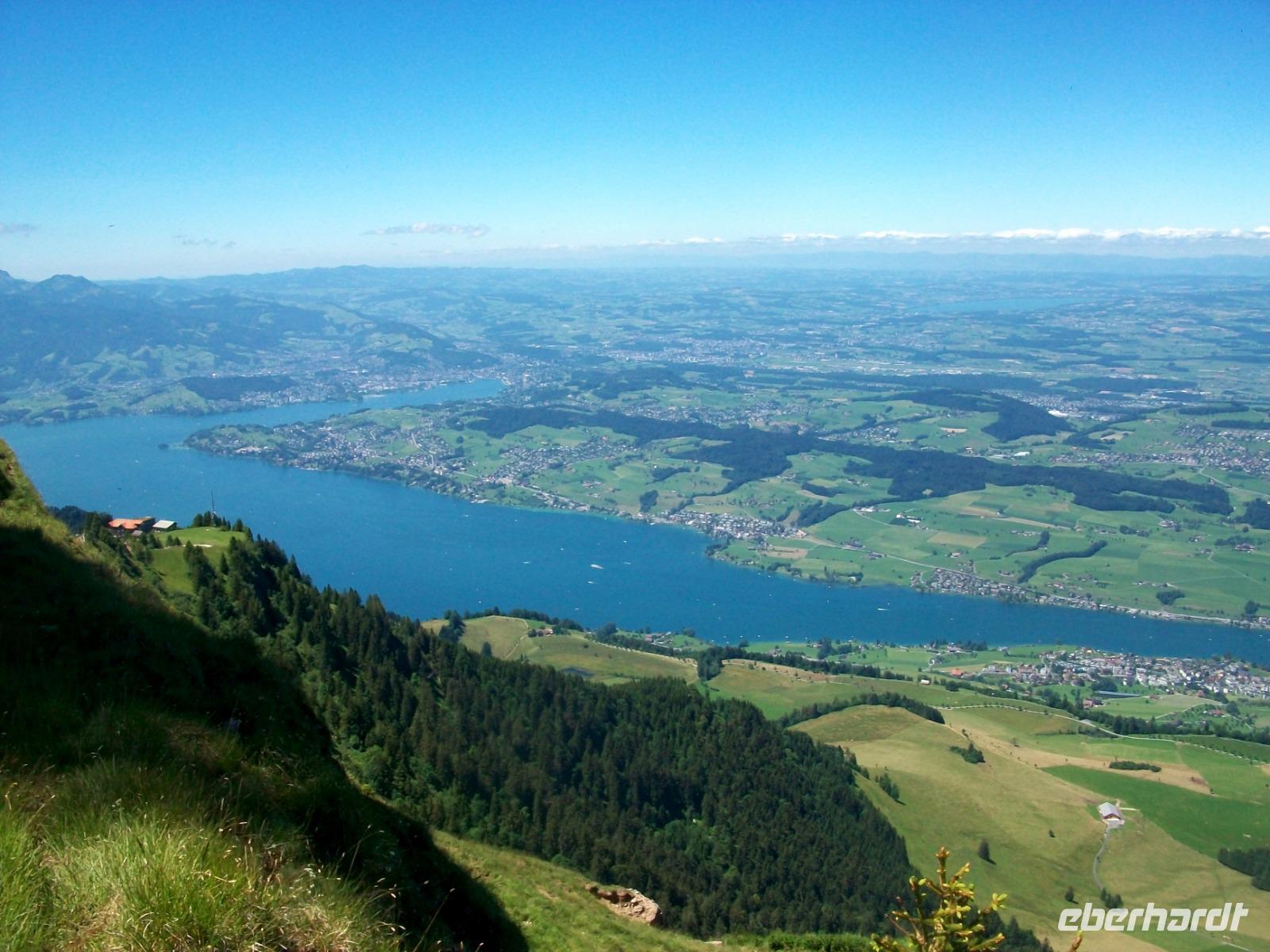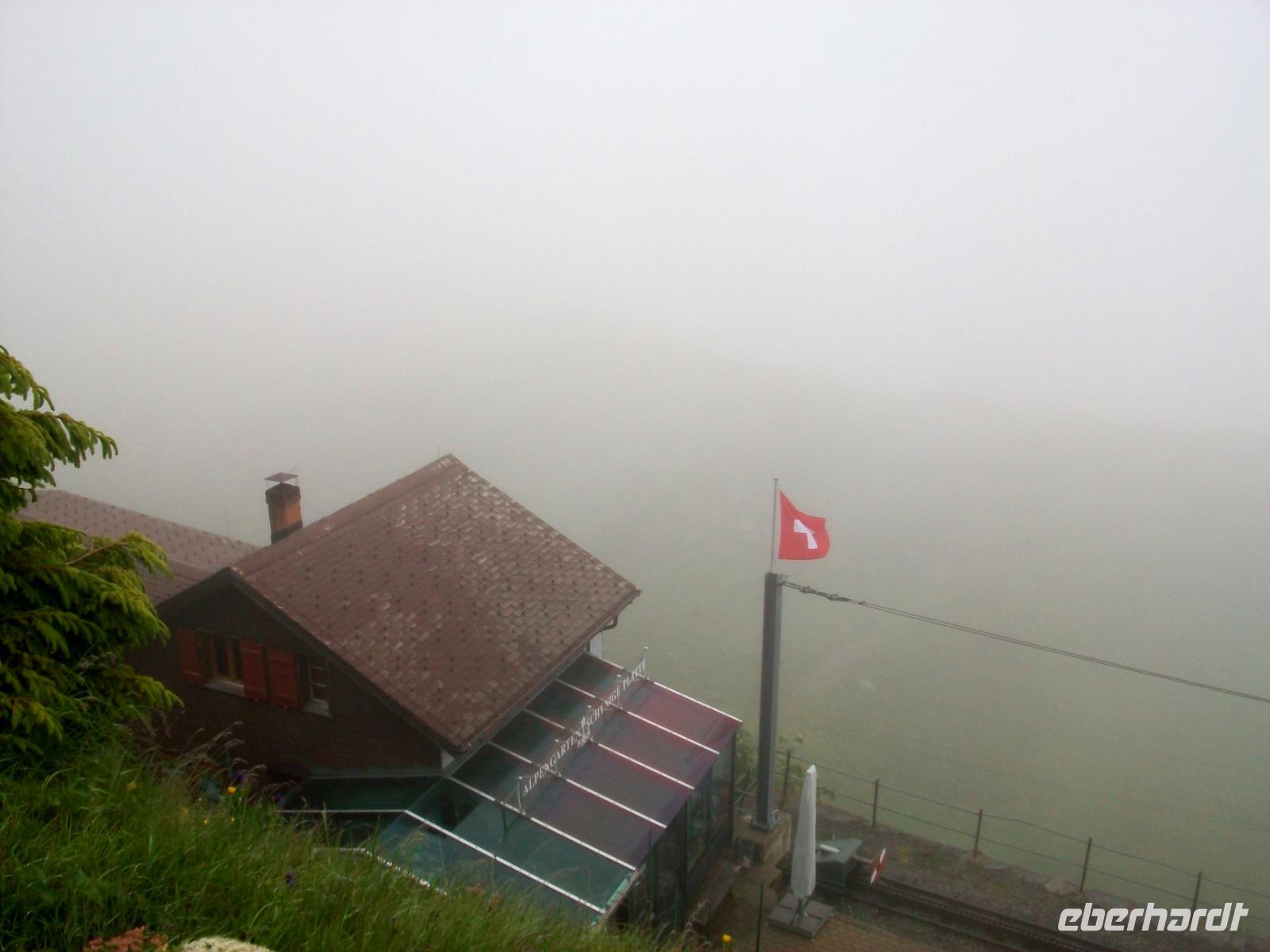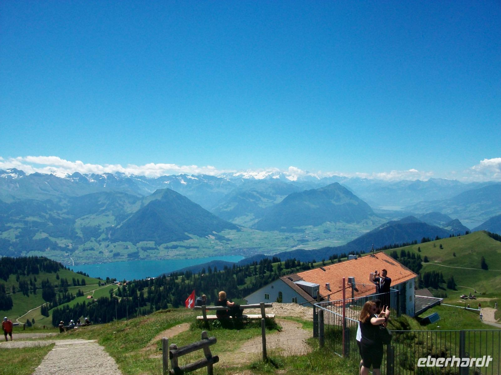 Heute genießen wir die Fahrt mit dem historischen Raddampfer der uns im Inneren einen Teil seiner beeindruckenden Antriebstechnik zeigt. Gemütlich schippern wir eine runde Stunde über den Vierwaldstättersee bis nach Vitznau. Noch bevor wir anlegen deutet dunkler Rauch das Erlebnis an welches uns nun erwartet. Angetrieben mit Sibirischer Steinkohle soll es empor zur Rigi gehen, dem königlichen Berg den schon viel Prominenz vor uns besuchte. Wir müssen durch etwas Andrang unseren Weg hin zu den für uns reservieren Plätzen bahnen, behilflich dabei ist ein sympathischer Mitarbeiter der uns auf der Fahrt hinauf mit wissenswerten Informationen versorgen wird. Nun werden wir, angetrieben von der Dampflok, auch ordentlich durchgerüttelt, aber das bringt diese besondere Romantik nun einmal mit sich. Bald genießen wir einen umwerfenden Blick auf den Vierwaldstättersee, wir steigen unaufhörlich bergan, müssen aber unterwegs Wasser fassen, denn die Lok braucht bis hinauf enorme 2 000 Liter! Bald erscheint zu unserer Linken eine weitere atemberaubende Kulisse; flaches Land dehnt sich bis zum Horizont und wir sehen aus der Vogelperspektive hinunter zu den Seen, kleinen Wäldern und zahlreichen Feldern. Als wir oben am Kulm anlagen, treiben leichte Wolkengespinste aus dem Tal hinauf die sich aber schnell auflösen und den Blick auf die grandiose Bergkulisse wieder freigeben. Der freundliche Mitarbeiter der Bahn gibt uns in sehr origineller und typisch Schweizer Art noch einige Infos mit auf den Weg und nun kann die Entdeckung der Rigi beginnen. Nur wenige Höhenmeter hinauf und wir sind am Fuße des mächtigen Funkturmes angelangt und können von hier oben den Blick weit schweifen lassen. Gleich zu unseren Füßen ist der Zuger See zu sehen, etwas weiter links davon ein Zipfel des Vierwaldstättersees an dessen Ende Küssnacht liegt, eine Sehenswürdigkeit in der Nähe dieser Stadt werden wir dann noch auf der Heimfahrt besuchen. Im Rücken die schroffen Berge, vor uns flacheres Land und im elegante Flug schwärmen die Bergdohlen um uns her, Augenblicke die man nicht vergisst!