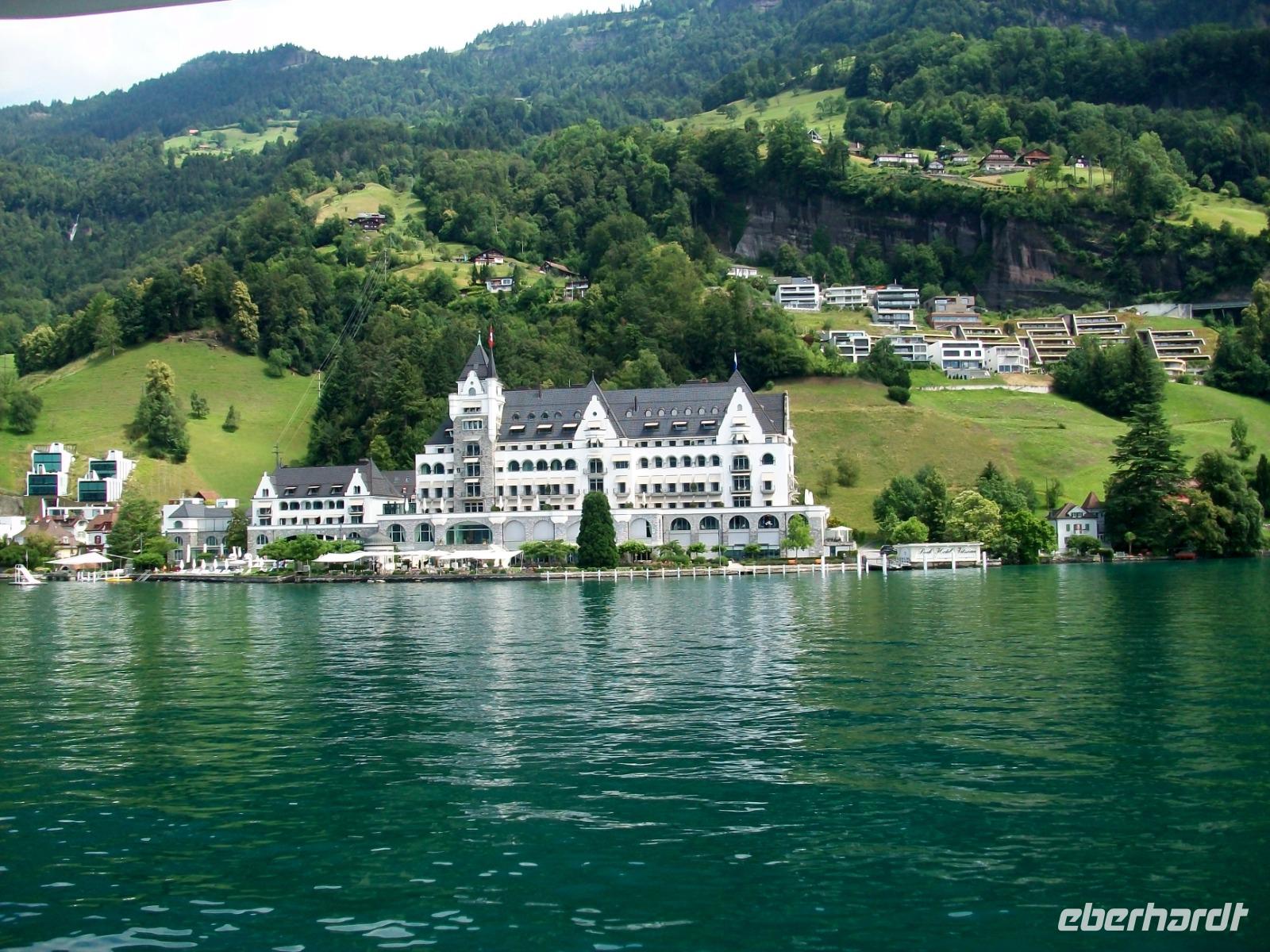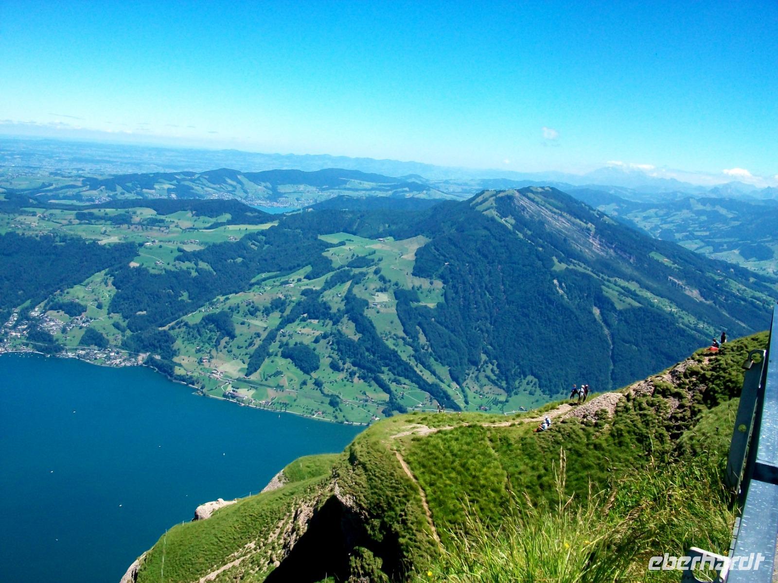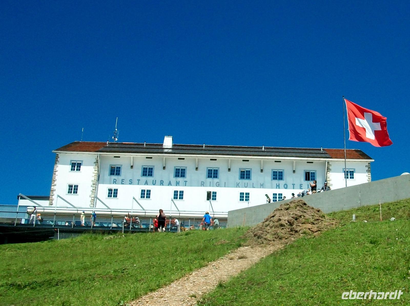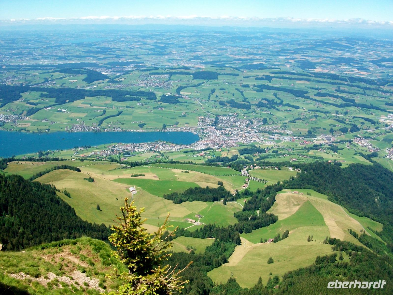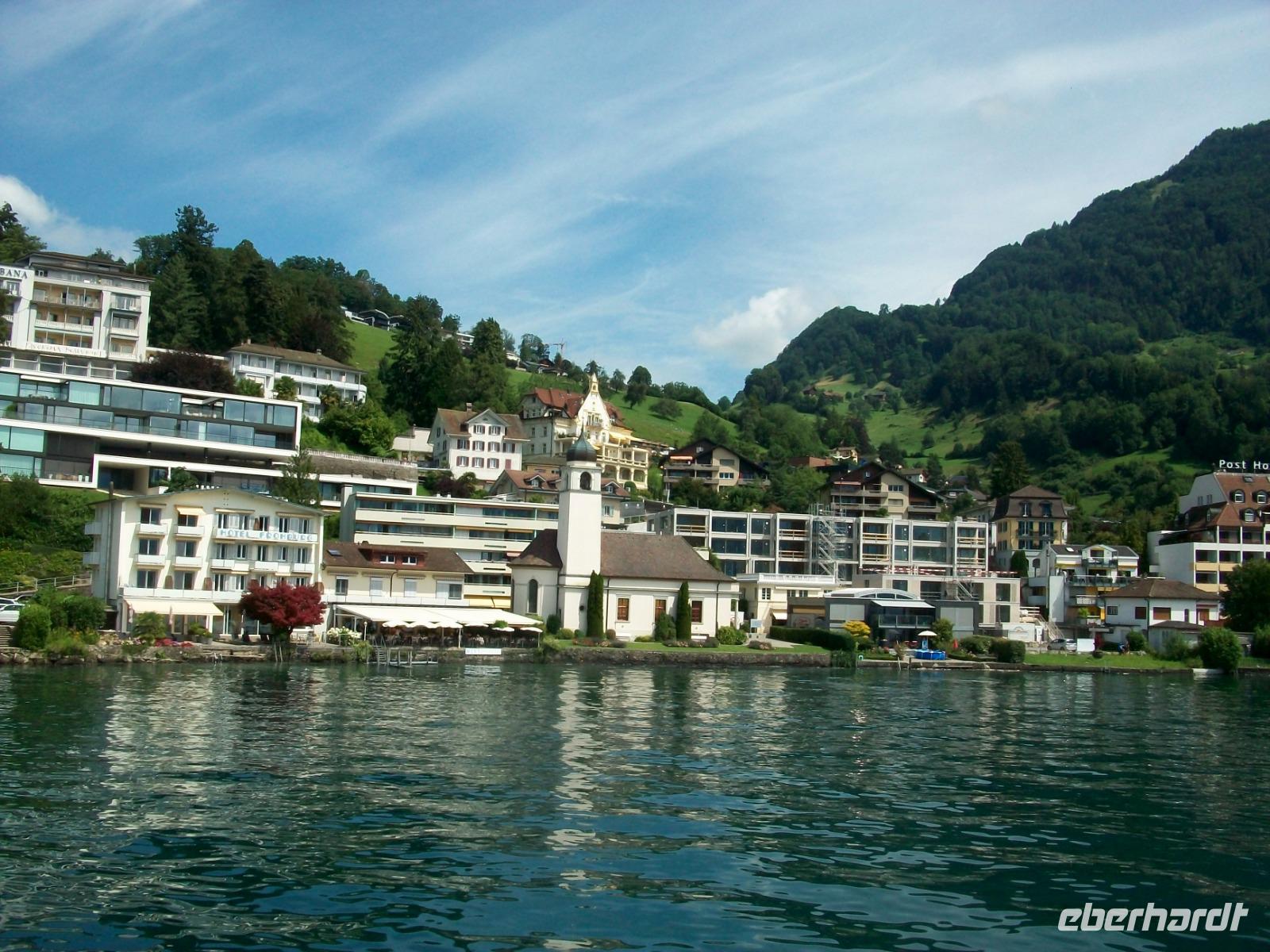 Heute genießen wir die Fahrt mit dem historischen Raddampfer der uns im Inneren einen Teil seiner beeindruckenden Antriebstechnik zeigt. Gemütlich schippern wir eine runde Stunde über den Vierwaldstättersee bis nach Vitznau. Noch bevor wir anlegen deutet dunkler Rauch das Erlebnis an welches uns nun erwartet. Angetrieben mit Sibirischer Steinkohle soll es empor zur Rigi gehen, dem königlichen Berg den schon viel Prominenz vor uns besuchte. Wir müssen durch etwas Andrang unseren Weg hin zu den für uns reservieren Plätzen bahnen, behilflich dabei ist ein sympathischer Mitarbeiter der uns auf der Fahrt hinauf mit wissenswerten Informationen versorgen wird. Nun werden wir, angetrieben von der Dampflok, auch ordentlich durchgerüttelt, aber das bringt diese besondere Romantik nun einmal mit sich. Bald genießen wir einen umwerfenden Blick auf den Vierwaldstättersee, wir steigen unaufhörlich bergan, müssen aber unterwegs Wasser fassen, denn die Lok braucht bis hinauf enorme 2 000 Liter! Bald erscheint zu unserer Linken eine weitere atemberaubende Kulisse; flaches Land dehnt sich bis zum Horizont und wir sehen aus der Vogelperspektive hinunter zu den Seen, kleinen Wäldern und zahlreichen Feldern. Als wir oben am Kulm anlagen, treiben leichte Wolkengespinste aus dem Tal hinauf die sich aber schnell auflösen und den Blick auf die grandiose Bergkulisse wieder freigeben. Der freundliche Mitarbeiter der Bahn gibt uns in sehr origineller und typisch Schweizer Art noch einige Infos mit auf den Weg und nun kann die Entdeckung der Rigi beginnen. Nur wenige Höhenmeter hinauf und wir sind am Fuße des mächtigen Funkturmes angelangt und können von hier oben den Blick weit schweifen lassen. Gleich zu unseren Füßen ist der Zuger See zu sehen, etwas weiter links davon ein Zipfel des Vierwaldstättersees an dessen Ende Küssnacht liegt, eine Sehenswürdigkeit in der Nähe dieser Stadt werden wir dann noch auf der Heimfahrt besuchen. Im Rücken die schroffen Berge, vor uns flacheres Land und im elegante Flug schwärmen die Bergdohlen um uns her, Augenblicke die man nicht vergisst!