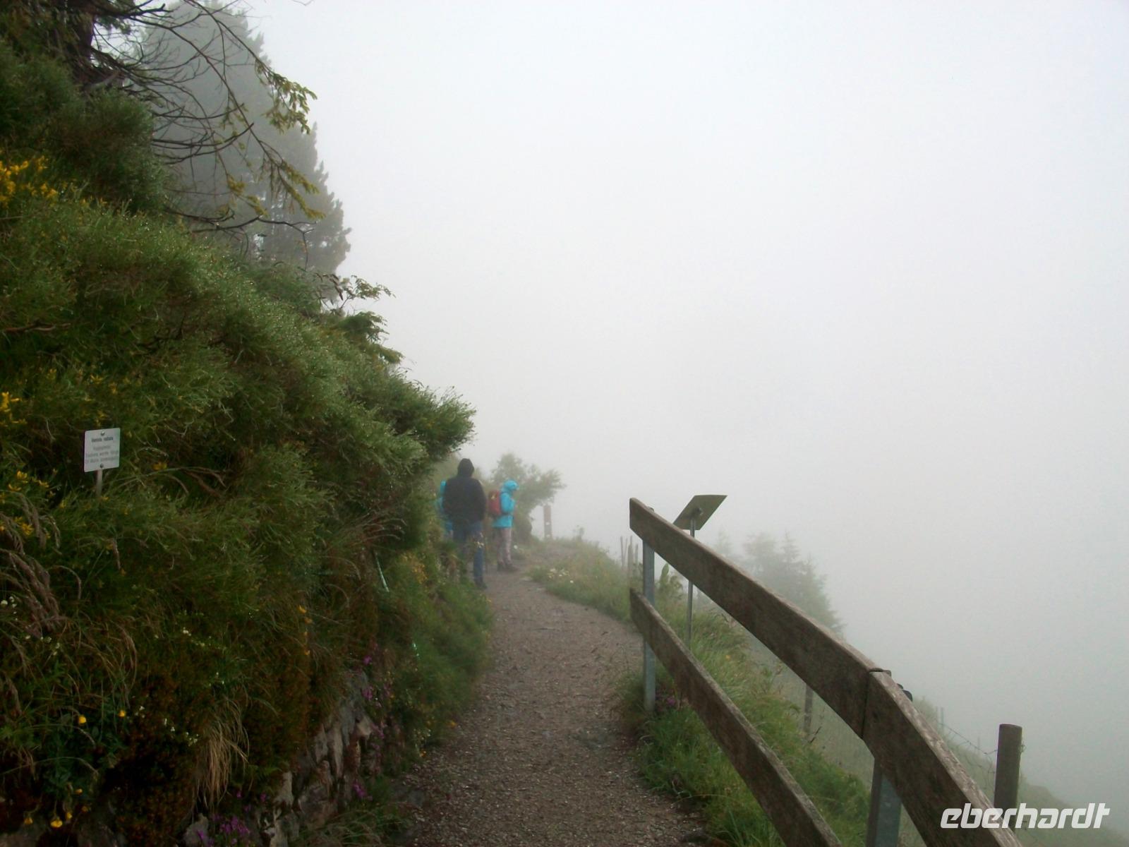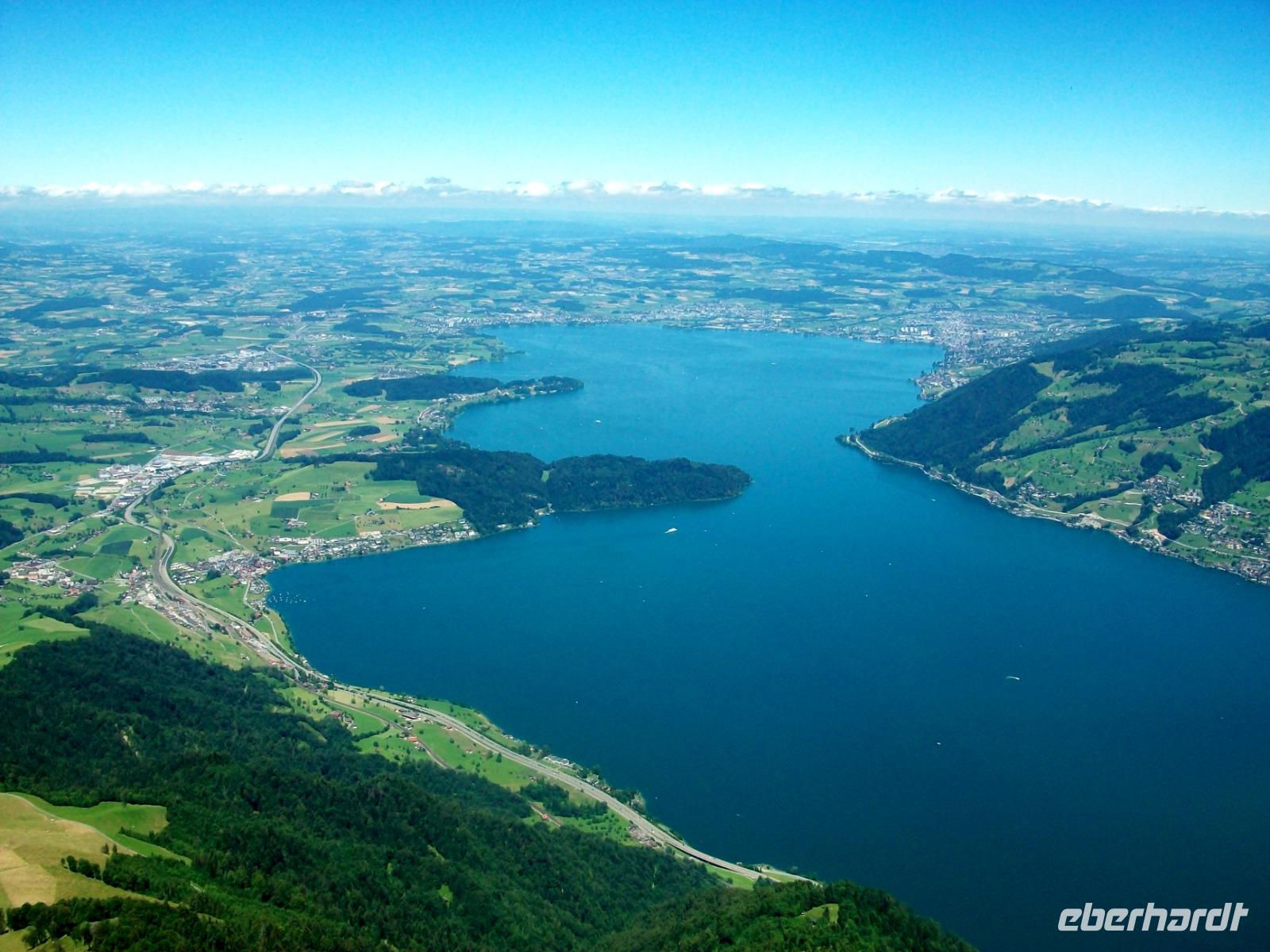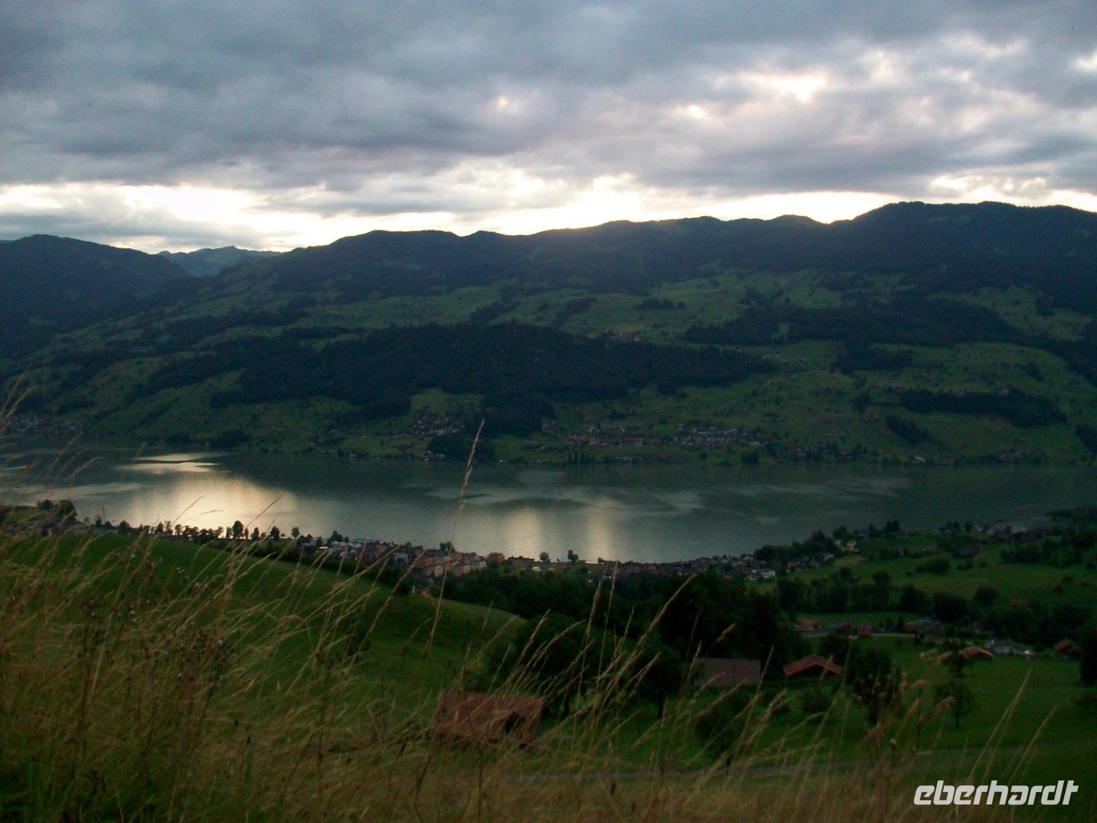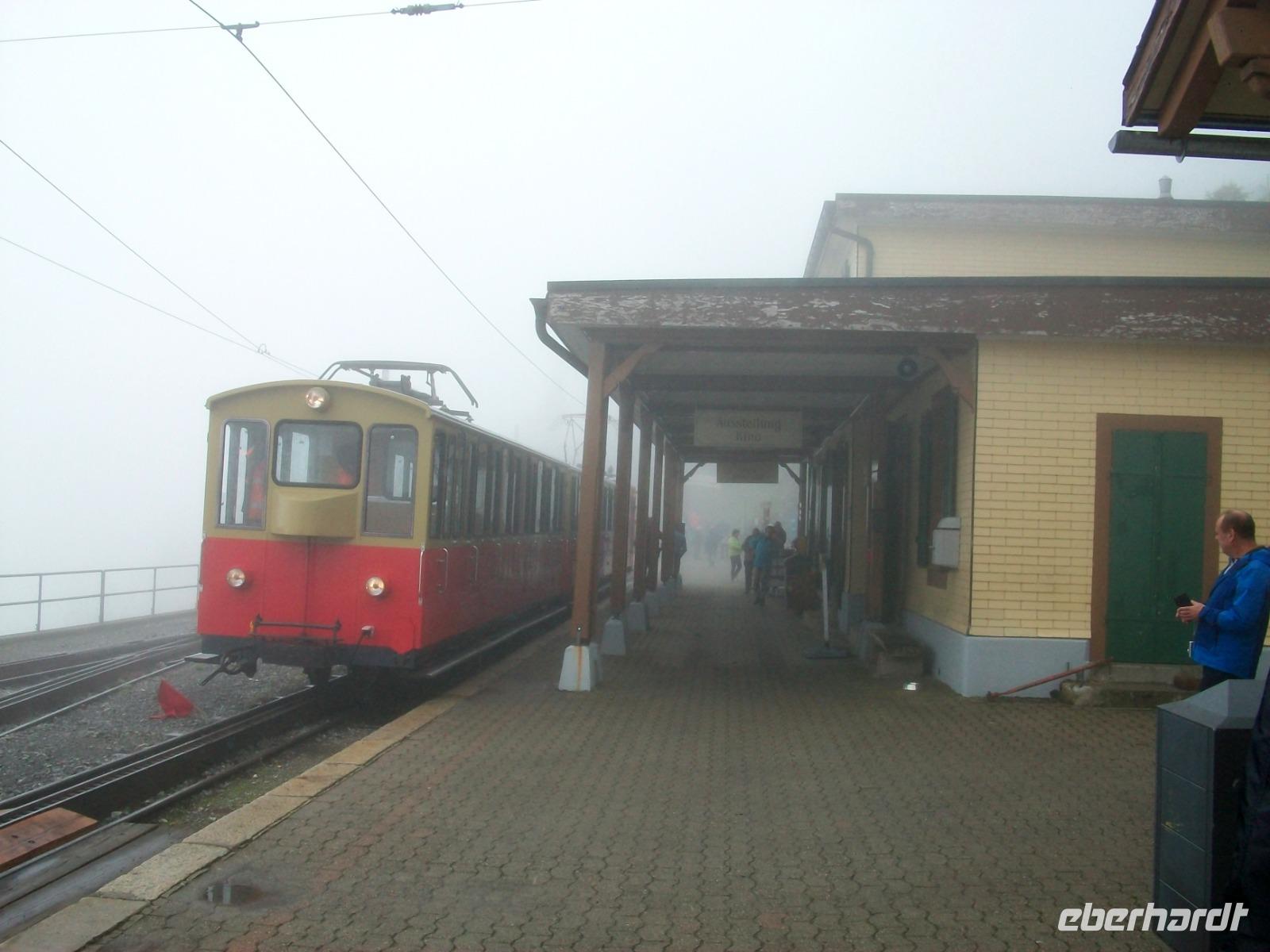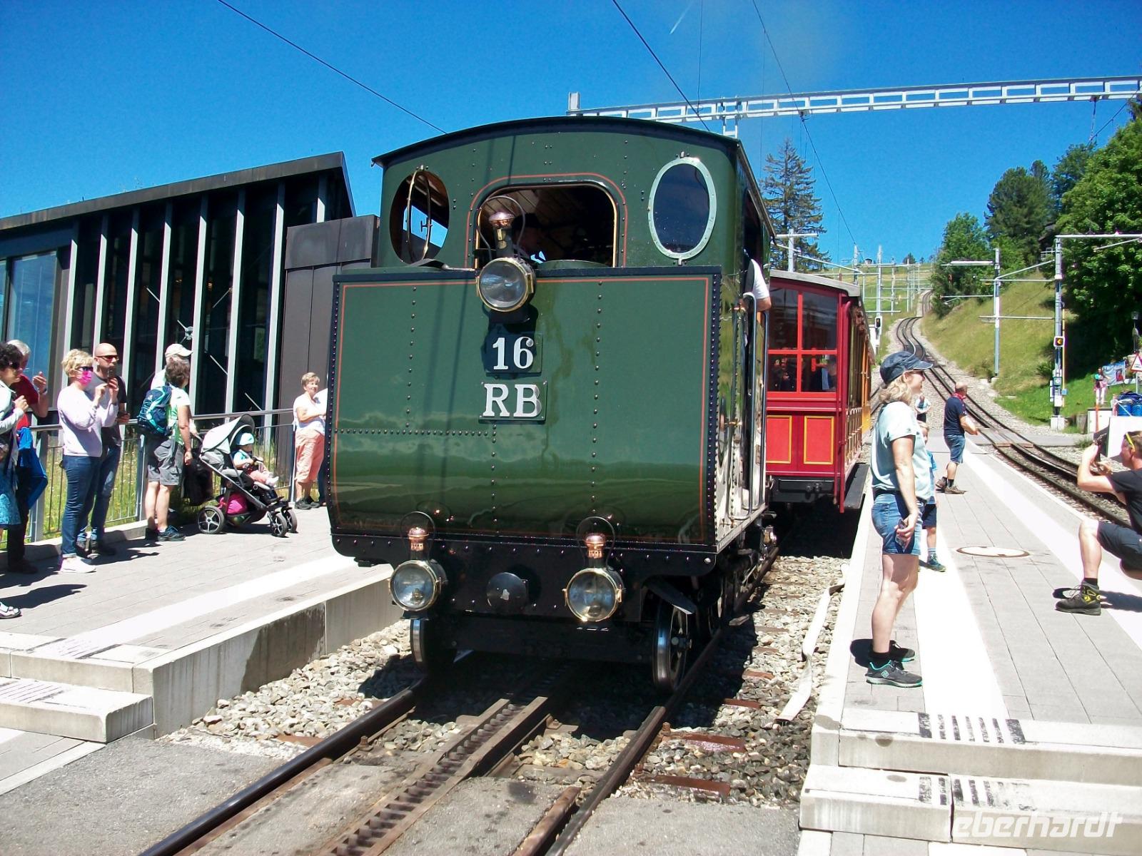 Heute genießen wir die Fahrt mit dem historischen Raddampfer der uns im Inneren einen Teil seiner beeindruckenden Antriebstechnik zeigt. Gemütlich schippern wir eine runde Stunde über den Vierwaldstättersee bis nach Vitznau. Noch bevor wir anlegen deutet dunkler Rauch das Erlebnis an welches uns nun erwartet. Angetrieben mit Sibirischer Steinkohle soll es empor zur Rigi gehen, dem königlichen Berg den schon viel Prominenz vor uns besuchte. Wir müssen durch etwas Andrang unseren Weg hin zu den für uns reservieren Plätzen bahnen, behilflich dabei ist ein sympathischer Mitarbeiter der uns auf der Fahrt hinauf mit wissenswerten Informationen versorgen wird. Nun werden wir, angetrieben von der Dampflok, auch ordentlich durchgerüttelt, aber das bringt diese besondere Romantik nun einmal mit sich. Bald genießen wir einen umwerfenden Blick auf den Vierwaldstättersee, wir steigen unaufhörlich bergan, müssen aber unterwegs Wasser fassen, denn die Lok braucht bis hinauf enorme 2 000 Liter! Bald erscheint zu unserer Linken eine weitere atemberaubende Kulisse; flaches Land dehnt sich bis zum Horizont und wir sehen aus der Vogelperspektive hinunter zu den Seen, kleinen Wäldern und zahlreichen Feldern. Als wir oben am Kulm anlagen, treiben leichte Wolkengespinste aus dem Tal hinauf die sich aber schnell auflösen und den Blick auf die grandiose Bergkulisse wieder freigeben. Der freundliche Mitarbeiter der Bahn gibt uns in sehr origineller und typisch Schweizer Art noch einige Infos mit auf den Weg und nun kann die Entdeckung der Rigi beginnen. Nur wenige Höhenmeter hinauf und wir sind am Fuße des mächtigen Funkturmes angelangt und können von hier oben den Blick weit schweifen lassen. Gleich zu unseren Füßen ist der Zuger See zu sehen, etwas weiter links davon ein Zipfel des Vierwaldstättersees an dessen Ende Küssnacht liegt, eine Sehenswürdigkeit in der Nähe dieser Stadt werden wir dann noch auf der Heimfahrt besuchen. Im Rücken die schroffen Berge, vor uns flacheres Land und im elegante Flug schwärmen die Bergdohlen um uns her, Augenblicke die man nicht vergisst!