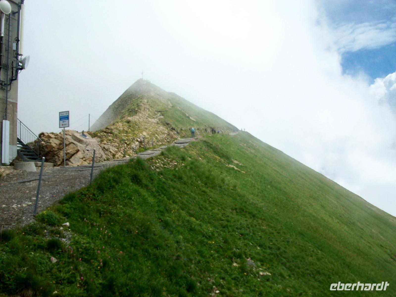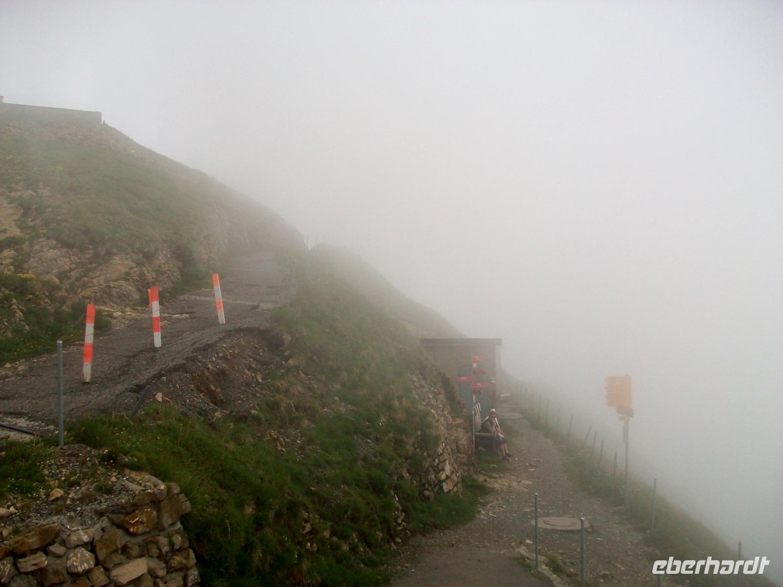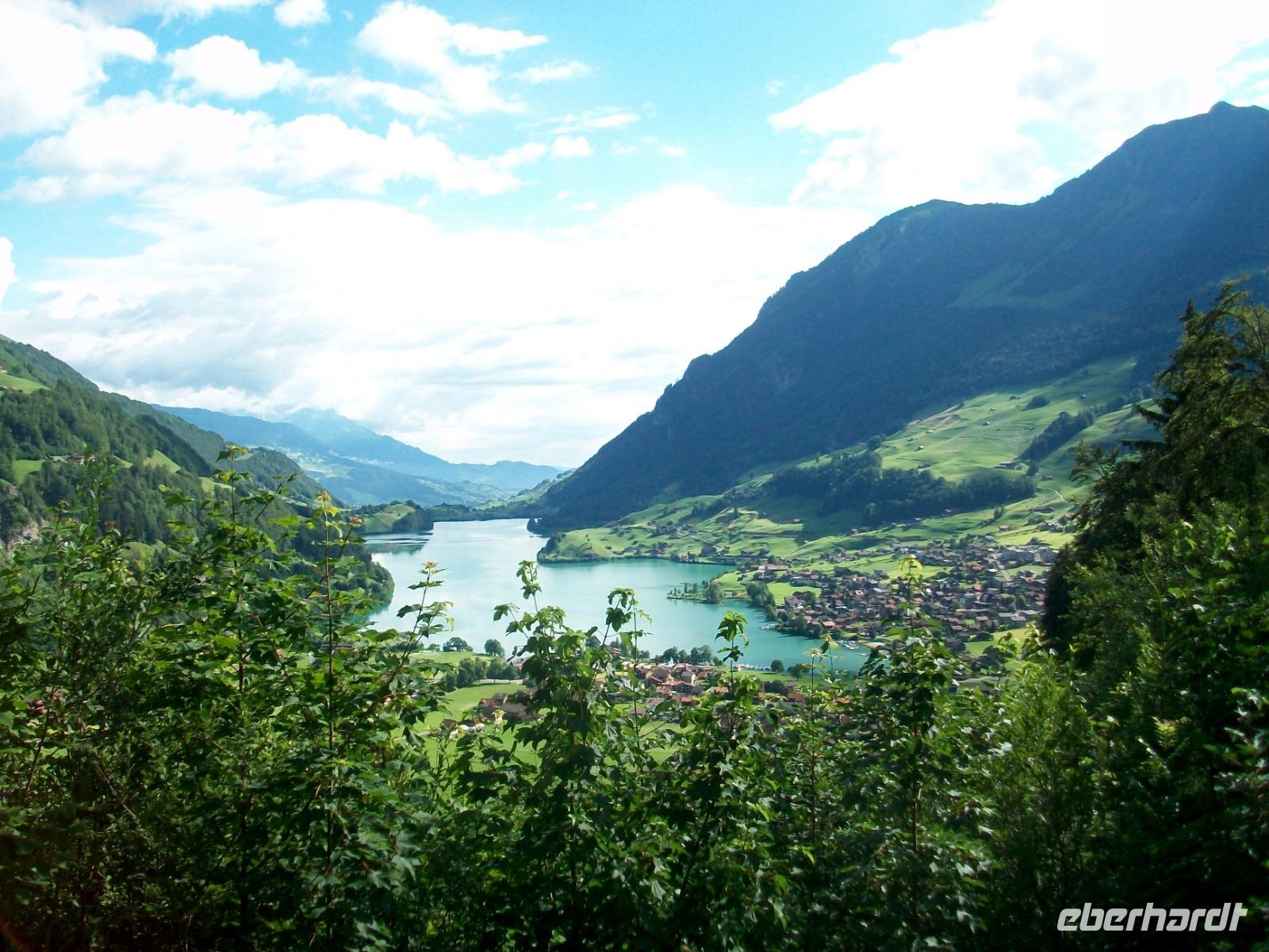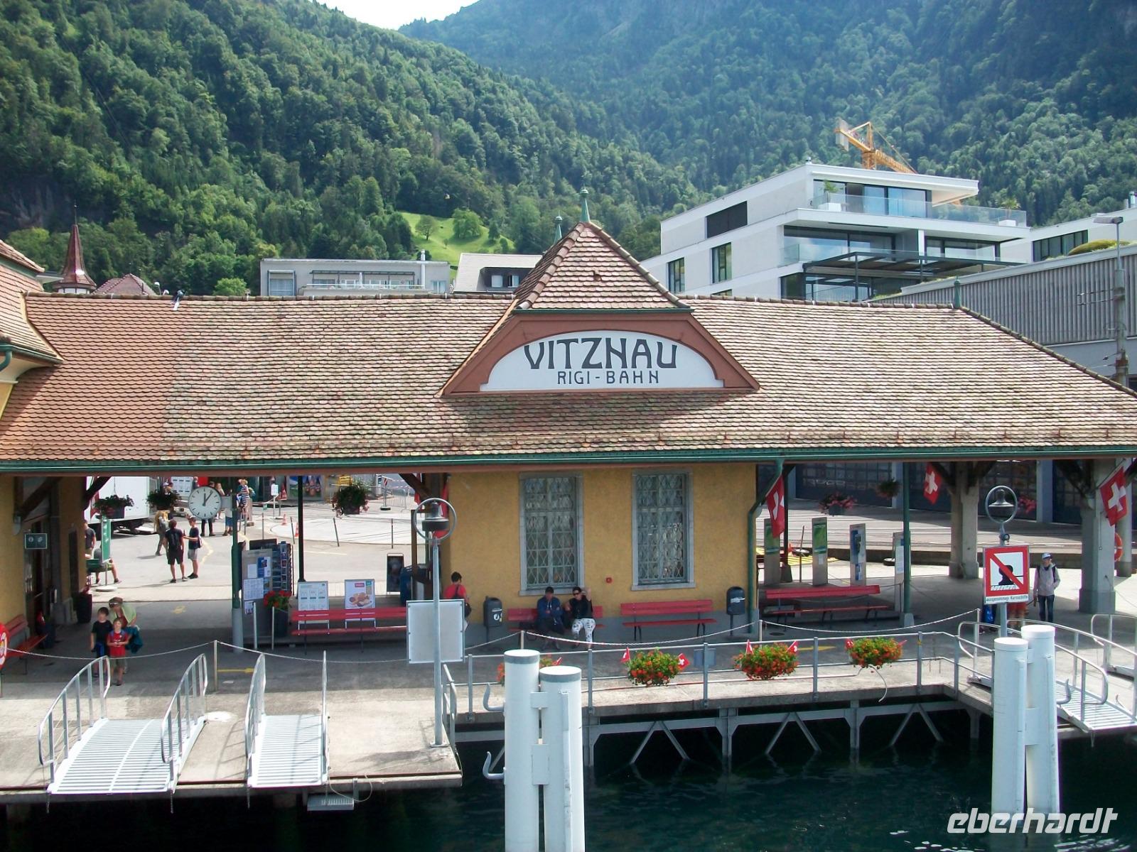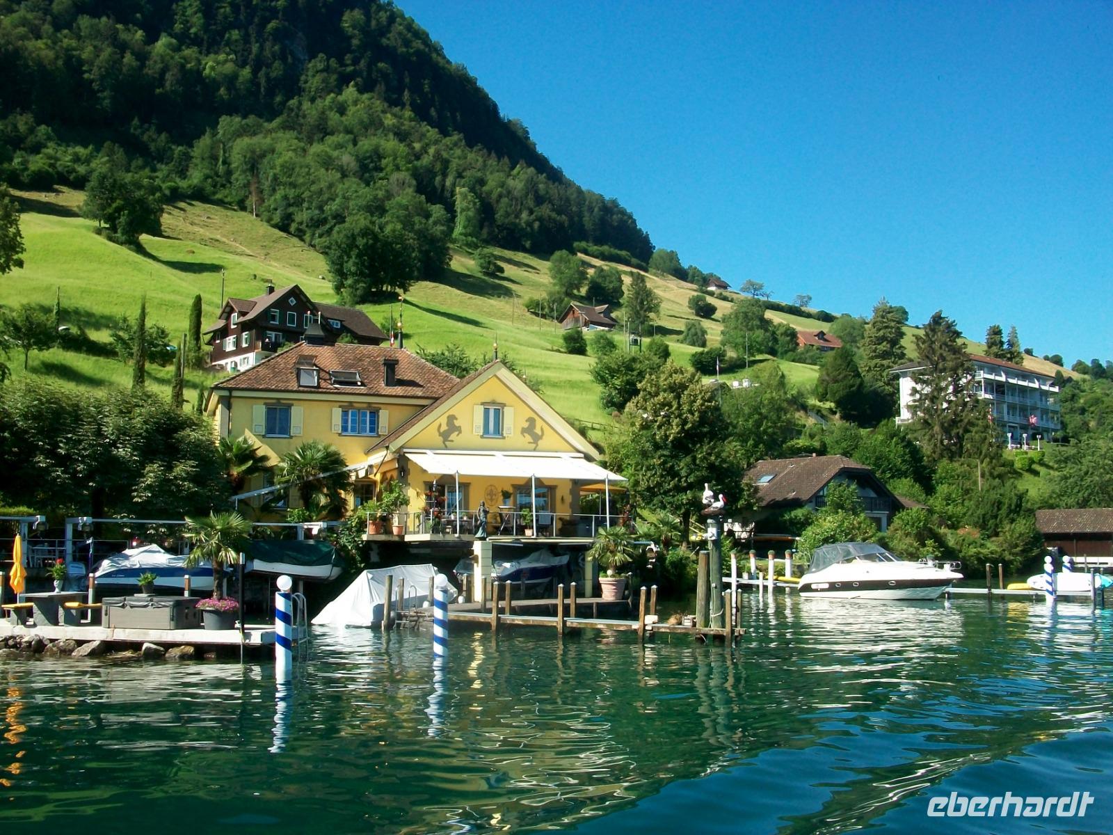 Heute genießen wir die Fahrt mit dem historischen Raddampfer der uns im Inneren einen Teil seiner beeindruckenden Antriebstechnik zeigt. Gemütlich schippern wir eine runde Stunde über den Vierwaldstättersee bis nach Vitznau. Noch bevor wir anlegen deutet dunkler Rauch das Erlebnis an welches uns nun erwartet. Angetrieben mit Sibirischer Steinkohle soll es empor zur Rigi gehen, dem königlichen Berg den schon viel Prominenz vor uns besuchte. Wir müssen durch etwas Andrang unseren Weg hin zu den für uns reservieren Plätzen bahnen, behilflich dabei ist ein sympathischer Mitarbeiter der uns auf der Fahrt hinauf mit wissenswerten Informationen versorgen wird. Nun werden wir, angetrieben von der Dampflok, auch ordentlich durchgerüttelt, aber das bringt diese besondere Romantik nun einmal mit sich. Bald genießen wir einen umwerfenden Blick auf den Vierwaldstättersee, wir steigen unaufhörlich bergan, müssen aber unterwegs Wasser fassen, denn die Lok braucht bis hinauf enorme 2 000 Liter! Bald erscheint zu unserer Linken eine weitere atemberaubende Kulisse; flaches Land dehnt sich bis zum Horizont und wir sehen aus der Vogelperspektive hinunter zu den Seen, kleinen Wäldern und zahlreichen Feldern. Als wir oben am Kulm anlagen, treiben leichte Wolkengespinste aus dem Tal hinauf die sich aber schnell auflösen und den Blick auf die grandiose Bergkulisse wieder freigeben. Der freundliche Mitarbeiter der Bahn gibt uns in sehr origineller und typisch Schweizer Art noch einige Infos mit auf den Weg und nun kann die Entdeckung der Rigi beginnen. Nur wenige Höhenmeter hinauf und wir sind am Fuße des mächtigen Funkturmes angelangt und können von hier oben den Blick weit schweifen lassen. Gleich zu unseren Füßen ist der Zuger See zu sehen, etwas weiter links davon ein Zipfel des Vierwaldstättersees an dessen Ende Küssnacht liegt, eine Sehenswürdigkeit in der Nähe dieser Stadt werden wir dann noch auf der Heimfahrt besuchen. Im Rücken die schroffen Berge, vor uns flacheres Land und im elegante Flug schwärmen die Bergdohlen um uns her, Augenblicke die man nicht vergisst!