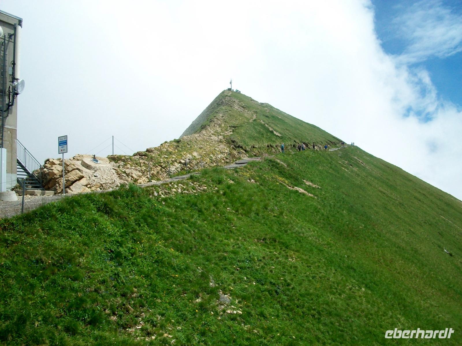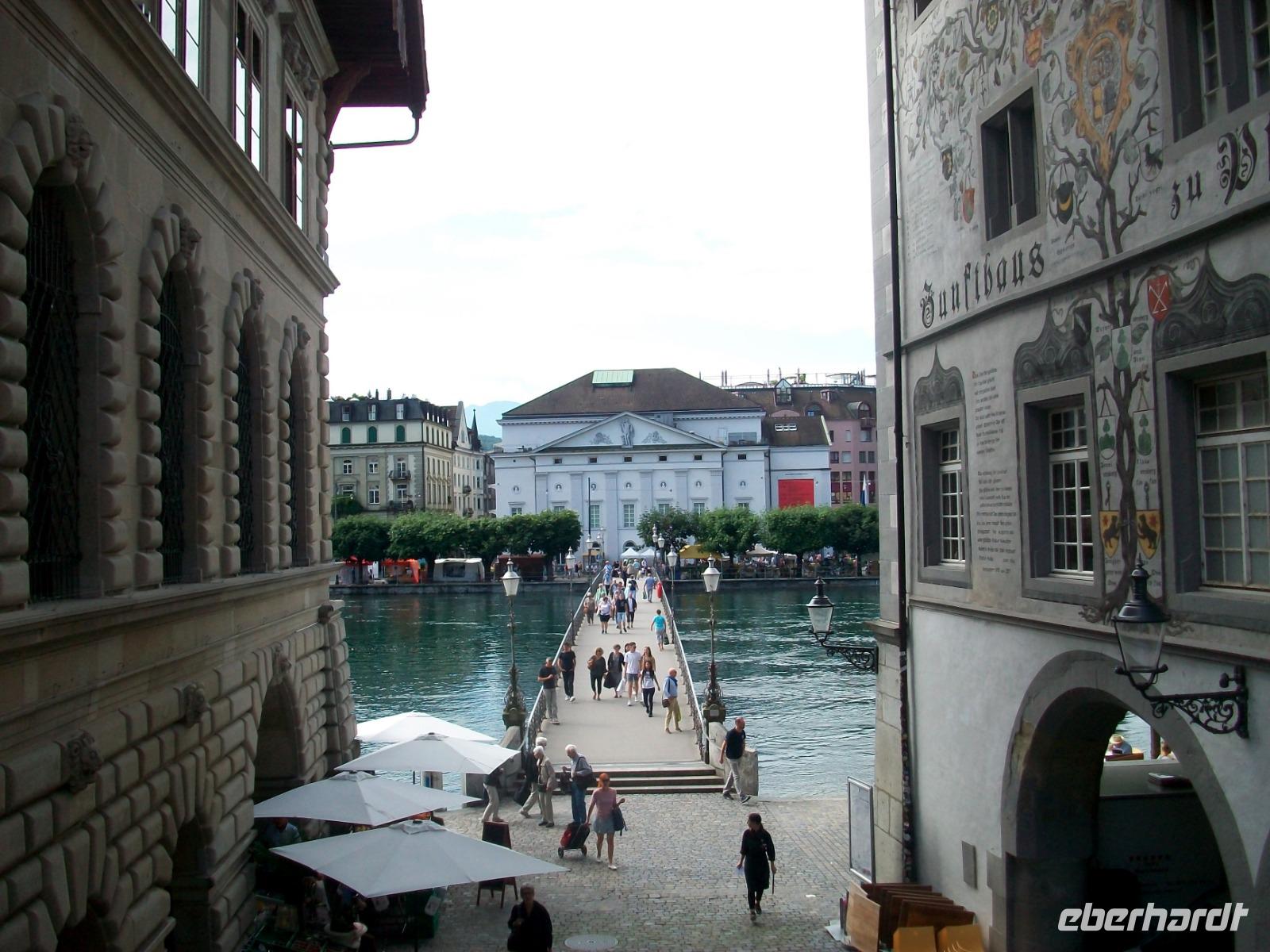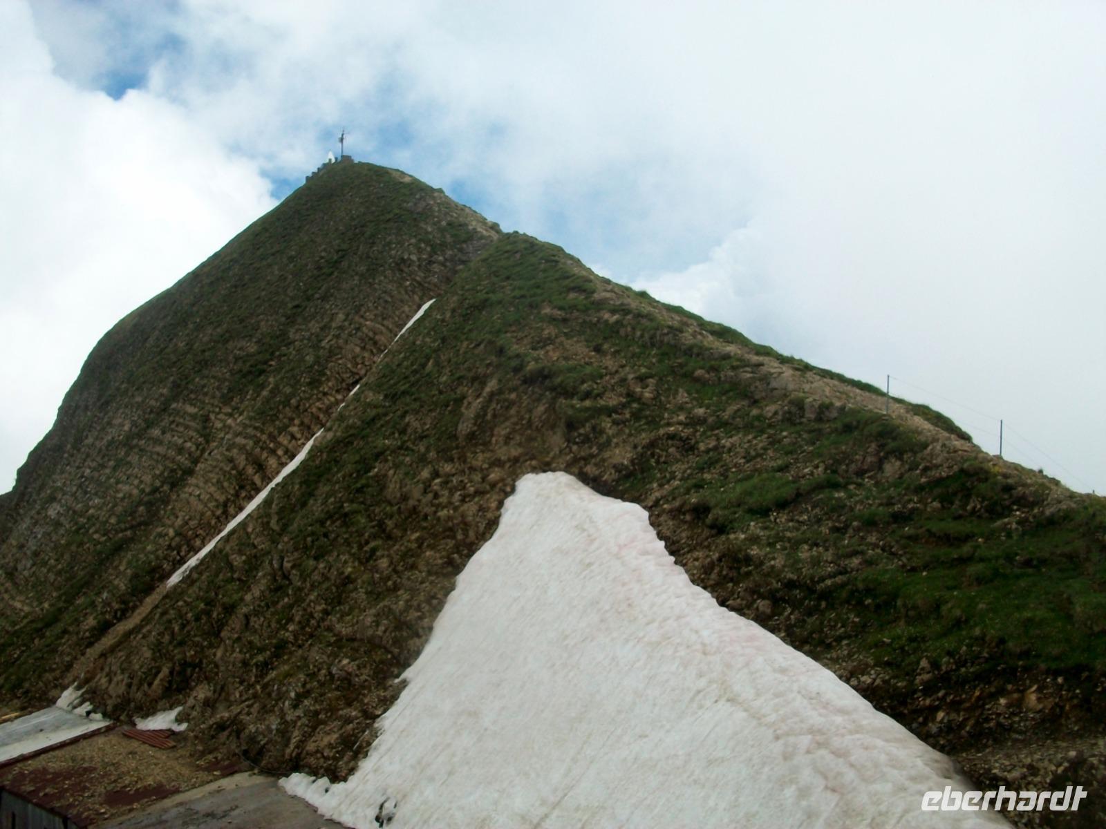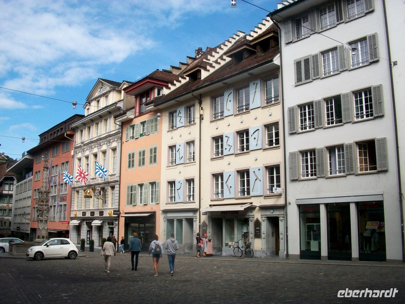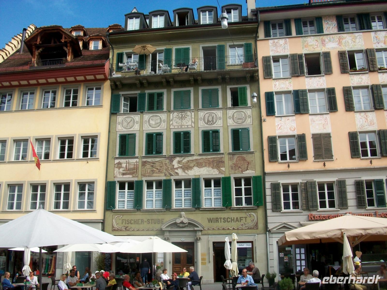Heute genießen wir die Fahrt mit dem historischen Raddampfer der uns im Inneren einen Teil seiner beeindruckenden Antriebstechnik zeigt. Gemütlich schippern wir eine runde Stunde über den Vierwaldstättersee bis nach Vitznau. Noch bevor wir anlegen deutet dunkler Rauch das Erlebnis an welches uns nun erwartet. Angetrieben mit Sibirischer Steinkohle soll es empor zur Rigi gehen, dem königlichen Berg den schon viel Prominenz vor uns besuchte. Wir müssen durch etwas Andrang unseren Weg hin zu den für uns reservieren Plätzen bahnen, behilflich dabei ist ein sympathischer Mitarbeiter der uns auf der Fahrt hinauf mit wissenswerten Informationen versorgen wird. Nun werden wir, angetrieben von der Dampflok, auch ordentlich durchgerüttelt, aber das bringt diese besondere Romantik nun einmal mit sich. Bald genießen wir einen umwerfenden Blick auf den Vierwaldstättersee, wir steigen unaufhörlich bergan, müssen aber unterwegs Wasser fassen, denn die Lok braucht bis hinauf enorme 2 000 Liter! Bald erscheint zu unserer Linken eine weitere atemberaubende Kulisse; flaches Land dehnt sich bis zum Horizont und wir sehen aus der Vogelperspektive hinunter zu den Seen, kleinen Wäldern und zahlreichen Feldern. Als wir oben am Kulm anlagen, treiben leichte Wolkengespinste aus dem Tal hinauf die sich aber schnell auflösen und den Blick auf die grandiose Bergkulisse wieder freigeben. Der freundliche Mitarbeiter der Bahn gibt uns in sehr origineller und typisch Schweizer Art noch einige Infos mit auf den Weg und nun kann die Entdeckung der Rigi beginnen. Nur wenige Höhenmeter hinauf und wir sind am Fuße des mächtigen Funkturmes angelangt und können von hier oben den Blick weit schweifen lassen. Gleich zu unseren Füßen ist der Zuger See zu sehen, etwas weiter links davon ein Zipfel des Vierwaldstättersees an dessen Ende Küssnacht liegt, eine Sehenswürdigkeit in der Nähe dieser Stadt werden wir dann noch auf der Heimfahrt besuchen. Im Rücken die schroffen Berge, vor uns flacheres Land und im elegante Flug schwärmen die Bergdohlen um uns her, Augenblicke die man nicht vergisst!
