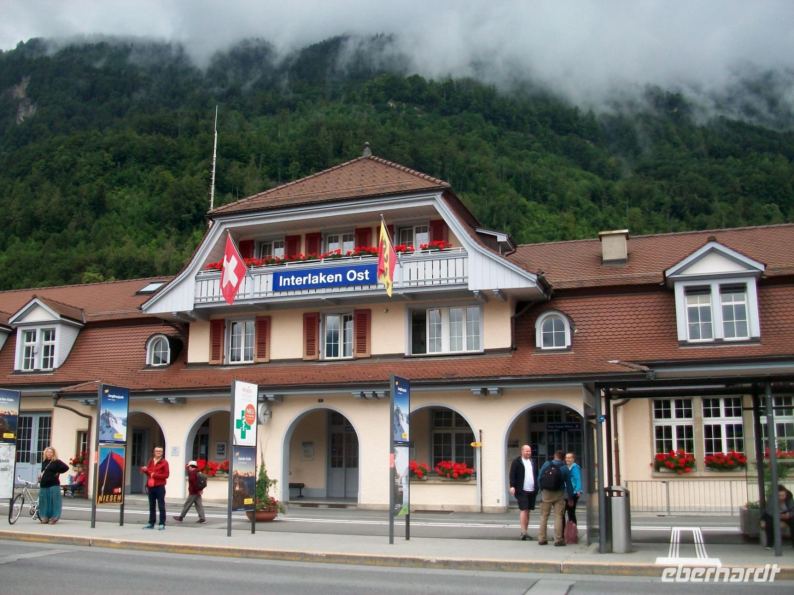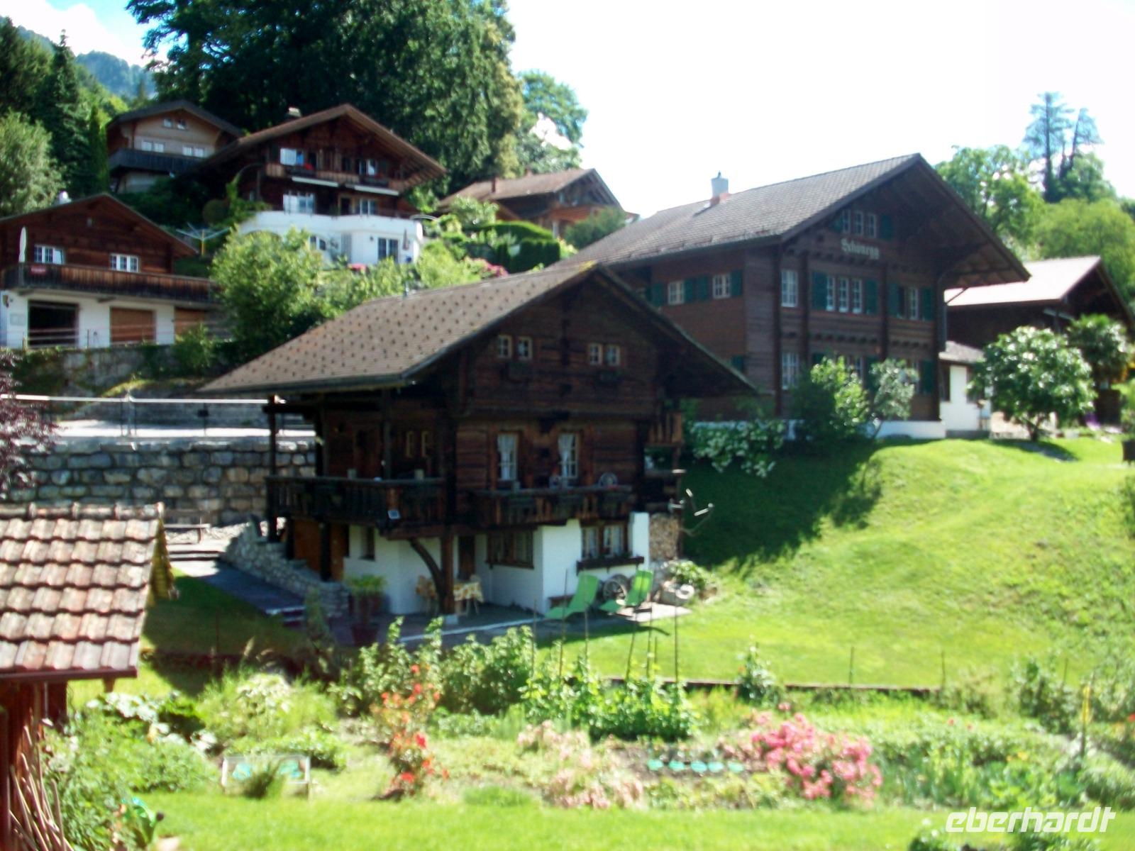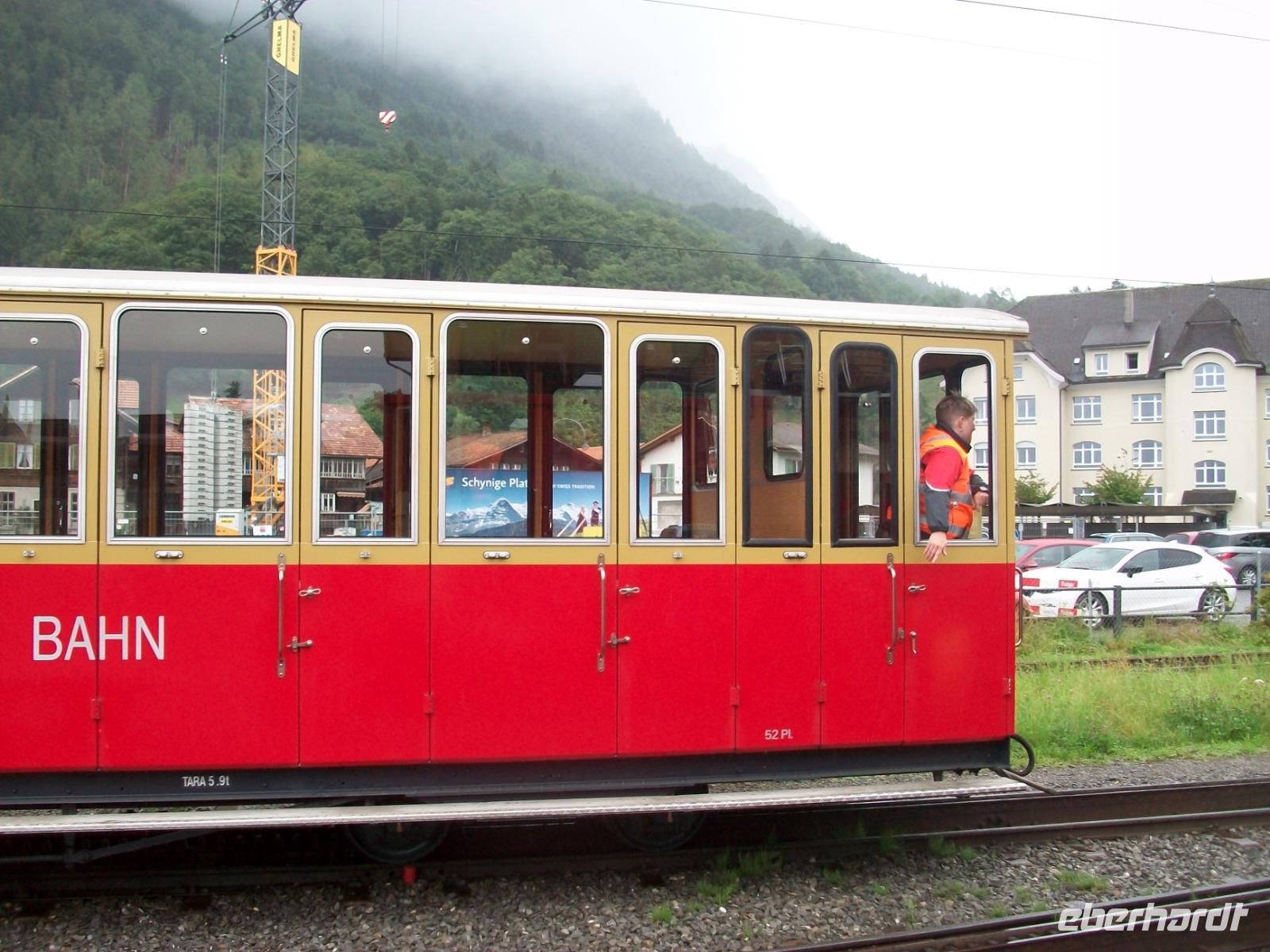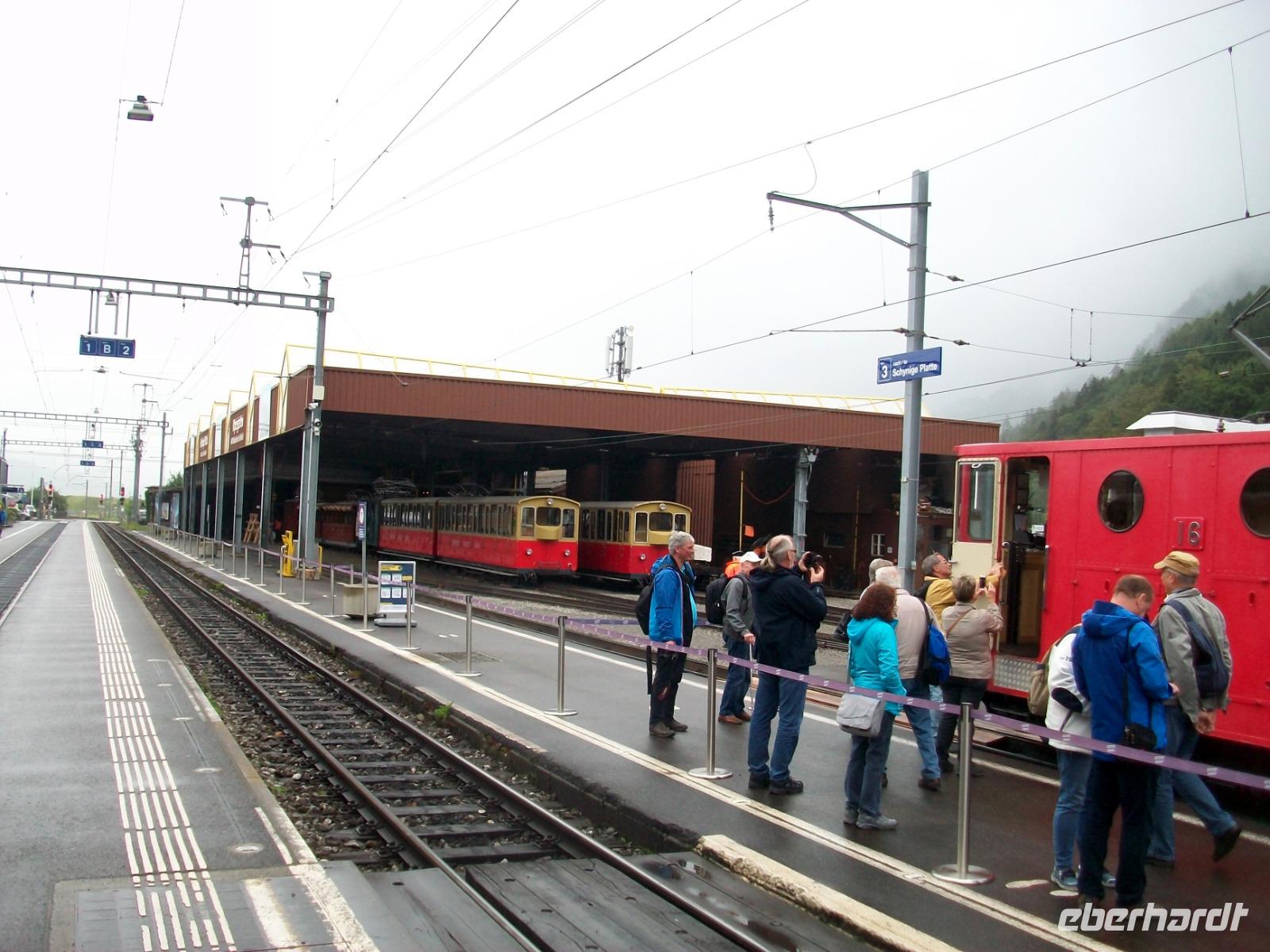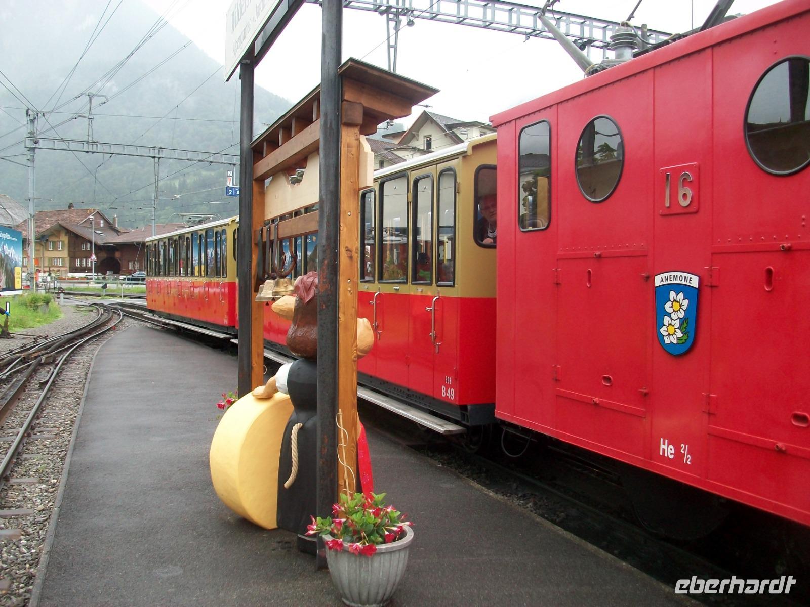 3.7.2020. Leider hat der Wetterbericht rechtbehalten: Ein Tief hat uns am heutigen Tag im Griff. Noch gestern weckte uns die Morgensonne, heute hängen bleigraue und regenschwere Wolken über dem Tal und an den Bergen. Dennoch lassen wir uns davon nicht beeindrucken und starten zu einem weiteren Höhepunkt unserer Tour. Erneut führt uns der Weg über den Brünigpass und hinunter zum Brienzer See um, nach kurzer Fahrt an Interlaken vorbei, den kleinen Ort Wilderswil zu erreichen. Wir sind etwas eher da damit sich die Eisenbahnfreunde mit der Technik der Bahn beschäftigen und auch einen Blick ins Depot hinein werfen können. Aber das Wetter wird leider nicht besser; dennoch freuen wir uns auf die Bergfahrt die uns ein weiteres Mal zeigt, was die Ingenieure der Schweiz zur damaligen Zeit geleistet haben. Es geht mithilfe der Zahnradtechnik steil bergan, der dichte Baumbestand weicht der hochalpinen Flora und, oben auf rund 2 000 Metern angelangt, sind wir direkt in den Wolken. Aber es regnet nicht, wenn auch ein kalter Wind durch die Sachen dringt; einen Höhepunkt schauen wir uns hier oben dennoch an: den Alpengarten. Fleißige Hände haben ihn angelegt, es gibt über 600 Pflanzenarten zu betrachten die alle sorgsam mit Schildern versehen wurden. Die gigantische Bergkulisse können wir zumindest auf den Bilden und Werbeplakaten bewundern, es sind die Aussichten die uns heute leider verwehrt blieben. Unsere Stimmung hat sich dadurch aber kaum eingetrübt; gegen das Wetter kann man nichts machen. Wenn es am Nachmittag auch keine Sonne gibt, wir gönnen uns dennoch, hier unten im Tal wieder bei angenehmen Temperaturen, einen Aufenthalt im Ort Interlaken der auch einiges zu bieten hat. Entlang der Höhenmatte sehen wir uns die Architektur des ausgehenden 19. Jahrhunderts an, auch an Moderne fehlt es nicht und bei einem Kaffee in einem der zahlreichen und mäßig besuchten Restaurants gönnen wir uns hier eine schöne Zeit. Die letzte schöne Impression bringt uns eine Fahrt entlang des Ufers des Brienzer Sees, wir bewundern die alten Häuser des Oberlandes und sehen auch die Holzschnitzkunst für welche besonders der Ort Brienz weltberühmt ist.