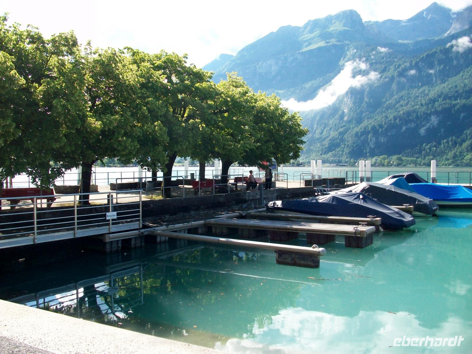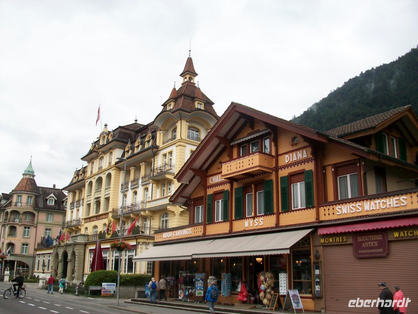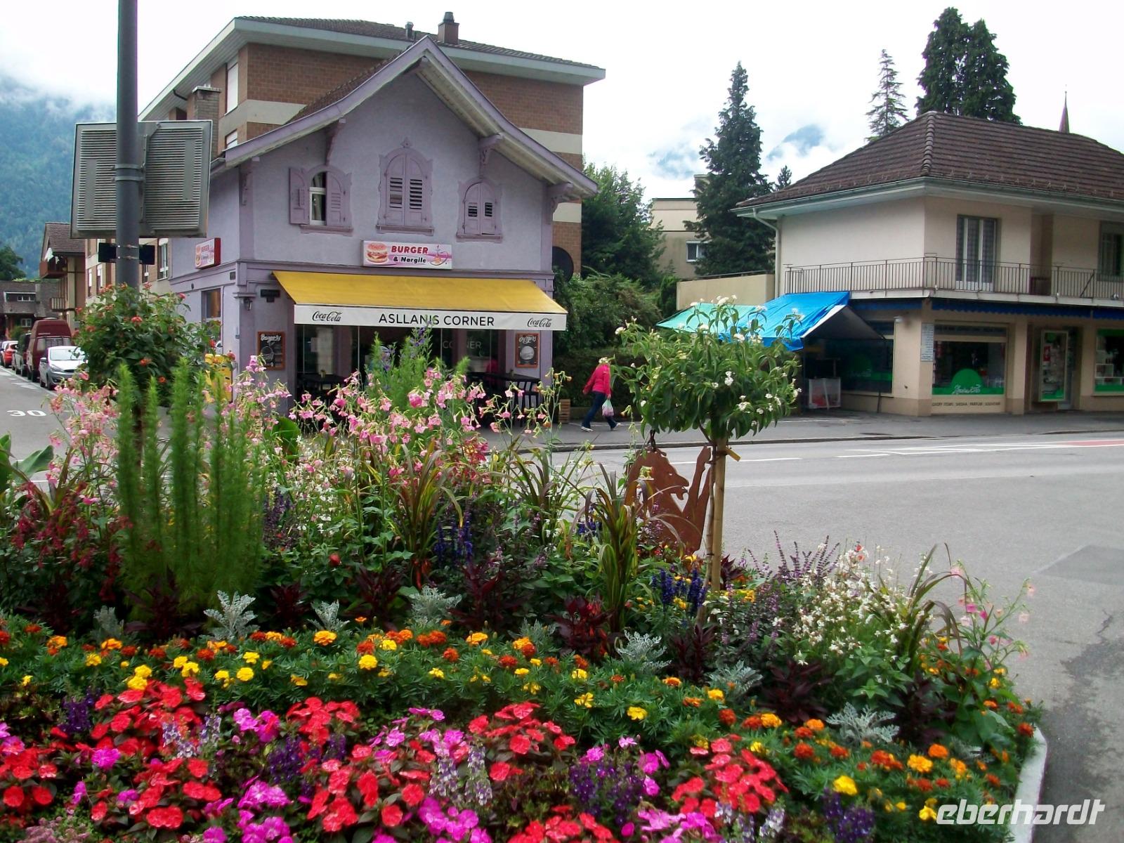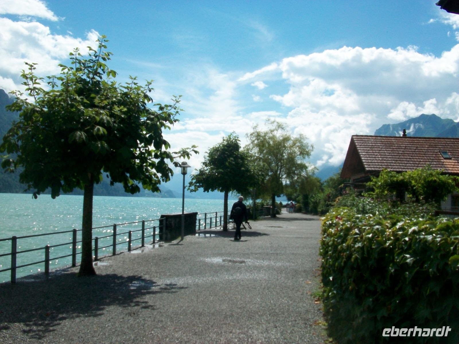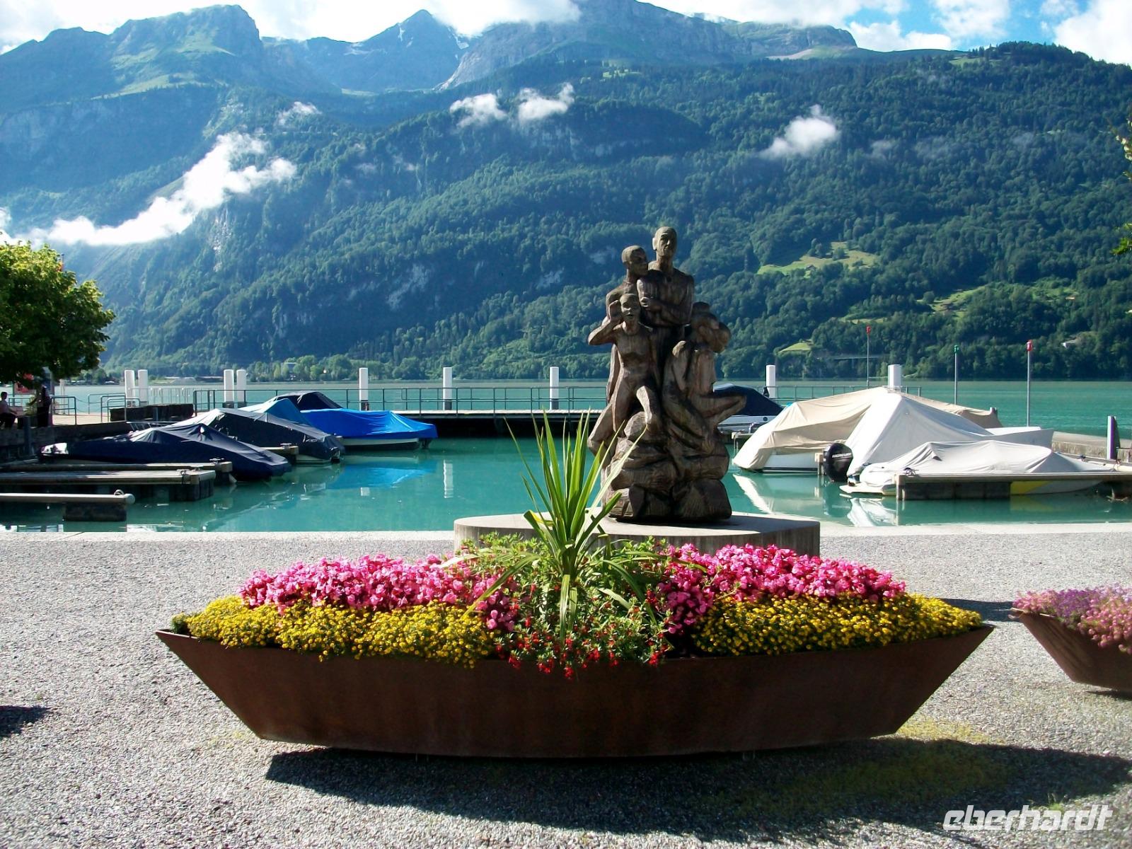 3.7.2020. Leider hat der Wetterbericht rechtbehalten: Ein Tief hat uns am heutigen Tag im Griff. Noch gestern weckte uns die Morgensonne, heute hängen bleigraue und regenschwere Wolken über dem Tal und an den Bergen. Dennoch lassen wir uns davon nicht beeindrucken und starten zu einem weiteren Höhepunkt unserer Tour. Erneut führt uns der Weg über den Brünigpass und hinunter zum Brienzer See um, nach kurzer Fahrt an Interlaken vorbei, den kleinen Ort Wilderswil zu erreichen. Wir sind etwas eher da damit sich die Eisenbahnfreunde mit der Technik der Bahn beschäftigen und auch einen Blick ins Depot hinein werfen können. Aber das Wetter wird leider nicht besser; dennoch freuen wir uns auf die Bergfahrt die uns ein weiteres Mal zeigt, was die Ingenieure der Schweiz zur damaligen Zeit geleistet haben. Es geht mithilfe der Zahnradtechnik steil bergan, der dichte Baumbestand weicht der hochalpinen Flora und, oben auf rund 2 000 Metern angelangt, sind wir direkt in den Wolken. Aber es regnet nicht, wenn auch ein kalter Wind durch die Sachen dringt; einen Höhepunkt schauen wir uns hier oben dennoch an: den Alpengarten. Fleißige Hände haben ihn angelegt, es gibt über 600 Pflanzenarten zu betrachten die alle sorgsam mit Schildern versehen wurden. Die gigantische Bergkulisse können wir zumindest auf den Bilden und Werbeplakaten bewundern, es sind die Aussichten die uns heute leider verwehrt blieben. Unsere Stimmung hat sich dadurch aber kaum eingetrübt; gegen das Wetter kann man nichts machen. Wenn es am Nachmittag auch keine Sonne gibt, wir gönnen uns dennoch, hier unten im Tal wieder bei angenehmen Temperaturen, einen Aufenthalt im Ort Interlaken der auch einiges zu bieten hat. Entlang der Höhenmatte sehen wir uns die Architektur des ausgehenden 19. Jahrhunderts an, auch an Moderne fehlt es nicht und bei einem Kaffee in einem der zahlreichen und mäßig besuchten Restaurants gönnen wir uns hier eine schöne Zeit. Die letzte schöne Impression bringt uns eine Fahrt entlang des Ufers des Brienzer Sees, wir bewundern die alten Häuser des Oberlandes und sehen auch die Holzschnitzkunst für welche besonders der Ort Brienz weltberühmt ist.
