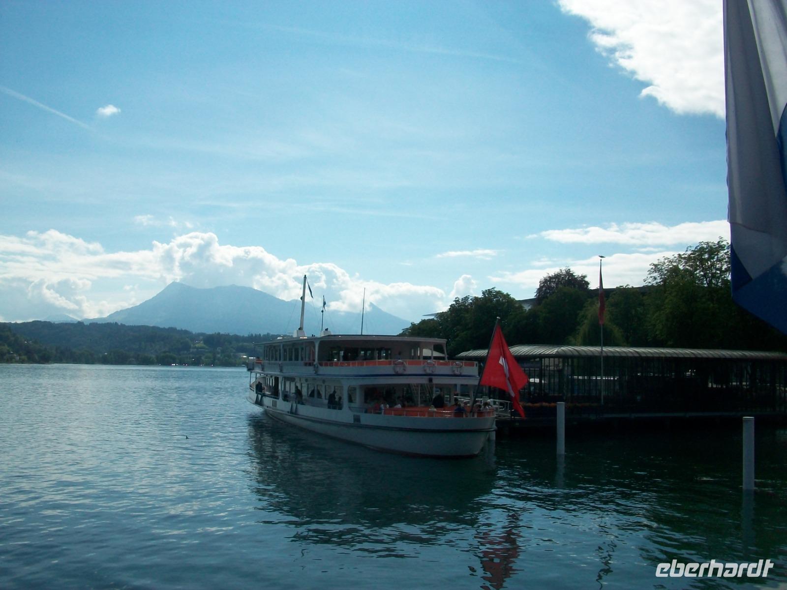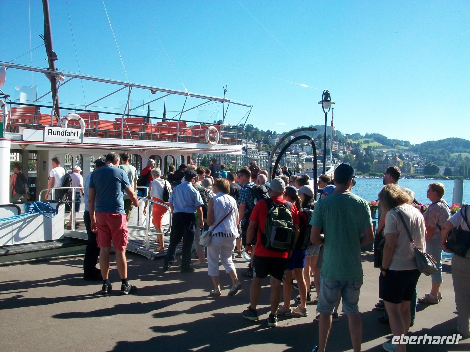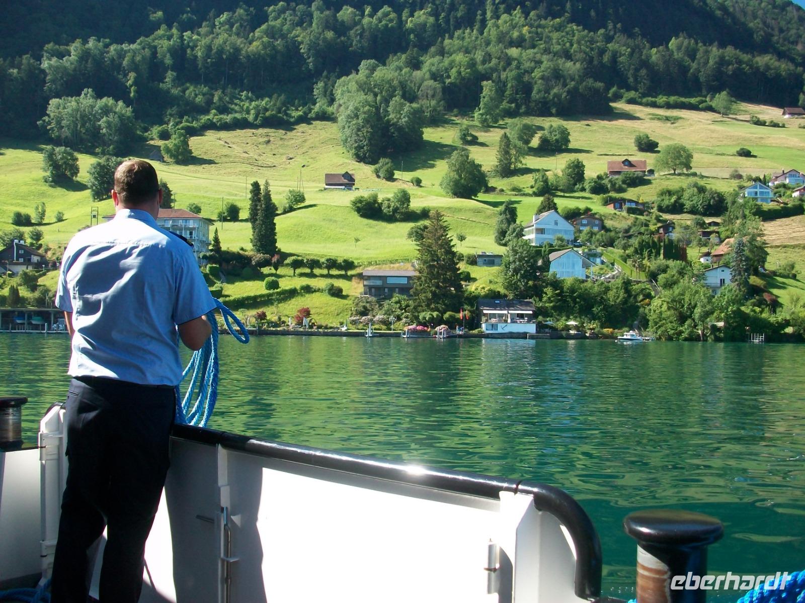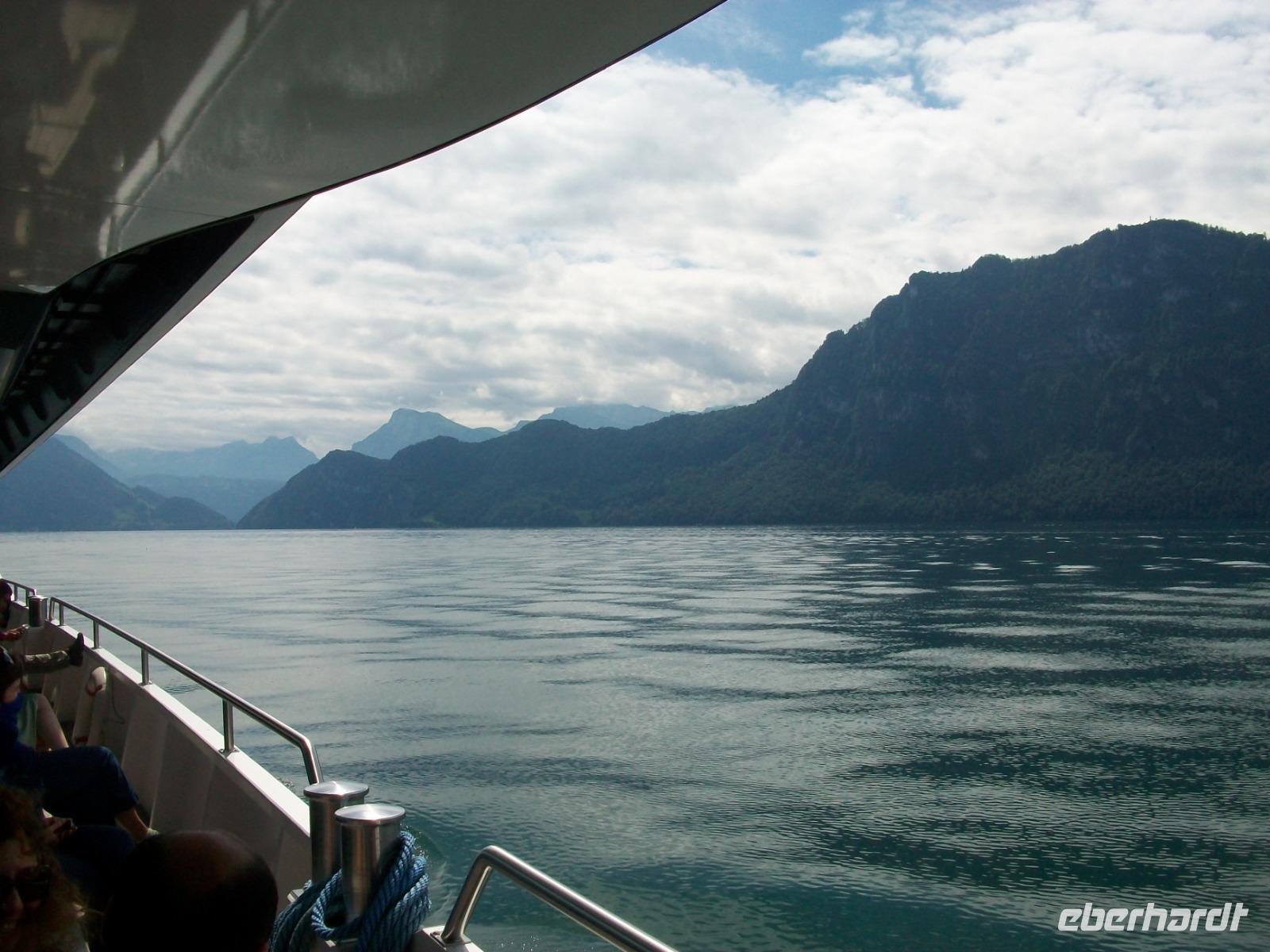 Doch dann, gegen elf, gelangen wir an Bord des Schiffes welches uns hinüber nach Flüelen und somit an das andere Ende des Sees bringen wird. Jeder hat sich ein gemütliches Plätzchen an Deck gesucht, ein Pfiff deutet die Abfahrt an und dann geht es los. Schnell entschwindet Luzern unseren Blicken; das Schiff legt an den wichtigsten Orten des Sees an und neue Passagiere kommen hinzu. Die Sonne wärmt uns, während ein angenehm kühles Lüftchen auf dem See für Erfrischung sorgt, solcherart ist das schlechte Wetter von gestern schnell vergessen! Der Vormittag vergeht, der Mittag kommt und nach kleinem Imbiss an Bord kommt das Ende des Sees schnell näher. In Flüelen verlassen wir das Schiff um in wenigen Metern den Bahnhof zu erreichen. Bald fährt der Zug ein der uns hinüber ins Tessin bringen wird.