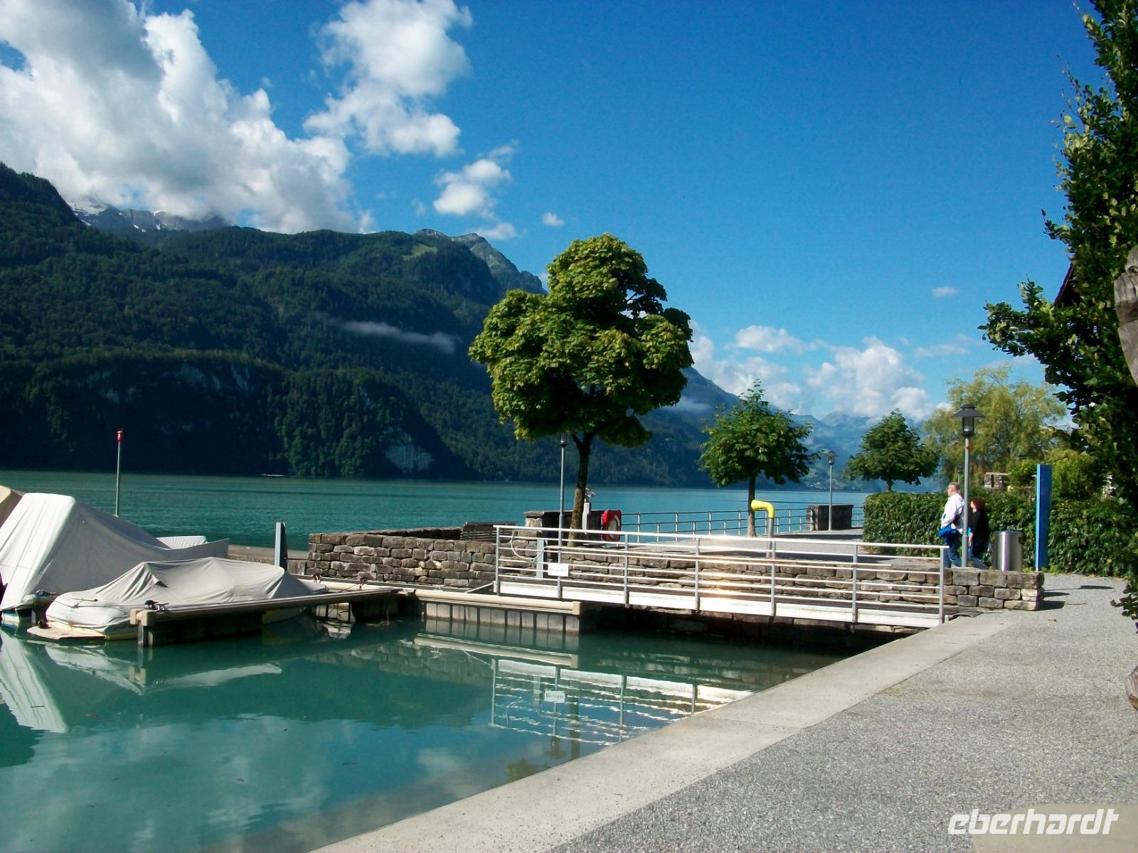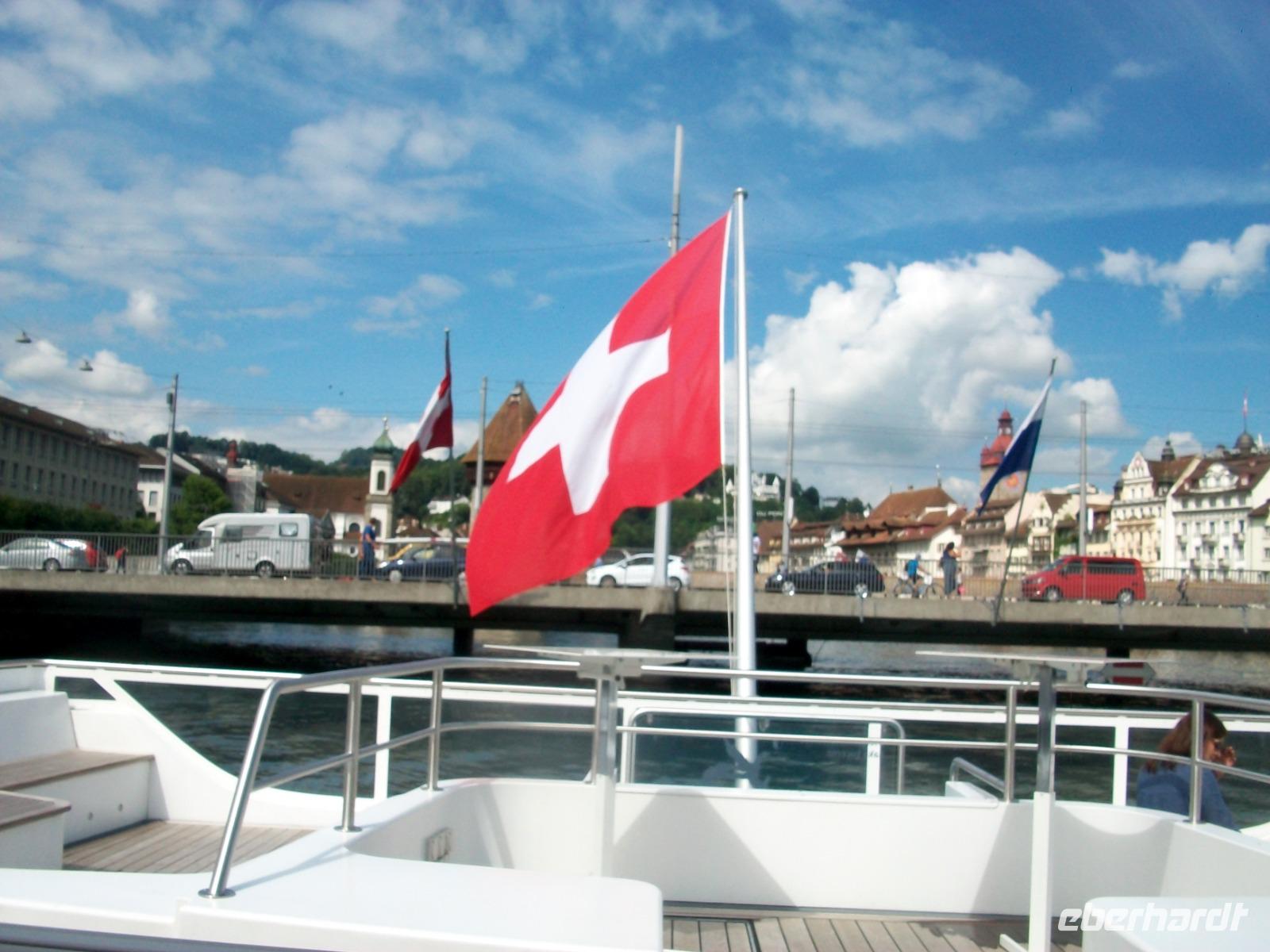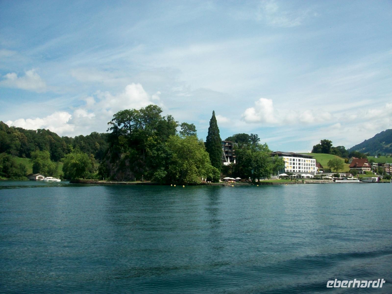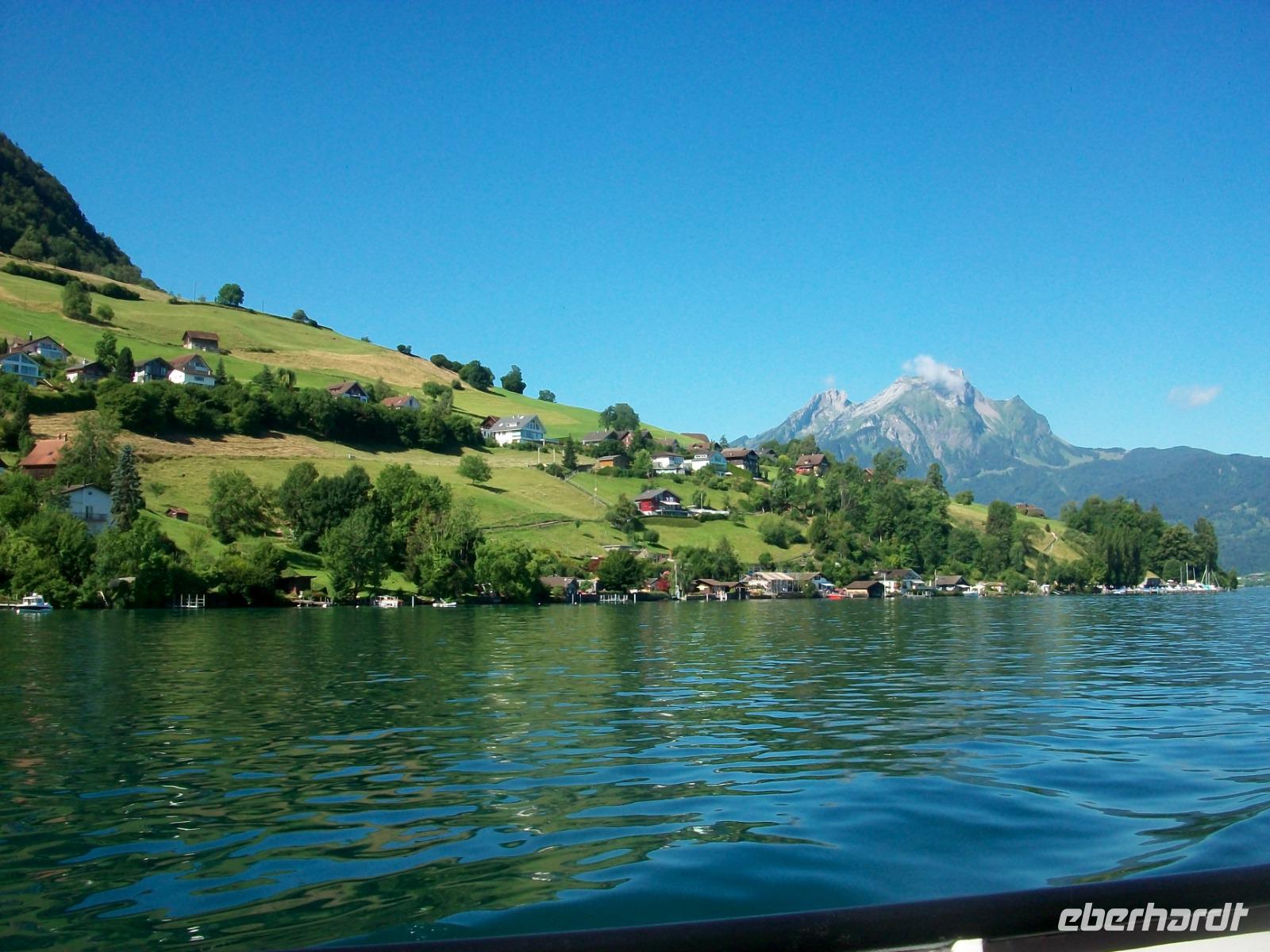 Doch dann, gegen elf, gelangen wir an Bord des Schiffes welches uns hinüber nach Flüelen und somit an das andere Ende des Sees bringen wird. Jeder hat sich ein gemütliches Plätzchen an Deck gesucht, ein Pfiff deutet die Abfahrt an und dann geht es los. Schnell entschwindet Luzern unseren Blicken; das Schiff legt an den wichtigsten Orten des Sees an und neue Passagiere kommen hinzu. Die Sonne wärmt uns, während ein angenehm kühles Lüftchen auf dem See für Erfrischung sorgt, solcherart ist das schlechte Wetter von gestern schnell vergessen! Der Vormittag vergeht, der Mittag kommt und nach kleinem Imbiss an Bord kommt das Ende des Sees schnell näher. In Flüelen verlassen wir das Schiff um in wenigen Metern den Bahnhof zu erreichen. Bald fährt der Zug ein der uns hinüber ins Tessin bringen wird.