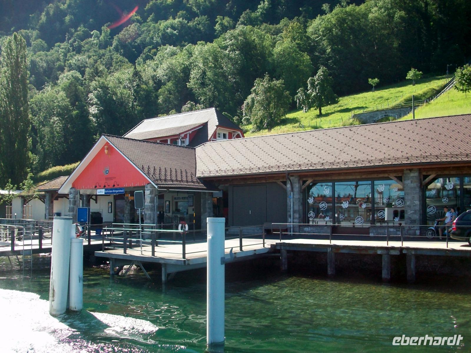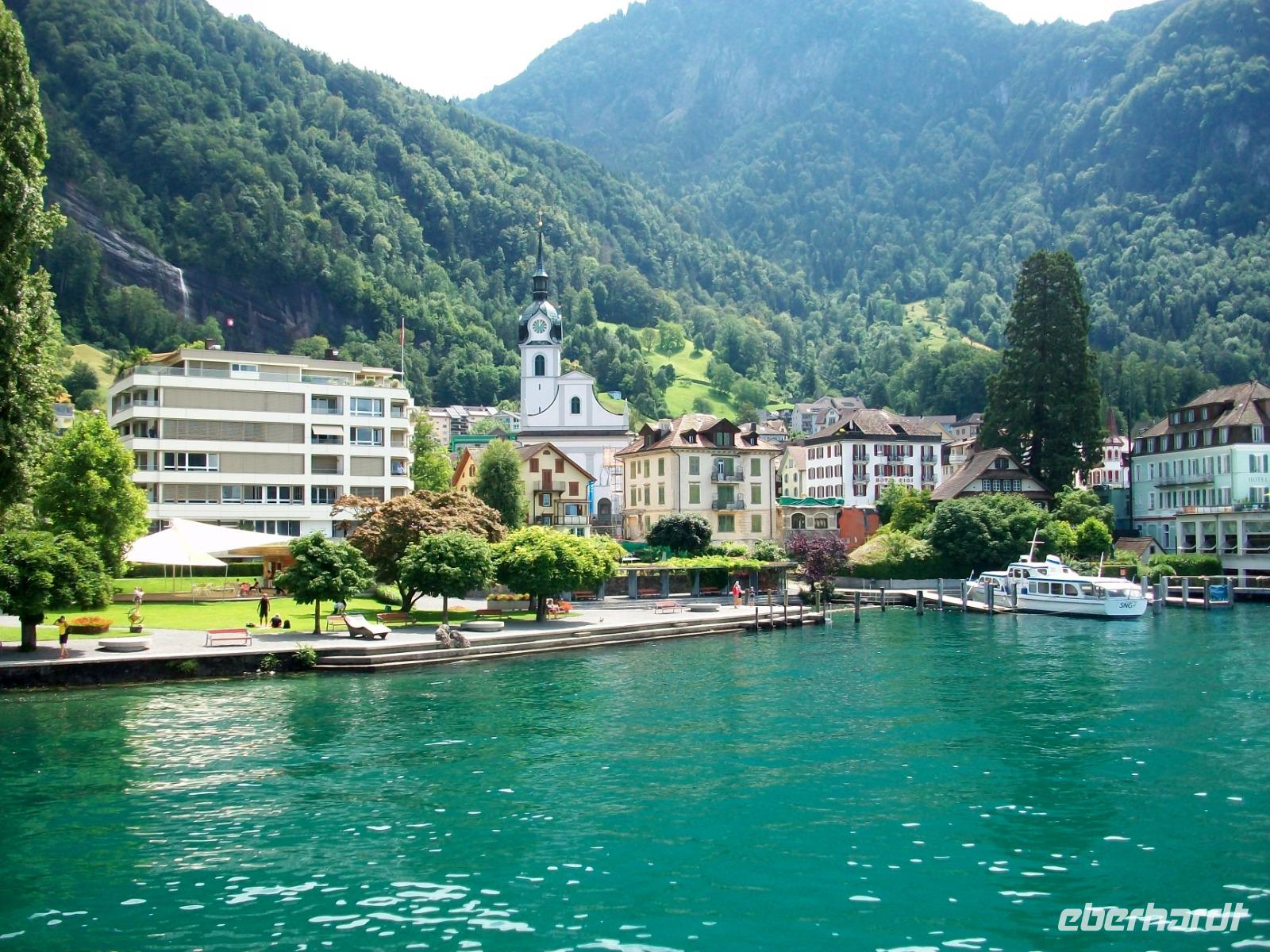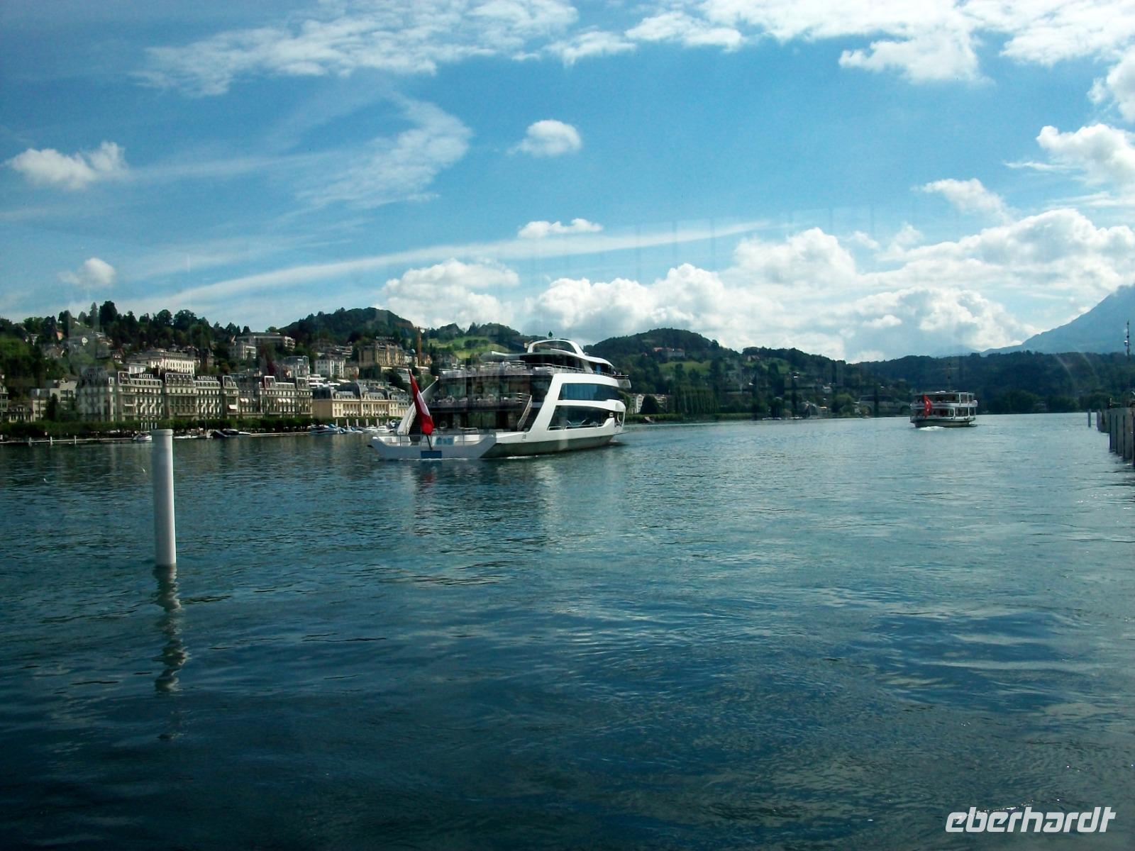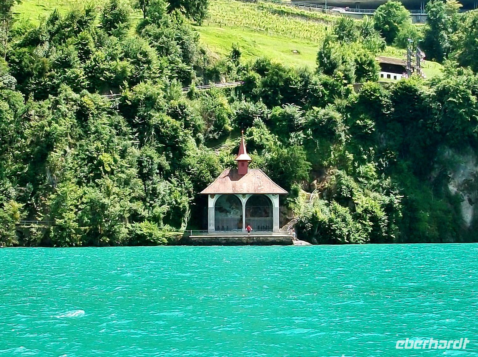 Doch dann, gegen elf, gelangen wir an Bord des Schiffes welches uns hinüber nach Flüelen und somit an das andere Ende des Sees bringen wird. Jeder hat sich ein gemütliches Plätzchen an Deck gesucht, ein Pfiff deutet die Abfahrt an und dann geht es los. Schnell entschwindet Luzern unseren Blicken; das Schiff legt an den wichtigsten Orten des Sees an und neue Passagiere kommen hinzu. Die Sonne wärmt uns, während ein angenehm kühles Lüftchen auf dem See für Erfrischung sorgt, solcherart ist das schlechte Wetter von gestern schnell vergessen! Der Vormittag vergeht, der Mittag kommt und nach kleinem Imbiss an Bord kommt das Ende des Sees schnell näher. In Flüelen verlassen wir das Schiff um in wenigen Metern den Bahnhof zu erreichen. Bald fährt der Zug ein der uns hinüber ins Tessin bringen wird.