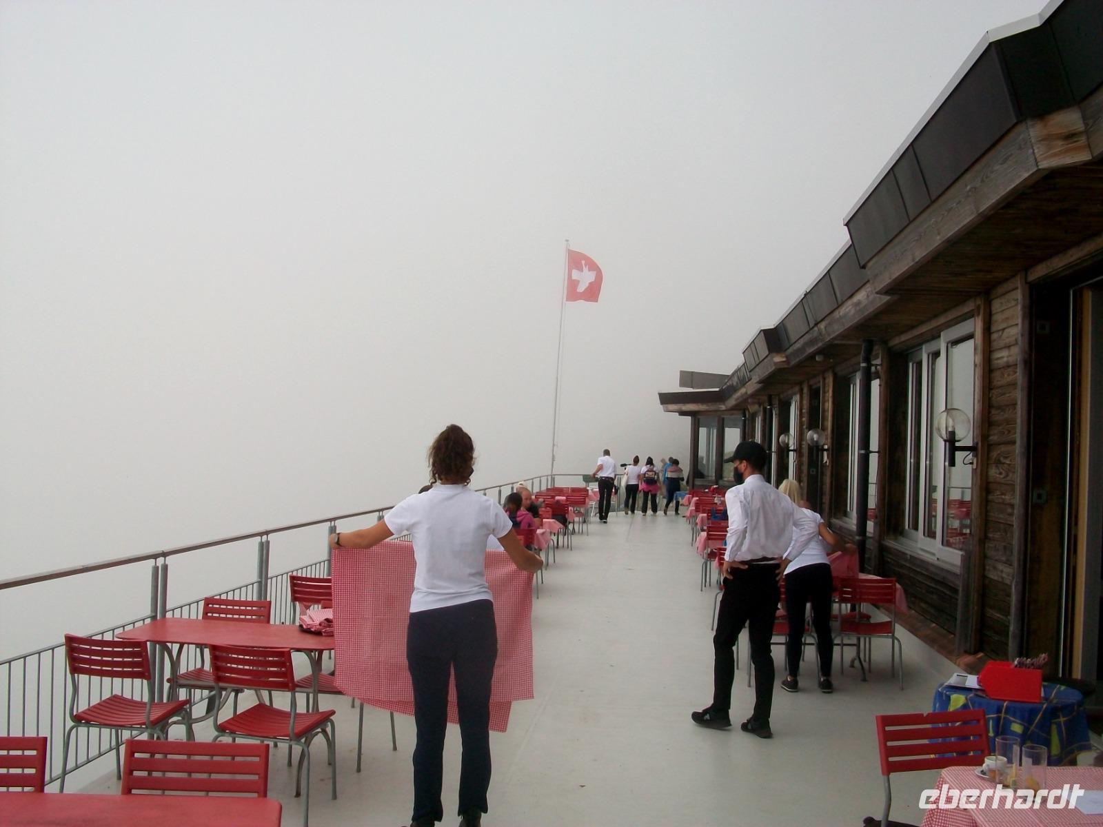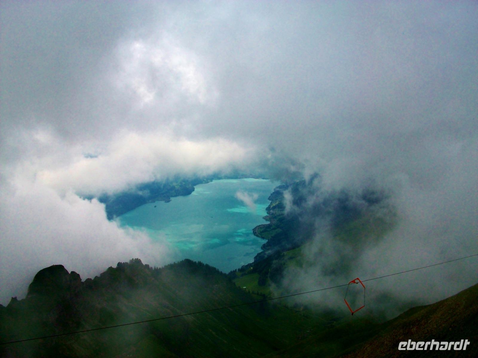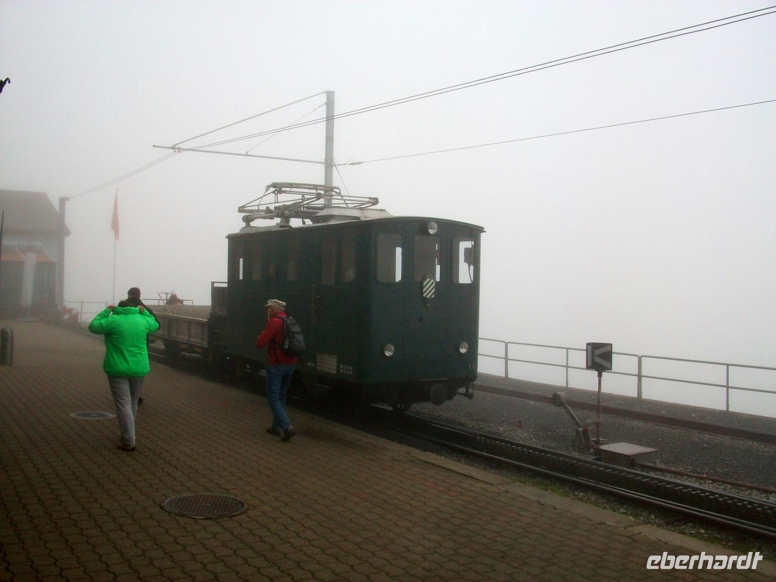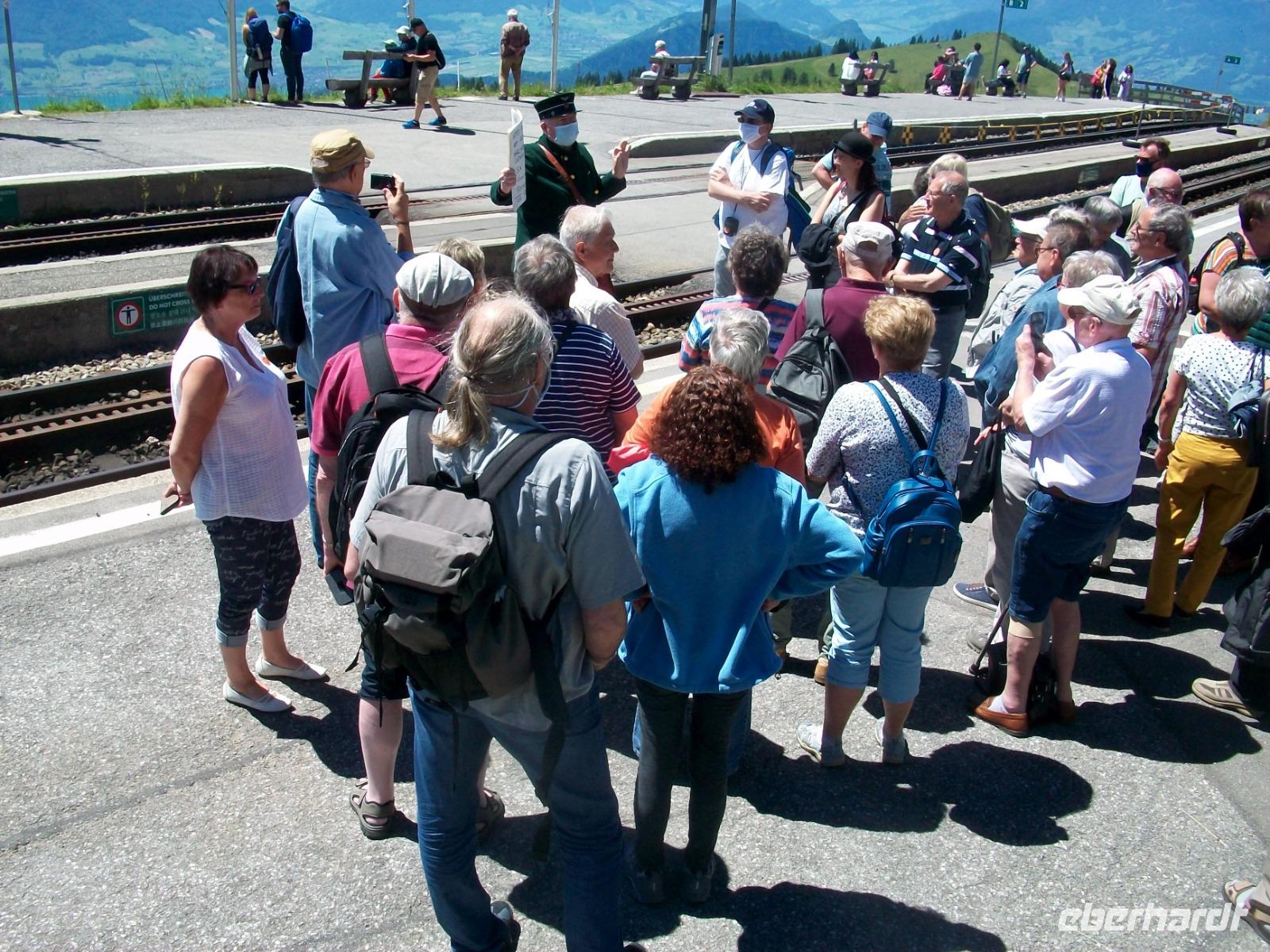 2.7.2020. Die Sonne ist über den Bergen aufgegangen, lichter Nebel löst sich schnell auf und unsere Reisegesellschaft findet sich, gut ausgeschlafen, beim Frühstück wieder. Erwartungsvoll drehen sich alle Gespräche um den ersten großen Höhepunkt unserer Reise und gegen neun starten unsere zwei Busse hinunter nach Sachseln und den Sarner See. Noch vom nächtlichen Regen und von der Morgensonne beschienen, glitzern die grünen Wiesen auf denen die Kühe ihr Morgenmahl halten, das ist Bergromantik pur! Dann steigen wir hinauf zum Brünigpass, haben dabei einen schönen Blick auf den See von Lungern und langen bald im Berner Oberland an. Wir sehen von oben wie die Aare ihren schnurgeraden Lauf in Richtung Brienzer See nimmt, wir haben dieselbe Richtung. Dann langen wir in Brienz an und lassen die Busse am See stehen. Gleich gegenüber befindet sich die Talstation der Rothornbahn, hier beginnt nun ein besonderes Abenteuer! Leider sind an diesem Vormittag zwei Dampfloks defekt, aber mit Diesel geht es auch bergan, nur fehlt dabei ein wenig die Romantik des Dampfes. Aber, besonders nachdem wir die Baumgrenze überschritten haben, überwältigt uns ein wahrhaft großartiger Ausblick. Umso höher wir steigen desto mehr tritt die Bergkulisse vor unsere Augen. Schon sind Eiger, Mönch und Jungfrau auszumachen, weitere 4 000er, gekrönt von ewigem Eis und Schnee, treten hervor und wir steigen immer mehr zu den Wolken empor. Wie Berggeister wabern sie vom Tal herauf und, oben auf über 2 200 Metern angelangt, suchen wir das schöne Restaurant auf um uns mit einer typische Schweizer Speise zu stärken: Es gibt Älplermagronen. Danach geht es aber hinaus zu den Aussichtspunkten um die Bergwelt in Ruhe bewundern zu können. Leider hat Petrus mehr und mehr Wolken gesandt, aber in den Lücken zeigen sich die Berge in ungeahnter Pracht. Immer im Wechselspiel von undurchdringlichem Nebel und grandioser Sicht vergeht der Nachmittag wie im Fluge; als unsere Reisegesellschaft bereit zur Abfahrt in den Wagen sitzt, zieht trommelnd ein Hagelschauer über unsere Köpfe hinweg. Bei der Abfahrt regnet es in Strömen; als wir dann nach einstündiger Fahrt unten in Brienz anlangen lacht uns, in schwülwarmer Luft, schon wieder die Sonne. Also gönnen wir uns ein Stündchen zum Bummeln im reizvollen Ort mit wunderschönen Ausblicken auf den See bevor wir zum Hotel zurückkehren.