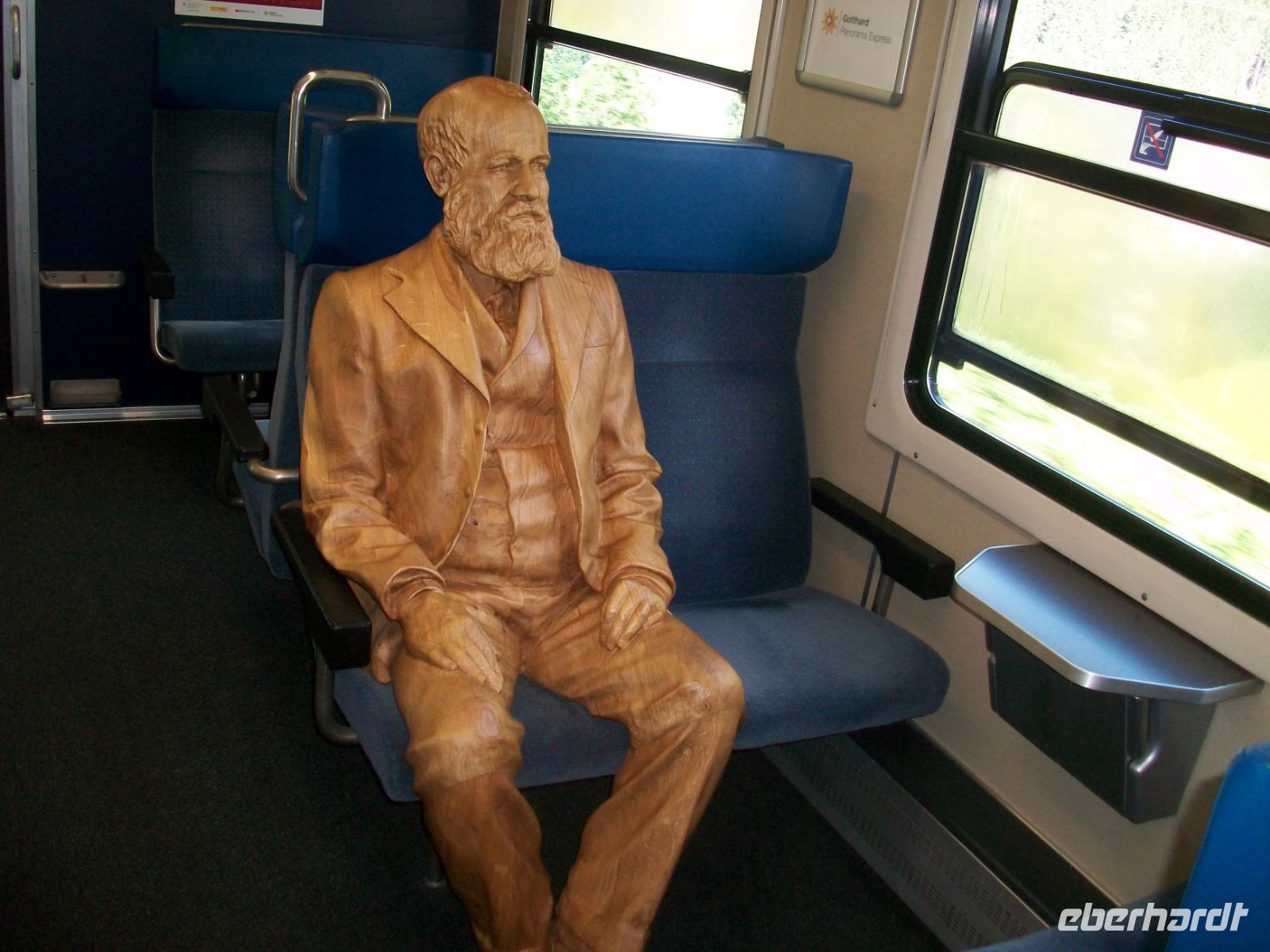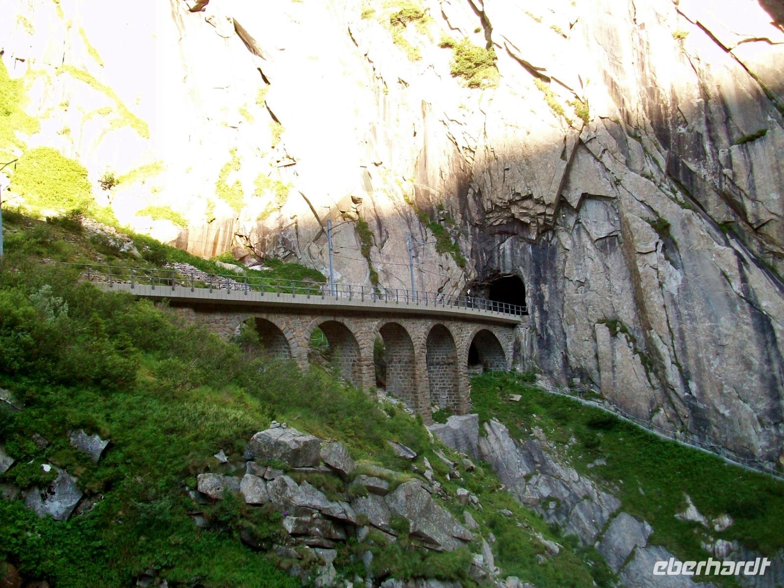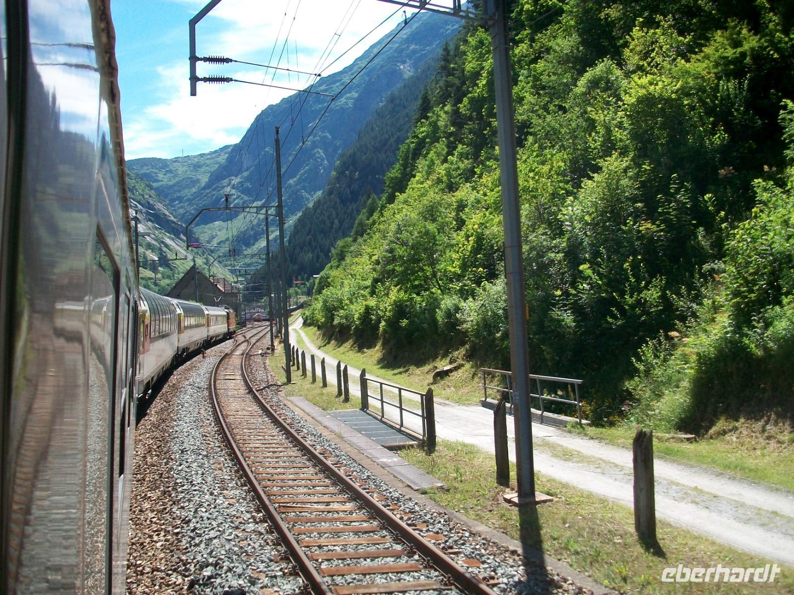 Schnell haben wir unsere Plätze gefunden, ein Pfiff zeigt die Abfahrt an und bald danach beschleunigt der Zug. Nun gibt es immer etwas zu schauen; die Landschaft fliegt an den Fenstern vorbei und in den Kehrtunneln, welche in den Bergen verlaufen, gewinnen wir an Höhe. Doch dann wird es für längere Zeit dunkel; wir durcheilen den alten Gotthard - Tunnel der im ausgehenden 19. Jahrhundert fertiggestellt wurde und mit seinen 15 Kilometern noch bis heute ein grandioses Werk, von Menschenhand geschaffen, darstellt. Urplötzlich verlangsamt der Zug seine Fahrt und an den Tunnelwänden erscheinen Projektionen vom Bau dieses Tunnels, sehr beeindruckend!