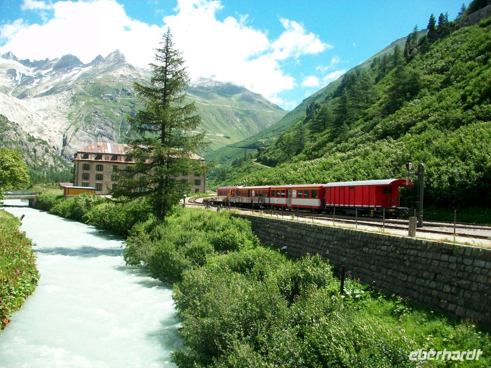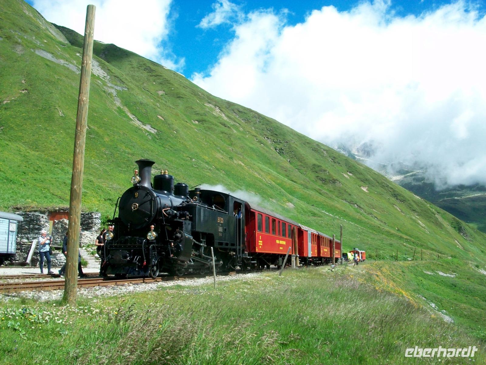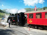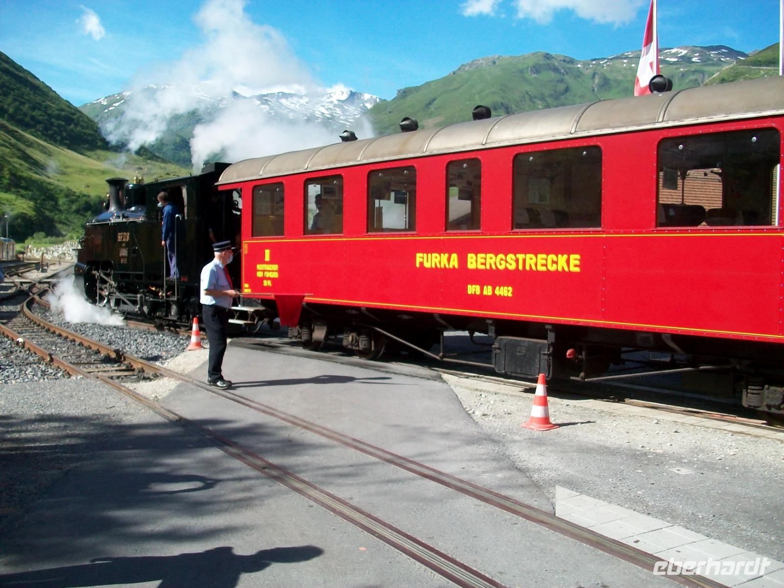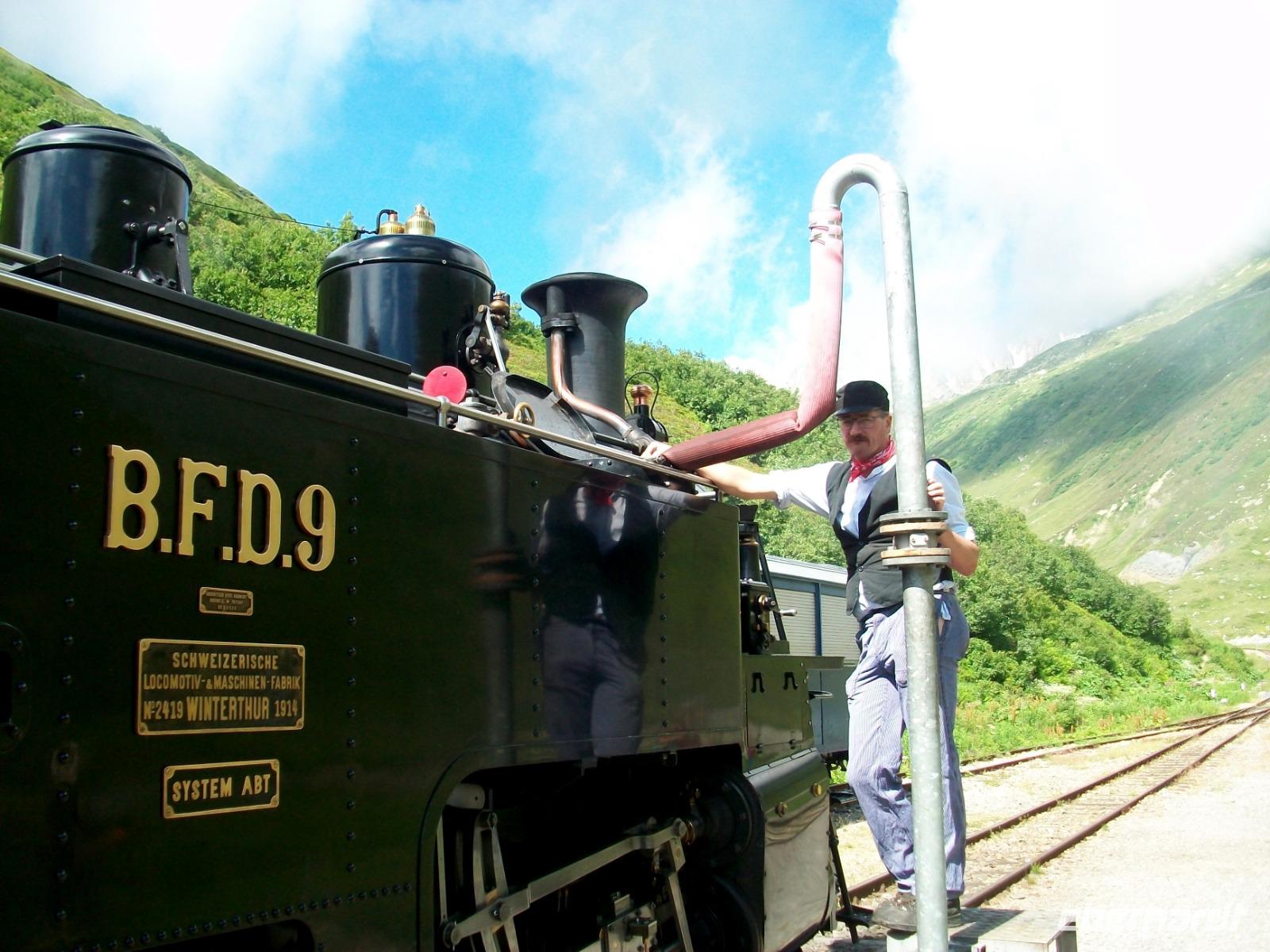 Ein Pfiff und der Dampfzug kommt vom Depot schnaufend zum Bahnhof gerollt. Schnell haben wir den für uns reservierten Wagen bestiegen, die Fahrt beginnt. Bald ist der kleine Ort unseren Augen entschwunden und wir sind nun inmitten von vielem Grün unterwegs. Kleine Gebirgsbäche kommen uns entgegen, links und rechts steigen die Berge des Furka - Massivs an, es ist einfach wunderbar! Dabei weht ein besonderer Duft in den Wagen; es riecht nach Dampf und Rauch und damit wird eine längst vergangene Zeit wieder lebendig die irgendwie auch den Menschen des digitalen 21. Jahrhunderts fasziniert. Unterwegs müssen wir wieder Wasser fassen, die Fotografen finden auch hier schöne Motive von der Bergnatur und wie sie der Mensch besiegte.