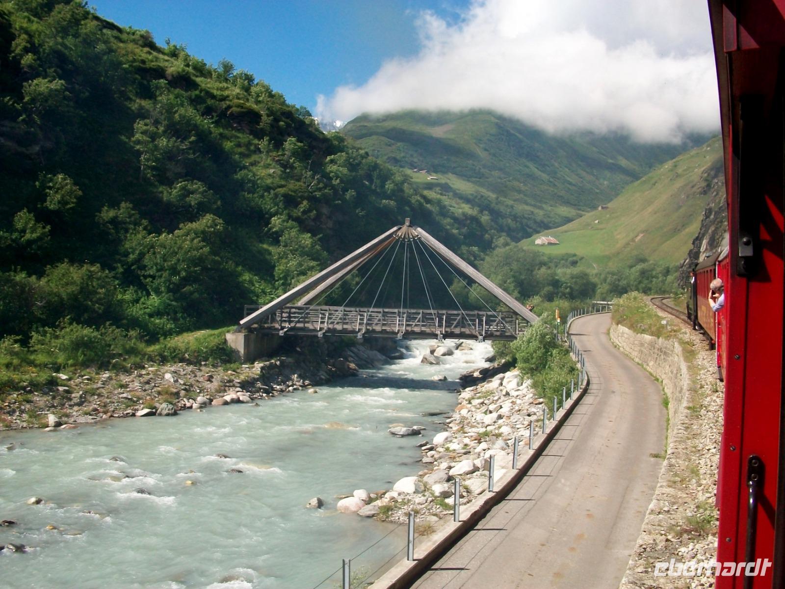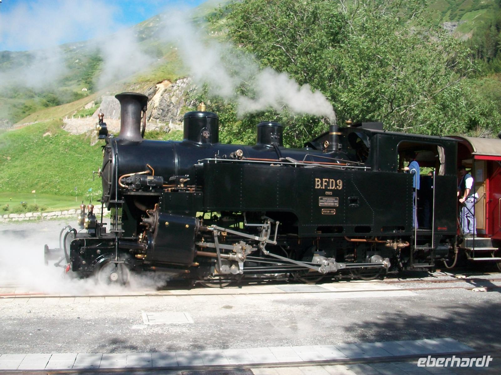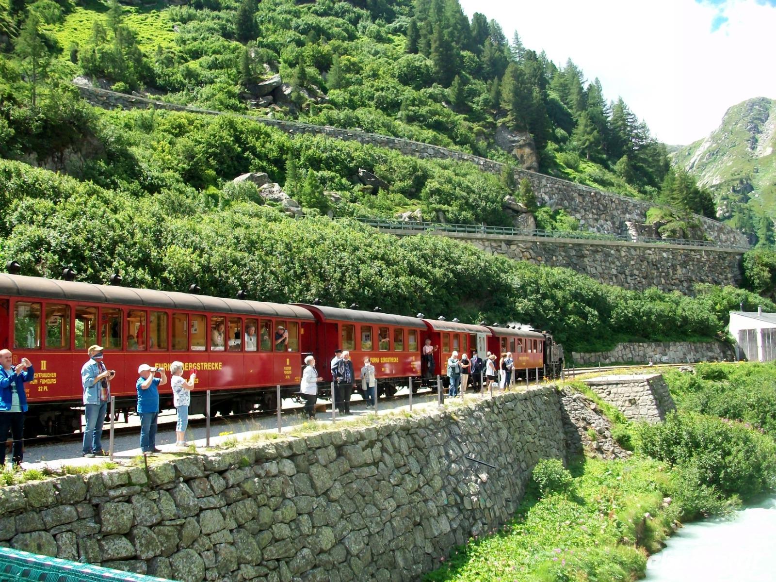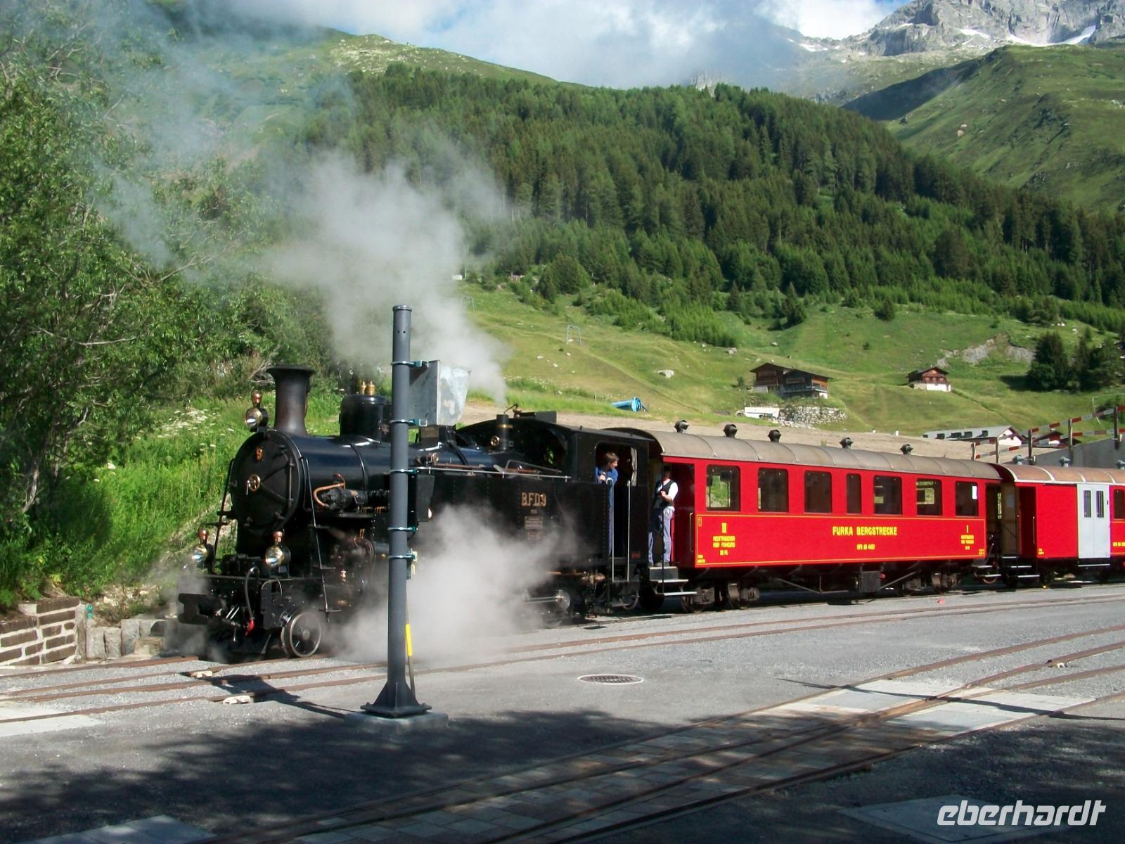 Ein Pfiff und der Dampfzug kommt vom Depot schnaufend zum Bahnhof gerollt. Schnell haben wir den für uns reservierten Wagen bestiegen, die Fahrt beginnt. Bald ist der kleine Ort unseren Augen entschwunden und wir sind nun inmitten von vielem Grün unterwegs. Kleine Gebirgsbäche kommen uns entgegen, links und rechts steigen die Berge des Furka - Massivs an, es ist einfach wunderbar! Dabei weht ein besonderer Duft in den Wagen; es riecht nach Dampf und Rauch und damit wird eine längst vergangene Zeit wieder lebendig die irgendwie auch den Menschen des digitalen 21. Jahrhunderts fasziniert. Unterwegs müssen wir wieder Wasser fassen, die Fotografen finden auch hier schöne Motive von der Bergnatur und wie sie der Mensch besiegte.