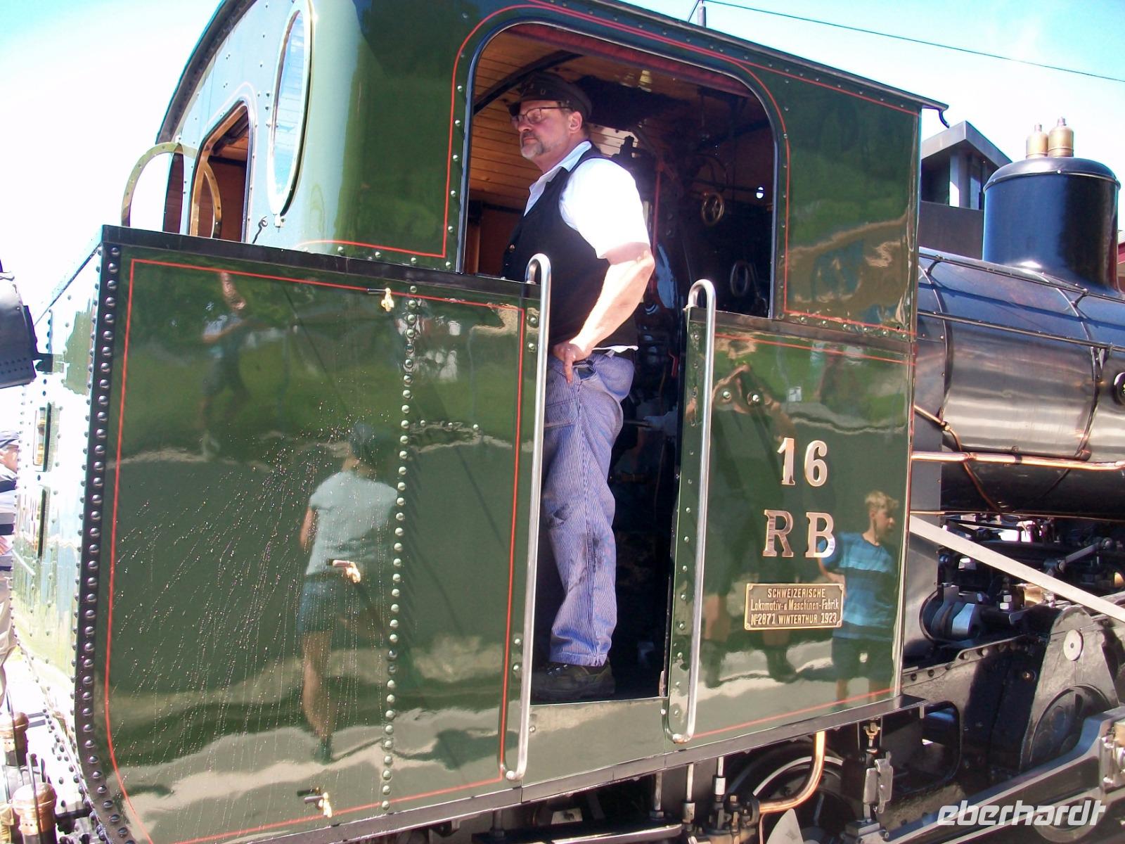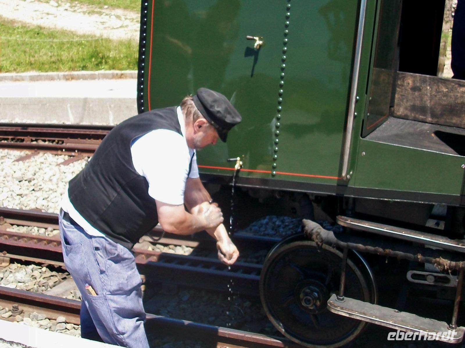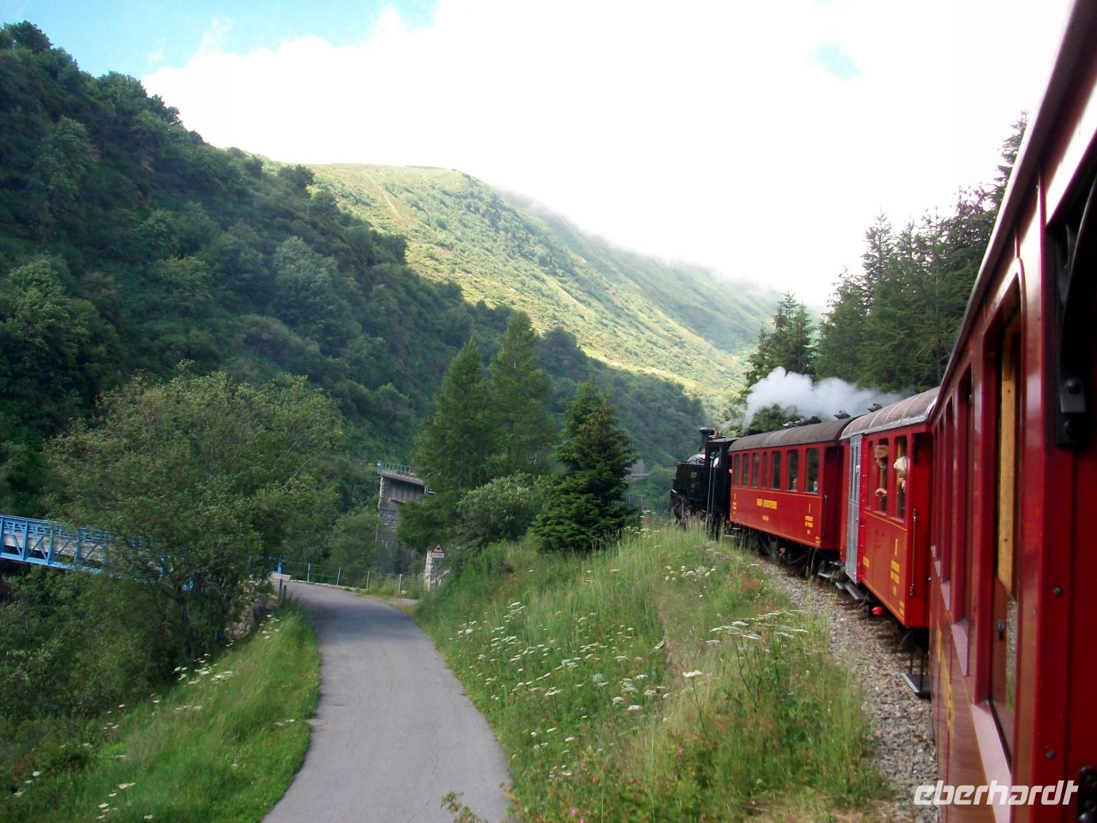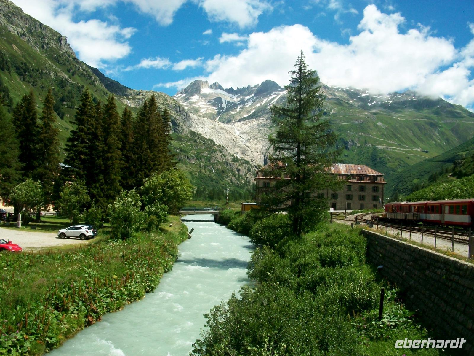 Ein Pfiff und der Dampfzug kommt vom Depot schnaufend zum Bahnhof gerollt. Schnell haben wir den für uns reservierten Wagen bestiegen, die Fahrt beginnt. Bald ist der kleine Ort unseren Augen entschwunden und wir sind nun inmitten von vielem Grün unterwegs. Kleine Gebirgsbäche kommen uns entgegen, links und rechts steigen die Berge des Furka - Massivs an, es ist einfach wunderbar! Dabei weht ein besonderer Duft in den Wagen; es riecht nach Dampf und Rauch und damit wird eine längst vergangene Zeit wieder lebendig die irgendwie auch den Menschen des digitalen 21. Jahrhunderts fasziniert. Unterwegs müssen wir wieder Wasser fassen, die Fotografen finden auch hier schöne Motive von der Bergnatur und wie sie der Mensch besiegte.