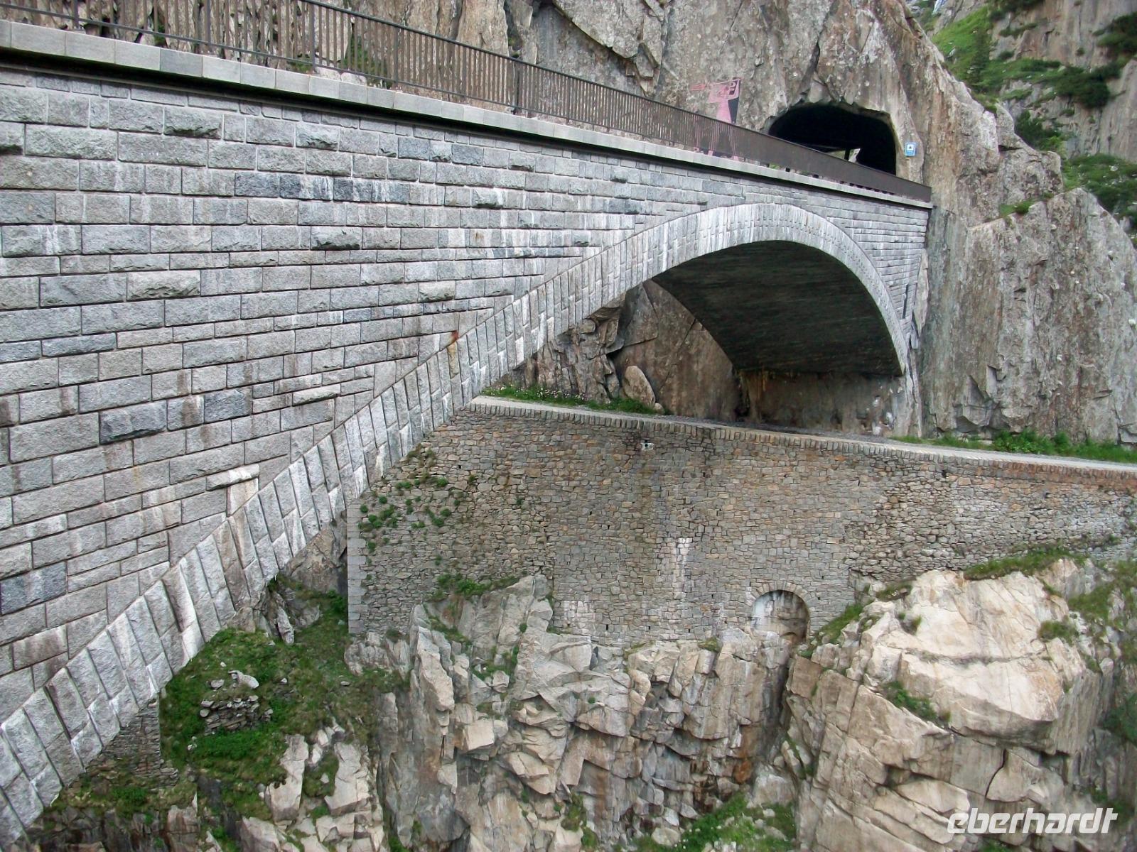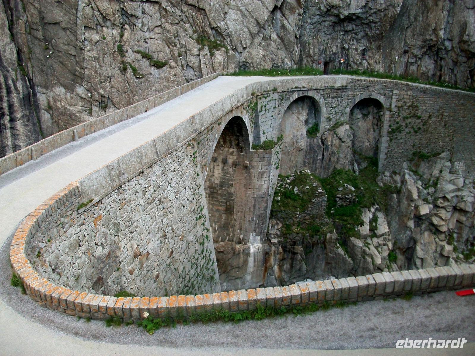 6.7.2020. Heute mussten wir etwas früher aus den Federn; die fleißigen Hände im Hotel haben uns wie jeden Morgen auch heute ein leckeres Frühstück bereitet und bereits gegen halb acht sind wir dann unterwegs. Wir gelangen hinunter und fahren östlich entlang des Vierwaldstätter Sees zunächst in den Kanton Uri ein. Bei Altdorf verlassen wir aber die Autobahn und sind fortan auf der Landstraße unterwegs. Im Zentrum von Altdorf grüßt uns Wilhelm Tell mit seinem Sohn, er hat seine Armbrust in der Hand, schließlich fand seinerzeit hier die berühmte Szene mit dem Apfelschuss satt, dieses Denkmal erzählt davon. Dann geht es weiter auf einer immer schmaler werdenden Straße; bald schrauben wir uns mit dem Bus die atemberaubenden Serpentinen hinauf, die Berge rücken dabei immer näher heran: Wir sind in der Schöllenenschlucht angelangt. Kurz vor dem bekannten Ort Andermatt, in einer Schmalstelle des Tales, befindet sich die Teufelsbrücke; zahlreiche Mythen ranken sich um sie und wir legen hier eine kurze Fotopause ein.
