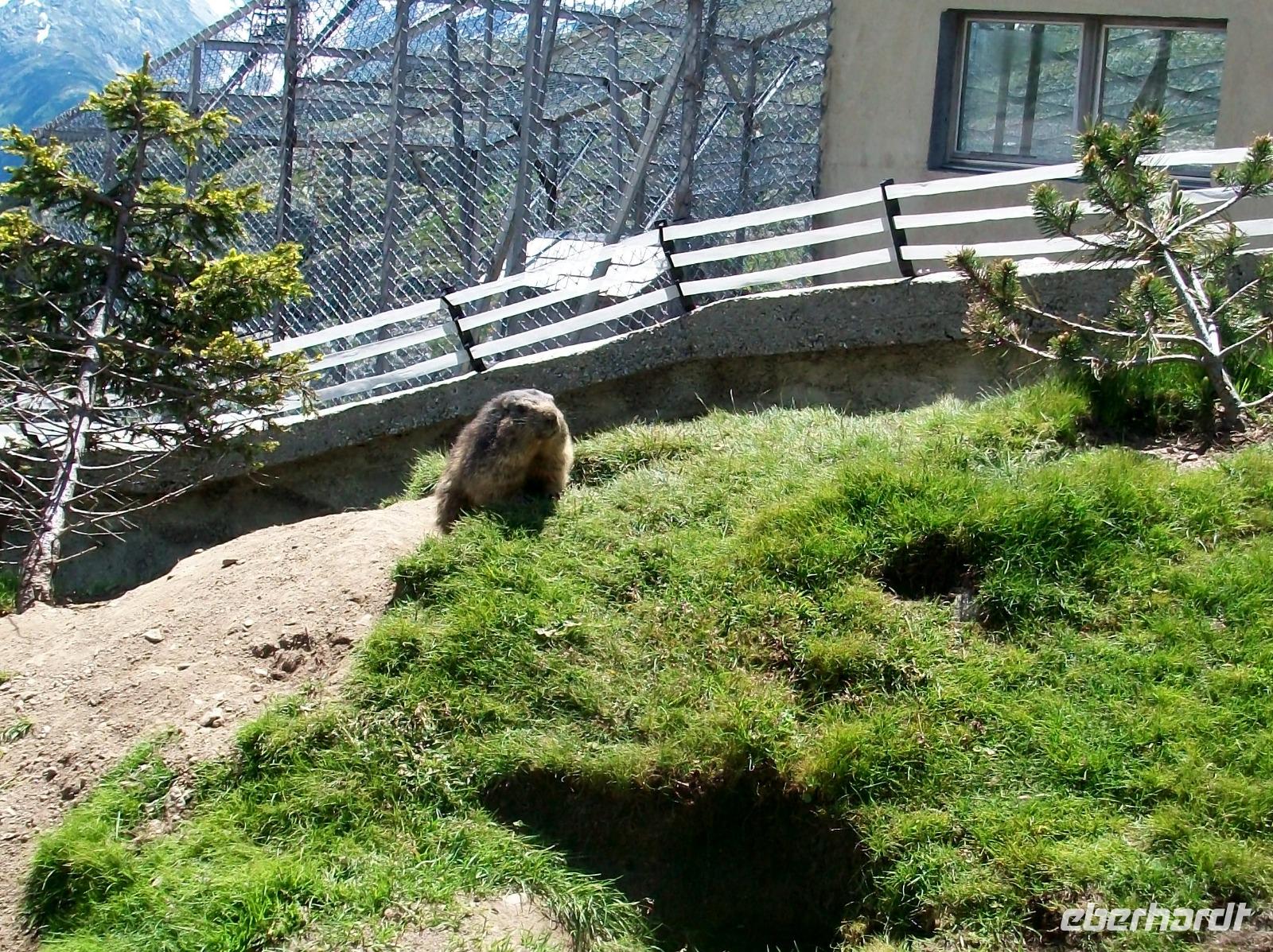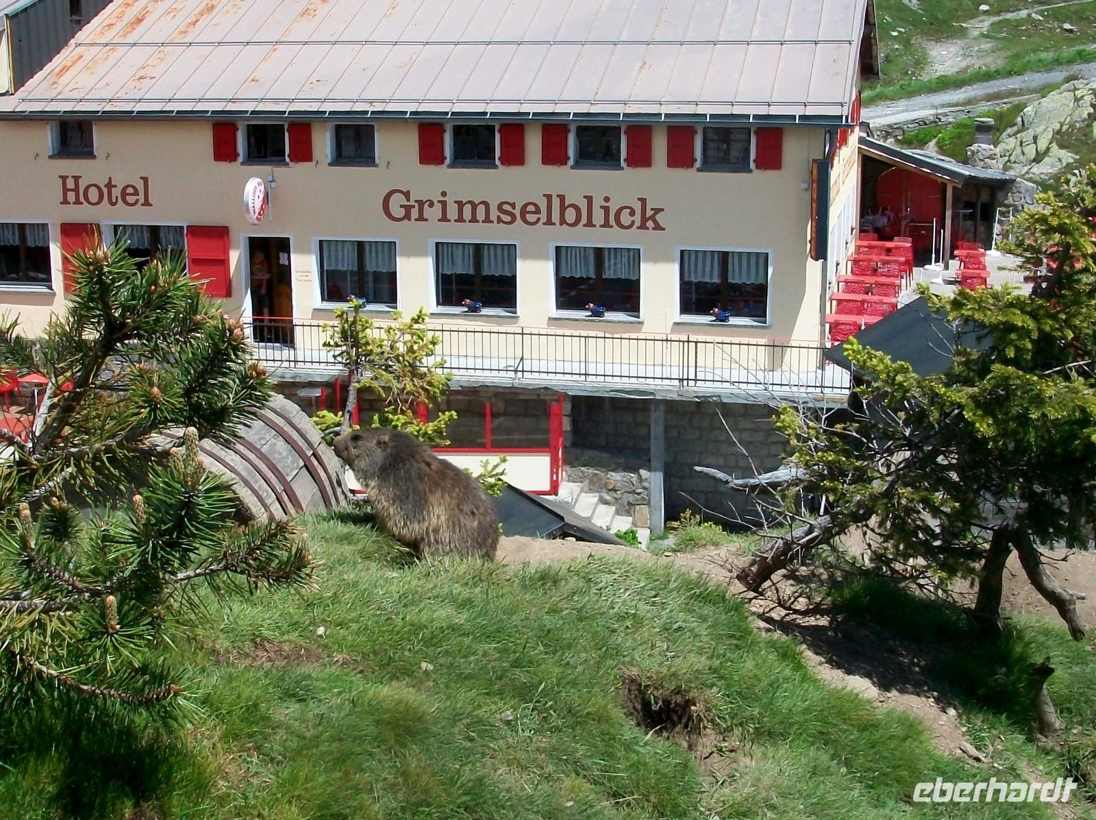 Nach dem Scheiteltunnel geht es dann wieder hinab; auf der rechten Seite sehen wir eine Geröllmasse, hier ragte einst der Rhone - Gletscher bis hinab, nun ist er arg geschrumpft. Leider neigt sich nun die Fahrt ihrem Ende entgegen; in Oberwald erwarten uns die Busse und bald erklimmen wir mit dieser modernen Technik den Grimselpass. Noch einmal auf dieser Reise befinden wir uns über 2 000 Meter; im Gehege lassen sich die Murmeltiere sehen und ringsum bescheint die Sonne die zum Teil schneebedeckten Bergspitzen.