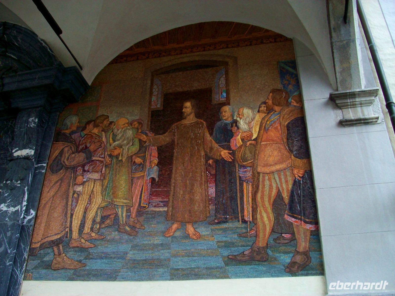 Eine erwartungsfrohe Reisegesellschaft hat sich eingefunden; wir starten bei sonnigem Wetter in Dresden und nehmen, voller Vorfreude auf die schönen Erlebnisse die nun vor uns liegen, Kurs in Richtung Süden. Zunächst aber durcheilen wir mit unserem schönen Reisebus die Heimat; entlang des Erzgebirges verläuft unsere Fahrt nach Franken um, später an Nürnberg vorbei, die Reise in Richtung Süden weiter gehen zu lassen. Rechts der Autobahn grüßt uns der beeindruckende Kirchturm von Ulm und bald sind wir im Allgäu unterwegs. Dort, weiter im Süden, sind schon die Alpen auszumachen, aber, der Wetterbericht hatte es vermeldet: Gewitterstimmung liegt über den Bergen. Mächtige Haufenwolken streben nach oben und entwickeln ein gefährliches Potential. Aber das stört uns nicht, wir sitzen im Bus und gelangen bald hinüber in die Schweiz. Entlang der Erhebungen des Säntisgebirges schwenken wir in Richtung des Zürichsees ein und sehen rechts auch den fjordartigen Walensee im Glarner Land. Doch dann, schon am Zürichsee, verdunkelt sich urplötzlich der Himmel, Blitze zucken, Donner grollt und Petrus öffnet alle Schleusen des Himmels. Mit nur langsamer Fahrt geht es weiter während Hagel auf das Dach unseres Busses trommelt. Doch das geht schnell vorbei. Wir gelangen in der nächsten Stunde über den Berg bei Hirzel, an Luzern vorbei zu unserem Ziel Flüeli Ranft. Vom Wirt Marcello werden wir herzlich Willkommen geheißen, schnell sind die Zimmer bezogen und danach lassen wir uns das schmackhafte Abendessen gut munden. Nur Petrus hat schlechte Laune: Es donnert und blitzt bis in die Nacht hinein.