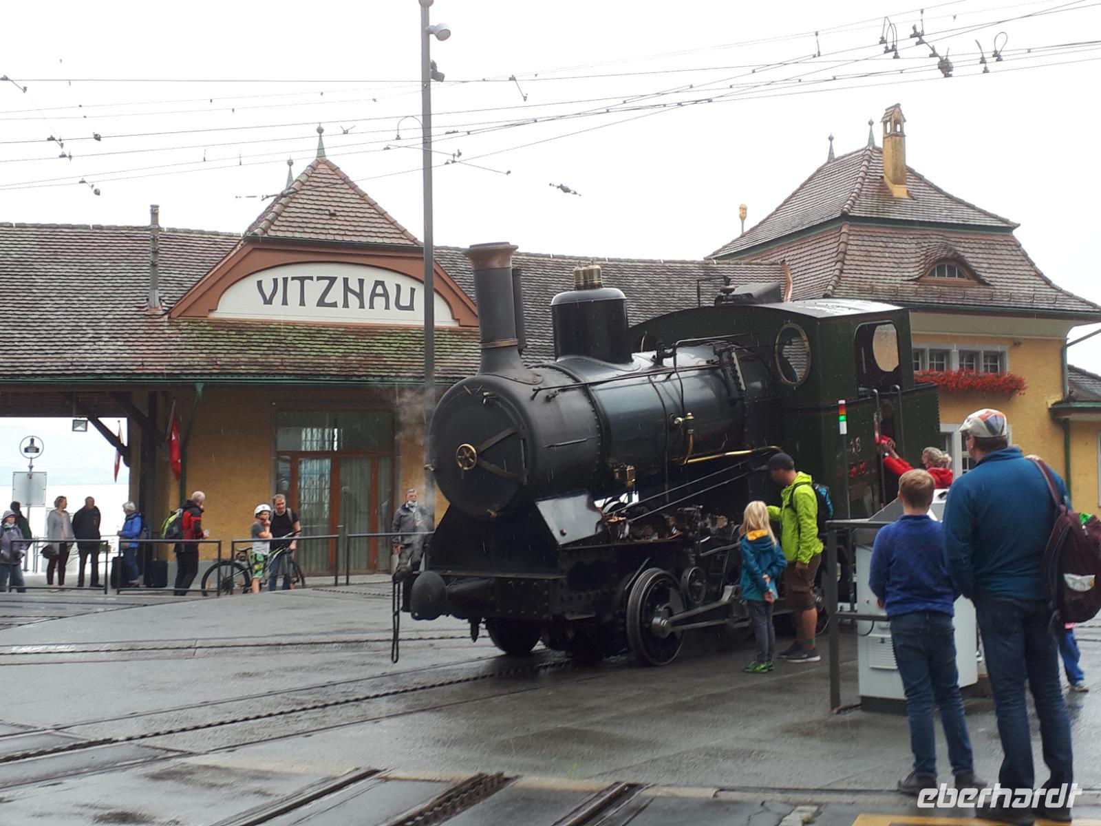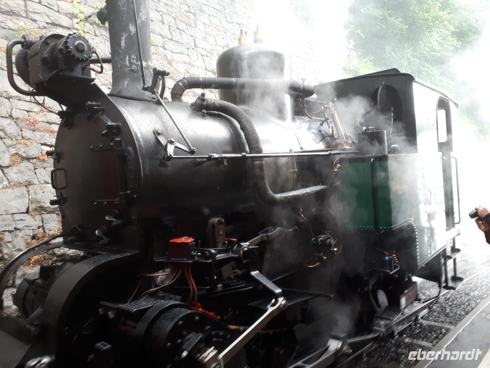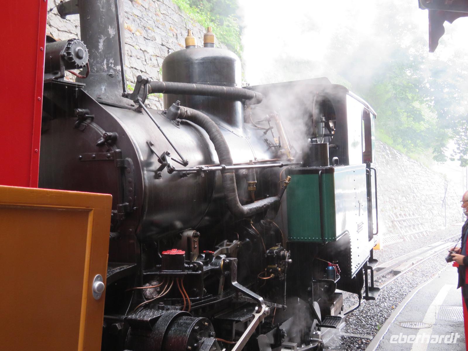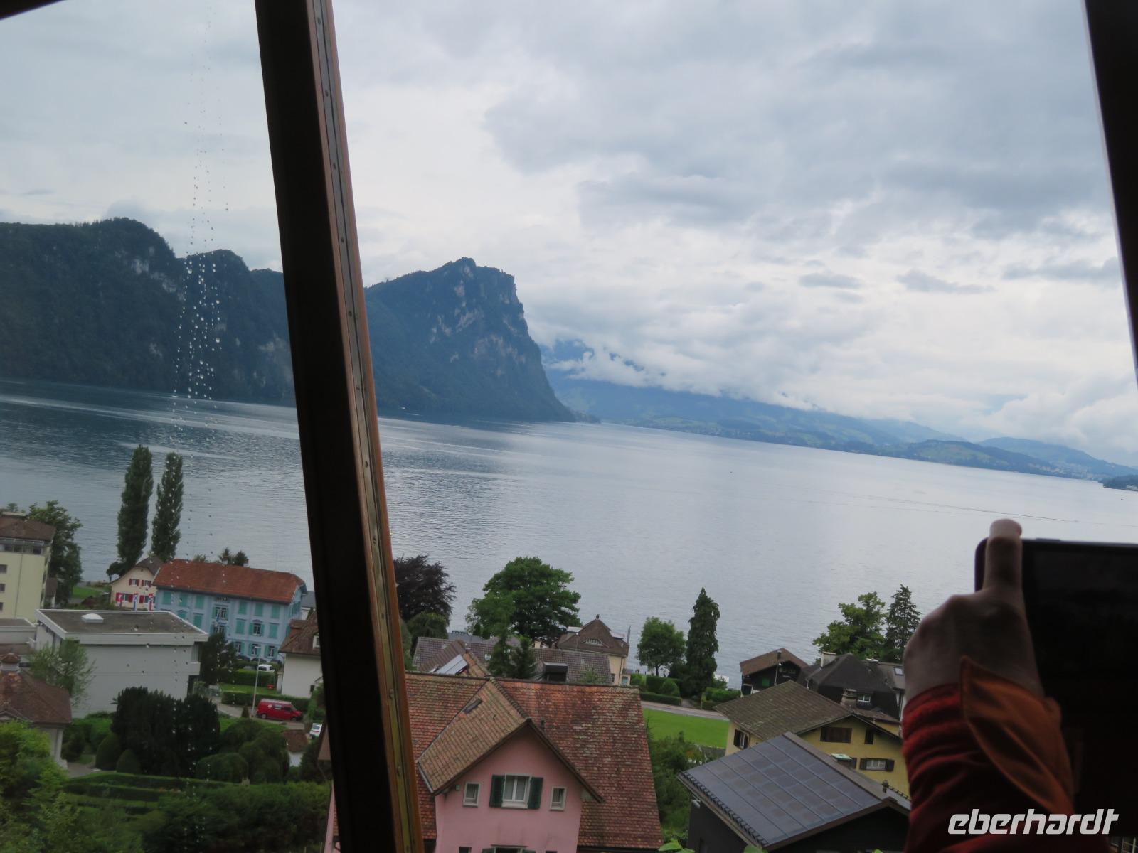 Am Morgen sieht das Wetter leider wieder nicht so gut aus. Unsere Reise führt uns zunächst wieder nach Luzern. Das Dampfschiff „Unterwalden ist Teil der Flotte der Schifffahrtsgesellschaft Vierwaldstättersee. Mit ihm geht es über den See nach Vitznau. Dabei gleiten wir am Birkenstock und den Orte Hertenstein und Weggis vorbei. In Vitznau steigen wir auf die 1871 erbaute Rigi-Bahn um. Bereits von weitem sehen wir, dass die Dampflok Nummer 16 für die Fahrt auf die Rigi vorbereitet wird. Wir nehmen im Dampfzug der Rigi-Bahn auf unseren reservierten Plätzen Platz. In gemütlicher Fahrt schnauft und zischt die Bahn die steile Strecke den Berg hinauf. Von Vitznau bringt uns die Bahn auf die Rigi in 1.798 Metern Höhe. Unterwegs gibt es kurze Stopps, bei denen Dampfdruck aufgebaut und Wasser getankt wird. Hanspeter, der nette Zugbegleiter natürlich in historischer Schaffneruniform ist erstaunt, dass die Lok bei dieser Fahrt dreimal zum Druckaufbau halten muss. Während der Fahrt eröffnen sich zu Beginn noch wundervolle Ausblicke über den Vierwaldstättersee. Auf dem Berg angekommen, erwartet uns leider das Programm „Wie sie sehen, sehen sie nichts". Die imposante Bergekette vom Säntis über den Titlis bis zu den Giganten des Berner Oberlandes mit Eiger, Mönch, und Jungfrau, Schreckhorn und den anderen Drei- und Viertausendern zeigen sich uns diese Mal leider nicht. Deshalb nutzen wir die Zeit zu einem kleinen Imbiss im Restaurant. Da auch nicht so viele Gäste auf dem Berg sind, können wir 45 Minuten zeitiger als ursprünglich geplant, mit dem Dampfzug wieder ins Tal fahren. Während Jan den Bus holt, schauen wir noch zu, wie die Lok und die Wagen mittels Drehscheib rangiert und ins Depot gefahren werden. Unsere Rückfahrt führt uns zunächst nach Küssnacht. An der Hohlen Gasse machen wir noch eine kurze Pause und hören im Info-Pavillon in einer kurzen Multimedia-Show die Tells-Geschichte und die Geschichte der Hohlen Gasse. Dann bringt uns der Bus nach Flüeli-Ranft zurück.