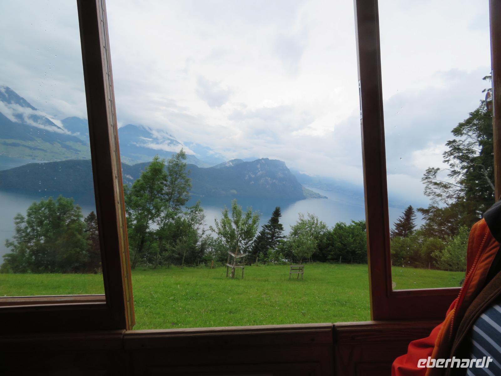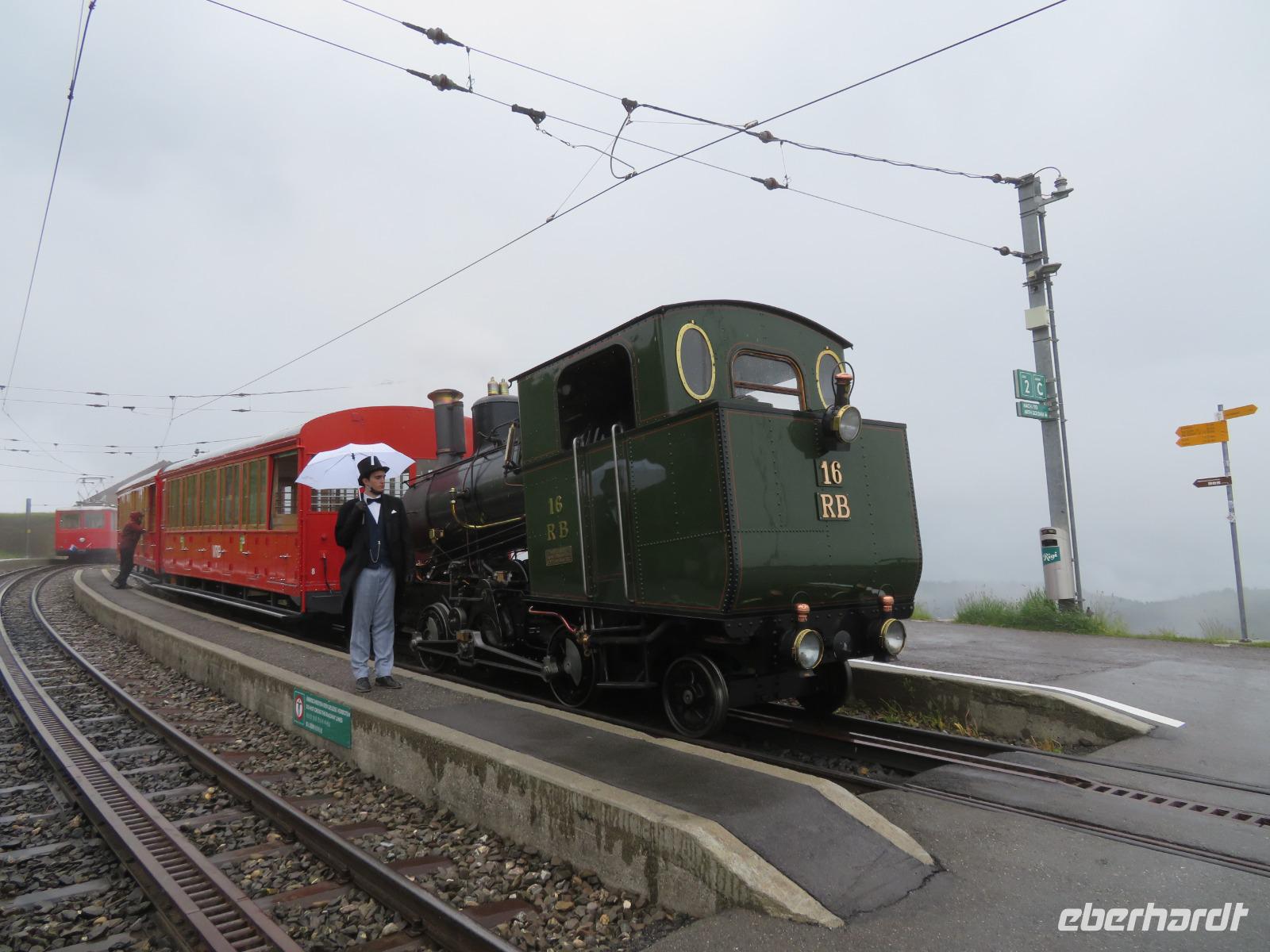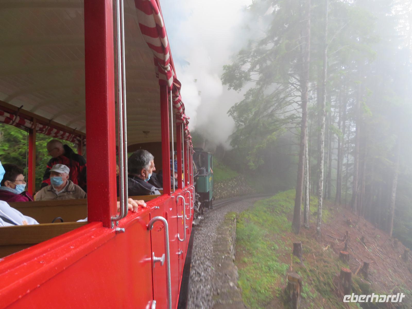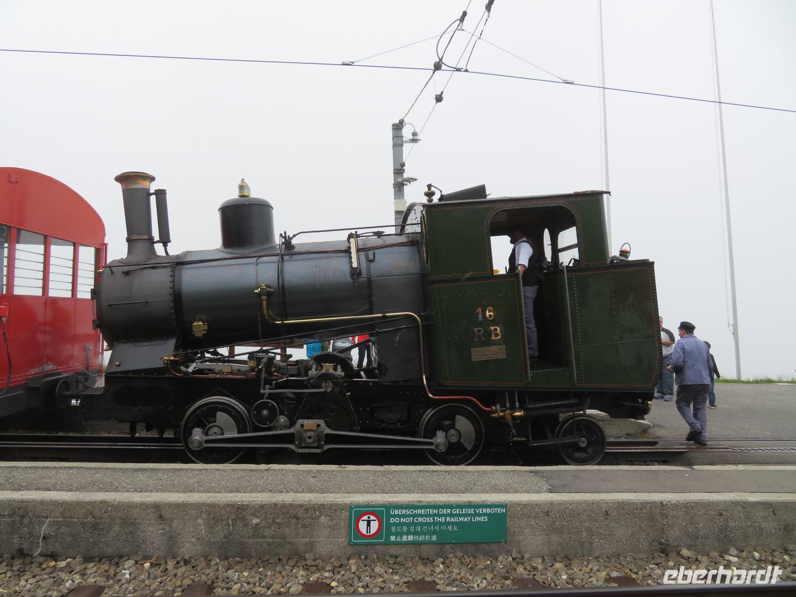 Am Morgen sieht das Wetter leider wieder nicht so gut aus. Unsere Reise führt uns zunächst wieder nach Luzern. Das Dampfschiff „Unterwalden ist Teil der Flotte der Schifffahrtsgesellschaft Vierwaldstättersee. Mit ihm geht es über den See nach Vitznau. Dabei gleiten wir am Birkenstock und den Orte Hertenstein und Weggis vorbei. In Vitznau steigen wir auf die 1871 erbaute Rigi-Bahn um. Bereits von weitem sehen wir, dass die Dampflok Nummer 16 für die Fahrt auf die Rigi vorbereitet wird. Wir nehmen im Dampfzug der Rigi-Bahn auf unseren reservierten Plätzen Platz. In gemütlicher Fahrt schnauft und zischt die Bahn die steile Strecke den Berg hinauf. Von Vitznau bringt uns die Bahn auf die Rigi in 1.798 Metern Höhe. Unterwegs gibt es kurze Stopps, bei denen Dampfdruck aufgebaut und Wasser getankt wird. Hanspeter, der nette Zugbegleiter natürlich in historischer Schaffneruniform ist erstaunt, dass die Lok bei dieser Fahrt dreimal zum Druckaufbau halten muss. Während der Fahrt eröffnen sich zu Beginn noch wundervolle Ausblicke über den Vierwaldstättersee. Auf dem Berg angekommen, erwartet uns leider das Programm „Wie sie sehen, sehen sie nichts". Die imposante Bergekette vom Säntis über den Titlis bis zu den Giganten des Berner Oberlandes mit Eiger, Mönch, und Jungfrau, Schreckhorn und den anderen Drei- und Viertausendern zeigen sich uns diese Mal leider nicht. Deshalb nutzen wir die Zeit zu einem kleinen Imbiss im Restaurant. Da auch nicht so viele Gäste auf dem Berg sind, können wir 45 Minuten zeitiger als ursprünglich geplant, mit dem Dampfzug wieder ins Tal fahren. Während Jan den Bus holt, schauen wir noch zu, wie die Lok und die Wagen mittels Drehscheib rangiert und ins Depot gefahren werden. Unsere Rückfahrt führt uns zunächst nach Küssnacht. An der Hohlen Gasse machen wir noch eine kurze Pause und hören im Info-Pavillon in einer kurzen Multimedia-Show die Tells-Geschichte und die Geschichte der Hohlen Gasse. Dann bringt uns der Bus nach Flüeli-Ranft zurück.