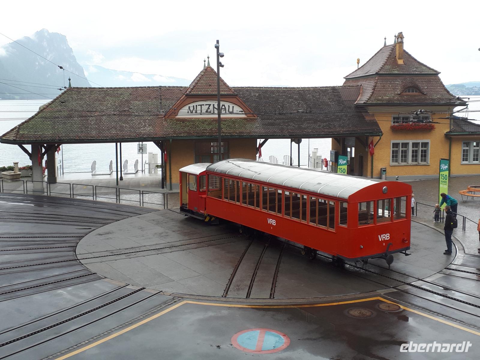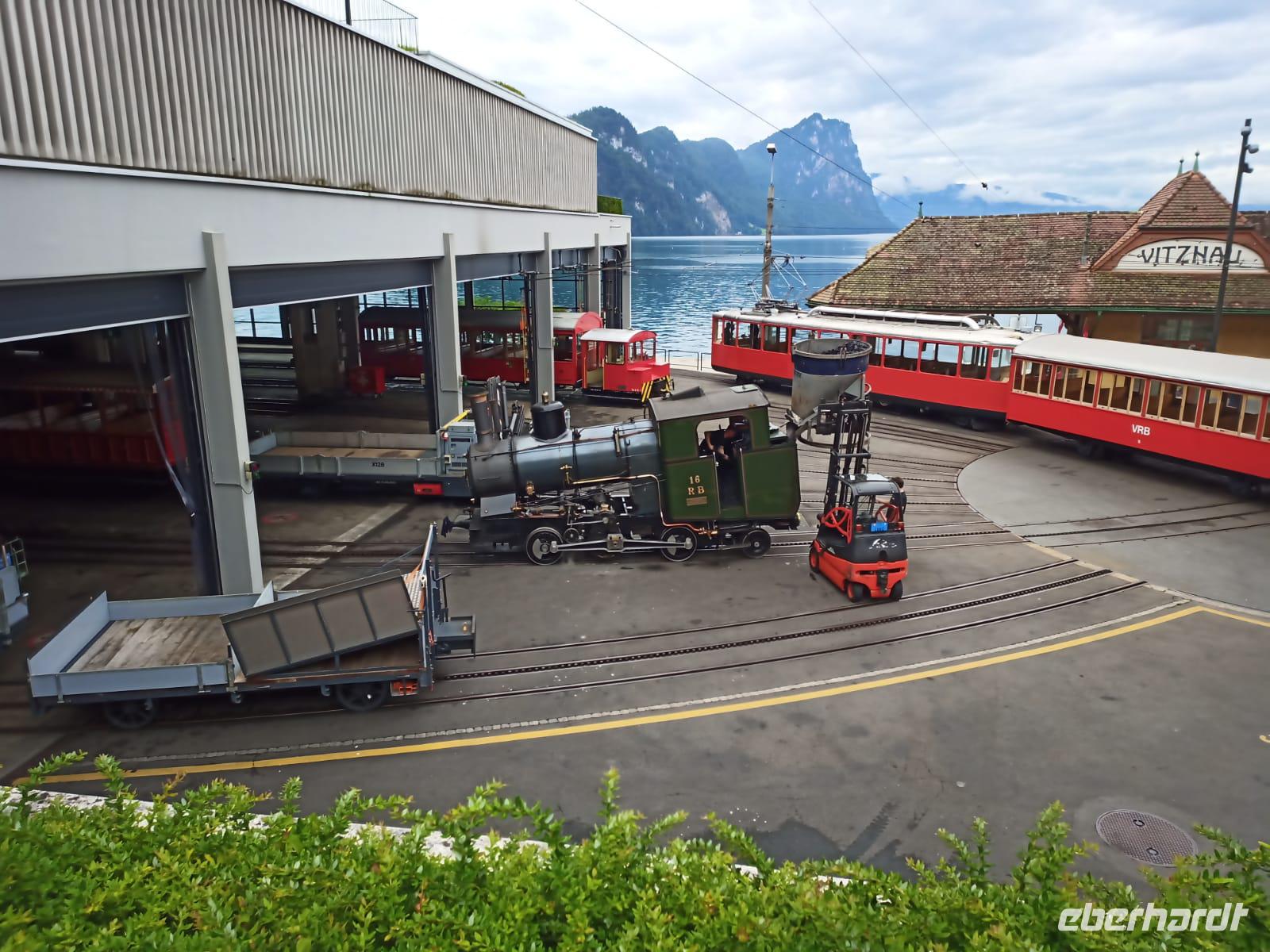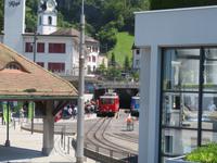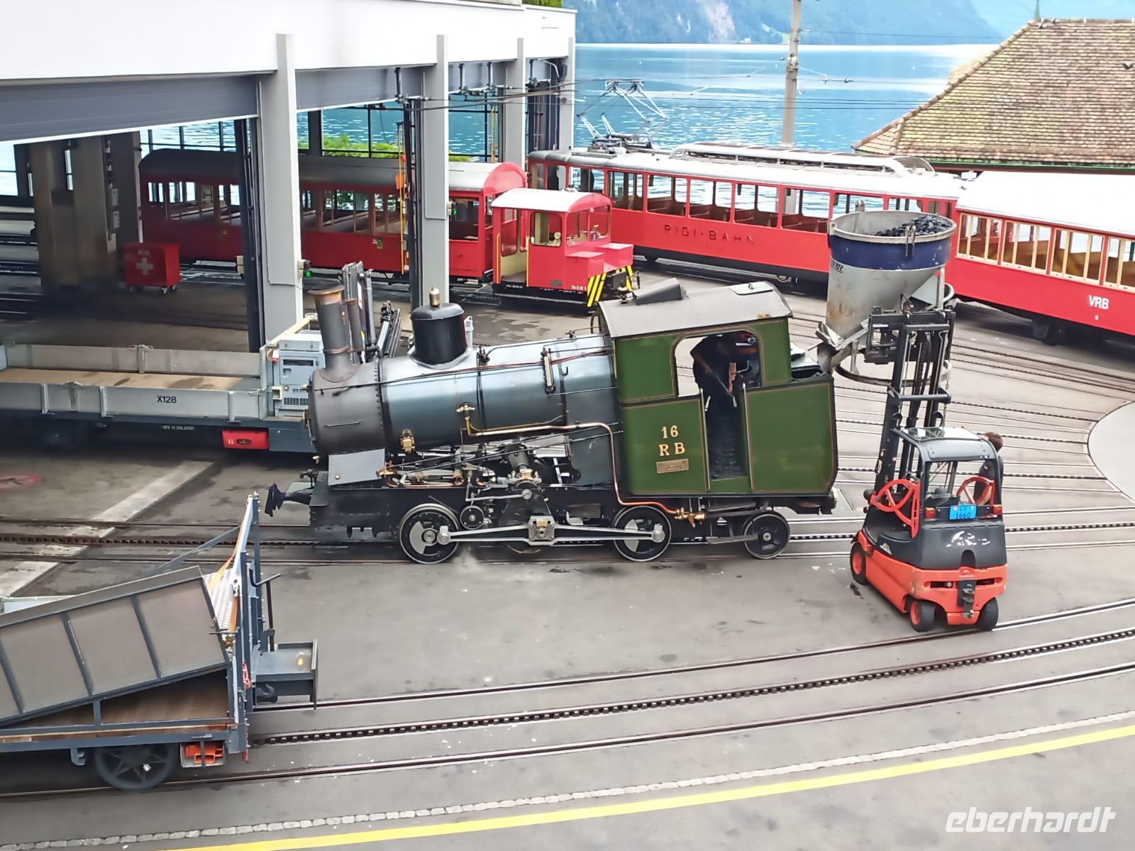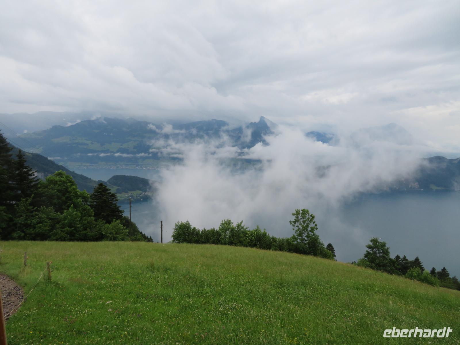 Am Morgen sieht das Wetter leider wieder nicht so gut aus. Unsere Reise führt uns zunächst wieder nach Luzern. Das Dampfschiff „Unterwalden ist Teil der Flotte der Schifffahrtsgesellschaft Vierwaldstättersee. Mit ihm geht es über den See nach Vitznau. Dabei gleiten wir am Birkenstock und den Orte Hertenstein und Weggis vorbei. In Vitznau steigen wir auf die 1871 erbaute Rigi-Bahn um. Bereits von weitem sehen wir, dass die Dampflok Nummer 16 für die Fahrt auf die Rigi vorbereitet wird. Wir nehmen im Dampfzug der Rigi-Bahn auf unseren reservierten Plätzen Platz. In gemütlicher Fahrt schnauft und zischt die Bahn die steile Strecke den Berg hinauf. Von Vitznau bringt uns die Bahn auf die Rigi in 1.798 Metern Höhe. Unterwegs gibt es kurze Stopps, bei denen Dampfdruck aufgebaut und Wasser getankt wird. Hanspeter, der nette Zugbegleiter natürlich in historischer Schaffneruniform ist erstaunt, dass die Lok bei dieser Fahrt dreimal zum Druckaufbau halten muss. Während der Fahrt eröffnen sich zu Beginn noch wundervolle Ausblicke über den Vierwaldstättersee. Auf dem Berg angekommen, erwartet uns leider das Programm „Wie sie sehen, sehen sie nichts". Die imposante Bergekette vom Säntis über den Titlis bis zu den Giganten des Berner Oberlandes mit Eiger, Mönch, und Jungfrau, Schreckhorn und den anderen Drei- und Viertausendern zeigen sich uns diese Mal leider nicht. Deshalb nutzen wir die Zeit zu einem kleinen Imbiss im Restaurant. Da auch nicht so viele Gäste auf dem Berg sind, können wir 45 Minuten zeitiger als ursprünglich geplant, mit dem Dampfzug wieder ins Tal fahren. Während Jan den Bus holt, schauen wir noch zu, wie die Lok und die Wagen mittels Drehscheib rangiert und ins Depot gefahren werden. Unsere Rückfahrt führt uns zunächst nach Küssnacht. An der Hohlen Gasse machen wir noch eine kurze Pause und hören im Info-Pavillon in einer kurzen Multimedia-Show die Tells-Geschichte und die Geschichte der Hohlen Gasse. Dann bringt uns der Bus nach Flüeli-Ranft zurück.
