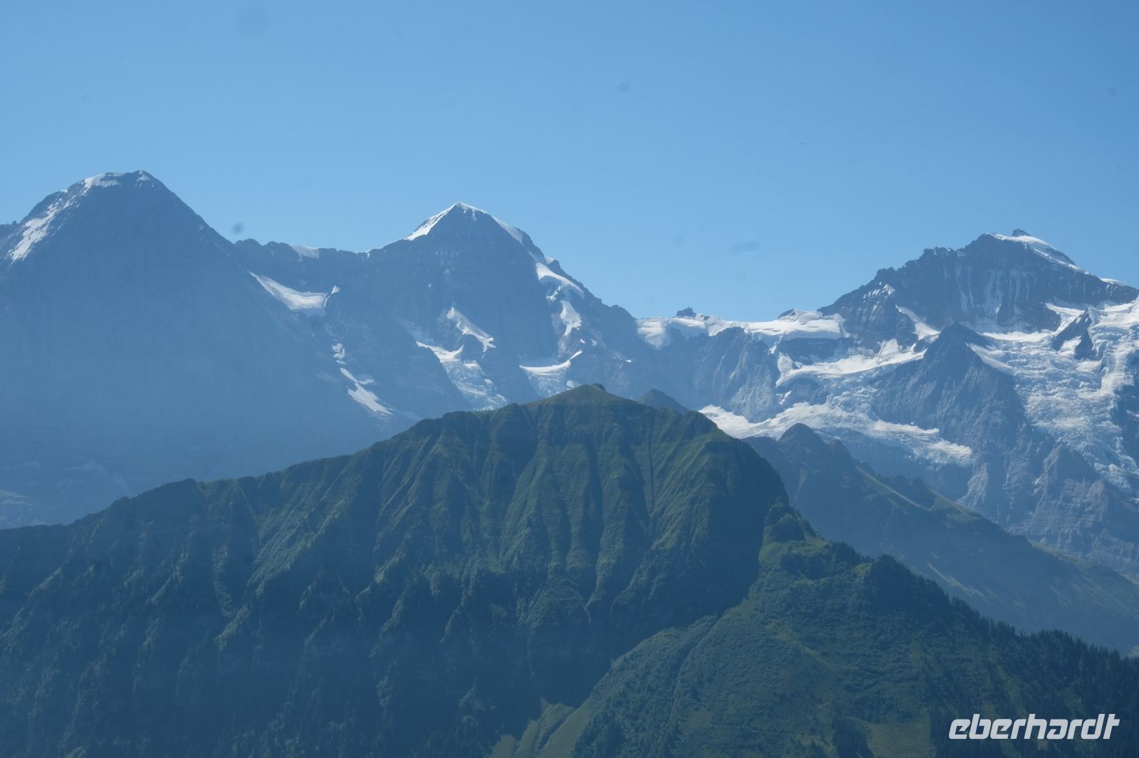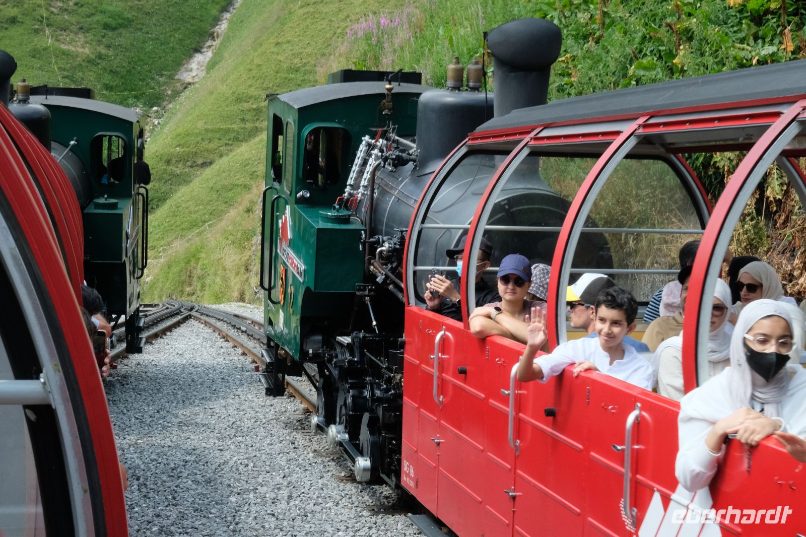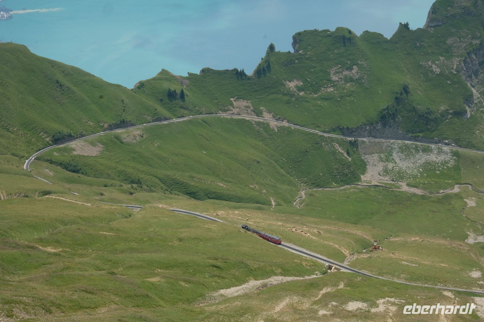 Unser heutiges Ziel war das Berner Oberland. Wir fuhren zunächst am Morgen nach Brienz, machten unterwegs einen Fotostopp am Lungener See. In Brienz wechselten wir das Beförderungsmittel und fuhren mit dem Zug auf das Brienzer Rothorn. Die Fahrt mit der berühmten Brienz-Rothorn-Bahn, auf das 2.350 Meter hohe Brienzer Rothorn, ist ein fantastisches Erlebnis. Die Zahnradbahn überwindet die 7,5 Kilometer lange Strecke in 55 Minuten über eine beeindruckende Fahrtstrecke. Unsere Fahrt führt über Brücken, durch Tunnel, Wälder sowie Wiesen. Auf über 2350 Metern Höhe erreichten wir die Gipfelstation. Auf dieser angekommen, führte unser Weg ins Bergrestaurant. Hier wartete eine kleine Überraschung von Eberhardt-Travel auf unsere Gäste. Wir probierten das typische Alpengericht Älplermagronen. Uns wurde ein Teller mit Teigwaren, Kartoffeln, Rahm, Käsesauce und gerösteten Zwiebeln sowie Apfelmus serviert. Das schmeckte schon sehr gut. Für viele etwas ungewohnt aber durchaus lecker. Und woher kommt dieser Name? Älpler, das sind die Bewohner der Alpen und die Magronen leiten sich von den italienischen Makkaroni ab. Dieses Mittagessen wird uns in guter Erinnerung bleiben.
