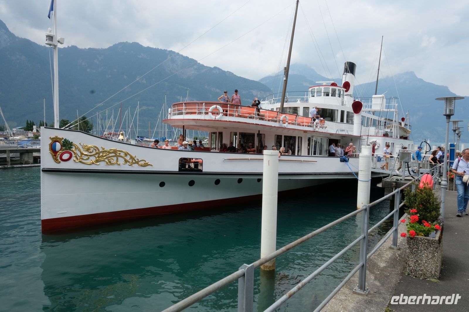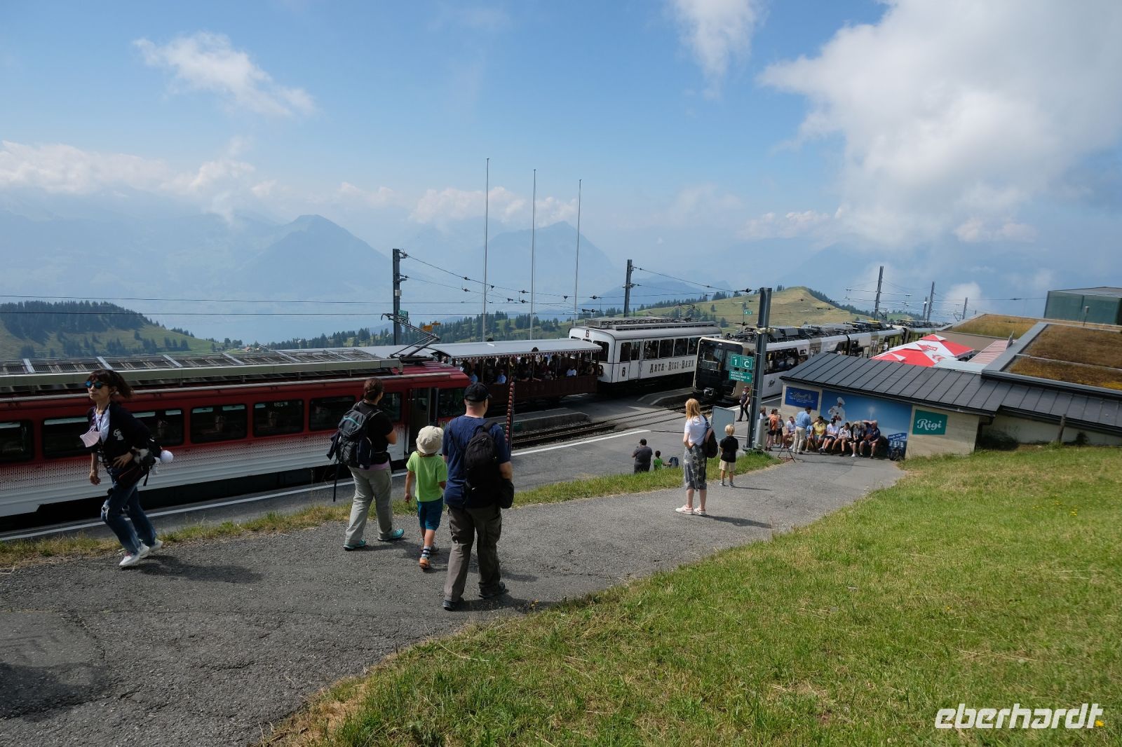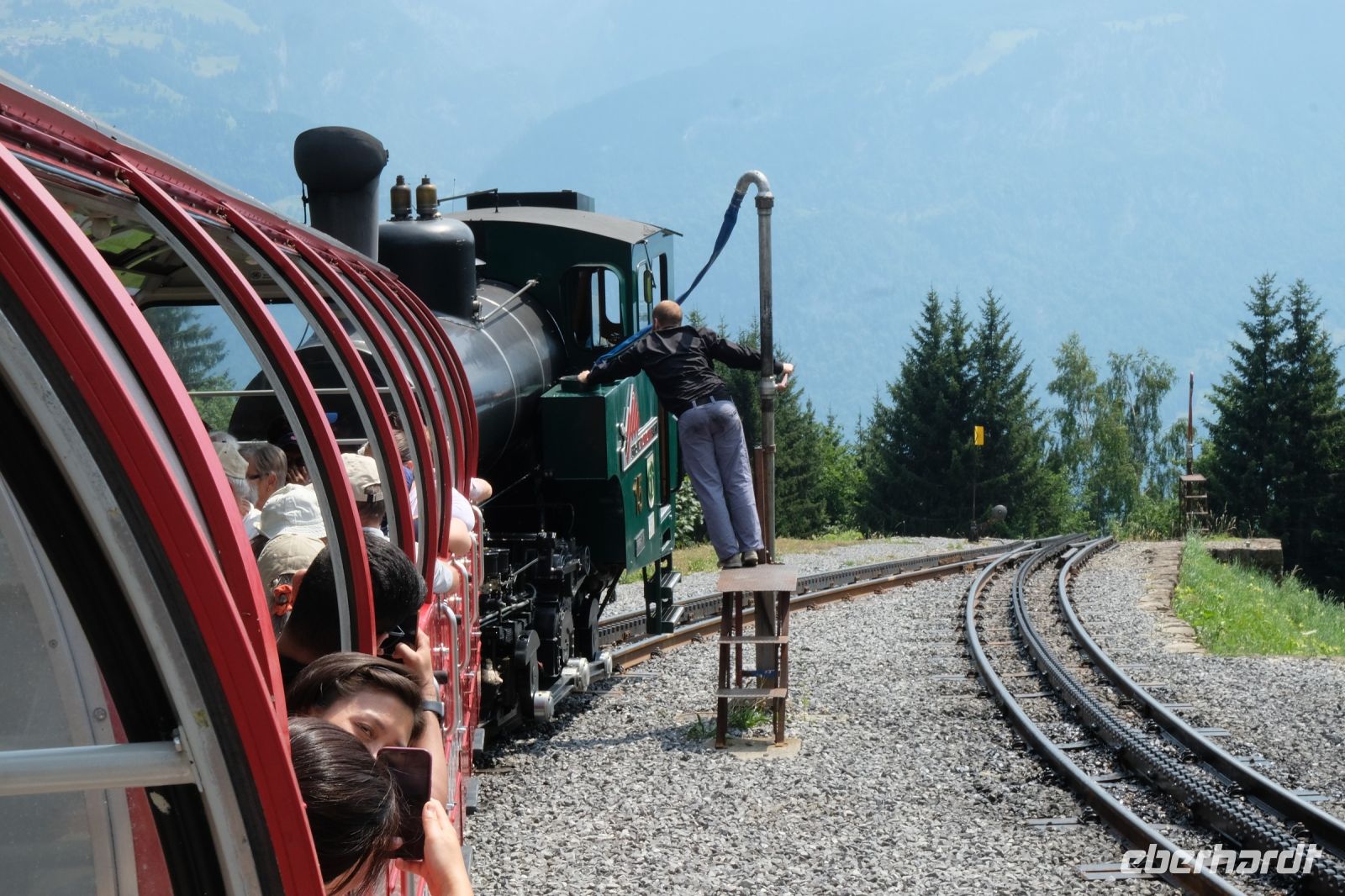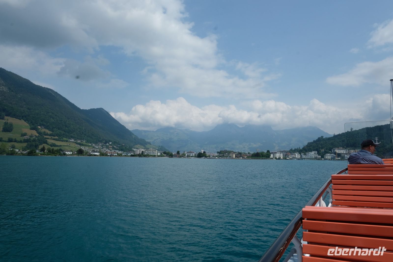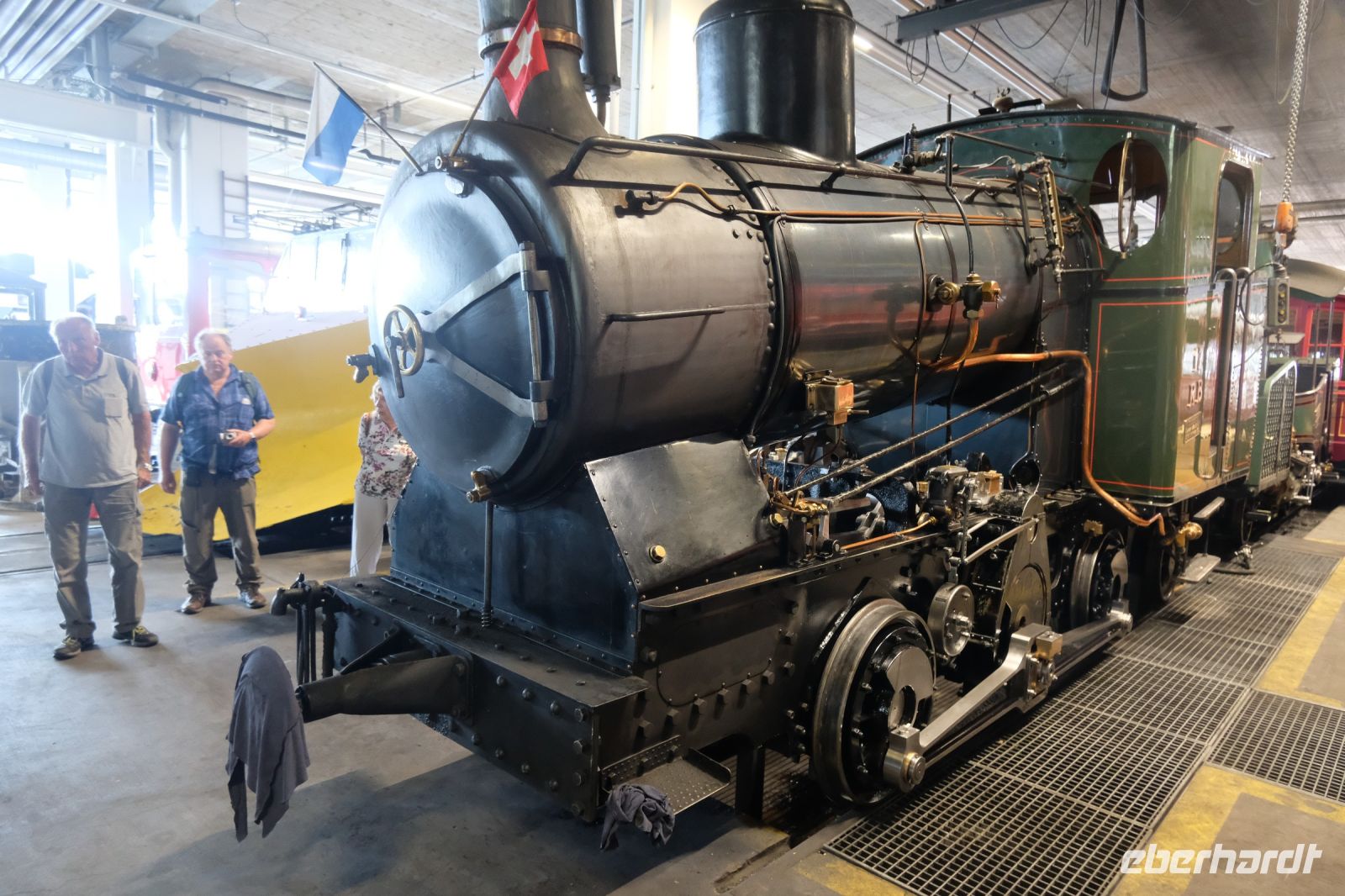 Zunächst fuhren wir wieder bei Sonnenschein nach Luzern. Von hier aus ging es mit dem nostalgischen Raddampfer „Schiller“ über den Vierwaldstätter See bis Vitznau. Vom Wasser aus bestaunten wir das Bergpanorama um uns. In Vitznau stiegen wir in die Vitznau-Rigi-Bahn und erklommen die Königin der Berge. Leider war durch die anhaltende Waldbrandgefahr keine Fahrt mit der Dampfbahn möglich. Als mussten wir mit der elektrischen Bahn fahren und erreichten nach 45 Minuten die Rigi in 1.800 m Höhe. Das Wetter war sehr schön, Sonnenschein und viel Wärme. Am Nachmittag brachte uns eine neu erworbene elektrische Bahn zurück nach Vitznau. Dort erwartete uns schon Hanspeter und weihte uns in die Geheimnisse des Lok-Depots ein.