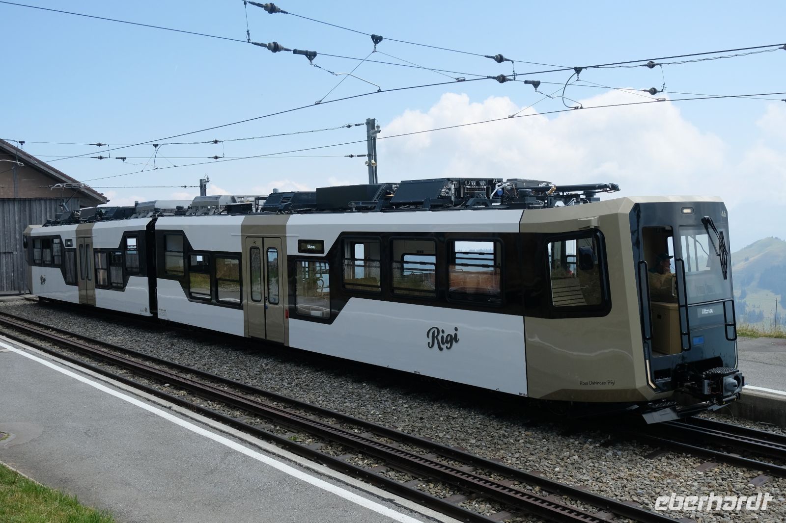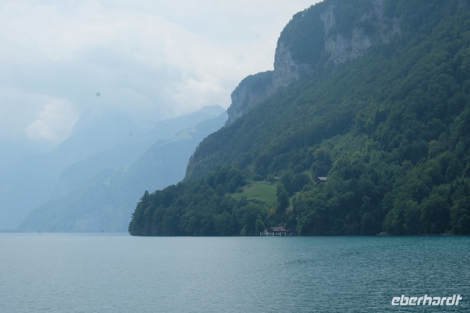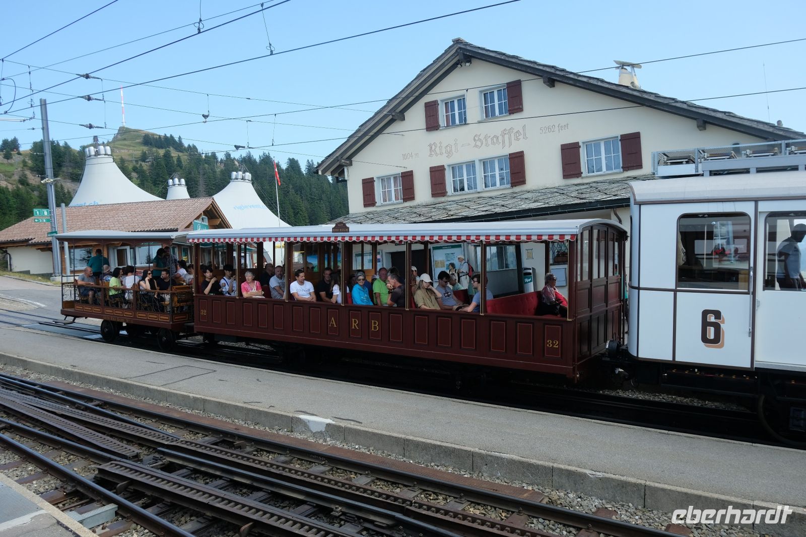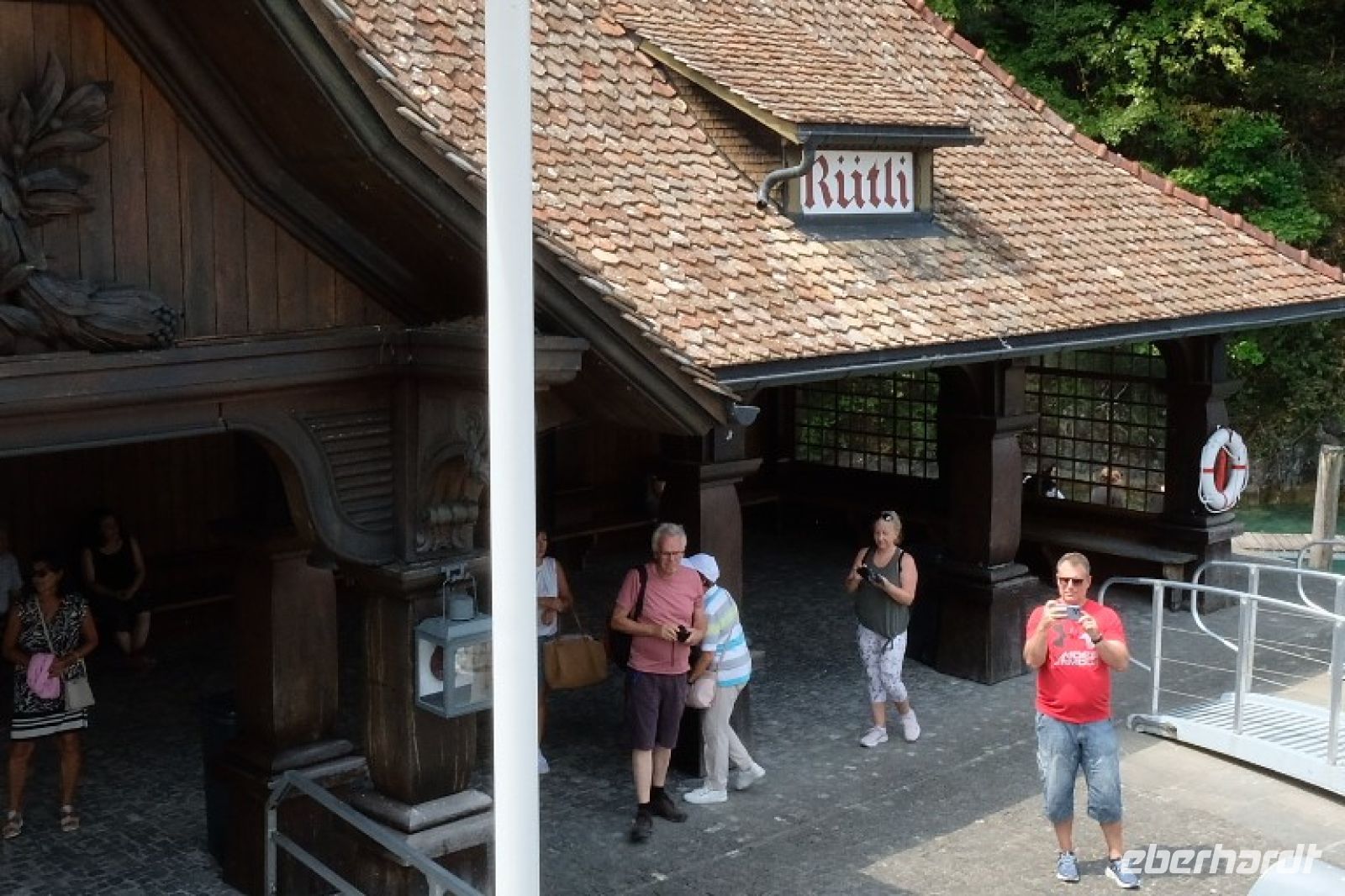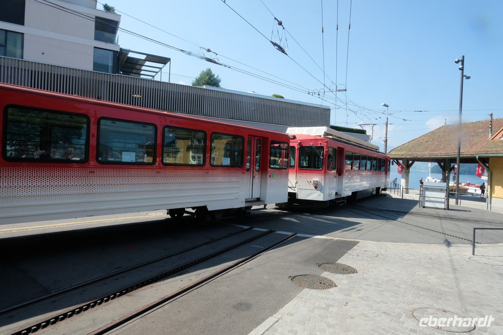 Zunächst fuhren wir wieder bei Sonnenschein nach Luzern. Von hier aus ging es mit dem nostalgischen Raddampfer „Schiller“ über den Vierwaldstätter See bis Vitznau. Vom Wasser aus bestaunten wir das Bergpanorama um uns. In Vitznau stiegen wir in die Vitznau-Rigi-Bahn und erklommen die Königin der Berge. Leider war durch die anhaltende Waldbrandgefahr keine Fahrt mit der Dampfbahn möglich. Als mussten wir mit der elektrischen Bahn fahren und erreichten nach 45 Minuten die Rigi in 1.800 m Höhe. Das Wetter war sehr schön, Sonnenschein und viel Wärme. Am Nachmittag brachte uns eine neu erworbene elektrische Bahn zurück nach Vitznau. Dort erwartete uns schon Hanspeter und weihte uns in die Geheimnisse des Lok-Depots ein.